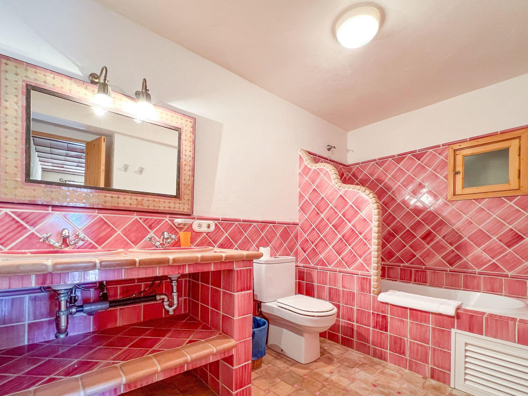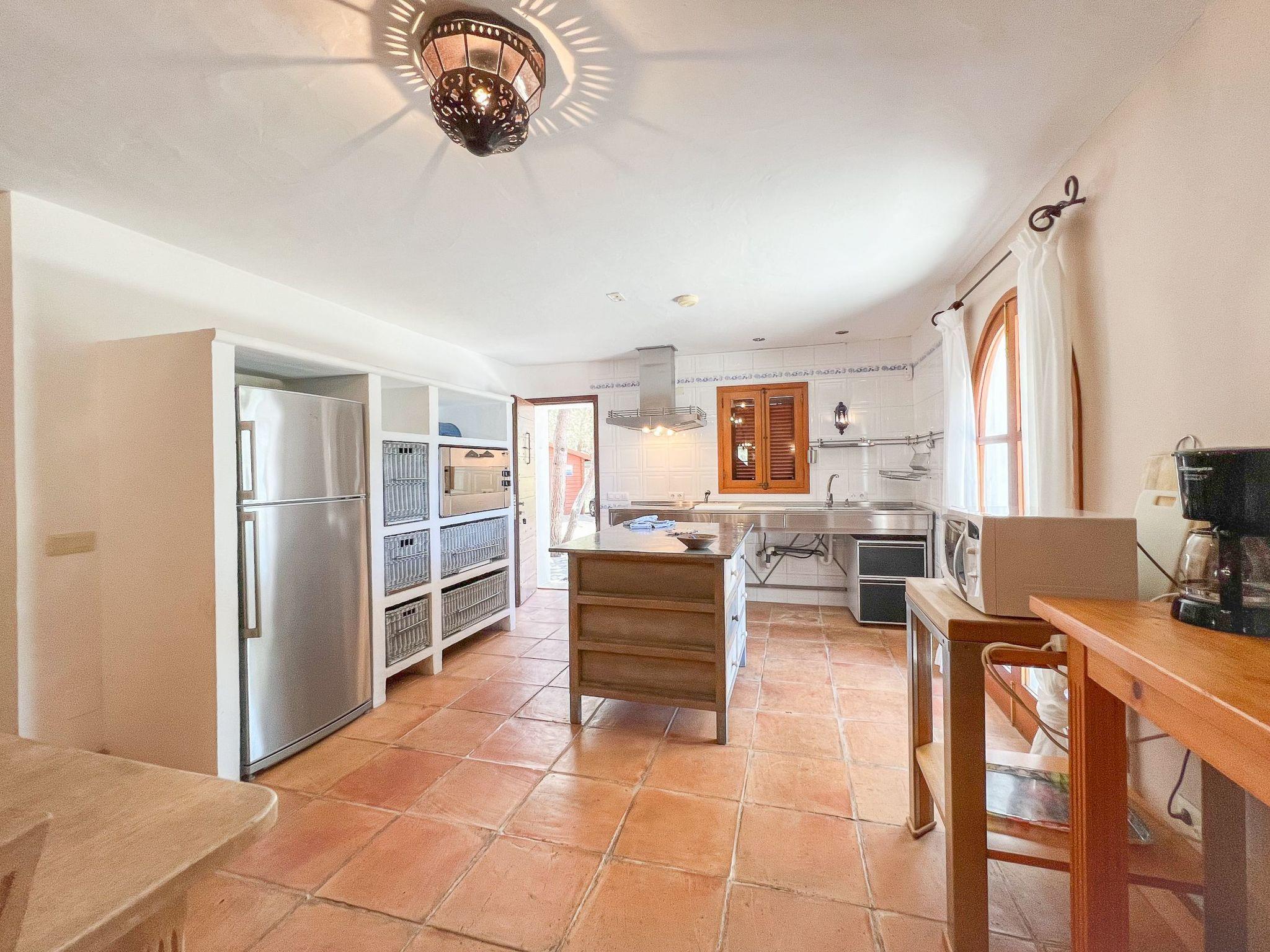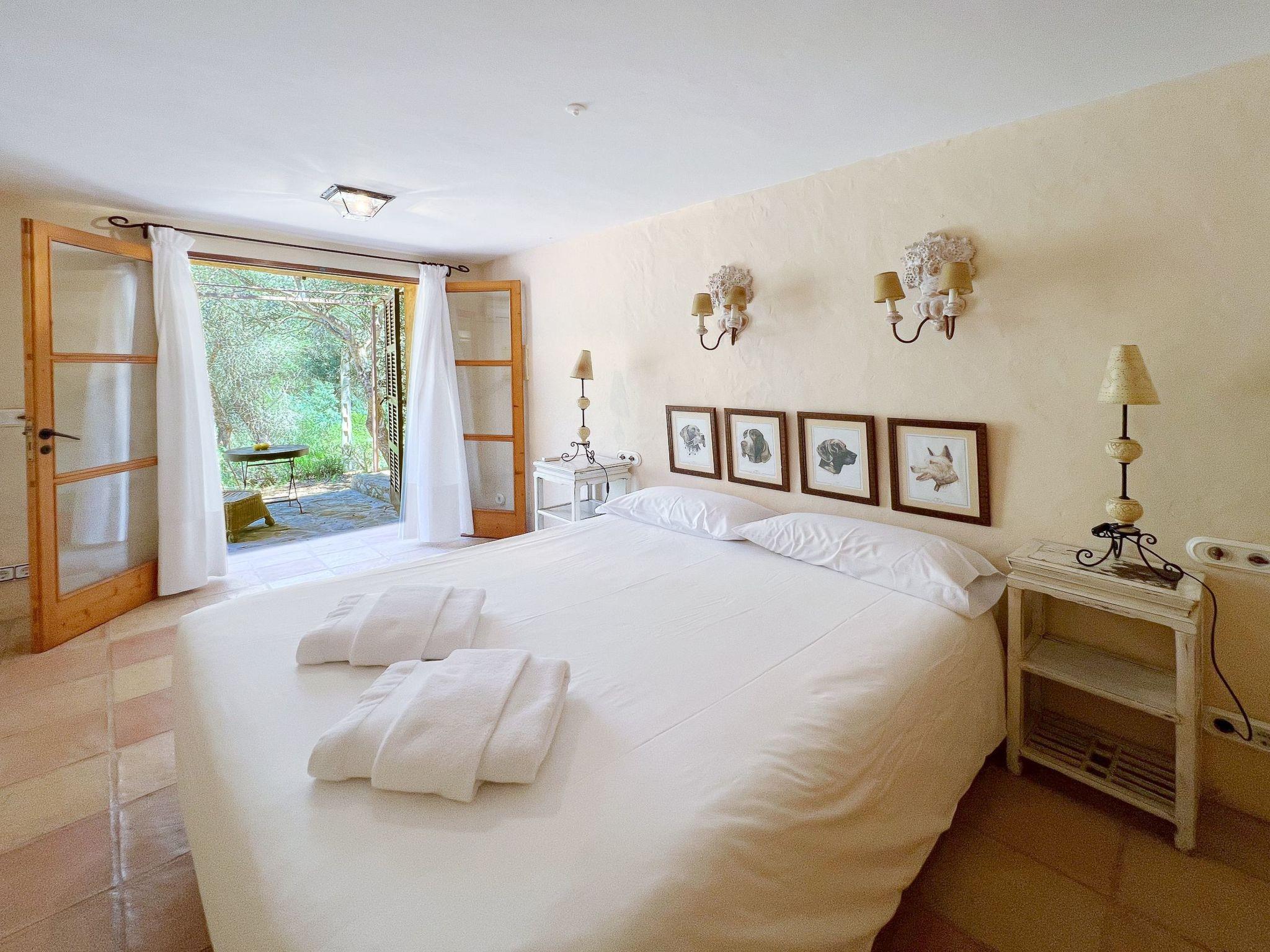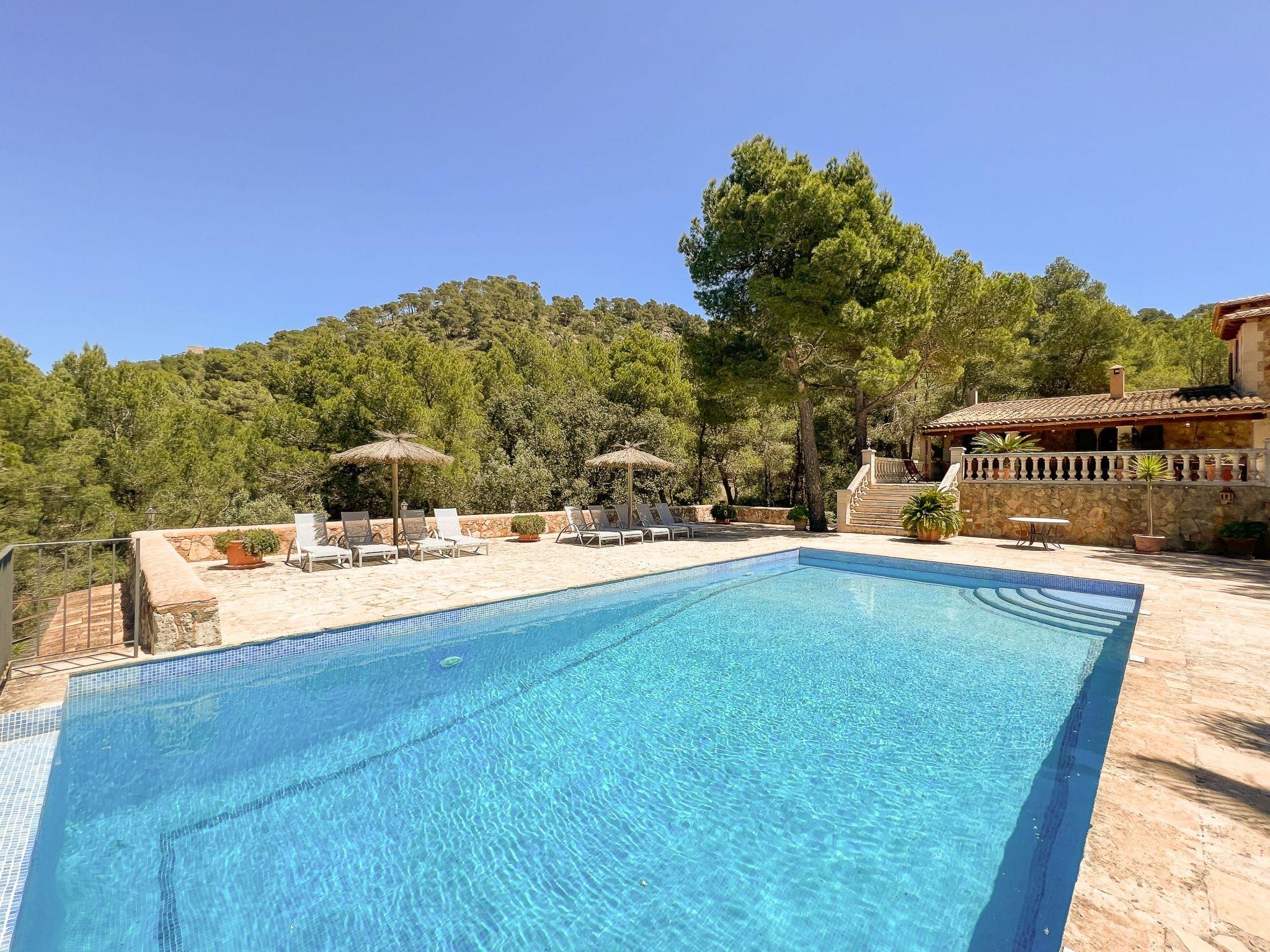 Finca Binifarda Dor is a marvellous country house with a typical country house design, such as high ceilings with wooden beams. The spacious house has plenty of natural light. The main house houses the kitchen, the living and dining area and 2 bedrooms. The other three bedrooms are located separately near the pool and from the outside a few steps lead us into the main house. On the ground floor there is a large open-plan area where the kitchen and the living/dining room are located. The furnishings are in a rustic style. The kitchen has a cooking island and is well equipped. A large dining table and a comfortable seating area invite you to linger. There is a great fireplace between the dining and living area. Next to the kitchen is the utility room and on the ground floor there is a bedroom for 1 person with access to the outside and a separate shower. A narrow wooden staircase leads to the upper floor with a double bed and an en-suite bathroom with a large corner bath. The bedroom can also be accessed from the outside. The other three bedrooms are located separately from the house on a lower level with access from the outside. There is one double bedroom with en-suite shower room and two twin bedrooms each with en-suite bathrooms. The bedroom on the first floor and the three separate bedrooms have hot/cold air conditioning with fixed and limited hours of use.