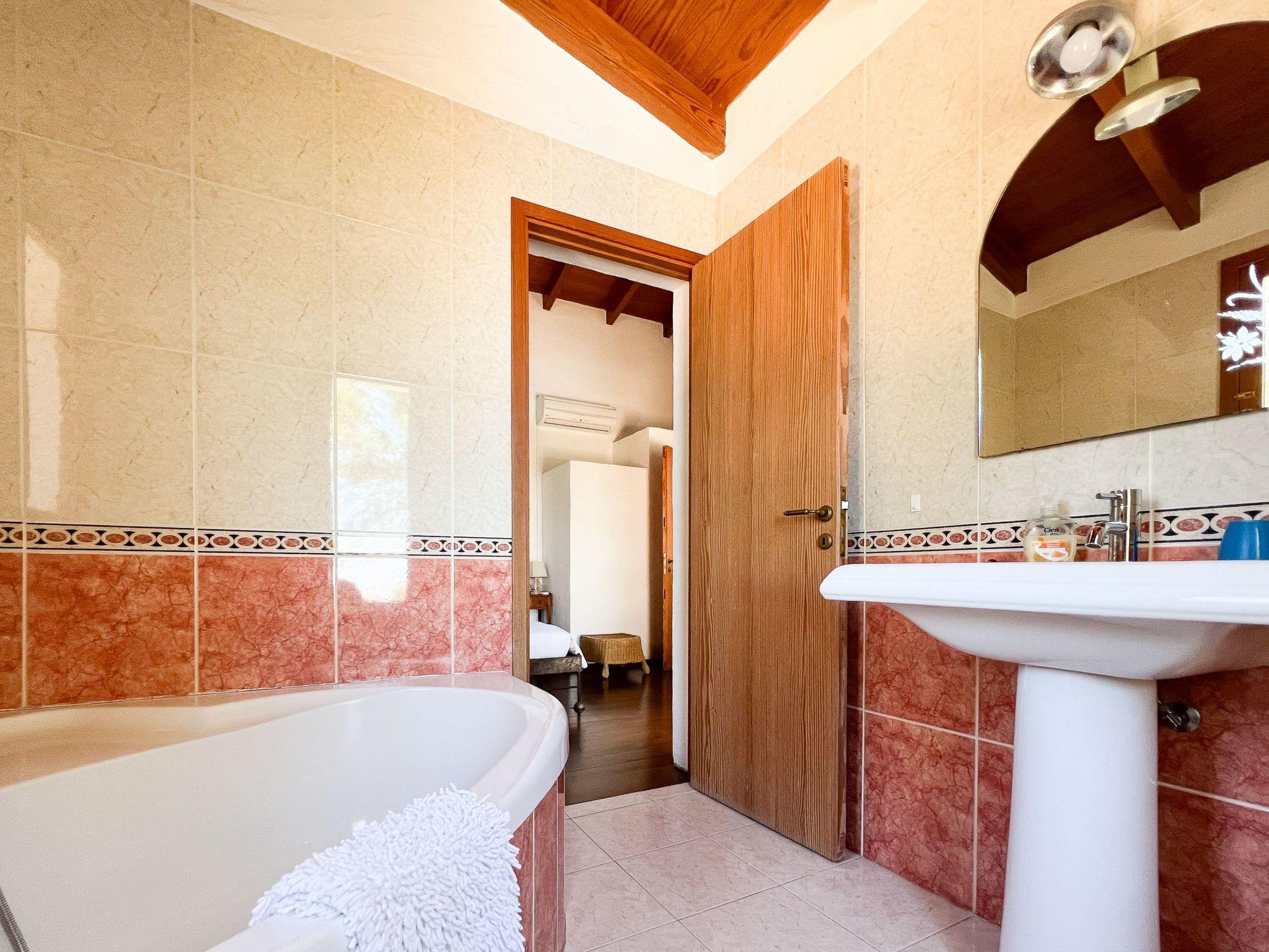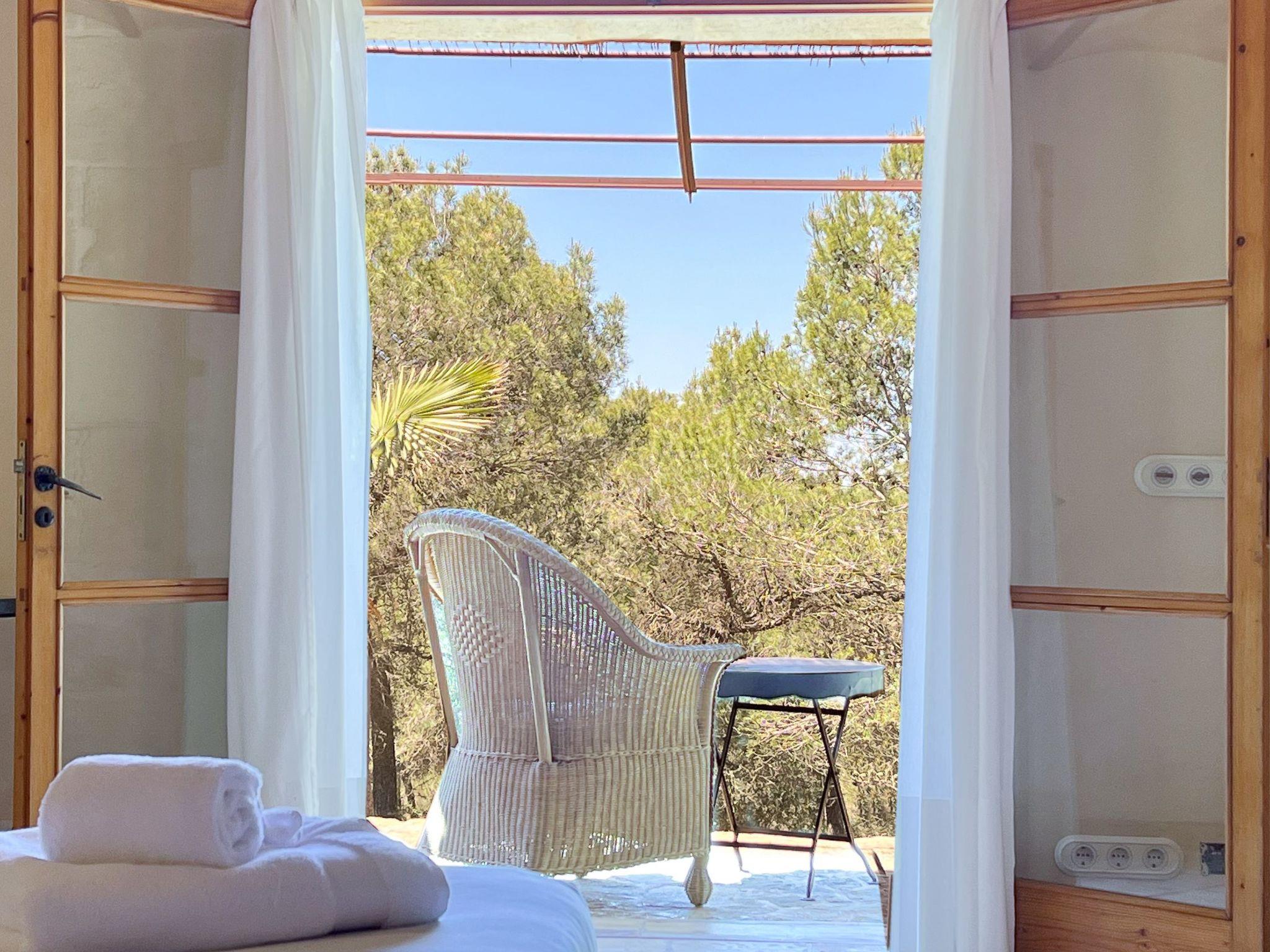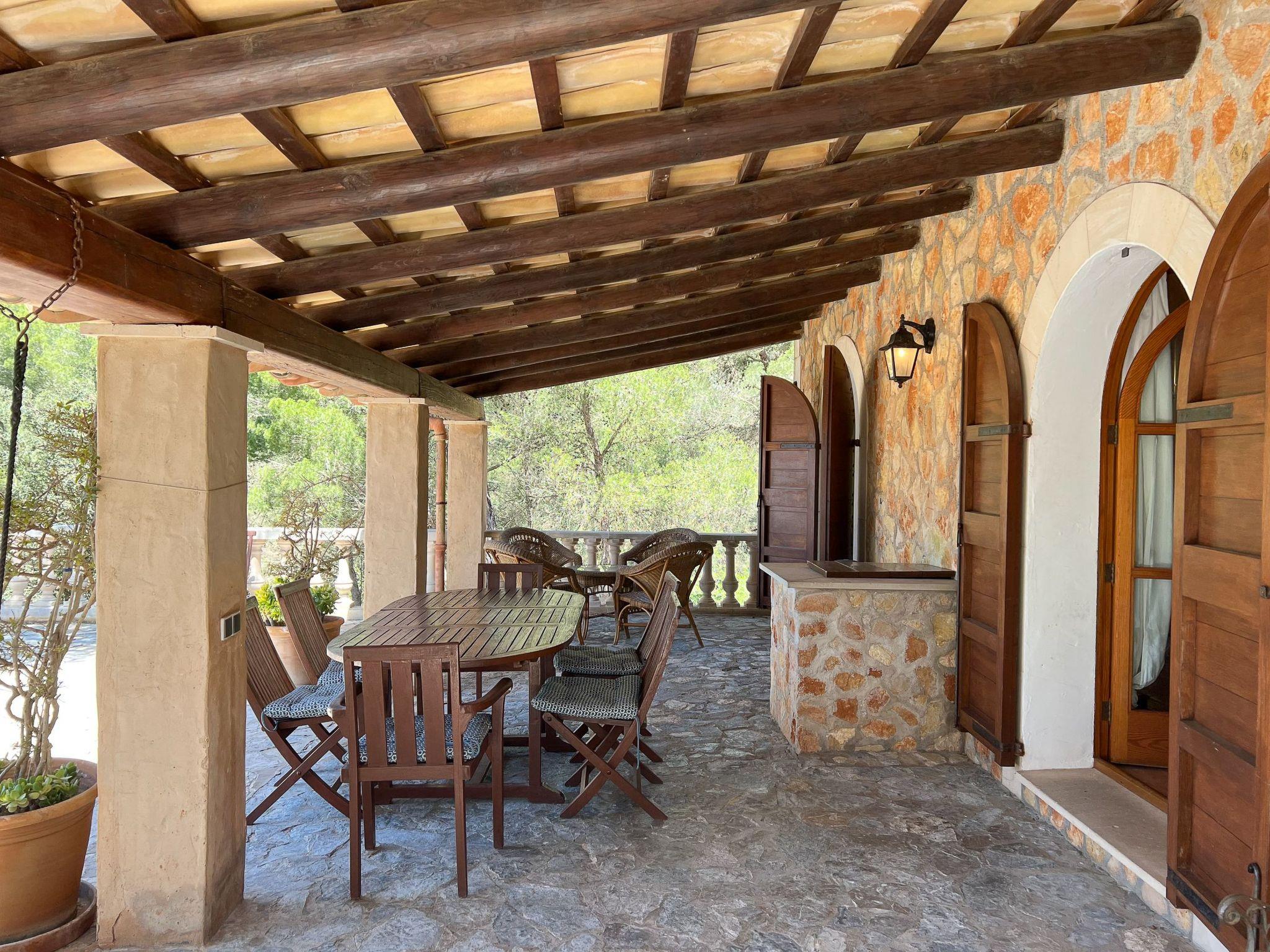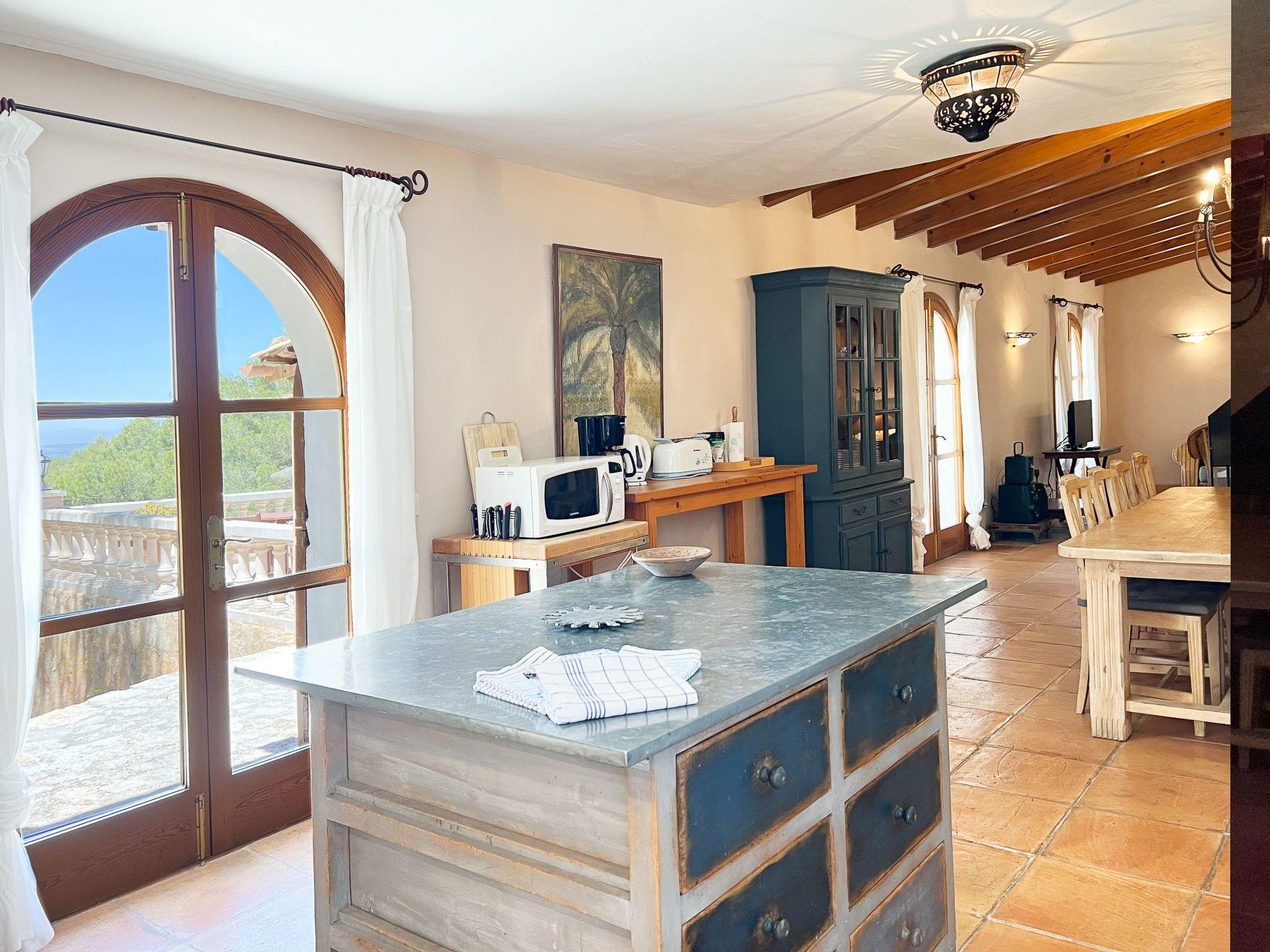 Finca Binifarda Dor is a marvellous country house with a typical country house design, such as high ceilings with wooden beams. The spacious house has plenty of natural light. The main house houses the kitchen, the living and dining area and 2 bedrooms. The other three bedrooms are located separately near the pool and from the outside a few steps lead us into the main house. On the ground floor there is a large open-plan area where the kitchen and the living/dining room are located. The furnishings are in a rustic style. The kitchen has a cooking island and is well equipped. A large dining table and a comfortable seating area invite you to linger. There is a great fireplace between the dining and living area. Next to the kitchen is the utility room and on the ground floor there is a bedroom for 1 person with access to the outside and a separate shower. A narrow wooden staircase leads to the upper floor with a double bed and an en-suite bathroom with a large corner bath. The bedroom can also be accessed from the outside. The other three bedrooms are located separately from the house on a lower level with access from the outside. There is one double bedroom with en-suite shower room and two twin bedrooms each with en-suite bathrooms. The bedroom on the first floor and the three separate bedrooms have hot/cold air conditioning with fixed and limited hours of use.