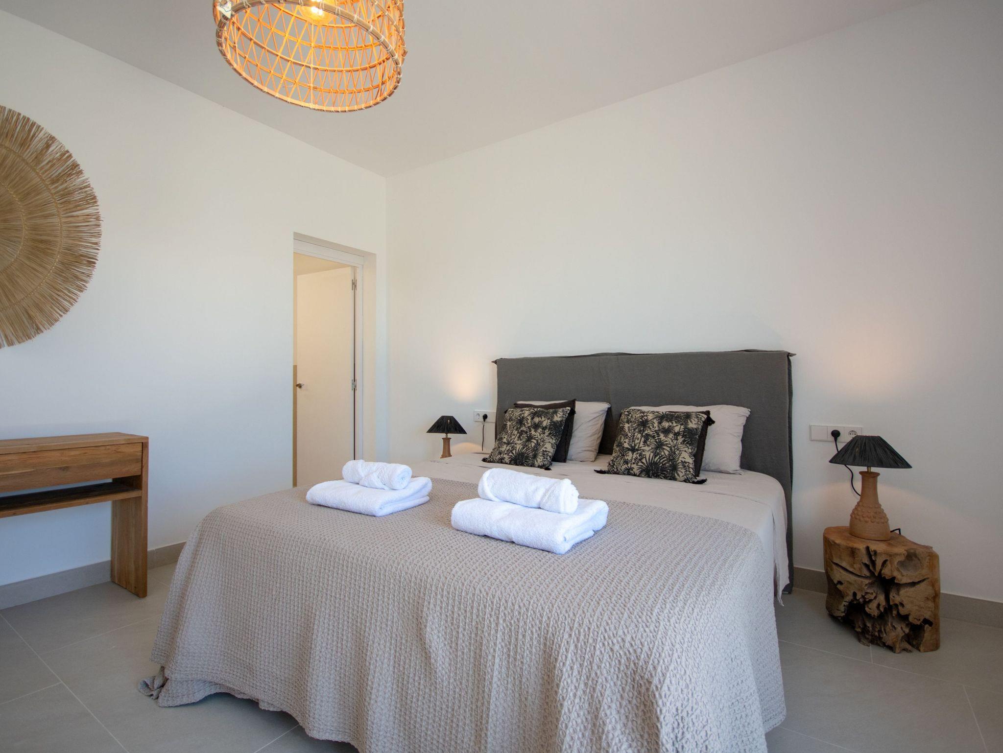 Die Villa verfügt über drei geräumige Schlafzimmer mit Klimaanlage und Einbauschränken. Eines davon hat ein eigenes Bad, die beiden anderen teilen sich ein Bad in der Nähe. Außerdem gibt es im ersten Stock eine Sitzecke mit Puff und Tischfußball, und das dritte Schlafzimmer hat einen eigenen Balkon mit Meerblick.