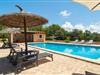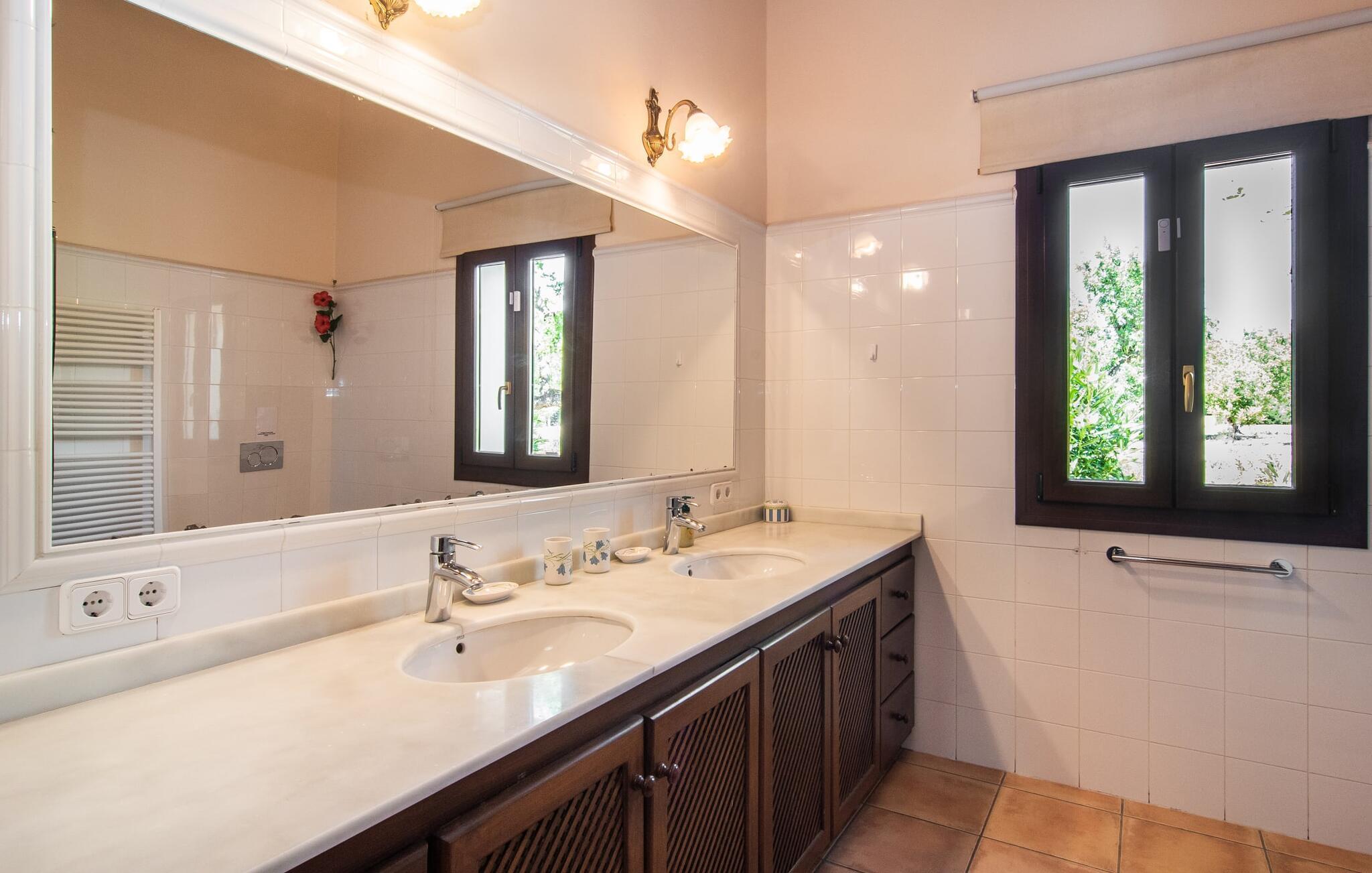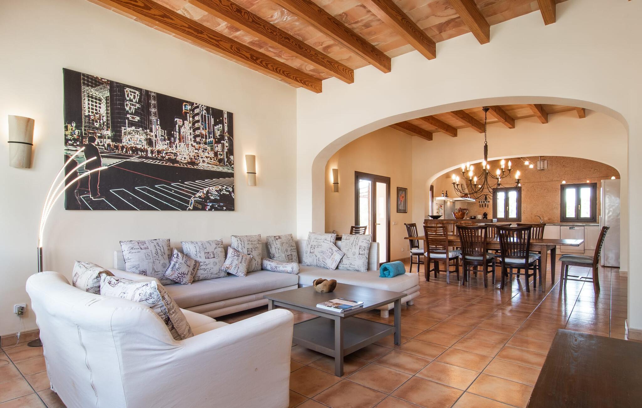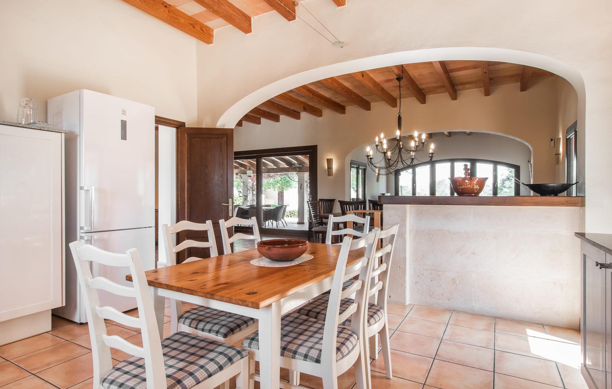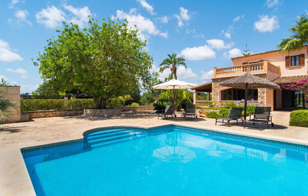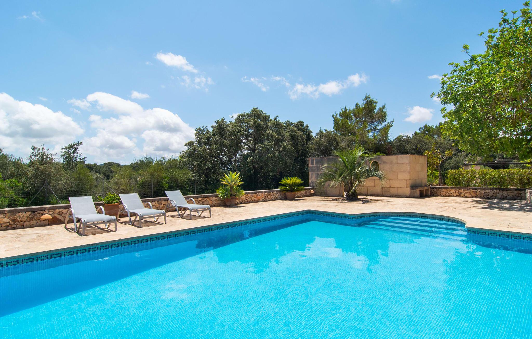 Feriehuset "Feliz" på den sydøstlige del af Mallorca tilbyder komfortabel indkvartering for op til 10 personer. Det er indlejret i smukt anlagte grunde og tilbyder en masse fred og privatliv takket være sin afsondrede beliggenhed. Der er flere overdækkede terrasser rundt om huset til hyggelig spisning på ethvert tidspunkt af dagen. En mobil grill er også tilgængelig. Det rummelige poolområde har en stor solterrasse med forskellige skyggefulde områder. Lige ved siden af poolen er der et lille hus med endnu et hyggeligt opholdsområde i skyggen. Landhusets øverste etage har to store altanterrasser. Herfra har I udsigt til poolen, middelhavshaven og de idylliske omgivelser. Indvendigt er sommerhuset lige så rummeligt som udearealerne. Stueetagen er domineret af en åben opholdsstue. Den består af en central spiseplads, et rummeligt køkken og to forskellige stuer med komfortable sofaer. Der er også et lille skrivebord til hjemmekontoret - huset har en stabil internetforbindelse. Denne opdeling sikrer, at alle gæster kan finde flere behagelige steder at trække sig tilbage, selv når huset har maksimal belægning. Det moderne køkken er fuldt udstyret og tilbyder en ekstra spiseplads til 6 personer. Den tilstødende overdækkede terrasse med udsigt over poolen er let tilgængelig fra opholdsstuen. Derudover er der i stueplan to soveværelser med dobbeltsenge, et gæstetoilet, et badeværelse og et vaskerum. På øverste etage er der yderligere tre dobbeltværelser, hvoraf to har udgang til deres egen store altan. Et af soveområderne har desuden eget badeværelse. Der er også et individuelt badeværelse på denne etage. Forresten: Landstedet er også ideelt udstyret til ferie i den køligere sæson. Stueetagen er udstyret med gulvvarme; Der er radiatorer i det øverste område. Feriehuset "Feliz" på den sydøstlige del af Mallorca ligger på en stor, isoleret landlig ejendom 10 minutter i bil fra Felanitx. Felanitx byder på gode indkøbsmuligheder. De smukke badebugter Cala Sa Nau og Cala Mitjana ligger 26 minutters kørsel derfra. Den maleriske havn Portocolom ligger 18 km derfra.