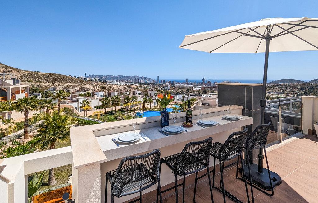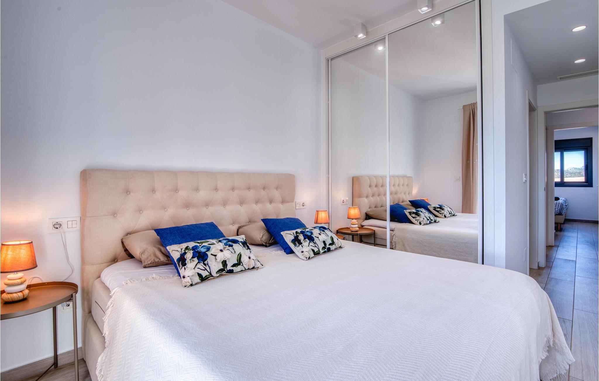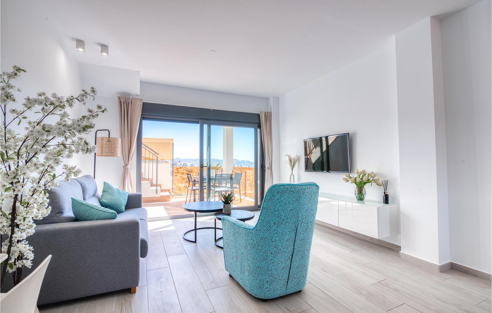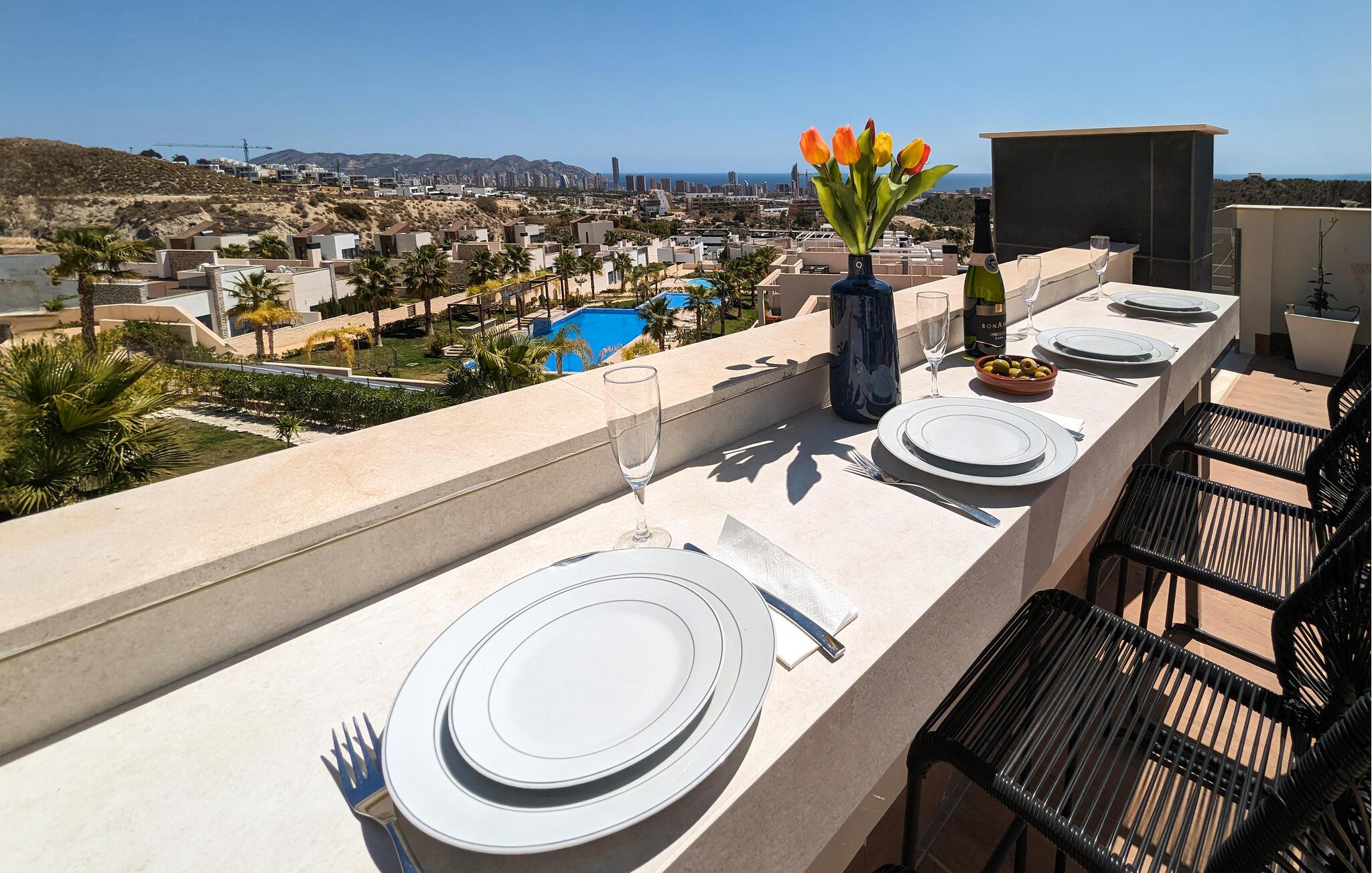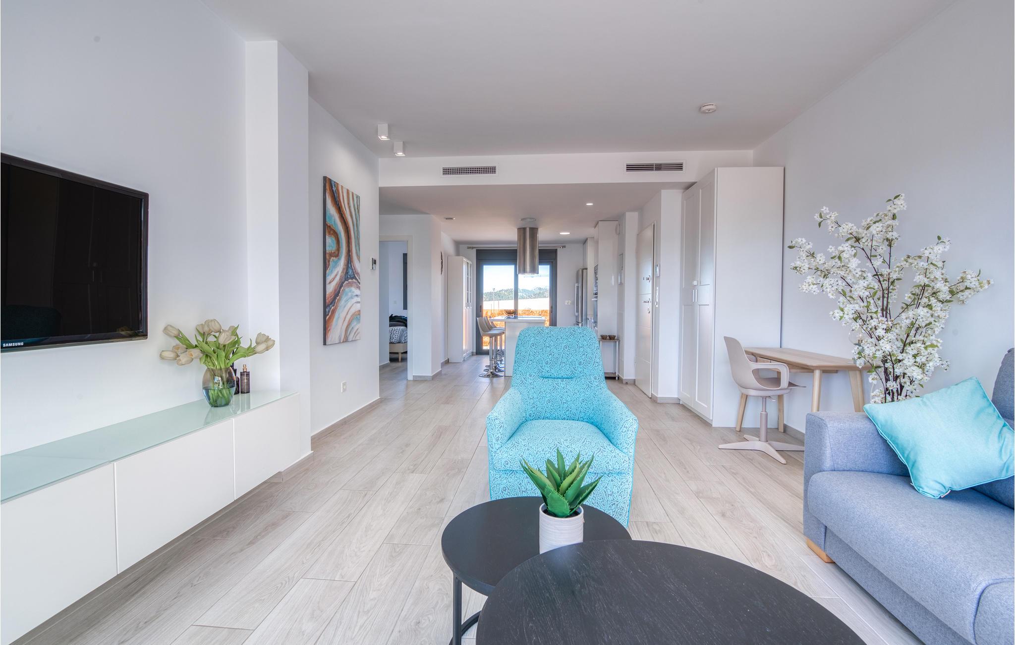 Den indbydende lejlighed er det optimale sted for en afslappende pause med de bedste underholdningsmuligheder i nærheden, herunder golfbanen, som I kan nå til fods. I vil føle jer hjemme, så snart I træder ind i de lyse lokaler. Her er luft og lys allestedsnærværende, og den moderne og komfortable indretning runder oplevelsen af. Så snart I vågner kan I nyde et fantastisk panorama. Planlæg jeres dags udflugter og aktiviteter over morgenmad med en vidunderlig udsigt, eller slap af ved den fællespool. Nyd solen i fulde drag på terrassen, herfra kan I se havet, forfriske jer i poolen og lade hverdagen ligge. Om aftenen kan I slappe af på tagterrassen og tilberede nogle lækre retter på grillen.