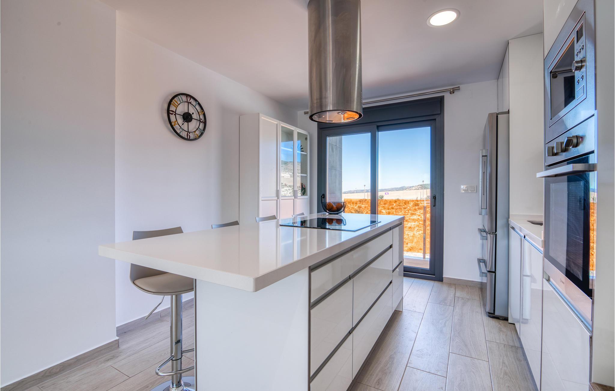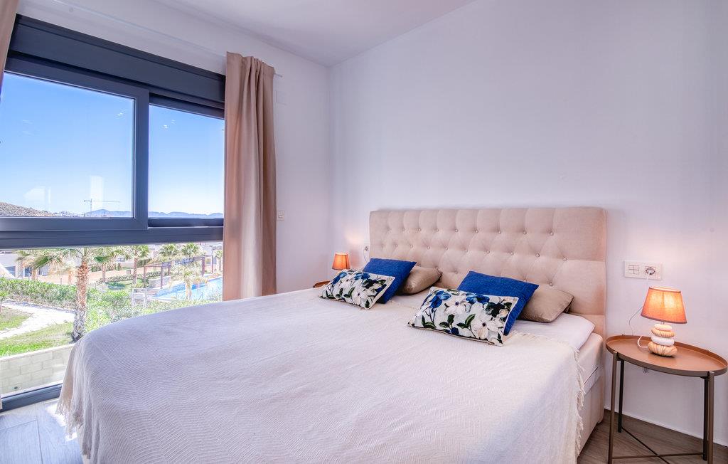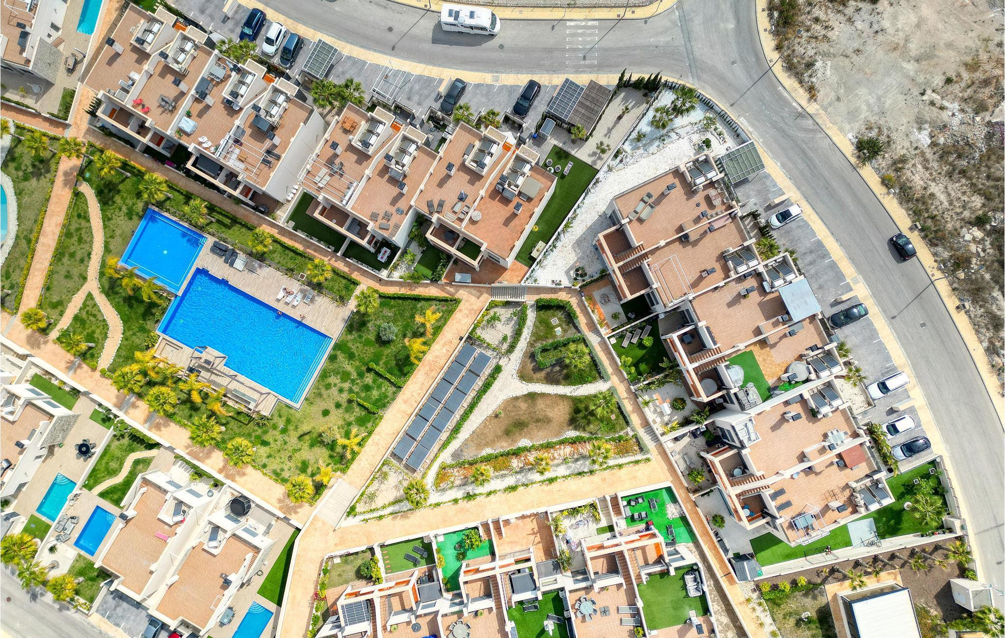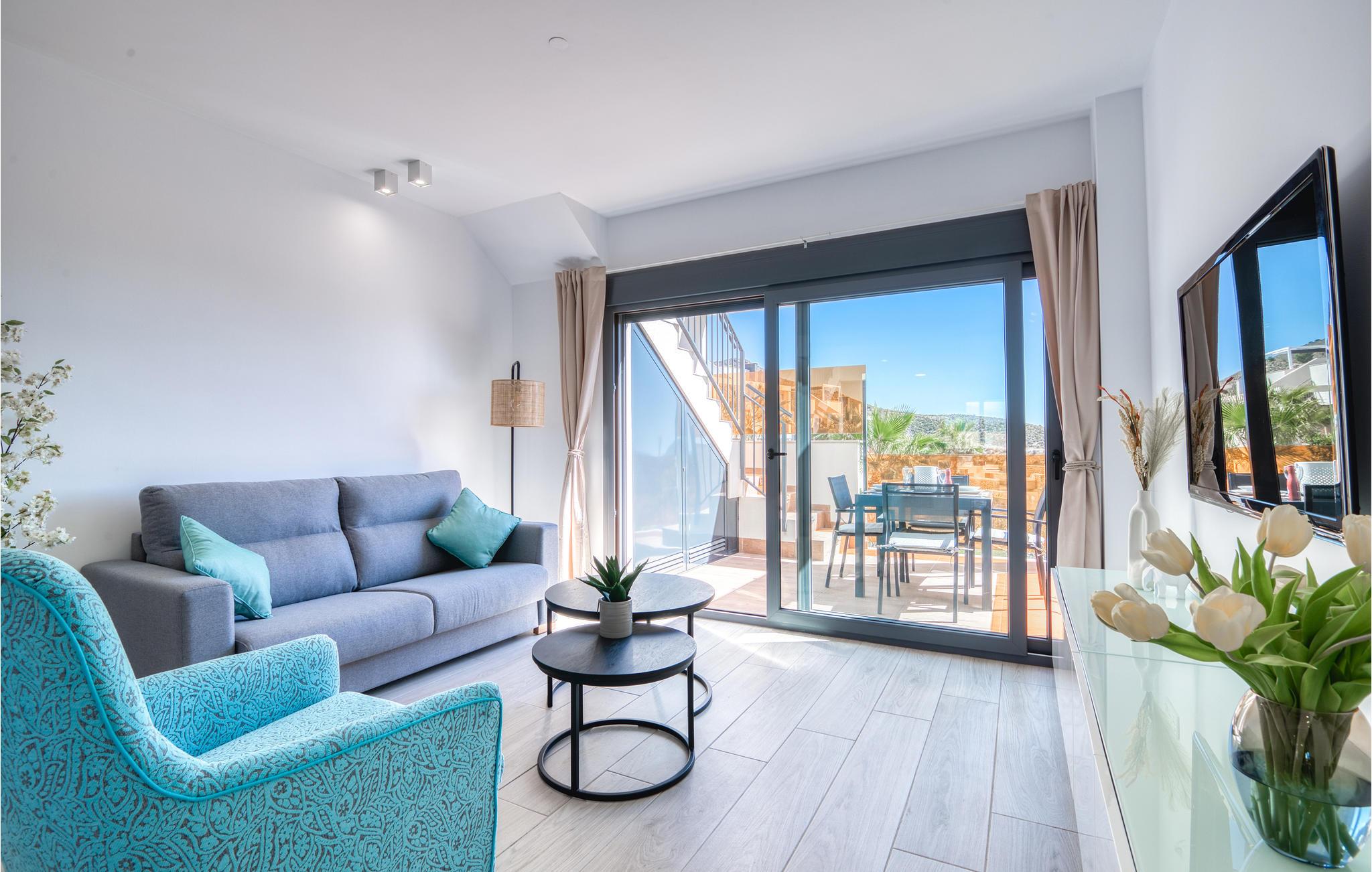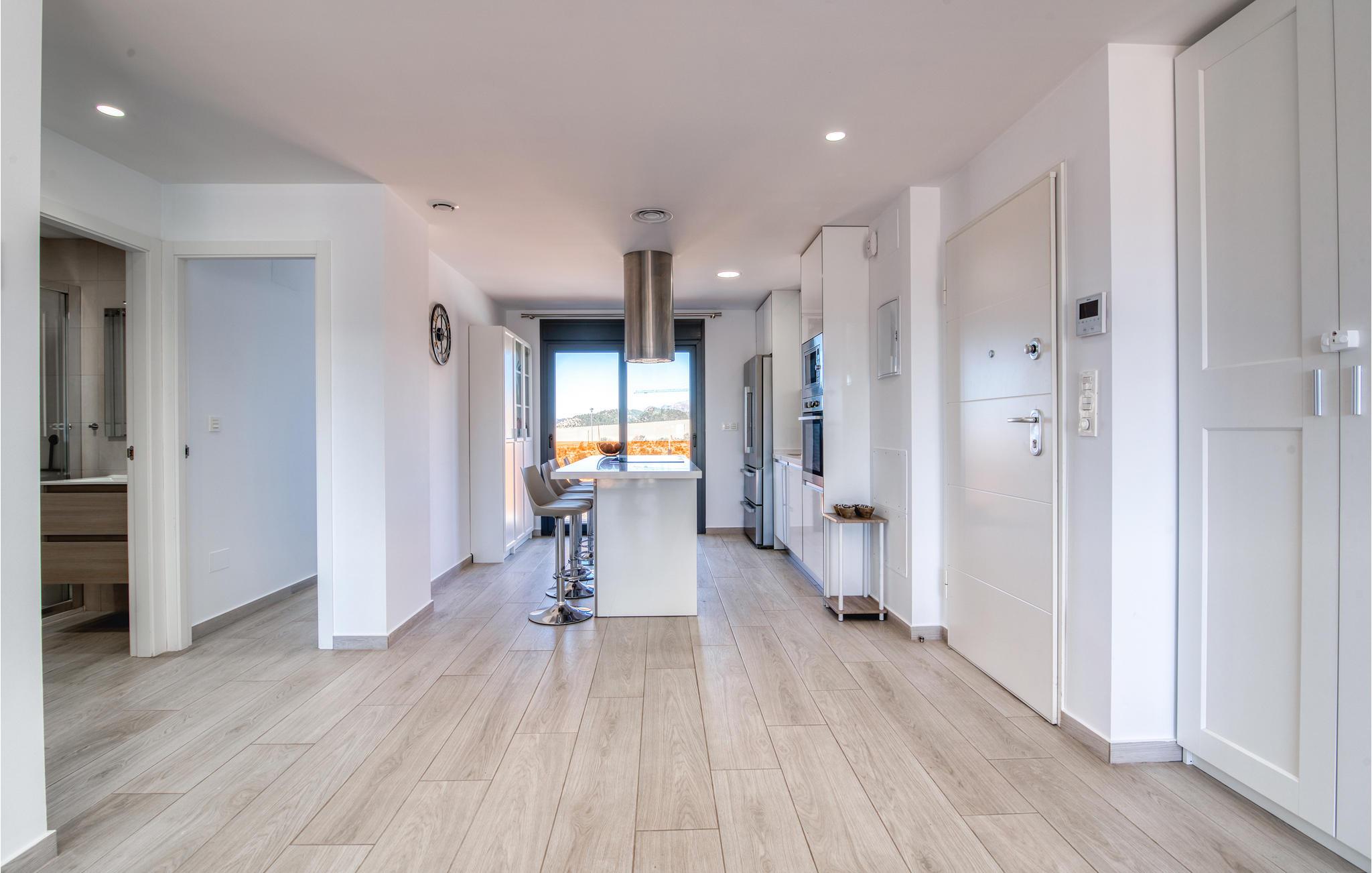 Den indbydende lejlighed er det optimale sted for en afslappende pause med de bedste underholdningsmuligheder i nærheden, herunder golfbanen, som I kan nå til fods. I vil føle jer hjemme, så snart I træder ind i de lyse lokaler. Her er luft og lys allestedsnærværende, og den moderne og komfortable indretning runder oplevelsen af. Så snart I vågner kan I nyde et fantastisk panorama. Planlæg jeres dags udflugter og aktiviteter over morgenmad med en vidunderlig udsigt, eller slap af ved den fællespool. Nyd solen i fulde drag på terrassen, herfra kan I se havet, forfriske jer i poolen og lade hverdagen ligge. Om aftenen kan I slappe af på tagterrassen og tilberede nogle lækre retter på grillen.