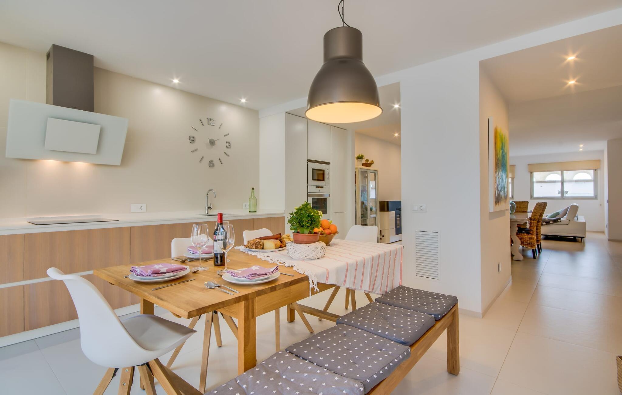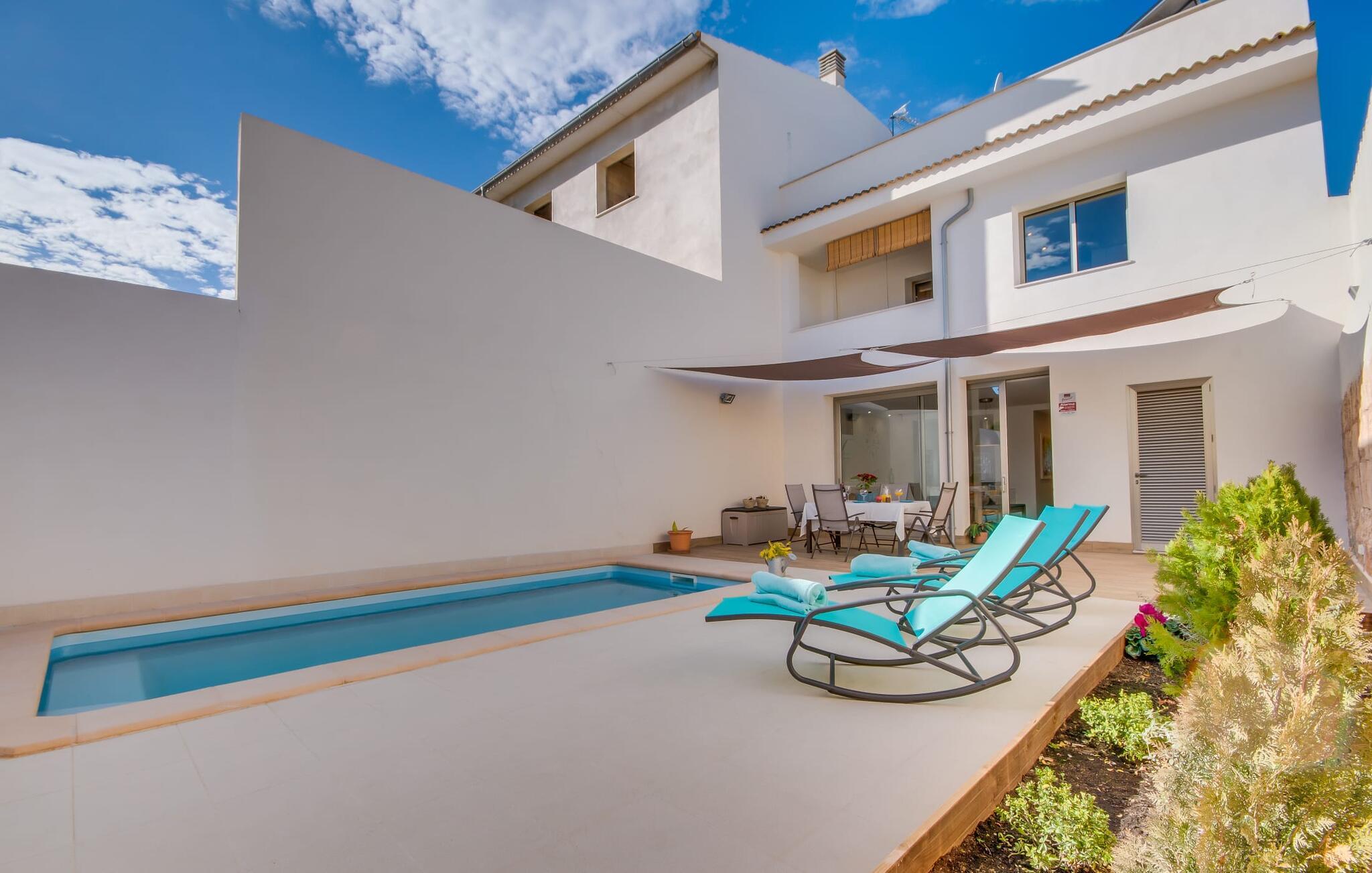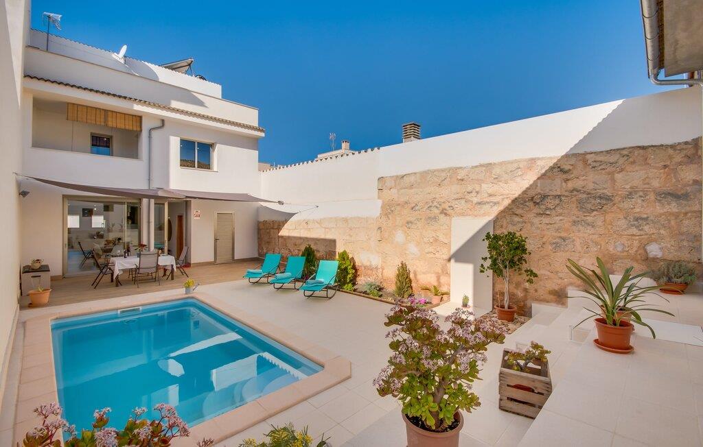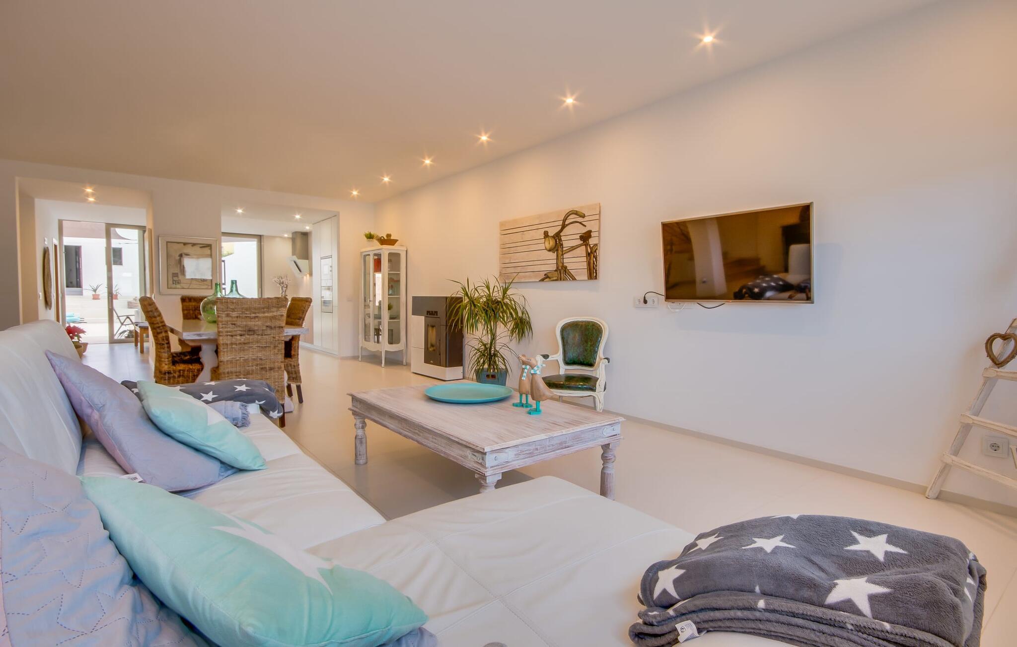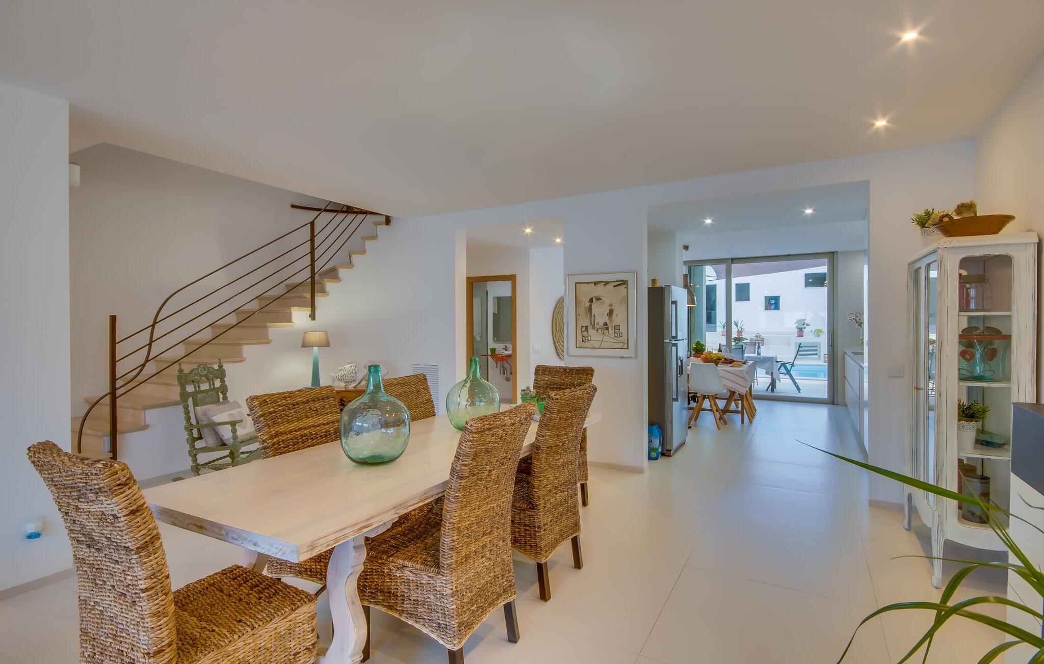 Kunne I tænke jer at holde ferie på Mallorca, men er hverken begejstret for hoteller eller det rolige landliv i en afsondret villa? Så har vi det helt rigtige midlertidige hjem til jer med det smukke rækkehus "Foners Mallorquins"! Dette lyse og hvide drømmehus ligger midt i den rustikke, charmerende landsby Muro på den nordlige del af Mallorca. Efter at have kørt fra lufthavnen kan I parkere jeres lejebil direkte på gaden ved huset og derefter fordybe jer i øens autentiske stress og jag. Det velholdte rækkehus er ikke kun et perfekt udgangspunkt, men også et vidunderligt afslappende tilflugtssted. På terrassen, som er delvist overdækket med skyggefulde markiser, finder I spisebord og stole samt indbydende liggestole. Perfekt til solbadning, men også til at finde et behageligt skyggefuldt sted at læse en god bog. I kan til enhver tid tage en forfriskende svømmetur i jeres afsondrede pool, skjult for naboernes udsigt og indrammet af en stilfuld brolagt terrasse med et puristisk design og rustik naturstensvæg, udendørs bruser og kærligt dekoreret plantebed. "Foners Mallorquins" er også en sand perle indefra. Takket være de store vinduespartier og det moderne lyssystem med mange små, integrerede loftslamper er alt lyst på alle tider af døgnet Den meget muntre, velholdte og stilrene atmosfære er blandt andet takket være den hyggelige interiør, som er præget af et design med stor kærlighed til detaljer og en særlig flair. Stueetagen er meget åben: Store glasdøre fører fra terrassen direkte ind i det stilfulde køkken, som er udstyret med førsteklasses hårde hvidevarer. Køkkenet har et stort spisebord og mange siddemuligheder. Om morgenen kan I få en afslappet morgenmad; Senere på dagen kan I tilberede kulinariske lækkerier til en udendørs middelhavsmiddag på terrassen. I kan også nyde jeres middag sammen i husets tilstødende opholds- og spiseområde. Der finder I endnu et stort bord med smukke kurvestole med et naturligt look - til at nyde overdådige måltider og udveksle gode historier. Blot et par skridt videre indbyder en lys hvid hyggelig sofa med talrige puder og tæpper jer til at tilbringe en hyggelig aften med at se tv. I finder også et smart badeværelse i stueetagen af "Foners Mallorquins". Når I er behageligt træt efter en lang, solrig dag, kan I bare gå forbi den smukke limegrønne vippe og op ad den elegante stentrappe. Soveværelserne er placeret i to etager og har en kærlig, individuel indretning - i hvidt, med farverige detaljer, der umiddelbart skaber en glad stemning. De smukke, delvist kunstfærdigt udskårne senge er et blikfang, og der er rummelige garderobeskabe i alle rum til jeres feriegarderobe. Det ene soveværelse, uden dør, er skjult på 3. sal i huset og kan nås direkte via trappen, mens de to andre soveværelser - hvoraf det ene har direkte udgang til en hyggelig lille altan - er i en sal med to soveværelser og meget moderne badeværelser med bruser i gulvniveau. "Foners Mallorquins" er et lysfyldt rækkehus midt i den rustikke landsby Muro på den nordlige del af øen - og tilbyder en masse privatliv. Takket være den centrale beliggenhed er alt i gåafstand - uanset om I vil shoppe eller besøge en af restauranterne. Men så snart I lukker jeres hoveddør, befinder I jer i jeres eget lille stykke paradis. I den private, afsondrede pool kan I forfriske jer i vidunderlig fred og ro, mens strande som C'an Picafort eller Alcúdia-bugten kun ligger omkring 14 km væk.