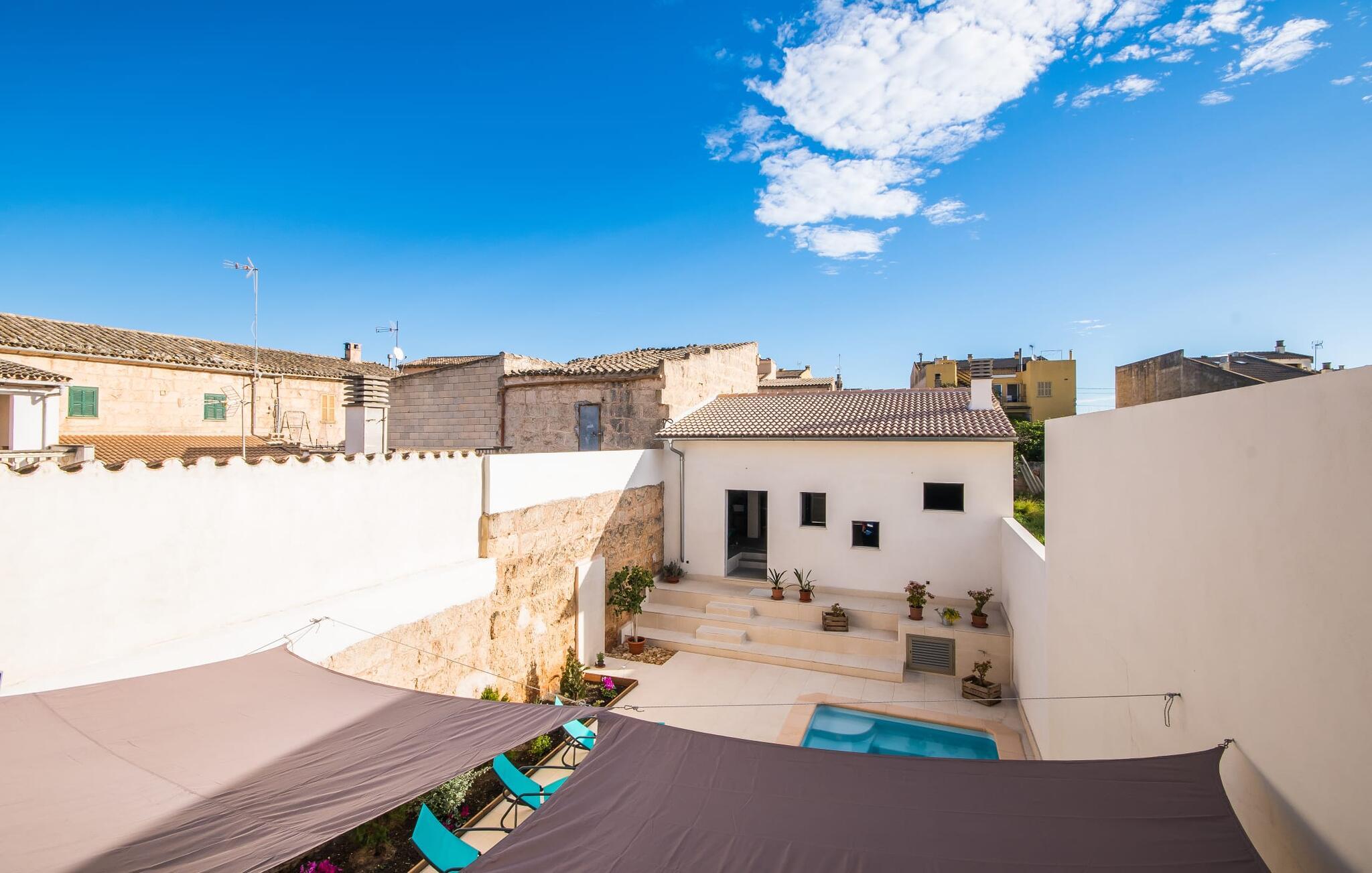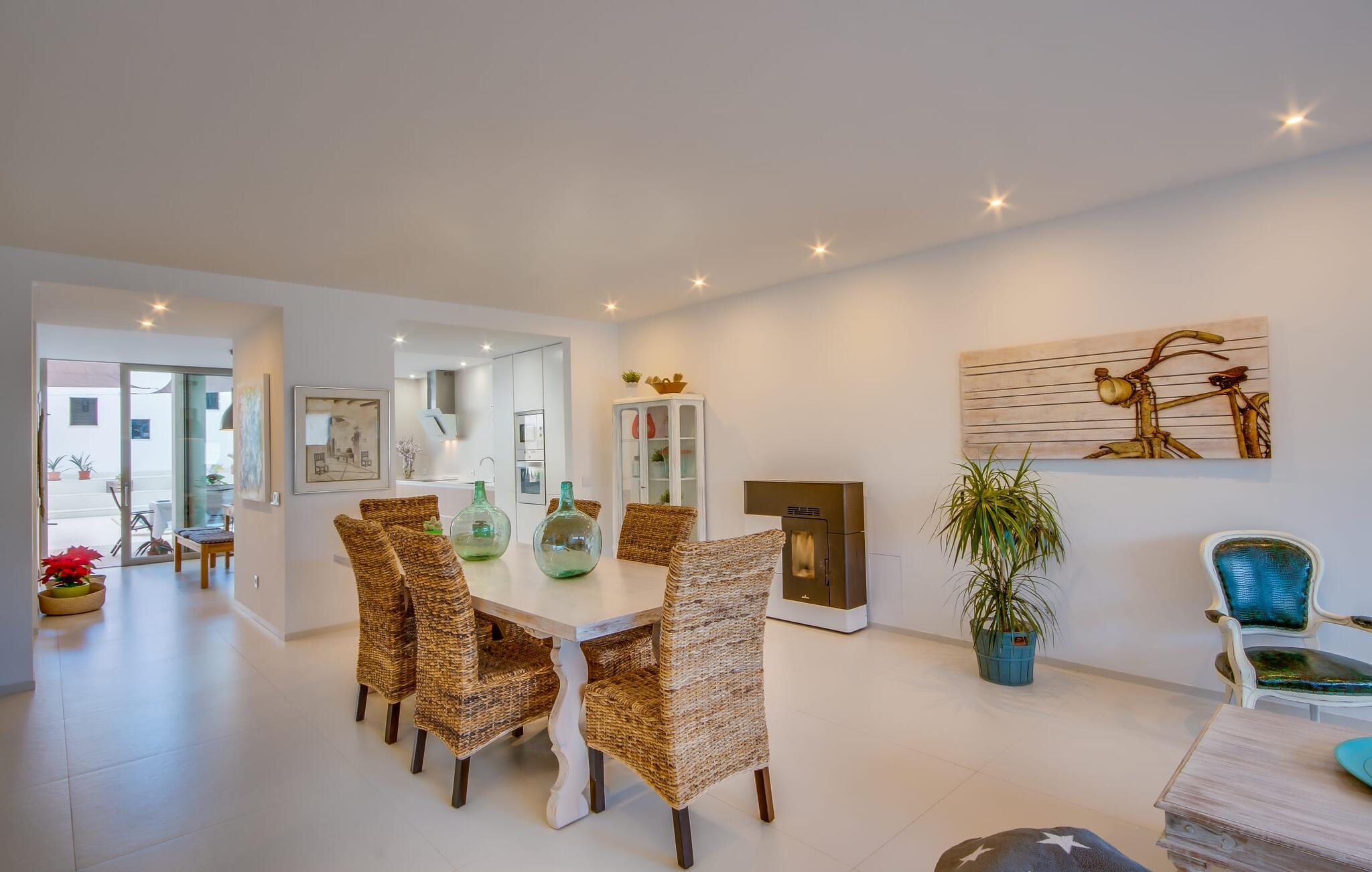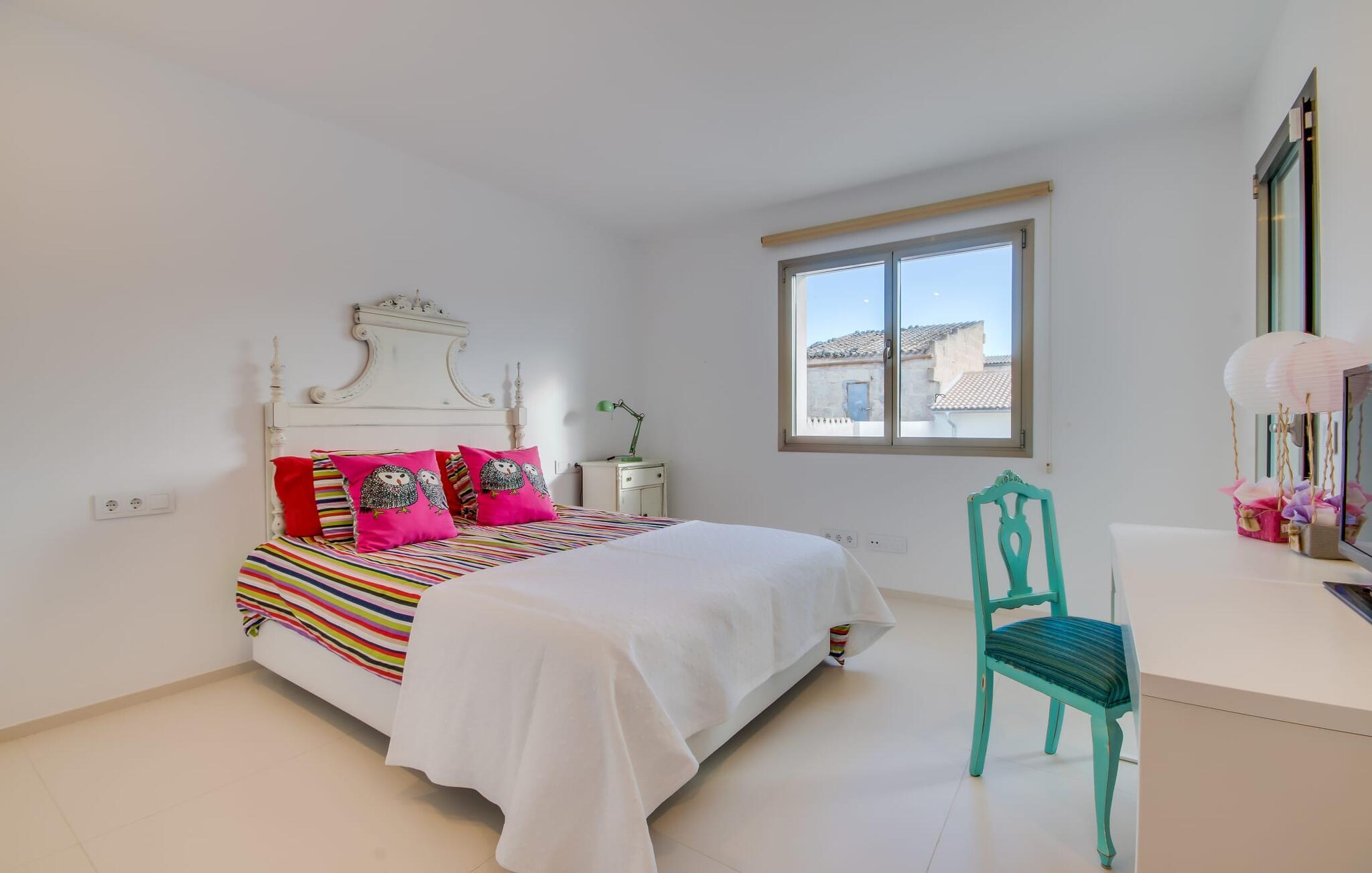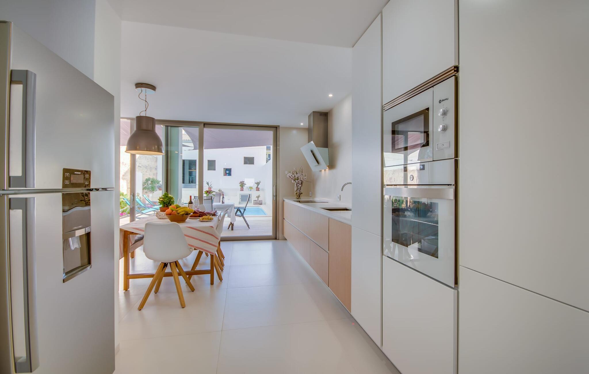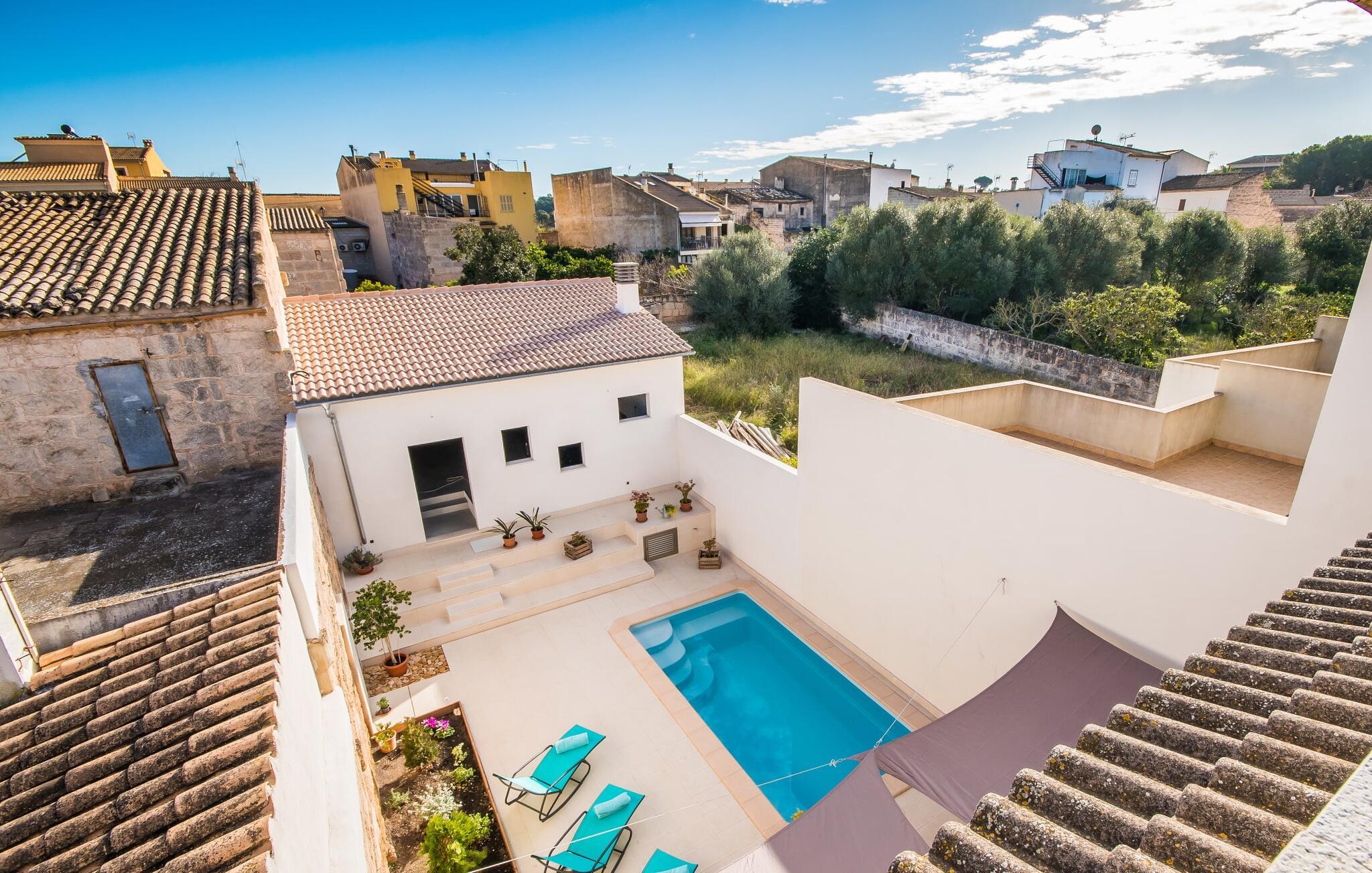 Kunne I tænke jer at holde ferie på Mallorca, men er hverken begejstret for hoteller eller det rolige landliv i en afsondret villa? Så har vi det helt rigtige midlertidige hjem til jer med det smukke rækkehus "Foners Mallorquins"! Dette lyse og hvide drømmehus ligger midt i den rustikke, charmerende landsby Muro på den nordlige del af Mallorca. Efter at have kørt fra lufthavnen kan I parkere jeres lejebil direkte på gaden ved huset og derefter fordybe jer i øens autentiske stress og jag. Det velholdte rækkehus er ikke kun et perfekt udgangspunkt, men også et vidunderligt afslappende tilflugtssted. På terrassen, som er delvist overdækket med skyggefulde markiser, finder I spisebord og stole samt indbydende liggestole. Perfekt til solbadning, men også til at finde et behageligt skyggefuldt sted at læse en god bog. I kan til enhver tid tage en forfriskende svømmetur i jeres afsondrede pool, skjult for naboernes udsigt og indrammet af en stilfuld brolagt terrasse med et puristisk design og rustik naturstensvæg, udendørs bruser og kærligt dekoreret plantebed. "Foners Mallorquins" er også en sand perle indefra. Takket være de store vinduespartier og det moderne lyssystem med mange små, integrerede loftslamper er alt lyst på alle tider af døgnet Den meget muntre, velholdte og stilrene atmosfære er blandt andet takket være den hyggelige interiør, som er præget af et design med stor kærlighed til detaljer og en særlig flair. Stueetagen er meget åben: Store glasdøre fører fra terrassen direkte ind i det stilfulde køkken, som er udstyret med førsteklasses hårde hvidevarer. Køkkenet har et stort spisebord og mange siddemuligheder. Om morgenen kan I få en afslappet morgenmad; Senere på dagen kan I tilberede kulinariske lækkerier til en udendørs middelhavsmiddag på terrassen. I kan også nyde jeres middag sammen i husets tilstødende opholds- og spiseområde. Der finder I endnu et stort bord med smukke kurvestole med et naturligt look - til at nyde overdådige måltider og udveksle gode historier. Blot et par skridt videre indbyder en lys hvid hyggelig sofa med talrige puder og tæpper jer til at tilbringe en hyggelig aften med at se tv. I finder også et smart badeværelse i stueetagen af "Foners Mallorquins". Når I er behageligt træt efter en lang, solrig dag, kan I bare gå forbi den smukke limegrønne vippe og op ad den elegante stentrappe. Soveværelserne er placeret i to etager og har en kærlig, individuel indretning - i hvidt, med farverige detaljer, der umiddelbart skaber en glad stemning. De smukke, delvist kunstfærdigt udskårne senge er et blikfang, og der er rummelige garderobeskabe i alle rum til jeres feriegarderobe. Det ene soveværelse, uden dør, er skjult på 3. sal i huset og kan nås direkte via trappen, mens de to andre soveværelser - hvoraf det ene har direkte udgang til en hyggelig lille altan - er i en sal med to soveværelser og meget moderne badeværelser med bruser i gulvniveau. "Foners Mallorquins" er et lysfyldt rækkehus midt i den rustikke landsby Muro på den nordlige del af øen - og tilbyder en masse privatliv. Takket være den centrale beliggenhed er alt i gåafstand - uanset om I vil shoppe eller besøge en af restauranterne. Men så snart I lukker jeres hoveddør, befinder I jer i jeres eget lille stykke paradis. I den private, afsondrede pool kan I forfriske jer i vidunderlig fred og ro, mens strande som C'an Picafort eller Alcúdia-bugten kun ligger omkring 14 km væk.