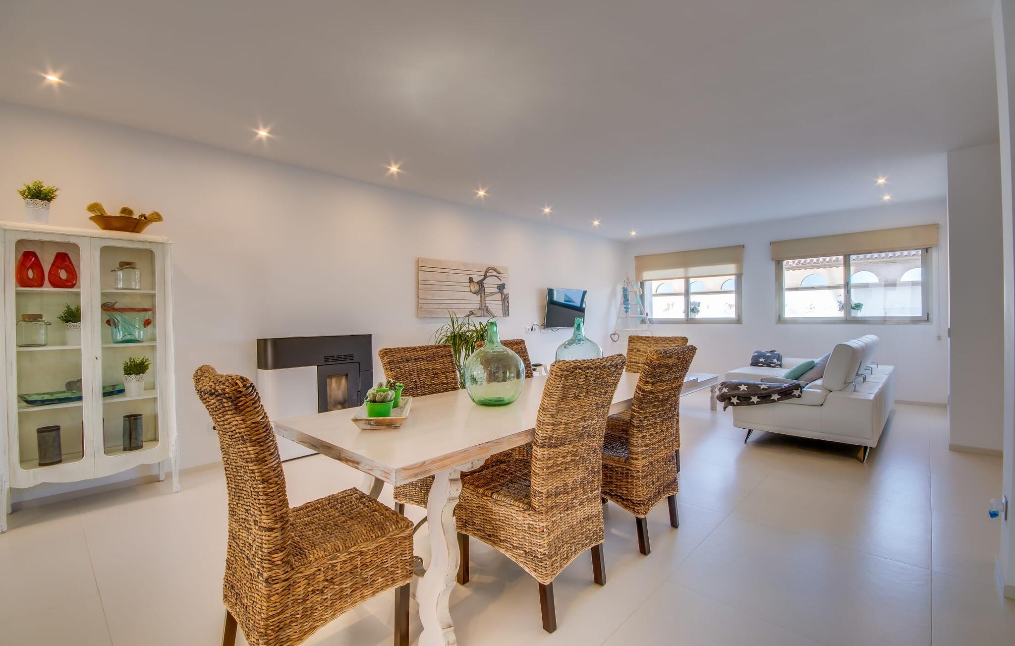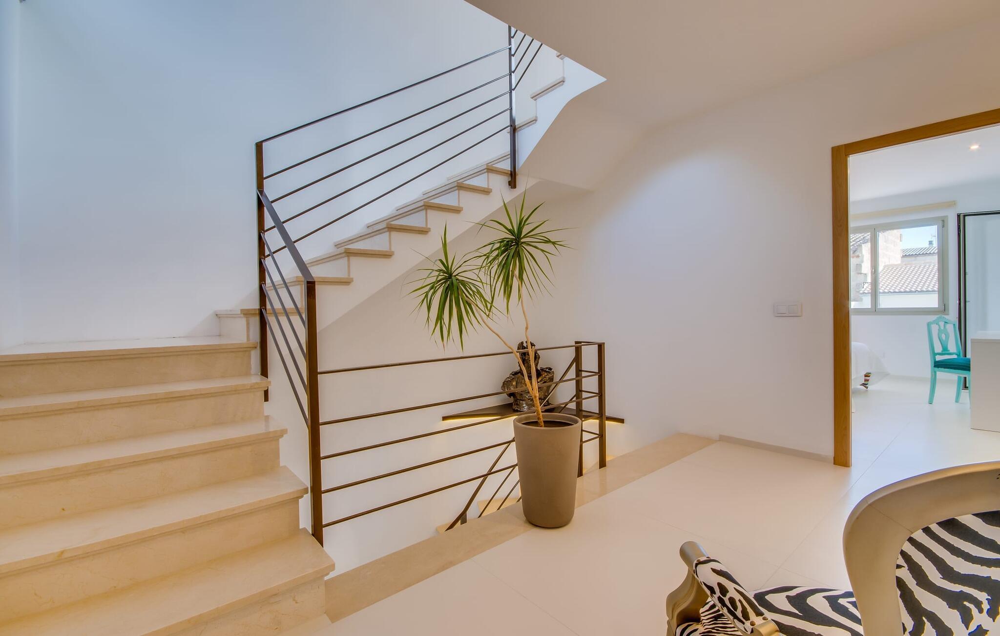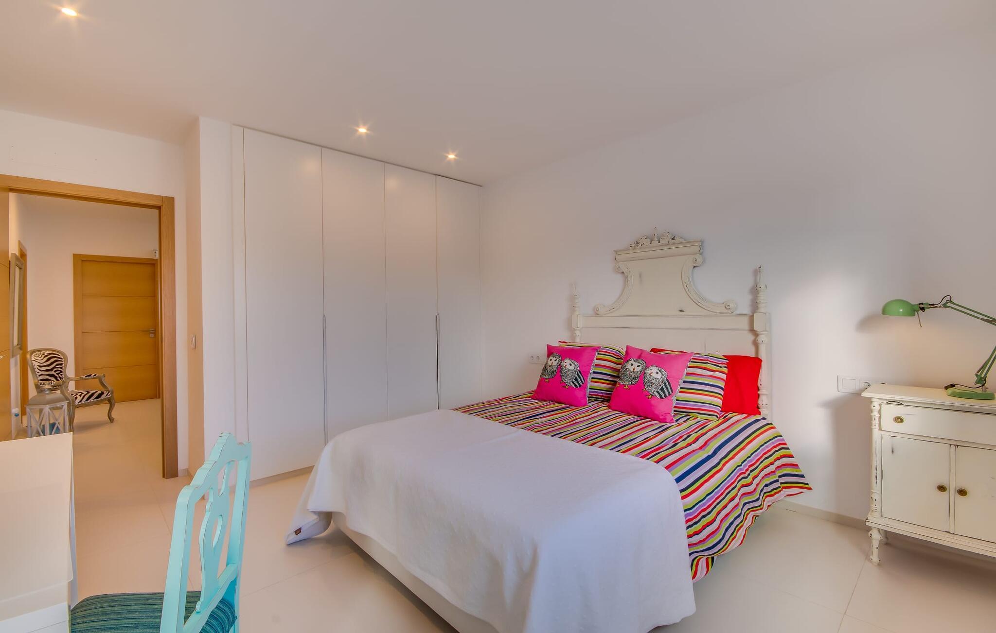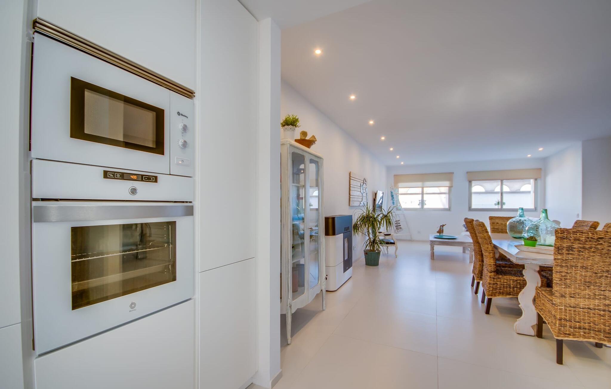 Kunne I tænke jer at holde ferie på Mallorca, men er hverken begejstret for hoteller eller det rolige landliv i en afsondret villa? Så har vi det helt rigtige midlertidige hjem til jer med det smukke rækkehus "Foners Mallorquins"! Dette lyse og hvide drømmehus ligger midt i den rustikke, charmerende landsby Muro på den nordlige del af Mallorca. Efter at have kørt fra lufthavnen kan I parkere jeres lejebil direkte på gaden ved huset og derefter fordybe jer i øens autentiske stress og jag. Det velholdte rækkehus er ikke kun et perfekt udgangspunkt, men også et vidunderligt afslappende tilflugtssted. På terrassen, som er delvist overdækket med skyggefulde markiser, finder I spisebord og stole samt indbydende liggestole. Perfekt til solbadning, men også til at finde et behageligt skyggefuldt sted at læse en god bog. I kan til enhver tid tage en forfriskende svømmetur i jeres afsondrede pool, skjult for naboernes udsigt og indrammet af en stilfuld brolagt terrasse med et puristisk design og rustik naturstensvæg, udendørs bruser og kærligt dekoreret plantebed. "Foners Mallorquins" er også en sand perle indefra. Takket være de store vinduespartier og det moderne lyssystem med mange små, integrerede loftslamper er alt lyst på alle tider af døgnet Den meget muntre, velholdte og stilrene atmosfære er blandt andet takket være den hyggelige interiør, som er præget af et design med stor kærlighed til detaljer og en særlig flair. Stueetagen er meget åben: Store glasdøre fører fra terrassen direkte ind i det stilfulde køkken, som er udstyret med førsteklasses hårde hvidevarer. Køkkenet har et stort spisebord og mange siddemuligheder. Om morgenen kan I få en afslappet morgenmad; Senere på dagen kan I tilberede kulinariske lækkerier til en udendørs middelhavsmiddag på terrassen. I kan også nyde jeres middag sammen i husets tilstødende opholds- og spiseområde. Der finder I endnu et stort bord med smukke kurvestole med et naturligt look - til at nyde overdådige måltider og udveksle gode historier. Blot et par skridt videre indbyder en lys hvid hyggelig sofa med talrige puder og tæpper jer til at tilbringe en hyggelig aften med at se tv. I finder også et smart badeværelse i stueetagen af "Foners Mallorquins". Når I er behageligt træt efter en lang, solrig dag, kan I bare gå forbi den smukke limegrønne vippe og op ad den elegante stentrappe. Soveværelserne er placeret i to etager og har en kærlig, individuel indretning - i hvidt, med farverige detaljer, der umiddelbart skaber en glad stemning. De smukke, delvist kunstfærdigt udskårne senge er et blikfang, og der er rummelige garderobeskabe i alle rum til jeres feriegarderobe. Det ene soveværelse, uden dør, er skjult på 3. sal i huset og kan nås direkte via trappen, mens de to andre soveværelser - hvoraf det ene har direkte udgang til en hyggelig lille altan - er i en sal med to soveværelser og meget moderne badeværelser med bruser i gulvniveau. "Foners Mallorquins" er et lysfyldt rækkehus midt i den rustikke landsby Muro på den nordlige del af øen - og tilbyder en masse privatliv. Takket være den centrale beliggenhed er alt i gåafstand - uanset om I vil shoppe eller besøge en af restauranterne. Men så snart I lukker jeres hoveddør, befinder I jer i jeres eget lille stykke paradis. I den private, afsondrede pool kan I forfriske jer i vidunderlig fred og ro, mens strande som C'an Picafort eller Alcúdia-bugten kun ligger omkring 14 km væk.