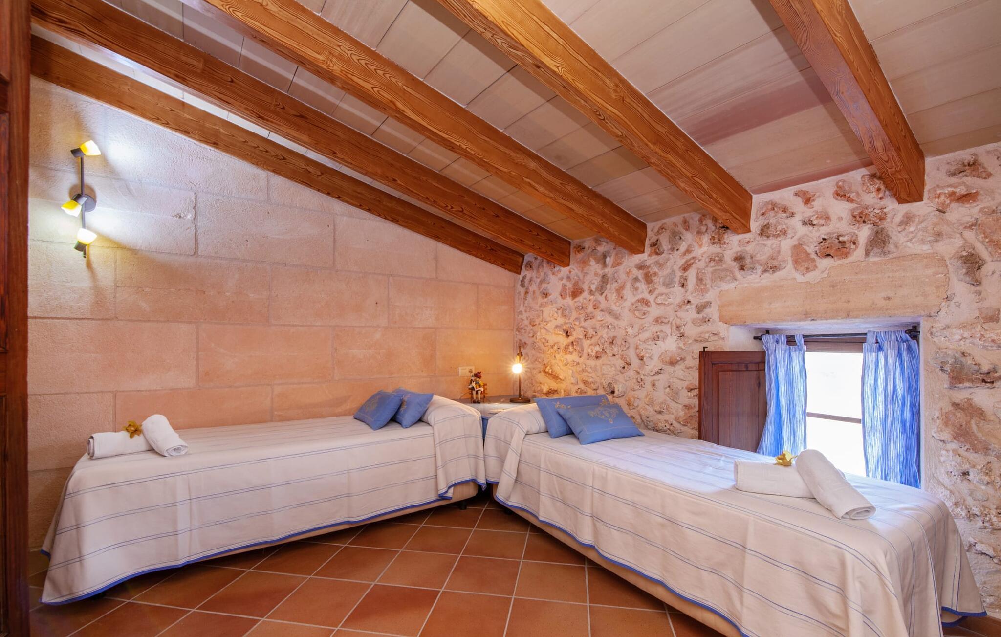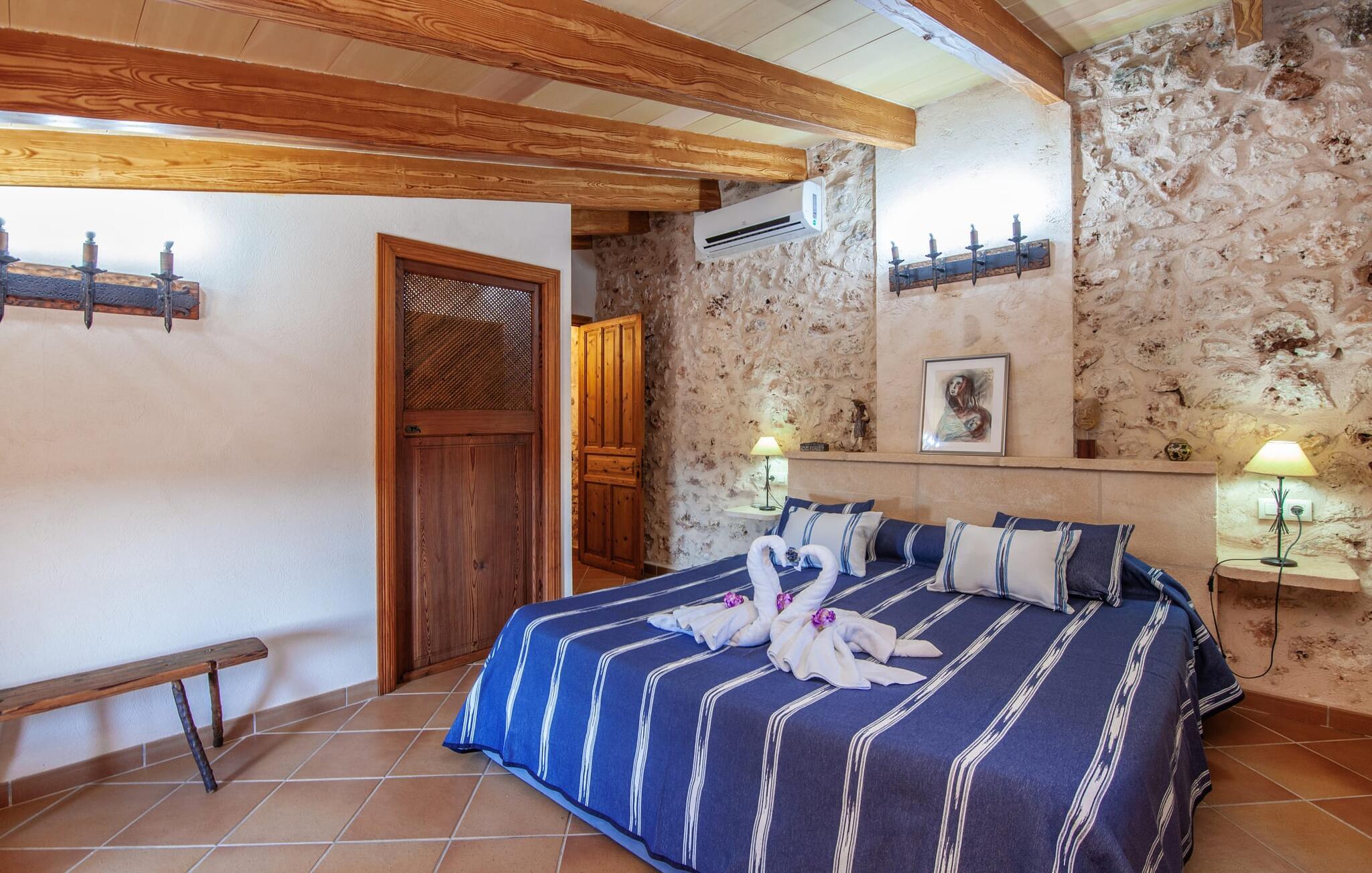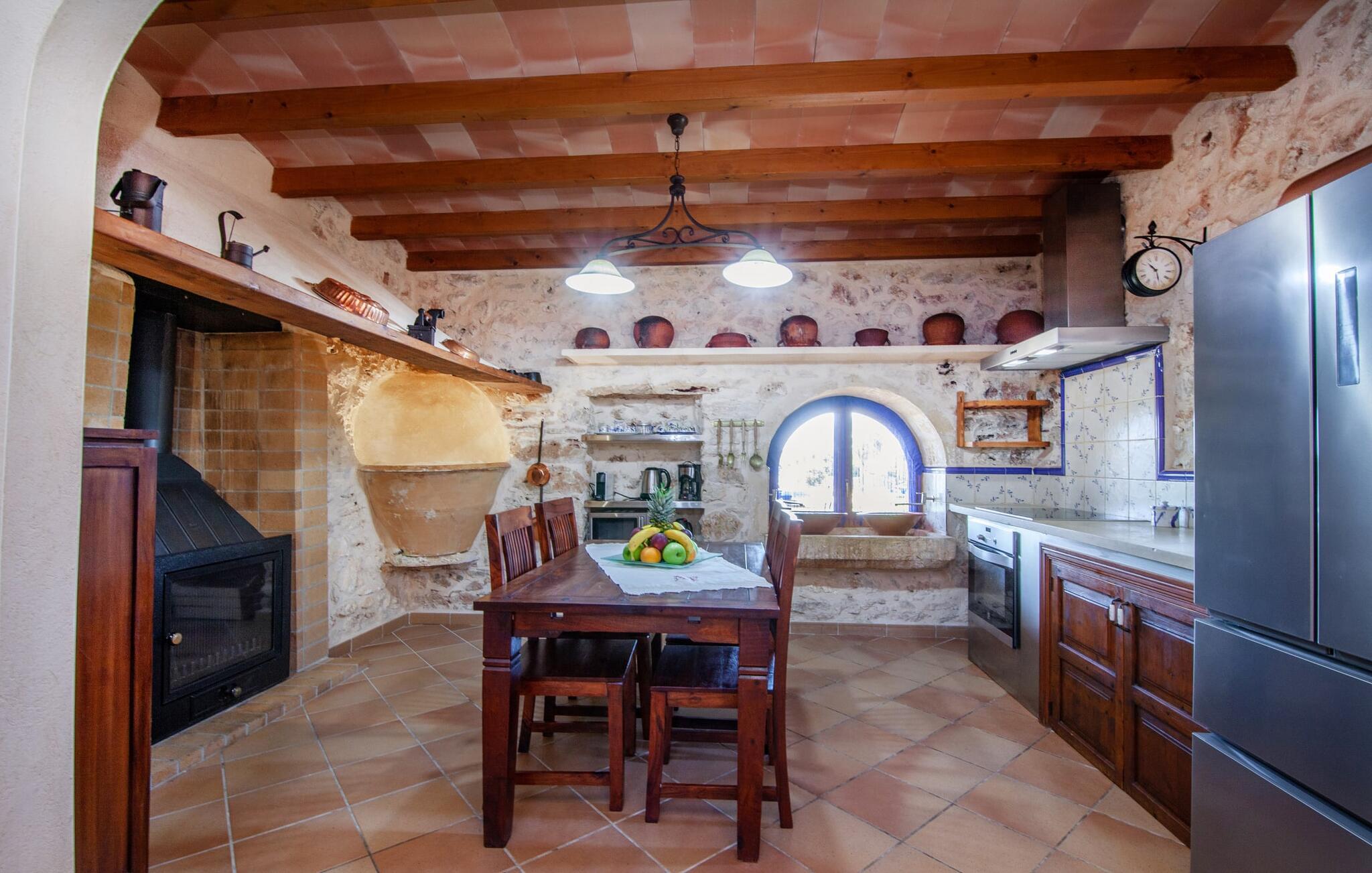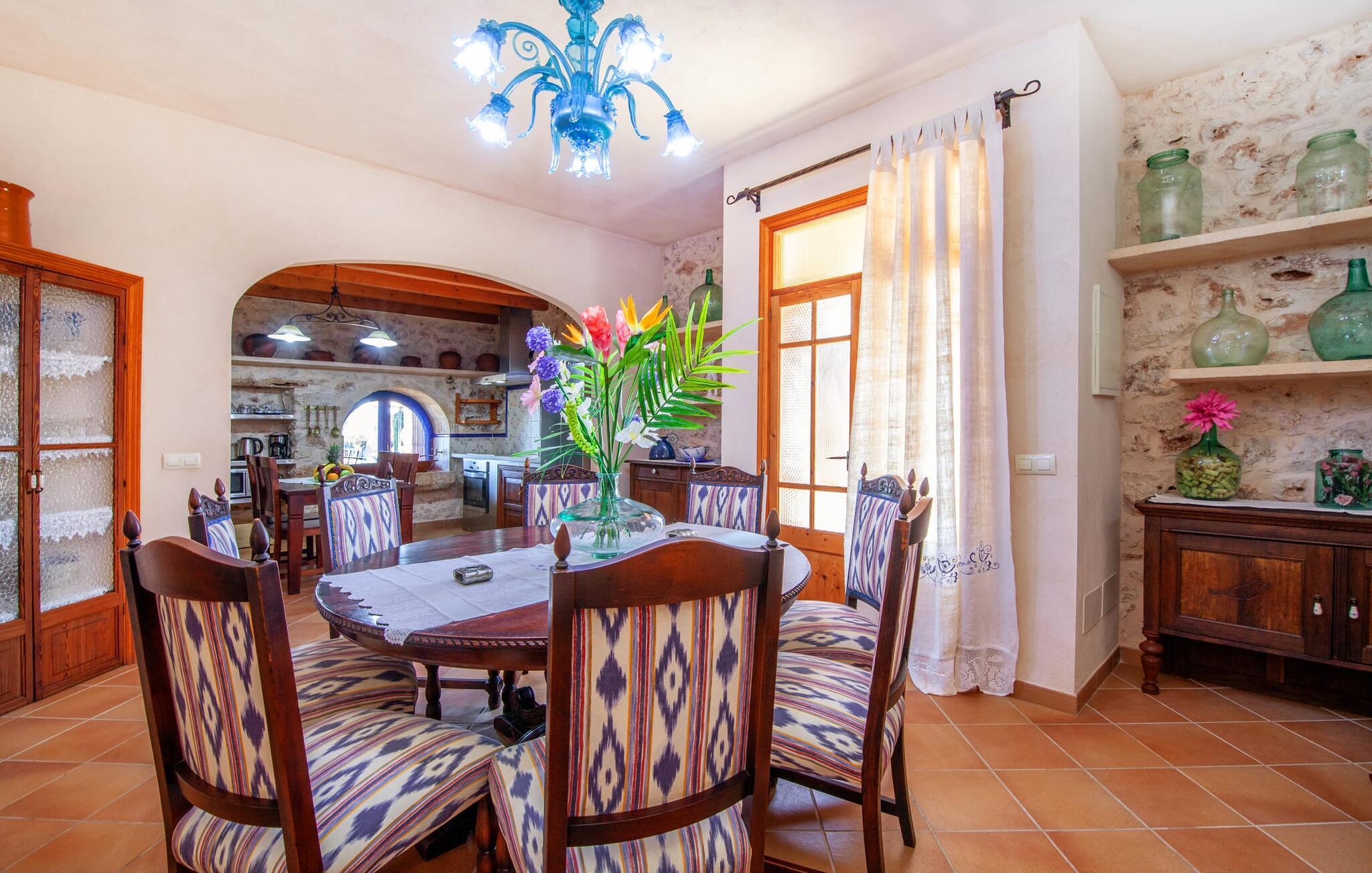 Fincaen "Fonoll", indlejret i et betagende landskab, var engang en landlig ejendom, der har bevaret sin traditionelle middelhavskarakter den dag i dag. Den rummelige private pool og legepladsen lover en uforglemmelig familieferie, mens den velholdte have, dekoreret med en række middelhavsplanter og høje palmer, skaber en attraktiv og æstetisk atmosfære. I kan nyde hyggelige aftener på den overdækkede terrasse, mens den murede grill og det fuldt udstyrede udekøkken gør udelivet til en skøn oplevelse. Det gennemtænkte udformede udendørs opholdsområde er et dejligt sted at slappe af og nyde omgivelserne. Indvendigt sikrer historiske detaljer som naturstensmurværk og dekorative buer en autentisk booplevelse. Træbjælkelofterne afspejler traditionel mallorcansk arkitektur. Fincaen imponerer med sit charmerende interiør, som kunstfærdigt kombinerer antikviteter, klassiske møbler og moderne elementer for at skabe en unik atmosfære. I stueetagen finder I indgangspartiet, en stue, der åbner ud til spisepladsen, samt køkkenet (en pejs giver hyggelig varme på køligere dage) og et badeværelse. På øverste etage er der tre stilfuldt indrettede dobbeltværelser - to med dobbeltsenge og et med to enkeltsenge - samt et ekstra badeværelse. Denne finca er det perfekte tilflugtssted for en uforglemmelig ferie. Den fantastiske finca "Fonoll" er roligt beliggende kun 10 minutter i bil fra den smukke sandstrand i Alcúdia. Den maleriske landsby Santa Margalida er kun omkring 3,5 km væk, hvor I også vil finde to supermarkeder til daglige behov og et ugentligt marked.