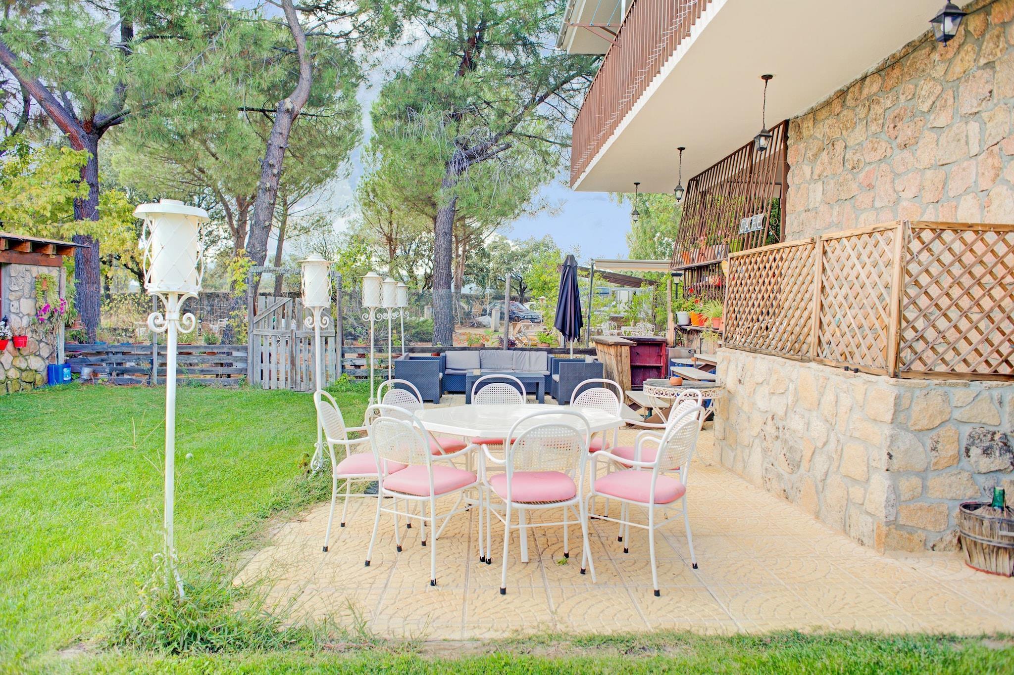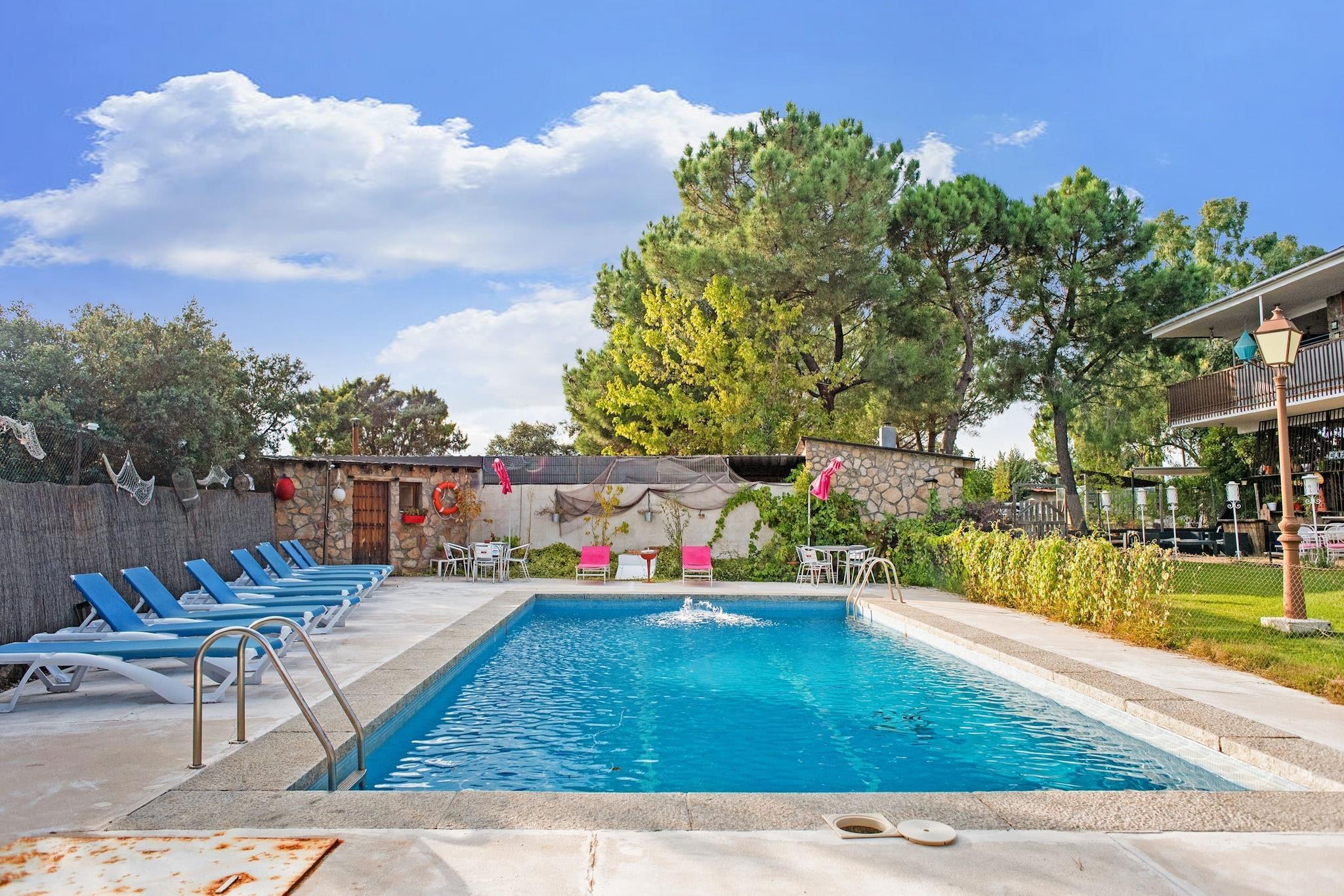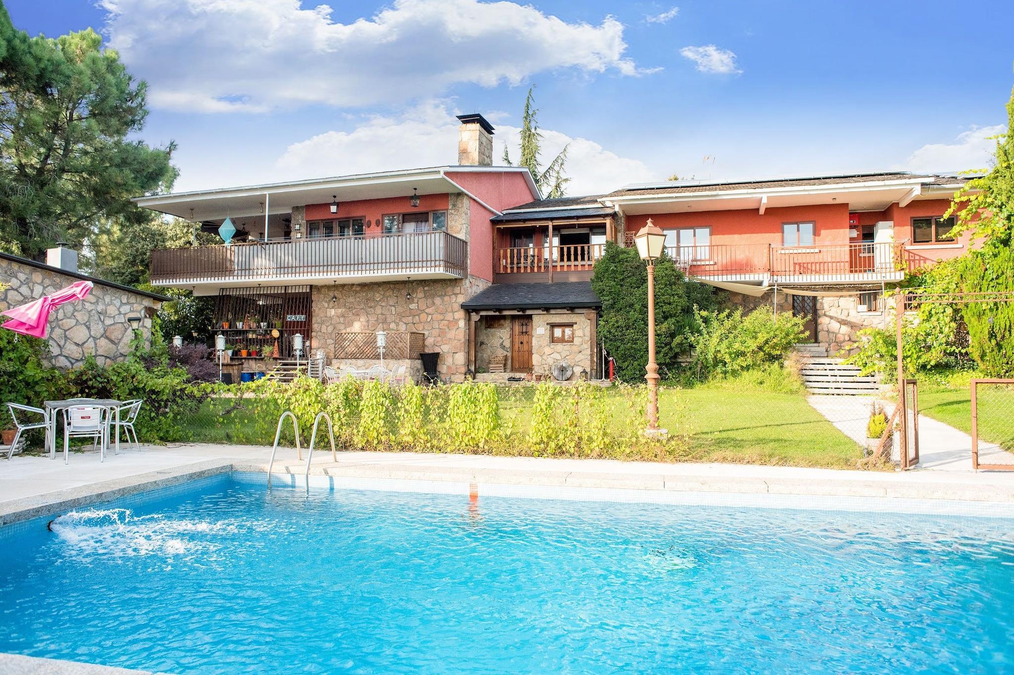 Afslappende Mountain Retreat Denne charmerende landlige lejlighed i Madrids bjerge tilbyder en fredfyldt flugt omgivet af frodige træer. Ideel til par, familier eller venner, det har en fælles swimmingpool og en smukt vedligeholdt have til udendørs fritid. Gæsterne bydes velkommen med en times spa-kredsløb inklusive sauna og jacuzzi, med ekstra tid til rådighed efter anmodning. Det åbne køkken er perfekt til at tilberede dine yndlingsmåltider, og den udendørs BBQ inviterer til fornøjelig udendørs spisning med venner eller familie. Prime Location Access Lejligheden ligger i Galapagar, kun 2 km fra byens centrum, hvilket giver nem adgang til butikker, caféer og restauranter. Collado Villalba ligger 7 km derfra, Guadarrama 15 km derfra, og Madrids centrum ligger godt 34 km derfra, hvilket gør det bekvemt til dagsture. For naturentusiaster er Valmayor-søen i nærheden til gåture og picnic, og Navacerrada-skiområdet ligger kun 28 km væk. Offentlige transportforbindelser, herunder Torrelodones togstation, er tæt på for ubesværet rejse. Kæledyrsvenlige eventyr Kæledyr er velkomne mod et ekstra gebyr, og den store indhegnede have byder på masser af plads til at lege og udforske. Nærliggende stier er ideelle til lange gåture med dine lodne venner. De fælles udendørsarealer, herunder den oplyste have og 12 x 7 m swimmingpool, gør denne ejendom perfekt til dem, der søger afslapning og rekreation. Parkering er tilgængelig på Fincaen, hvilket sikrer bekvemmelighed under dit ophold.