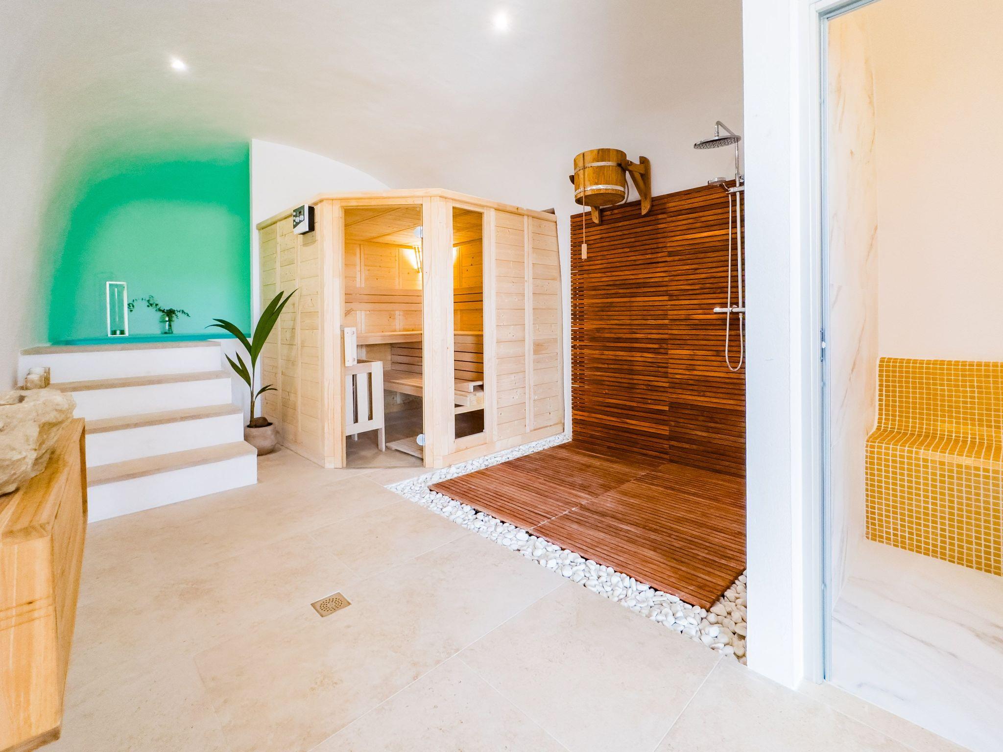 The villa's exterior is equally impressive, designed for the ultimate outdoor living experience. A four-metre wide sliding glass door opens onto a veranda with comfortable seating, a TV, and a dining table, leading further to a terrace with sun loungers, an outdoor swimming pool (heated from April to October), jacuzzi, and an outdoor kitchen with a barbecue. The cave area includes a spa with a heated indoor pool, Finnish sauna, infrared sauna, and Turkish bath, ensuring relaxation and rejuvenation. Multiple terraces offer various lounging options, whether in sun or shade, enhancing the outdoor enjoyment with fantastic views.