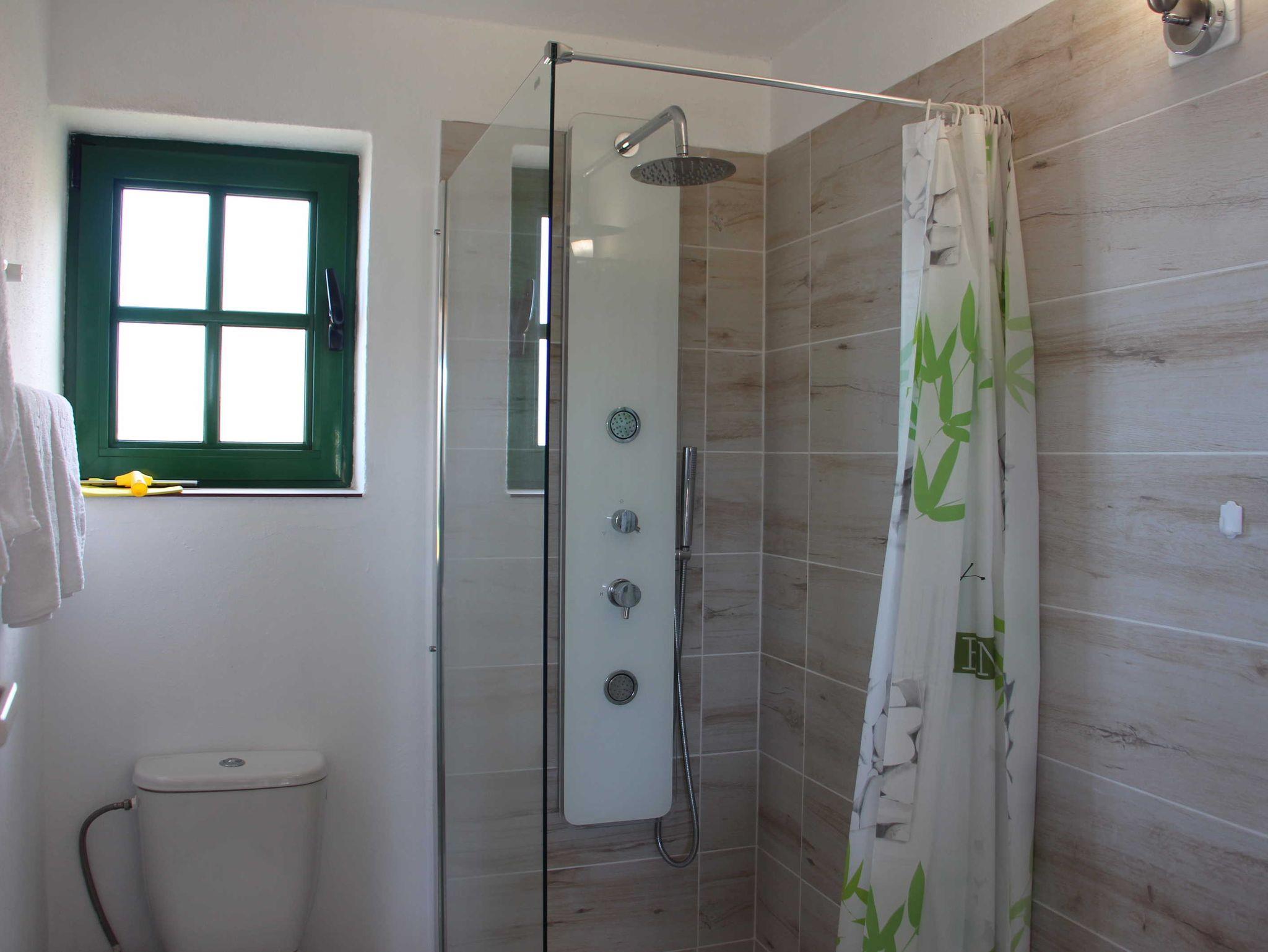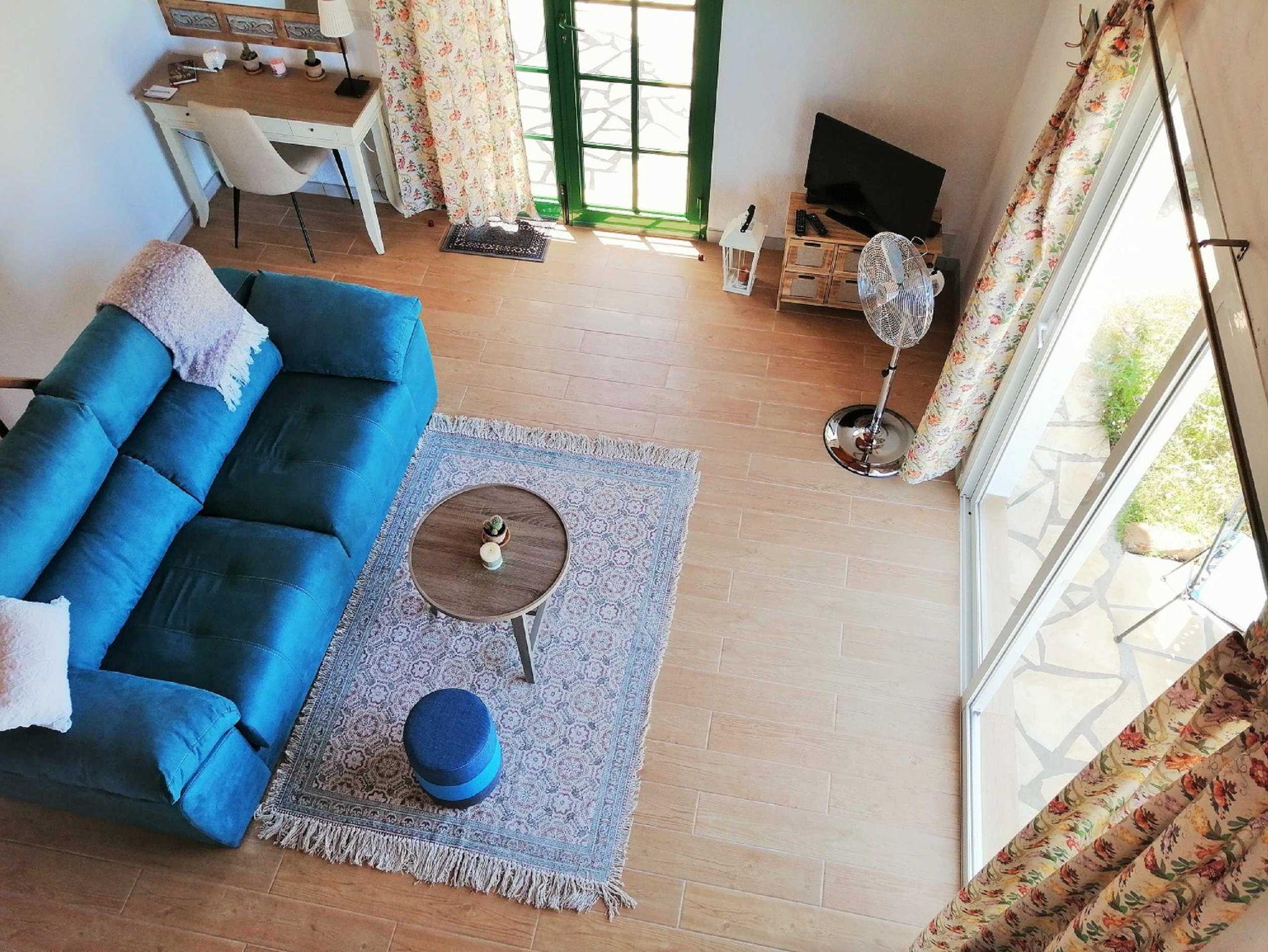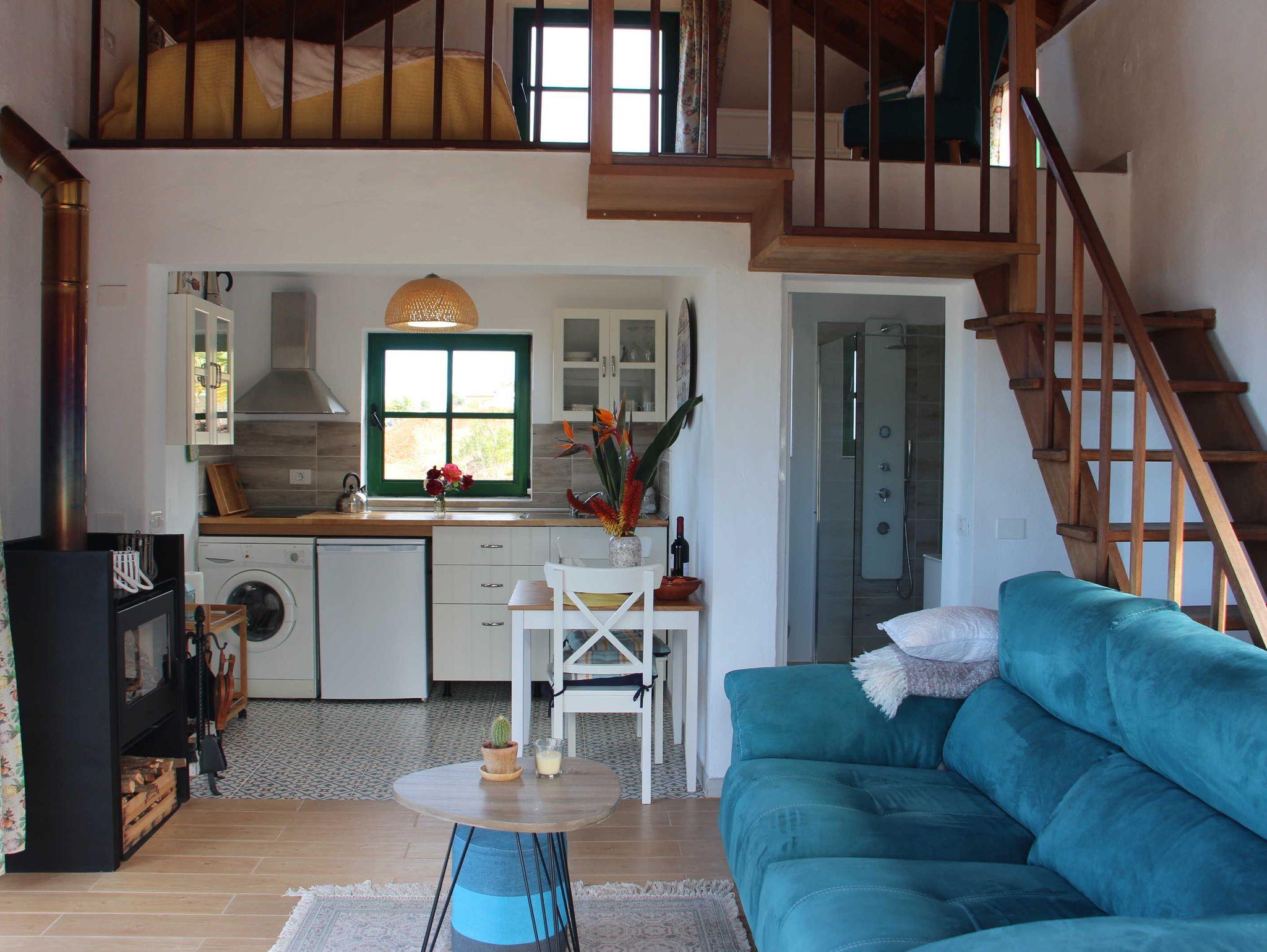 Dieses gemütliche Haus mit Meerblick verfügt über ein Schlafzimmer, welches auf einer Empore über dem geräumigen Wohnzimmer mit voll ausgestatteter Küche liegt. Der Wohnbereich ist durch seine zwei großen Fensterfronten zur Terrasse und zum Garten sehr hell. Ein Kamin sowie ein zusätzlicher Elektroheizer sorgen auch im Winter für eine angenehme Temperatur im Haus. Neben einem hochwertigen Sofa stehen den Gästen selbstverständlich Sat-Im TV und Internet zur Verfügung. Im Anschluß an das Wohnzimmer befindet sich das Badezimmer mit Dusche (Massagedüsen), WC und Heizstrahler. Die Raumelemente sind perfekt aufeinander abgestimmt. Auch ein kleiner Sekretär mit schönem Spiegel findet seinen Platz. Man genießt den Blick ins Grüne und auf das Meer.