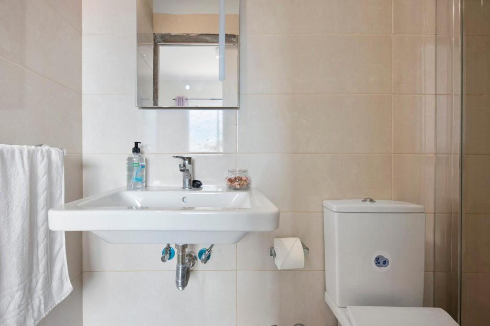 Stueetage: (åbent køkken(komfur, emhætte, ovn, mikrobølgeovn, køleskab), stue / spisestue(enkeltsovesofa, Fjernsyn, spisebord), soveværelse(enkeltseng, enkeltseng), soveværelse(dobbeltseng), badeværelse(badekar med bruser, håndvask, toilet), badeværelse(bruser, håndvask, toilet)) parkering
