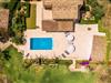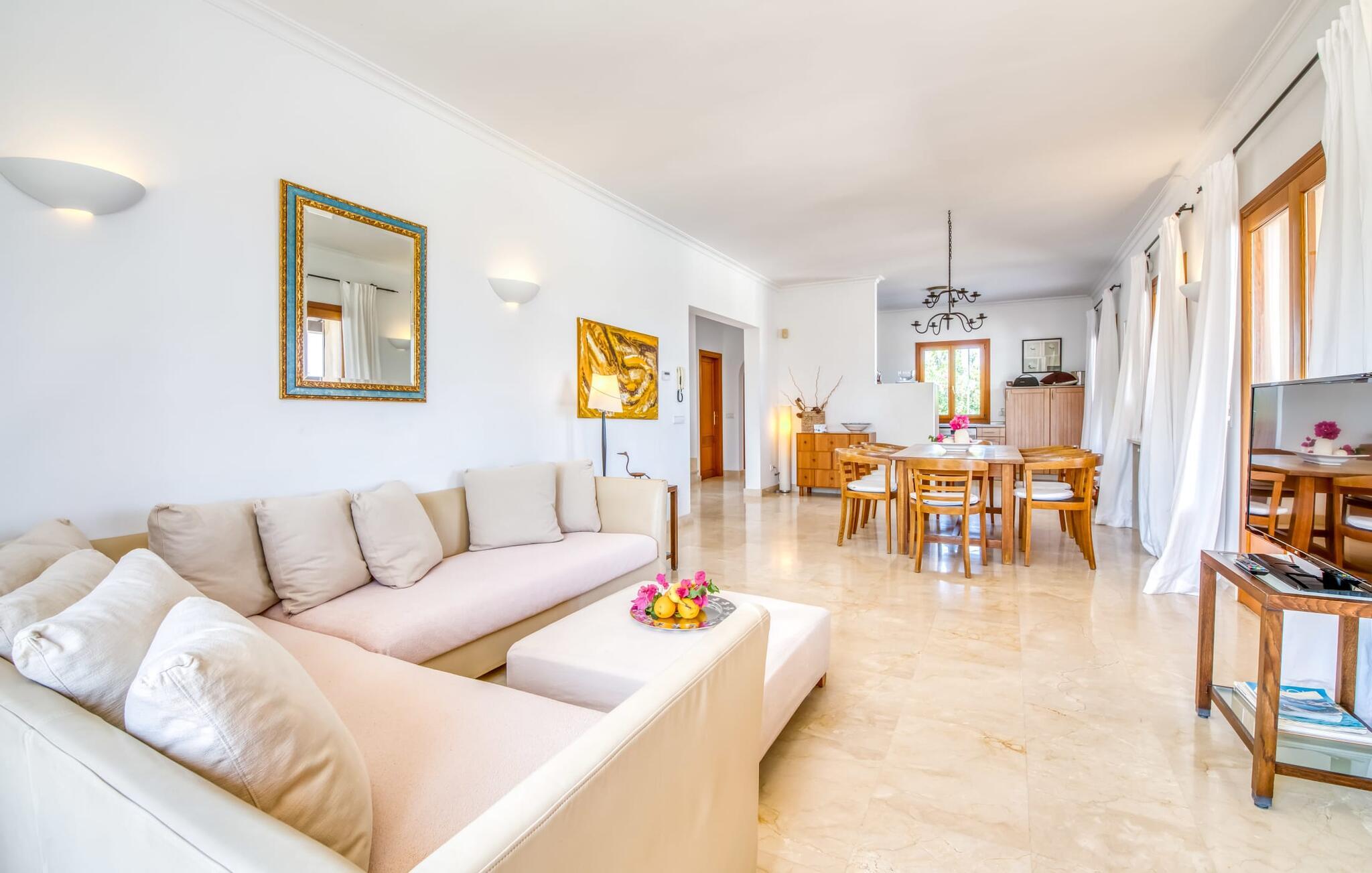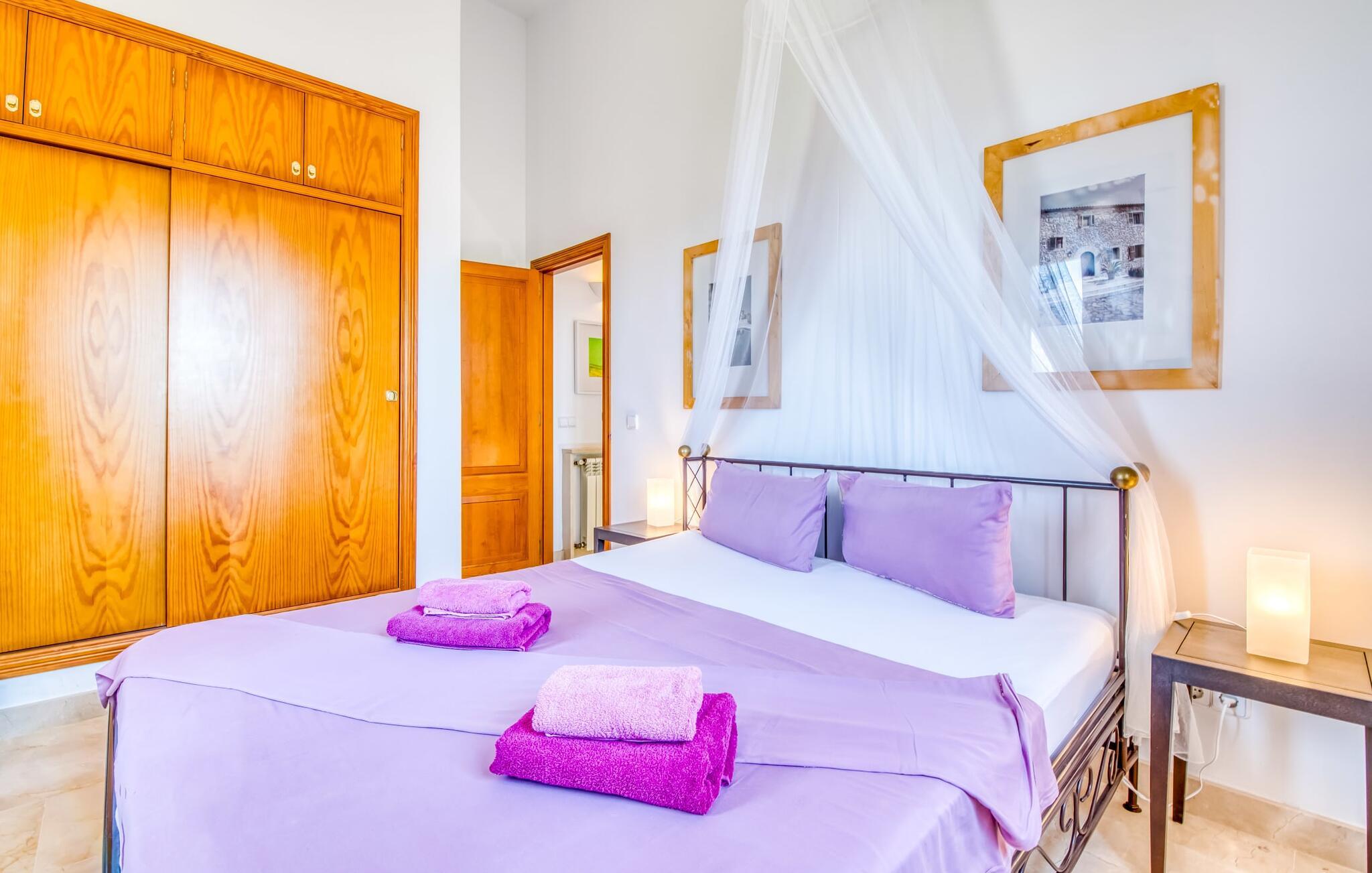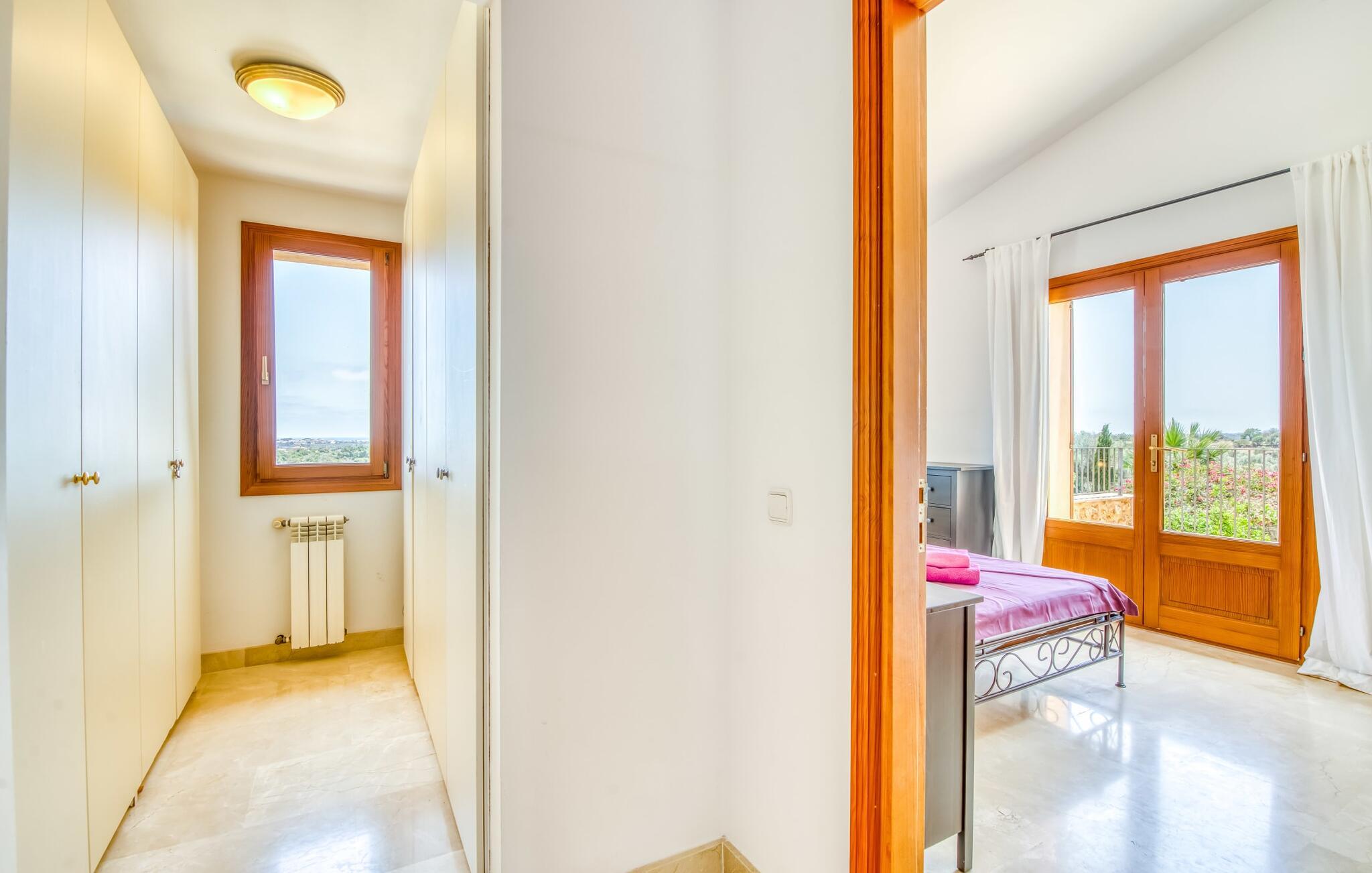 Denne luksusvilla tilbyder moderne faciliteter og enestående afsondrethed og ligger tæt på stranden. Villaens showpiece er den ekspansive poolterrasse, som byder på en betagende 180° havudsigt. Den kølige, hvide Marés-stenterrasse har to 60 år gamle palmer, der giver skygge og stemning, sammen med en oplyst pool, liggestole, parasoller og en stor veranda med et stort udtrækkeligt tag. En flisebelagt udendørs bruser bidrager til komforten. Udearealet omfatter også en hyggelig terrasse med pergola, et gæstehus med en privat terrasse med udsigt over havet og et overdækket grill- og barområde - perfekt til solnedgangsmåltider. Den rustikke spiseplads har plads til 12 personer og er udstyret med åben pejs, gasgrill og mallorcansk ovn. Indvendigt er villaen elegant indrettet med marmor og møbleret med møbler af designeren Günter Lambert. Opholds- og spiseområdet i åbent plan har et stort spisebord, komfortable sofaer, moderne bekvemmeligheder og et fuldt udstyret køkken. Hovedhuset har fire soveværelser med dobbeltsenge og tre badeværelser (to en suite), mens det rustikke gæstehus byder på to yderligere soveværelser (aircondition) og et badeværelse. Centralvarme sikrer komfort hele året rundt. "Gran Mares" er en meget eksklusiv bjergskråning villa nær Son Servera og Portocristo og tæt på stranden og havet. Her kan I fordybe jer i Mallorcas landlige idyl, men I er også kun få minutter væk fra kystbyen Costa de los Pinos eller den livlige kunstnerby Artà. I nærheden af huset finder I både uberørte bugter som Cala Petita eller Cala Varques samt kilometervis af sandstrande. Fire golfbaner ligger blot et par minutters kørsel derfra.