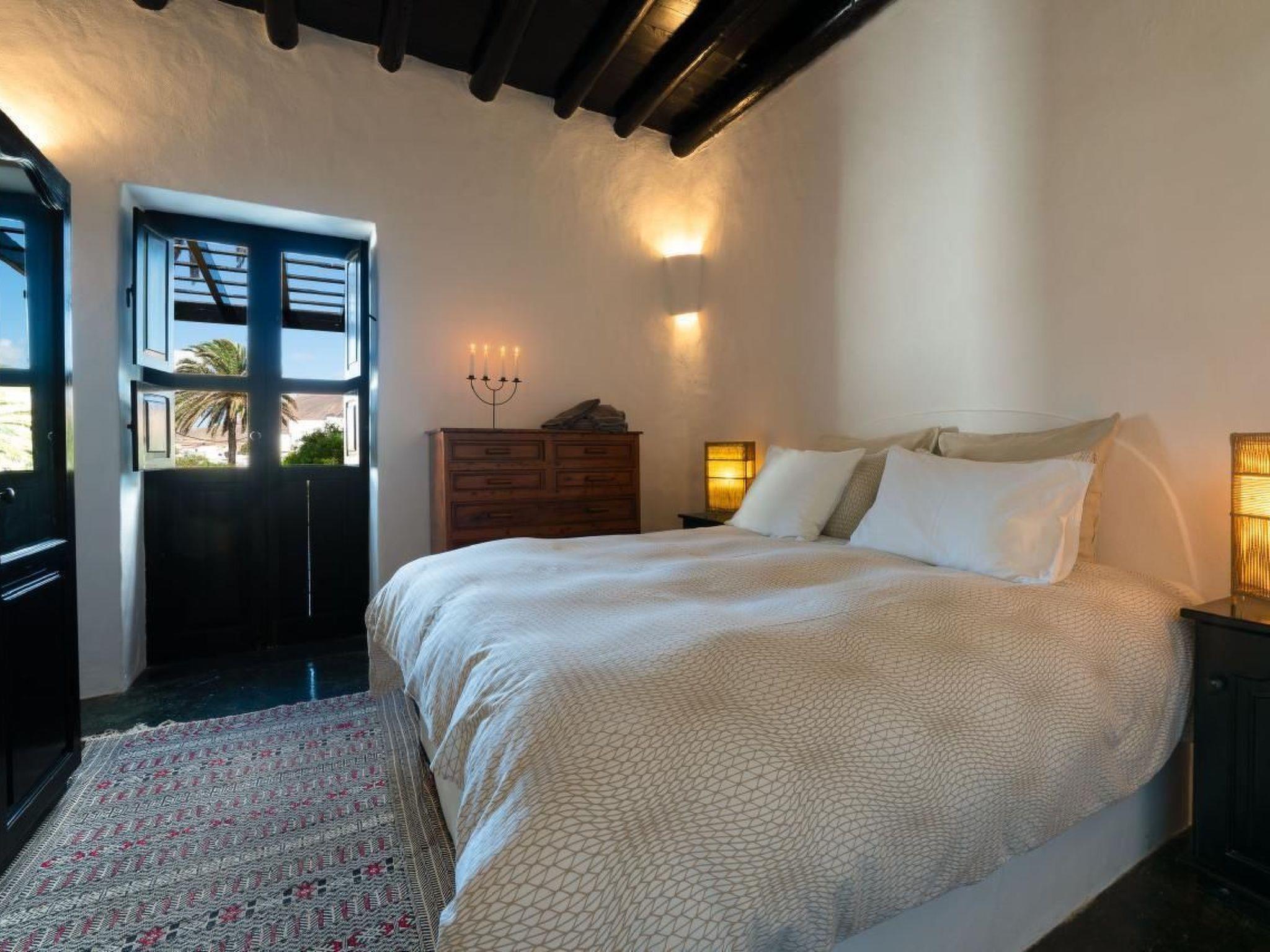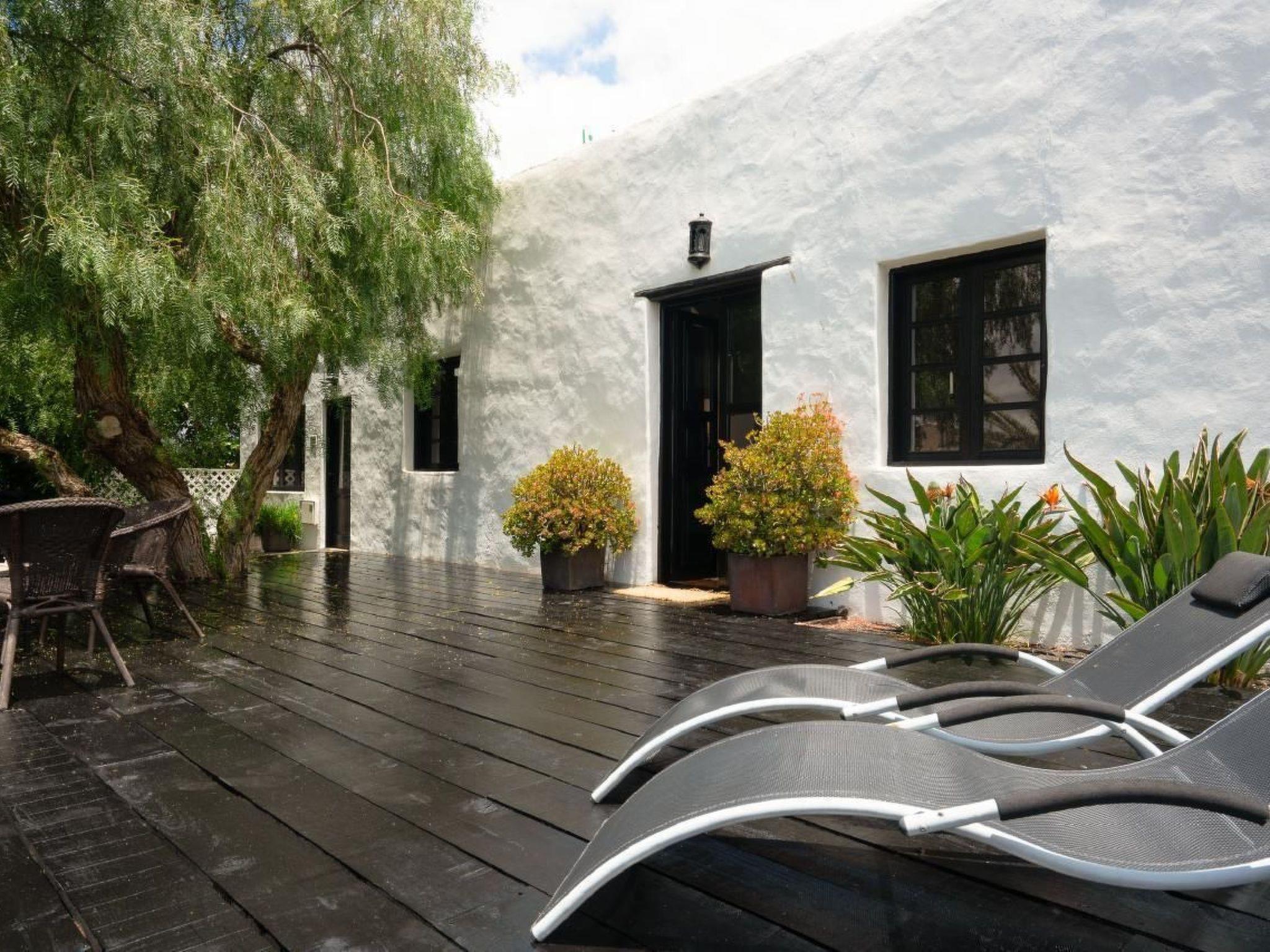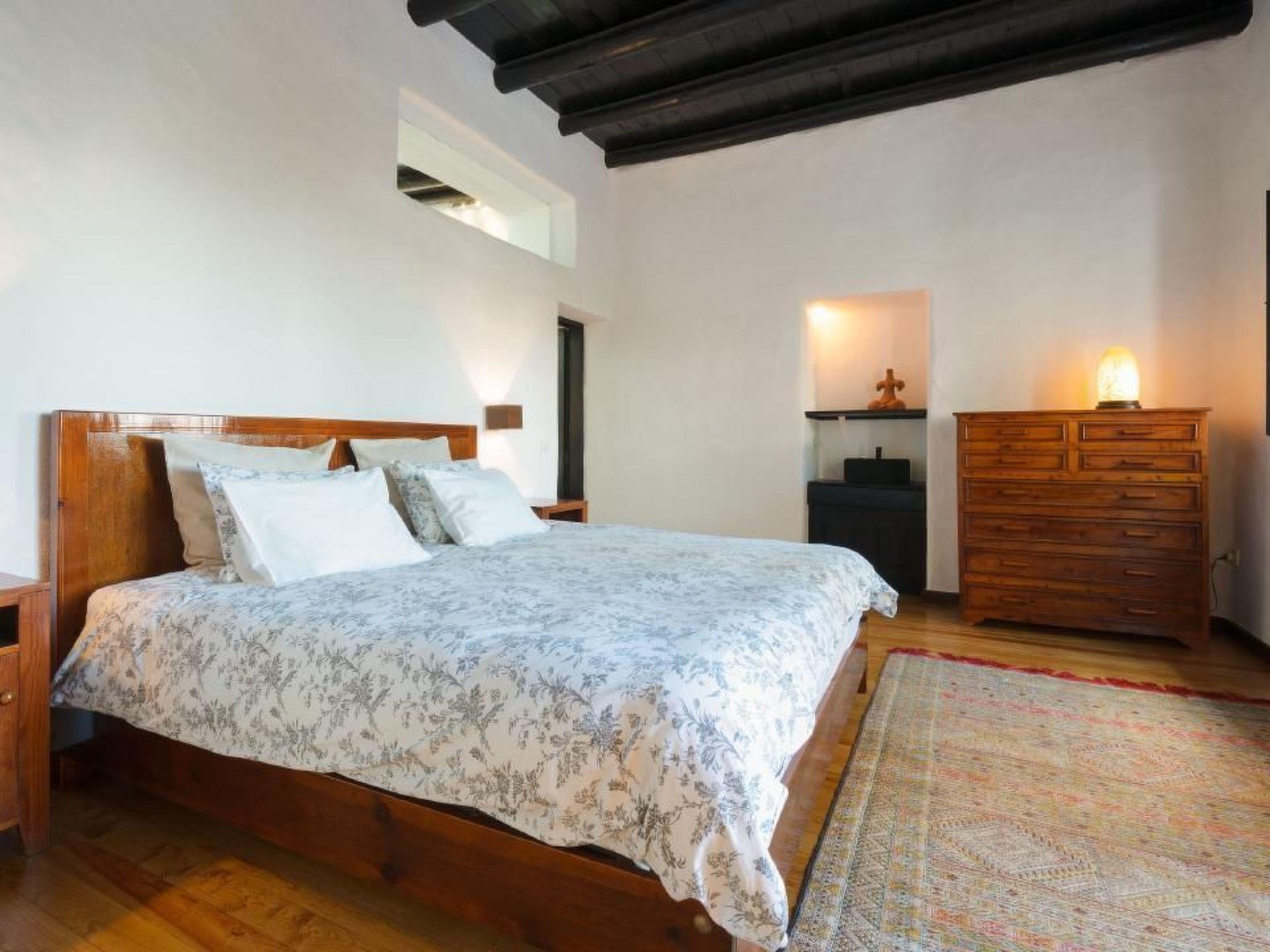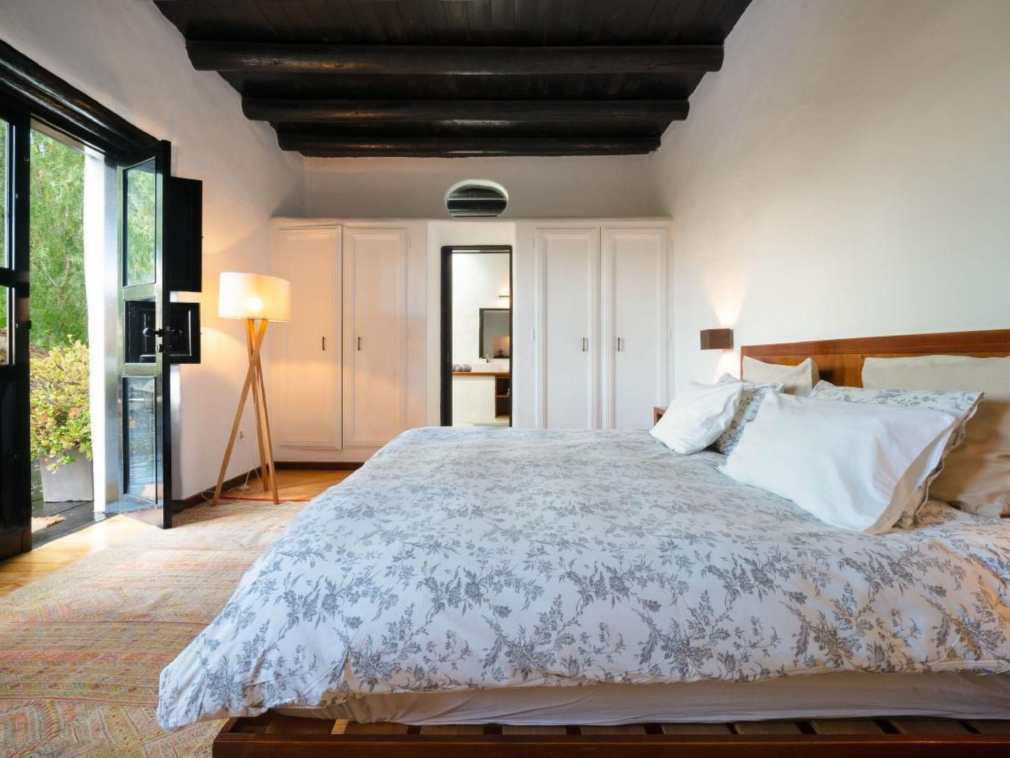 The 200-year-old farmhouse is situated on a 7,500 m2 finca (plot of land). Despite a complete remodelling, the charm and original character of this old house has been preserved. The mature garden surrounding the house is planted with Canary palms and Mediterranean plants and trees, a heated pool is located in the very private part of the second terrace and provides space for total relaxation.Guatiza is a small old village with about 400 inhabitants, which nestles harmoniously in a valley with its white houses. It is located in the lower northern part of the island and forms the backdrop for the 200-year-old, completely renovated farmhouse. The artist Cesar Manrique planned and designed an interesting cactus garden in Guatiza, making the small village famous. The villa is located somewhat off the main village road (a well-stocked supermarket is a 5-minute walk away), embedded in the typical rural everyday life of the village, and the kitchen and dining room are very spacious and laid out in one area. The green-pigmented cement floor, the large stainless steel cooker and the bright country-style kitchen offer the perfect blend of modern quality of life and original country style with a Moroccan influence. Eight people can sit comfortably at the handmade cedar wood table and the spacious living room with an integrated fireplace is very inviting. The wooden beamed ceilings in the living room are around 8 metres high. Sofas and armchairs come from Italy. There are Moroccan carpets in all rooms. The very high ceilings of the individual rooms with their original plastered walls create an open and pleasant ambience and emphasise the harmoniously designed interior. You will find a successful, stylish and comfortable feel-good atmosphere.in the front area is a patio with heated pool. This area is not visible from the outside and therefore creates a very private atmosphere. An old olive tree, planted tubs and a pergola with a wooden table and seating complete the picture. There are also four wooden sun loungers and a gas barbecue. At the rear is a large garden with mature trees, an exotic mix of flowers and wonderful views of the volcanic mountains. You can also admire unique sunsets from the spacious wooden terrace. There are also additional sun loungers and seating here. The exclusive villa with its harmonious integrity of old and modern provides the perfect setting for a peaceful, relaxing and comfortable holiday. The double garage with automatic garage door contains mountain bikes, a surfboard and a boogie board as well as tennis rackets and 2 sets of golf clubs. In addition to a sauna, there is a fully equipped fitness room. In the adjoining laundry room there is a washing machine and ironing equipment. Beach towels are also stored there. The following baby items are also provided at no extra cost: