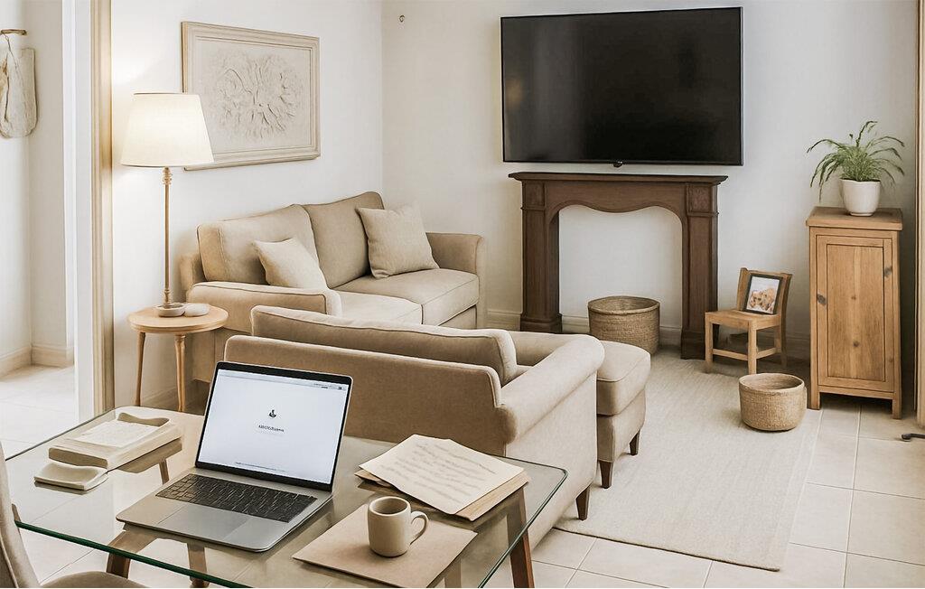 Find jer til rette i den rummelige sofa i opholdsstuen og planlæg jeres næste udflugter over en kop kaffe. Det store tv sørger for afslappende aftener, mens diskrete farver og naturlige materialer skaber en rolig atmosfære. Tilbring tid sammen i stilfulde omgivelser, og tilbered jeres måltider i det veldesignede køkken.