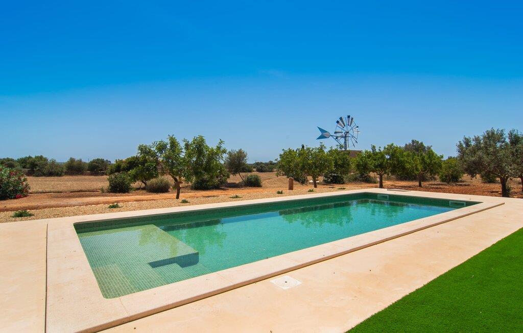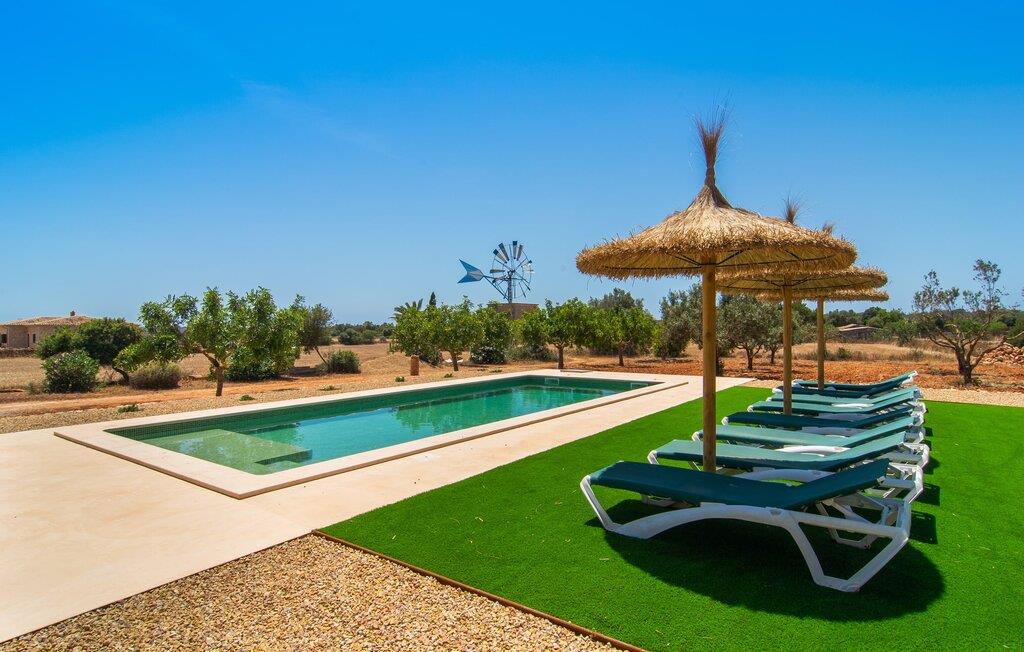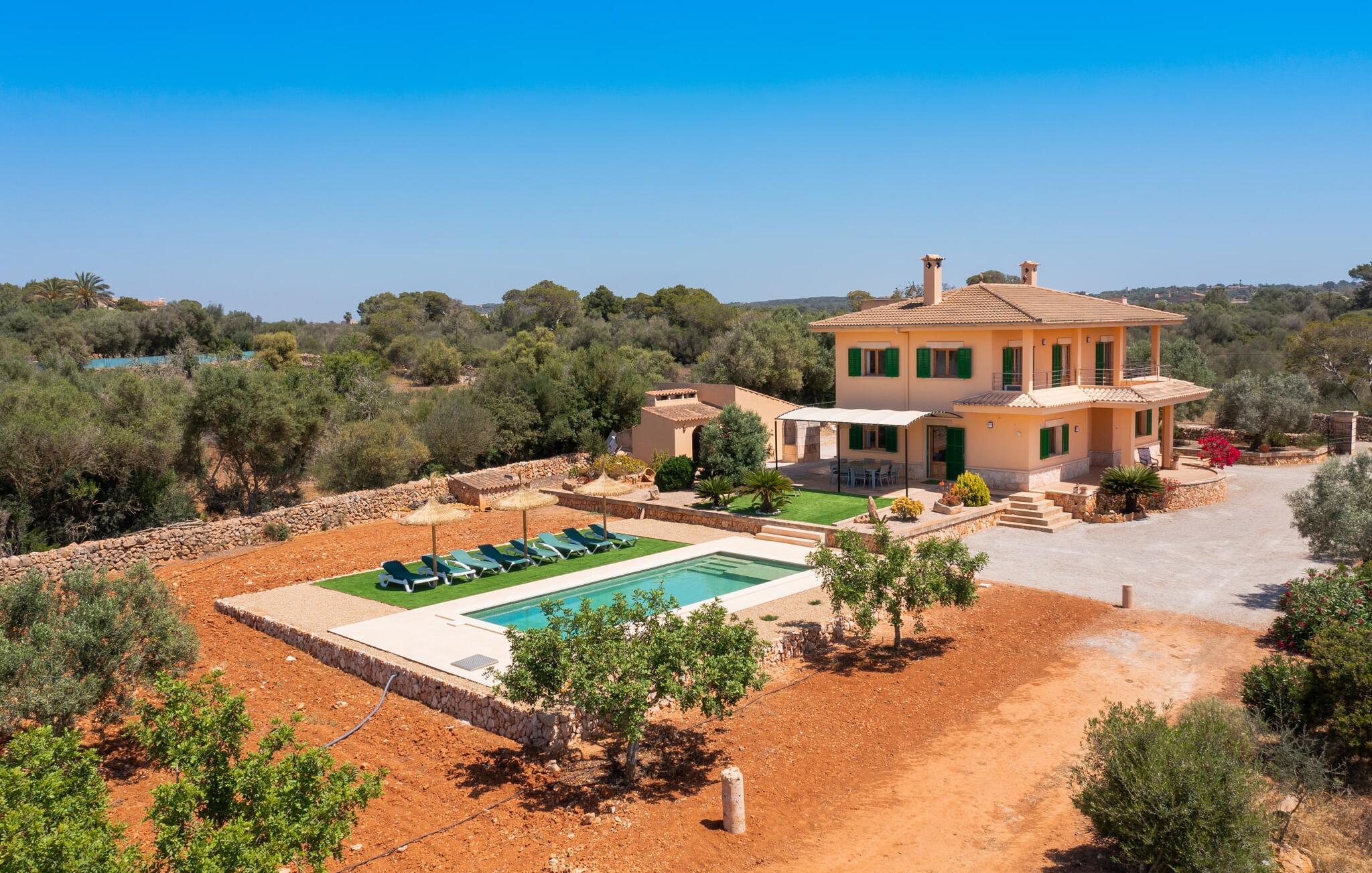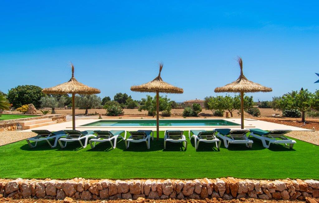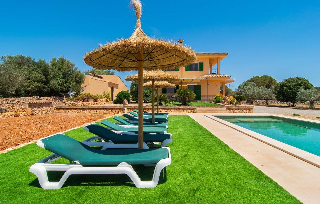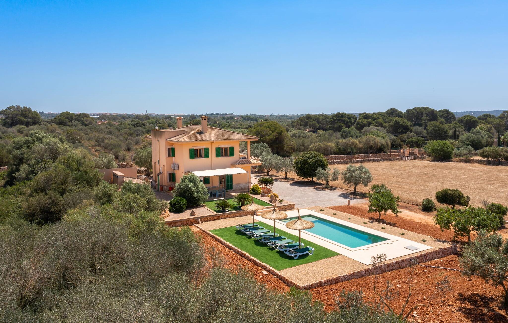 Hvis I værdsætter stort set uberørt og mangfoldig natur, men samtidig ikke vil gå glip af en badeferie, så er den familievenlige bondegård "Hort de Can Rafalet" lige noget for jer. På ejendommen omgivet af middelhavsflora vil I opleve absolut fred. Grønt så langt øjet rækker, med de imponerende saltmarker og megastranden Es Trenc ikke langt væk. Ferieejendommen byder på masser af udendørs plads, herunder en smuk mosaikbeklædt pool med tilhørende solterrasse. Her generer I ingen naboer, og I vil være fuldstændig uovervåget. Nyd aftenen på terrassen i skyggen af Toldo med dens rummelige spiseplads. Uanset om I er tidligt op eller sent op – den runde, delvist overdækkede veranda foran huset med traditionelle gyngestole inviterer jer til fuldt ud at nyde det hyggelige og indbydende feriehus på det sydlige Mallorca og lade blikket vandre. I kan også finde denne afslapning inde i den majestætiske feriegård. Kombinationen af mallorcansk landhusstil med moderne indretningsdetaljer kan betegnes som yderst vellykket. Et rummeligt indgangsparti med middelhavskarakter inviterer jer til at gå på opdagelse i huset. I stueplan finder I den hyggelige tv-stue, det dejligt store køkken-alrum med hyggelig spiseplads og et af de klimatiserede afslapningsrum. Et trendy badeværelse med brusekabine fuldender denne etage. Attraktivt boligtilbehør i landhusstil sætter også dygtige accenter på øverste etage. Det vidner de øvrige tre soveværelser også om, hvoraf to har direkte udgang til solbeskinnede altaner med fortryllende udsigt. To ekstra komfortable badeværelser (med bruser eller badekar) er en del af de forkælende grundfaciliteter i dette smukt beliggende feriehus. Den indvendige indretning af det rummelige feriehus er ideel til flere konstellationer med op til otte rejsende - altså to familier eller flere vennepar. Alle er velkomne på Hort de Can Rafalet! Den indbydende poolgård "Hort de Can Rafalet" imponerer med sin landlige ro mellem oliventræer og en historisk vindmølle, kombineret med den mest moderne komfort. Ejendommen har en førsteklasses beliggenhed i det sydlige Mallorca mellem den lille by Ses Salines og kystbyen Colònia de Sant Jordi. Stedets tiltrækningskraft ligger ikke kun i naturlige vidundere som saltmarkerne, men også i dets nærhed til drømmestranden Es Trenc. Dette er kun 10 minutter væk i bil. Aircondition er tilgængeligt i denne ejendom, men dets brug er begrænset til kl. 21.00 til 09.00. Ellers afregnes gebyret kontant på stedet.