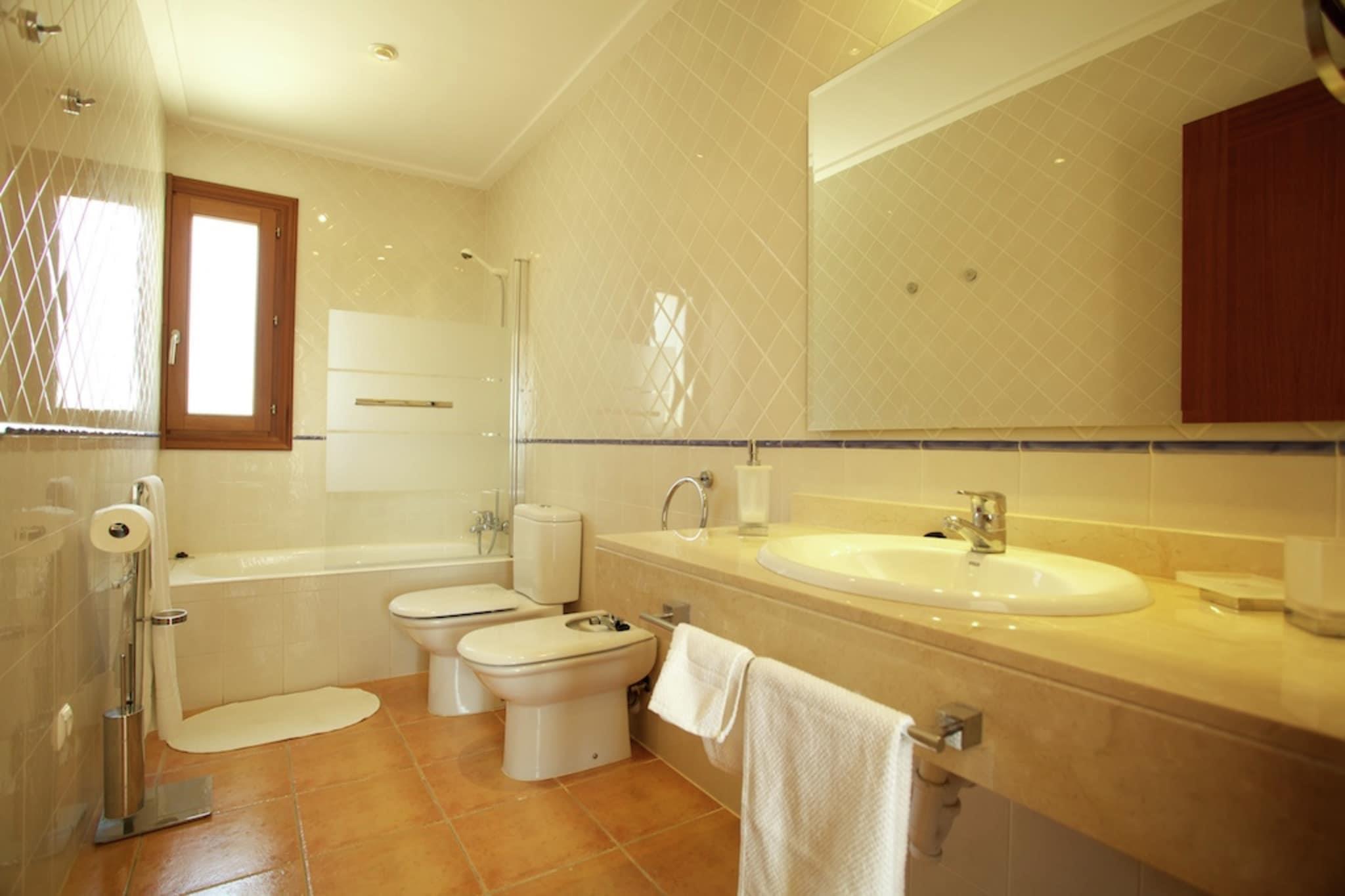 Stueetage: (Køkken(spisebord, kaffemaskine, ovn, mikrobølgeovn, opvaskemaskine , køle-fryseskab, tørretumbler), stue / spisestue(Fjernsyn(parabol), spisebord(8 personer), sofahjørne(8 personer))) På 1. etage: (soveværelse(dobbeltseng), soveværelse(2x enkeltseng), soveværelse(2x enkeltseng), soveværelse(dobbeltseng), soveværelse(enkeltseng), badeværelse(badekar med bruser, håndvask, toilet, bidet), badeværelse(badekar med bruser, håndvask, toilet), badeværelse(badekar med bruser, håndvask, toilet, bidet)) veranda, bruser, balkon, patio, klimaanlæg, have(indhegnet), havemøbler, solstole, grill, parkering, Parasol, swimmingpool(privat), bordtennisbord