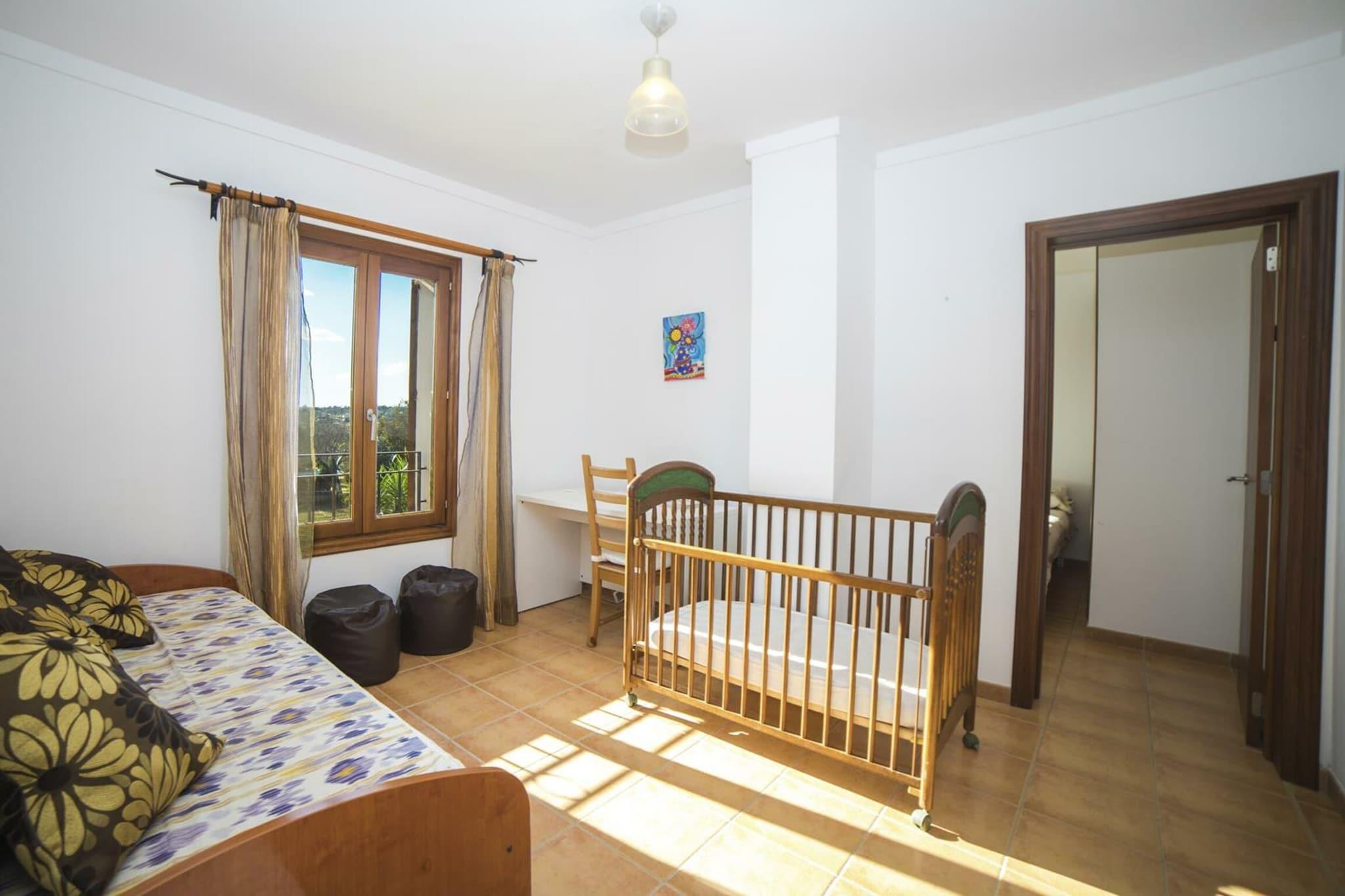 Dette førsteklasses 5-værelses feriehus i Es Pont d"Inca er ideelt for grupper på op til 8 personer. Perfekt beliggende tæt på alle faciliteter, det har en privat swimmingpool, velholdt have og rummelig terrasse. De 8 x 4,5 -meter pool, med en dybde på 1 til 1,85 meter, er omgivet af en solterrasse med 6 liggestole Børn vil nyde legehaven, mens voksne kan slappe af på verandaen og lave mad en grill eller at dele en flaske vin under stjernerne. Villaen tilbyder indkvartering på én etage med en hyggelig stue med aircondition, stenbelagte vægge og hvide bjælker. Et tv med satellitkanaler på tysk, en cd-afspiller og komfortable sofaer giver et afslappende rum. Køkkenet er fuldt udstyret med gaskomfur, mikroovn, kedel og spisebord. Der er også vaskemaskine, strygejern og strygebræt. Der er tre soveværelser: to med to enkeltsenge og garderobeskabe, og det store soveværelse med dobbeltseng, garderobe og en-suite badeværelse med bruser (også tilgængeligt udefra). To ekstra uafhængige bruserum er tilgængelige. En barneseng og høj stol kan stilles til rådighed efter anmodning til familier med babyer. Beliggende i udkanten af Muro, en fredelig landsby i det nordlige Mallorca, er huset kun en kort køretur fra supermarkeder, barer, restauranter og den smukke strand Ses Casetes des Capellans i Can Picafort, kendt for sit fine sand og strandbarer, der serverer Middelhavsmad og cocktails.