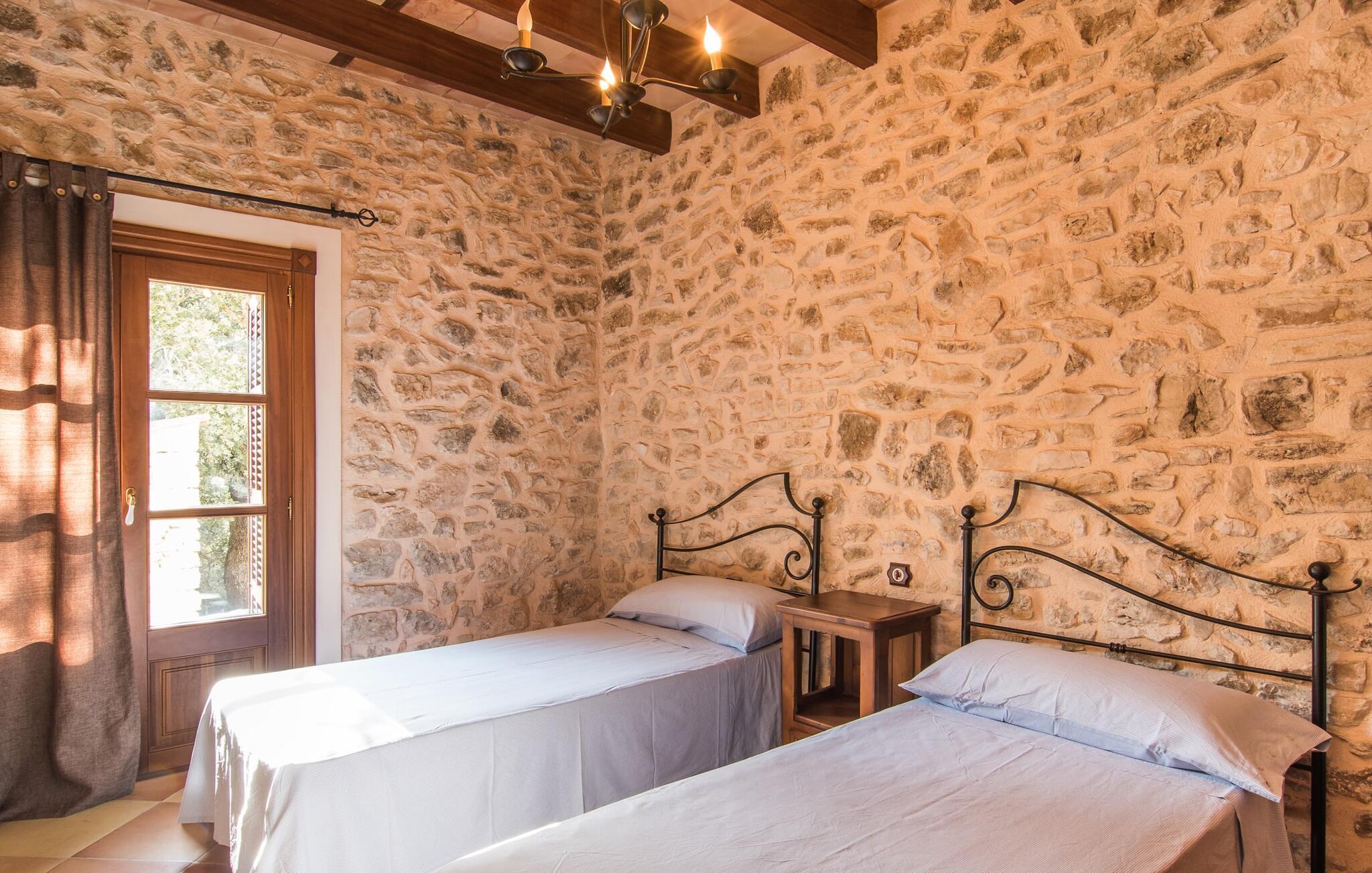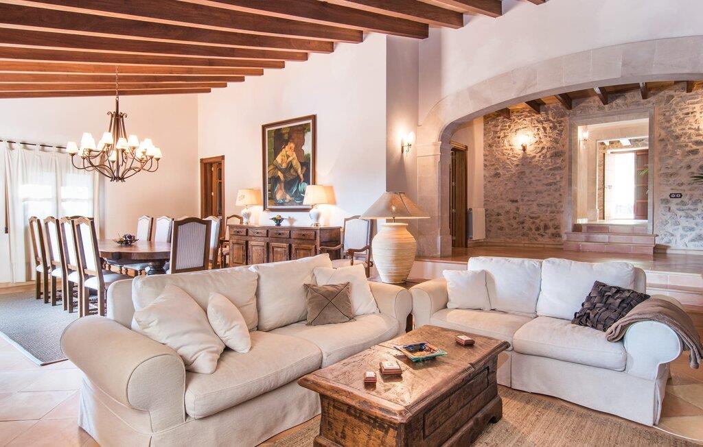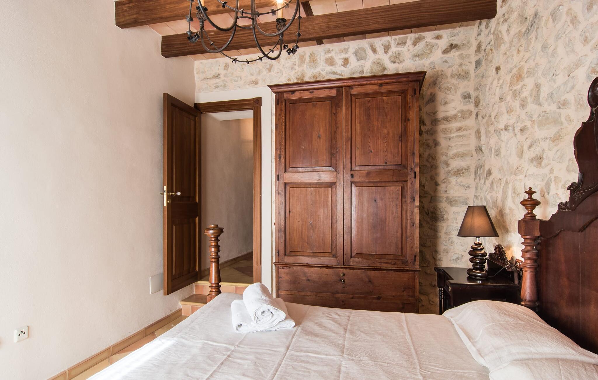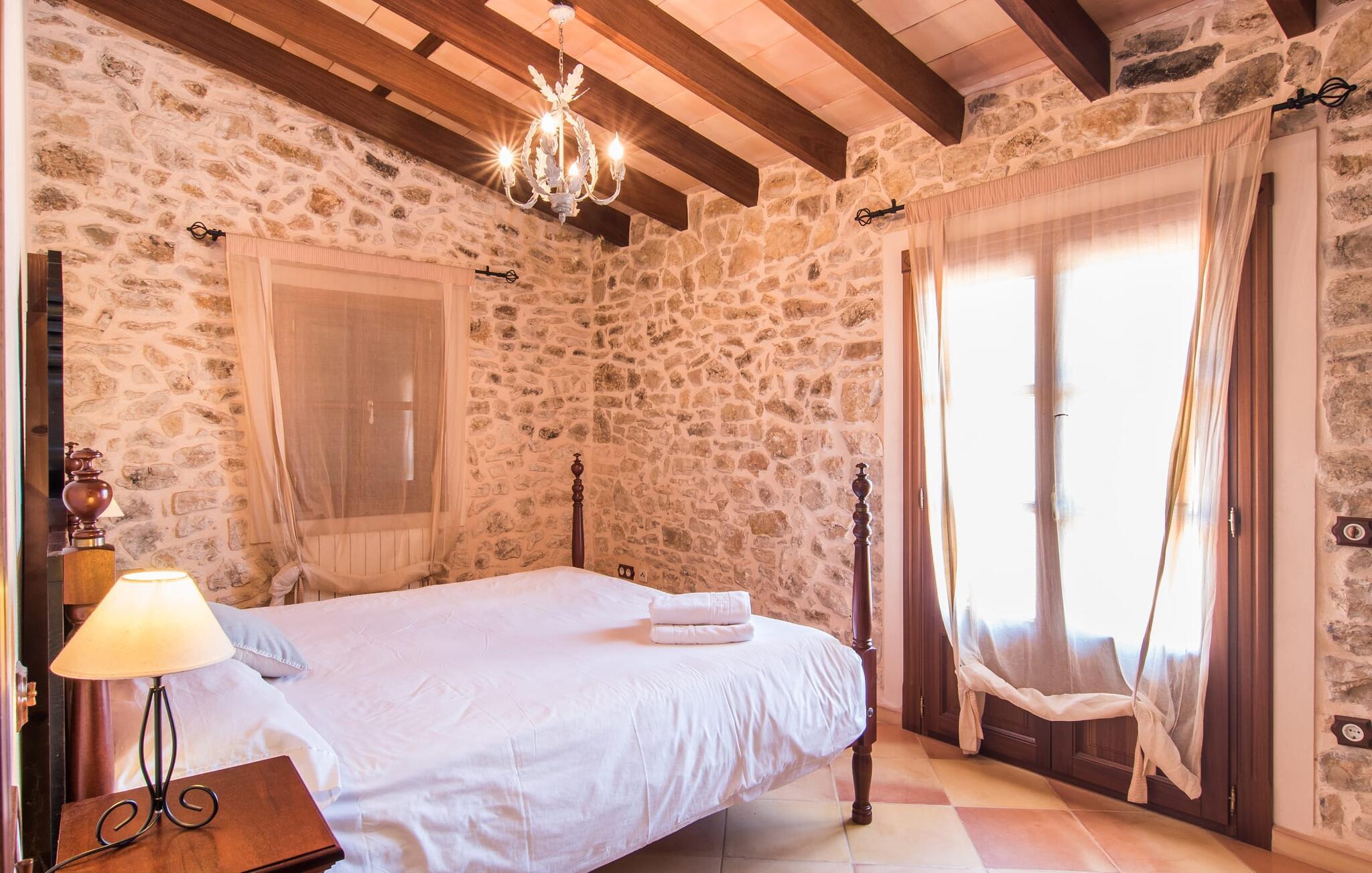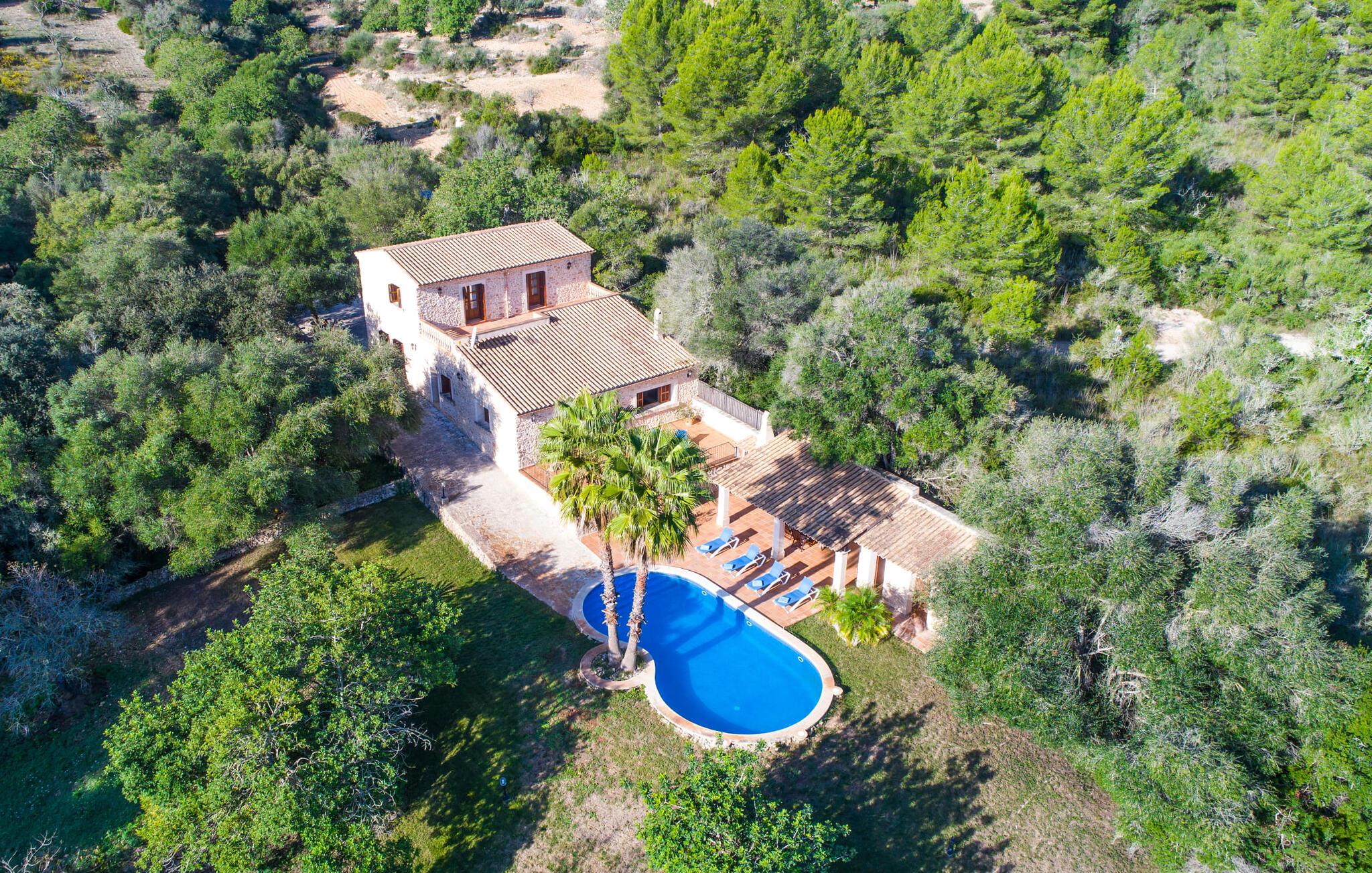 Hvem har ikke drømt om at fordybe sig i vildmarken midt i hverdagens stress og jag? Villa "Isabella" er en charmerende mulighed for at opfylde denne drøm ved at kombinere idyllisk natur og komforten ved god infrastruktur. Hvis I lader blikket vandre fra haven i det fjerne, vil I se villaens uberørte stenmure bag jer. Bagved ligger trætoppene i den tætte skov på en bakke. Poolens damformede, buede omrids er foret med store palmer, der tilføjer et strejf af tropisk flair til denne naturligt maleriske scene. Lige ved siden af poolen finder I komfortable liggestole, hvor I kan genoplade jeres D-vitamintank og nyde den vidunderligt friske, milde ø-brise. Ved det rustikke træbord kan I nyde kulinariske fejringer sammen udendørs, som ikke behøver at ende så hurtigt takket være den afsondrede beliggenhed. I kan også sove næste morgen – eller nyde fyrre blink i det fri. Da det udendørs badeværelse giver varmt vand, kan I få mest muligt ud af haven og bruge meget tid udenfor. Det betyder ikke, at I skal undgå det indre af villaen – tværtimod. Sofaerne, hvorfra I kan nyde lyden af den åbne pejs, er et vidunderligt hyggeligt sted for en snak eller læsning af en god bog i en hjemlig atmosfære. Herfra kan I også følge med i, hvad der sker derhjemme takket være fladskærmen og satellitforbindelsen. Spiseområdet i denne stue er dedikeret til jeres gastronomiske ønsker. Der er plads til ti personer omkring træbordet under lysekronen, hvilket gør villaen ideel til at underholde besøgende. Middagen kan tilberedes på ingen tid i det rummelige køkken med keramisk kogeplade. Hvert værelse fremstår lyst og venligt, og I vil hurtigt føle jer hjemme i soveværelserne: to af dem er i stueetagen, den ene med to enkeltsenge, den anden med eget badeværelse. Yderligere fire gæster kan bo på første sal, som rummer to soveværelser med dobbeltsenge og to badeværelser. Takket være badekarret i to af badeværelserne kan I nemt afslutte dagen romantisk. Villa "Isabella" ligger midt i et naturreservat; En vandrerute fører direkte ind i det vilde, romantiske bjerglandskab. Den lille mallorcanske juvel Petra ligger 4,5 km væk, hvor I kan opleve den stille side af øen helt tæt på på resortets ugentlige marked. Manacor, 13,5 km væk, er ideel til en længere gåtur gennem byen. Den historiske bykerne med sine mange snoede gader venter bare på at blive udforsket. Til dage ved havet anbefaler vi den helt uberørte naturlige strand Son Serra de Marina i nordøst, cirka en halv time væk. I sydøst er der en række smukke bugter at opdage, de såkaldte Calas de Mallorca. Villaen er en fremragende base camp for sporty gæster, der ønsker at udforske øen på cykel eller til fods. Der er også fem varierede golfbaner i området. Villaen "Isabella" med sin eksklusive indretning ligger 4,5 km sydvest for Petra, en malerisk lille by, i charmerende omgivelser. Petra lader intet tilbage at ønske med sin blanding af supermarkeder, barer og udsøgte restauranter. Den naturlige sandstrand i Son Serra de Marina er en halv time væk med jeres lejebil - den smukke østkyst kan nås lige så hurtigt.