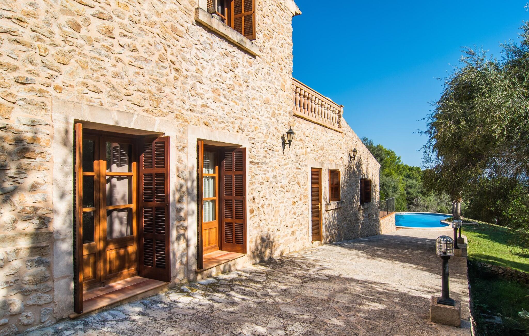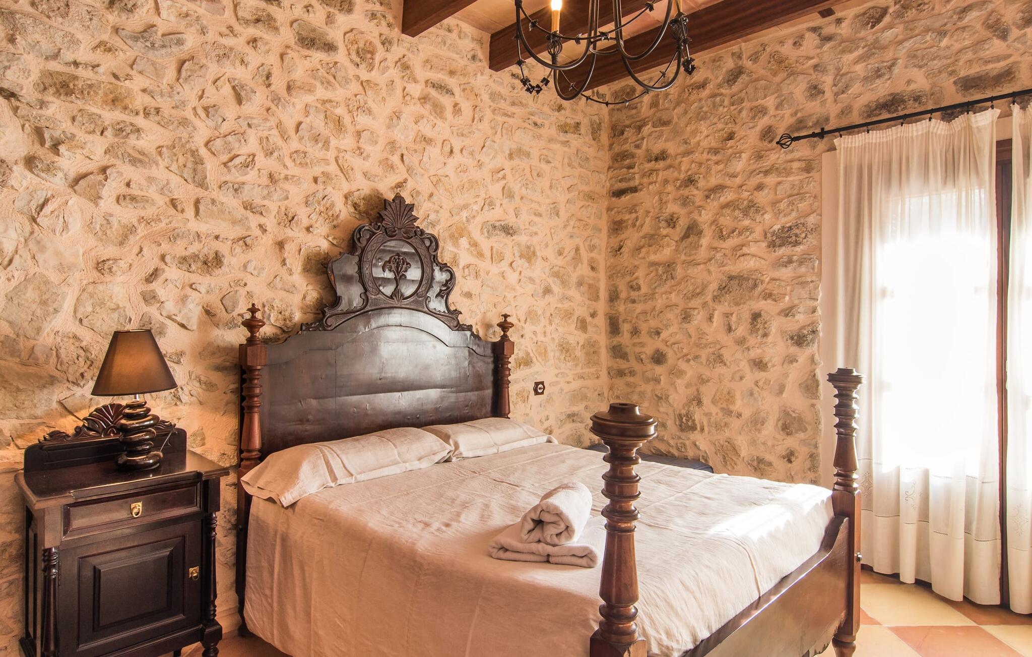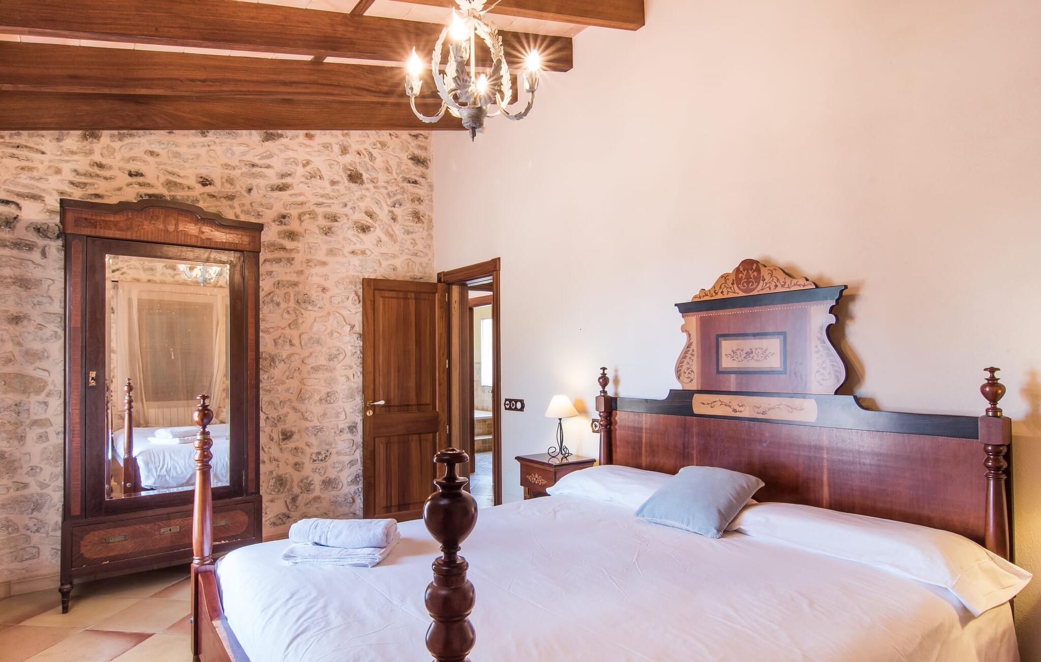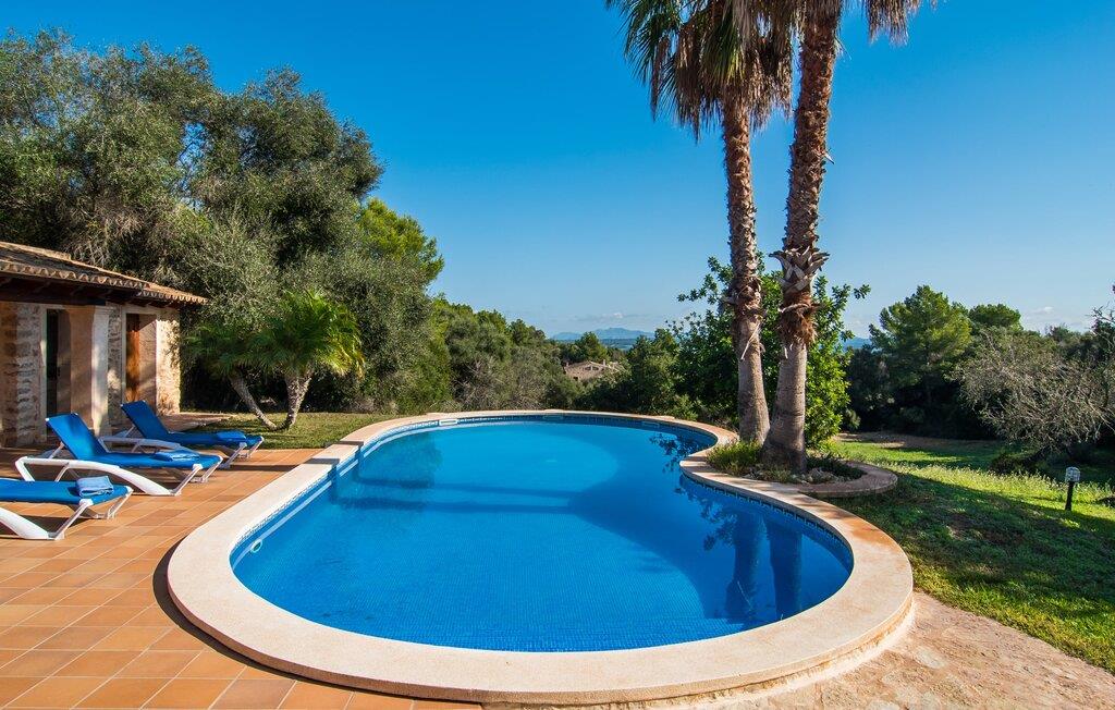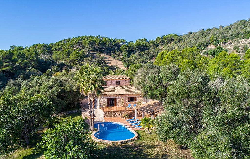 Hvem har ikke drømt om at fordybe sig i vildmarken midt i hverdagens stress og jag? Villa "Isabella" er en charmerende mulighed for at opfylde denne drøm ved at kombinere idyllisk natur og komforten ved god infrastruktur. Hvis I lader blikket vandre fra haven i det fjerne, vil I se villaens uberørte stenmure bag jer. Bagved ligger trætoppene i den tætte skov på en bakke. Poolens damformede, buede omrids er foret med store palmer, der tilføjer et strejf af tropisk flair til denne naturligt maleriske scene. Lige ved siden af poolen finder I komfortable liggestole, hvor I kan genoplade jeres D-vitamintank og nyde den vidunderligt friske, milde ø-brise. Ved det rustikke træbord kan I nyde kulinariske fejringer sammen udendørs, som ikke behøver at ende så hurtigt takket være den afsondrede beliggenhed. I kan også sove næste morgen – eller nyde fyrre blink i det fri. Da det udendørs badeværelse giver varmt vand, kan I få mest muligt ud af haven og bruge meget tid udenfor. Det betyder ikke, at I skal undgå det indre af villaen – tværtimod. Sofaerne, hvorfra I kan nyde lyden af den åbne pejs, er et vidunderligt hyggeligt sted for en snak eller læsning af en god bog i en hjemlig atmosfære. Herfra kan I også følge med i, hvad der sker derhjemme takket være fladskærmen og satellitforbindelsen. Spiseområdet i denne stue er dedikeret til jeres gastronomiske ønsker. Der er plads til ti personer omkring træbordet under lysekronen, hvilket gør villaen ideel til at underholde besøgende. Middagen kan tilberedes på ingen tid i det rummelige køkken med keramisk kogeplade. Hvert værelse fremstår lyst og venligt, og I vil hurtigt føle jer hjemme i soveværelserne: to af dem er i stueetagen, den ene med to enkeltsenge, den anden med eget badeværelse. Yderligere fire gæster kan bo på første sal, som rummer to soveværelser med dobbeltsenge og to badeværelser. Takket være badekarret i to af badeværelserne kan I nemt afslutte dagen romantisk. Villa "Isabella" ligger midt i et naturreservat; En vandrerute fører direkte ind i det vilde, romantiske bjerglandskab. Den lille mallorcanske juvel Petra ligger 4,5 km væk, hvor I kan opleve den stille side af øen helt tæt på på resortets ugentlige marked. Manacor, 13,5 km væk, er ideel til en længere gåtur gennem byen. Den historiske bykerne med sine mange snoede gader venter bare på at blive udforsket. Til dage ved havet anbefaler vi den helt uberørte naturlige strand Son Serra de Marina i nordøst, cirka en halv time væk. I sydøst er der en række smukke bugter at opdage, de såkaldte Calas de Mallorca. Villaen er en fremragende base camp for sporty gæster, der ønsker at udforske øen på cykel eller til fods. Der er også fem varierede golfbaner i området. Villaen "Isabella" med sin eksklusive indretning ligger 4,5 km sydvest for Petra, en malerisk lille by, i charmerende omgivelser. Petra lader intet tilbage at ønske med sin blanding af supermarkeder, barer og udsøgte restauranter. Den naturlige sandstrand i Son Serra de Marina er en halv time væk med jeres lejebil - den smukke østkyst kan nås lige så hurtigt.