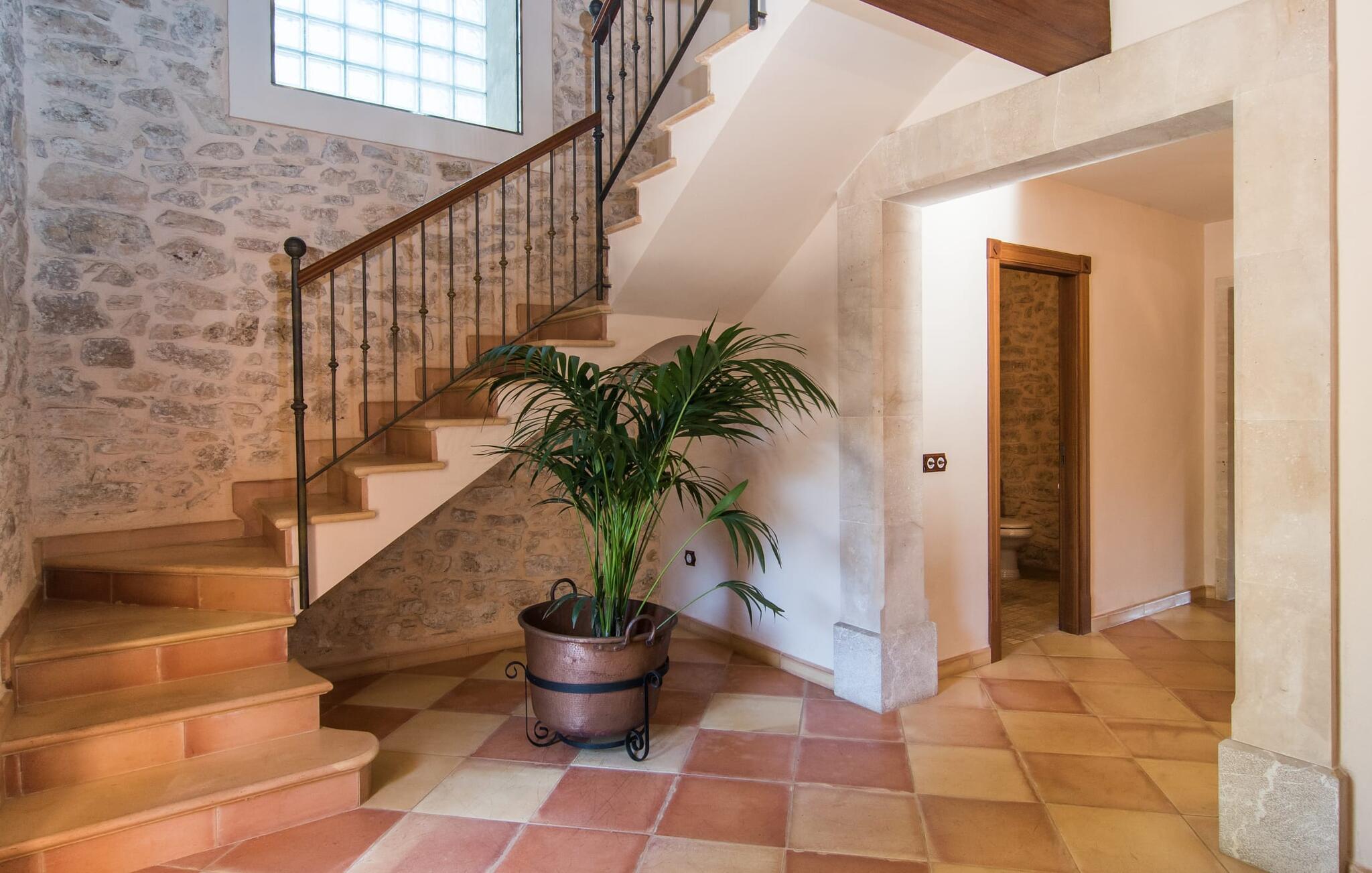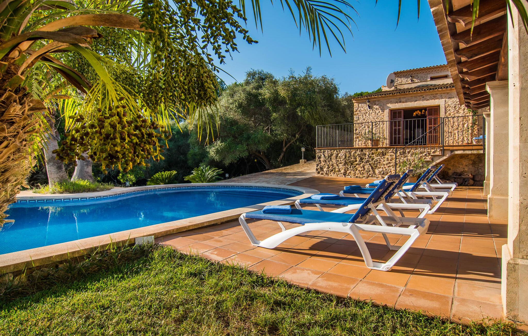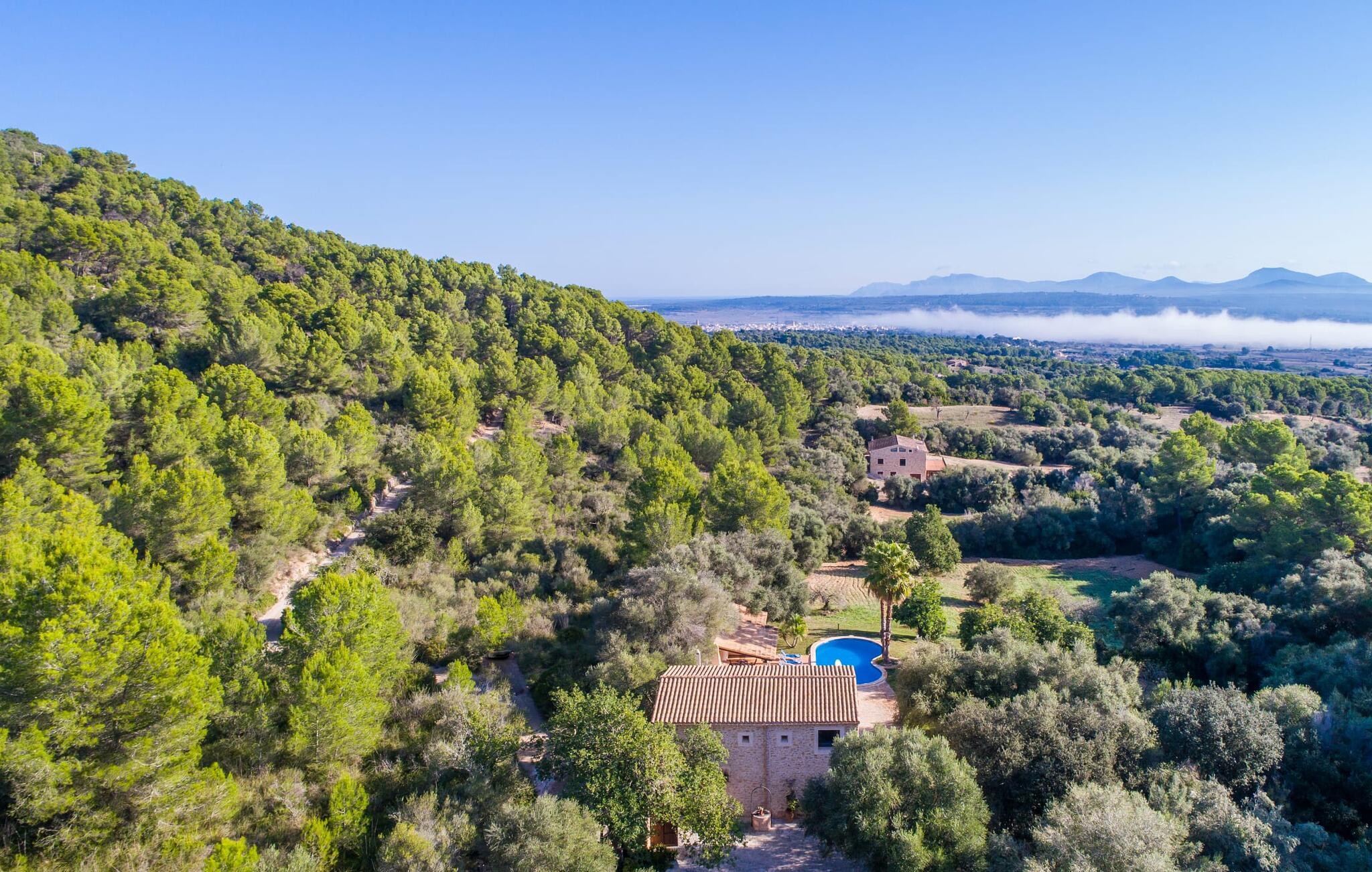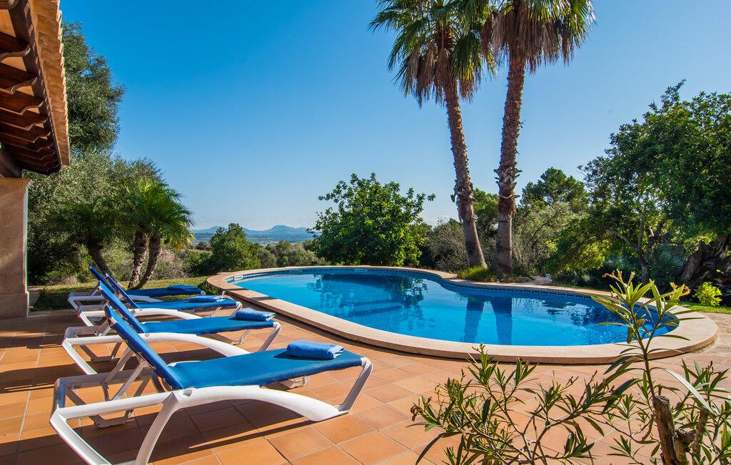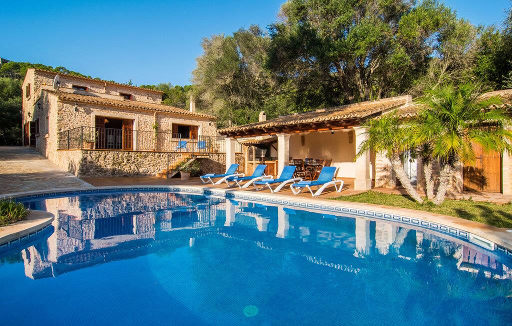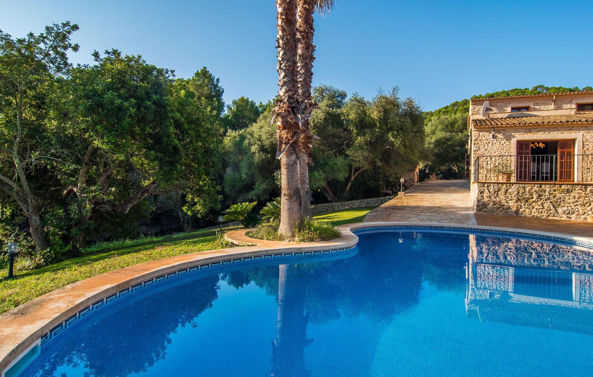 Hvem har ikke drømt om at fordybe sig i vildmarken midt i hverdagens stress og jag? Villa "Isabella" er en charmerende mulighed for at opfylde denne drøm ved at kombinere idyllisk natur og komforten ved god infrastruktur. Hvis I lader blikket vandre fra haven i det fjerne, vil I se villaens uberørte stenmure bag jer. Bagved ligger trætoppene i den tætte skov på en bakke. Poolens damformede, buede omrids er foret med store palmer, der tilføjer et strejf af tropisk flair til denne naturligt maleriske scene. Lige ved siden af poolen finder I komfortable liggestole, hvor I kan genoplade jeres D-vitamintank og nyde den vidunderligt friske, milde ø-brise. Ved det rustikke træbord kan I nyde kulinariske fejringer sammen udendørs, som ikke behøver at ende så hurtigt takket være den afsondrede beliggenhed. I kan også sove næste morgen – eller nyde fyrre blink i det fri. Da det udendørs badeværelse giver varmt vand, kan I få mest muligt ud af haven og bruge meget tid udenfor. Det betyder ikke, at I skal undgå det indre af villaen – tværtimod. Sofaerne, hvorfra I kan nyde lyden af den åbne pejs, er et vidunderligt hyggeligt sted for en snak eller læsning af en god bog i en hjemlig atmosfære. Herfra kan I også følge med i, hvad der sker derhjemme takket være fladskærmen og satellitforbindelsen. Spiseområdet i denne stue er dedikeret til jeres gastronomiske ønsker. Der er plads til ti personer omkring træbordet under lysekronen, hvilket gør villaen ideel til at underholde besøgende. Middagen kan tilberedes på ingen tid i det rummelige køkken med keramisk kogeplade. Hvert værelse fremstår lyst og venligt, og I vil hurtigt føle jer hjemme i soveværelserne: to af dem er i stueetagen, den ene med to enkeltsenge, den anden med eget badeværelse. Yderligere fire gæster kan bo på første sal, som rummer to soveværelser med dobbeltsenge og to badeværelser. Takket være badekarret i to af badeværelserne kan I nemt afslutte dagen romantisk. Villa "Isabella" ligger midt i et naturreservat; En vandrerute fører direkte ind i det vilde, romantiske bjerglandskab. Den lille mallorcanske juvel Petra ligger 4,5 km væk, hvor I kan opleve den stille side af øen helt tæt på på resortets ugentlige marked. Manacor, 13,5 km væk, er ideel til en længere gåtur gennem byen. Den historiske bykerne med sine mange snoede gader venter bare på at blive udforsket. Til dage ved havet anbefaler vi den helt uberørte naturlige strand Son Serra de Marina i nordøst, cirka en halv time væk. I sydøst er der en række smukke bugter at opdage, de såkaldte Calas de Mallorca. Villaen er en fremragende base camp for sporty gæster, der ønsker at udforske øen på cykel eller til fods. Der er også fem varierede golfbaner i området. Villaen "Isabella" med sin eksklusive indretning ligger 4,5 km sydvest for Petra, en malerisk lille by, i charmerende omgivelser. Petra lader intet tilbage at ønske med sin blanding af supermarkeder, barer og udsøgte restauranter. Den naturlige sandstrand i Son Serra de Marina er en halv time væk med jeres lejebil - den smukke østkyst kan nås lige så hurtigt.