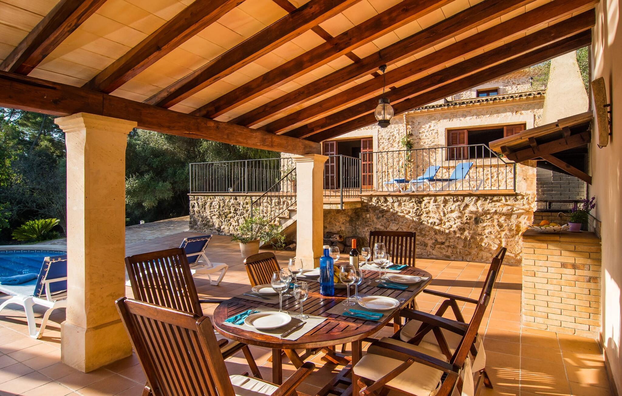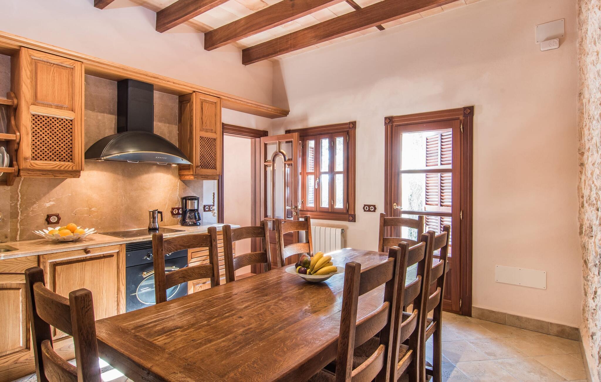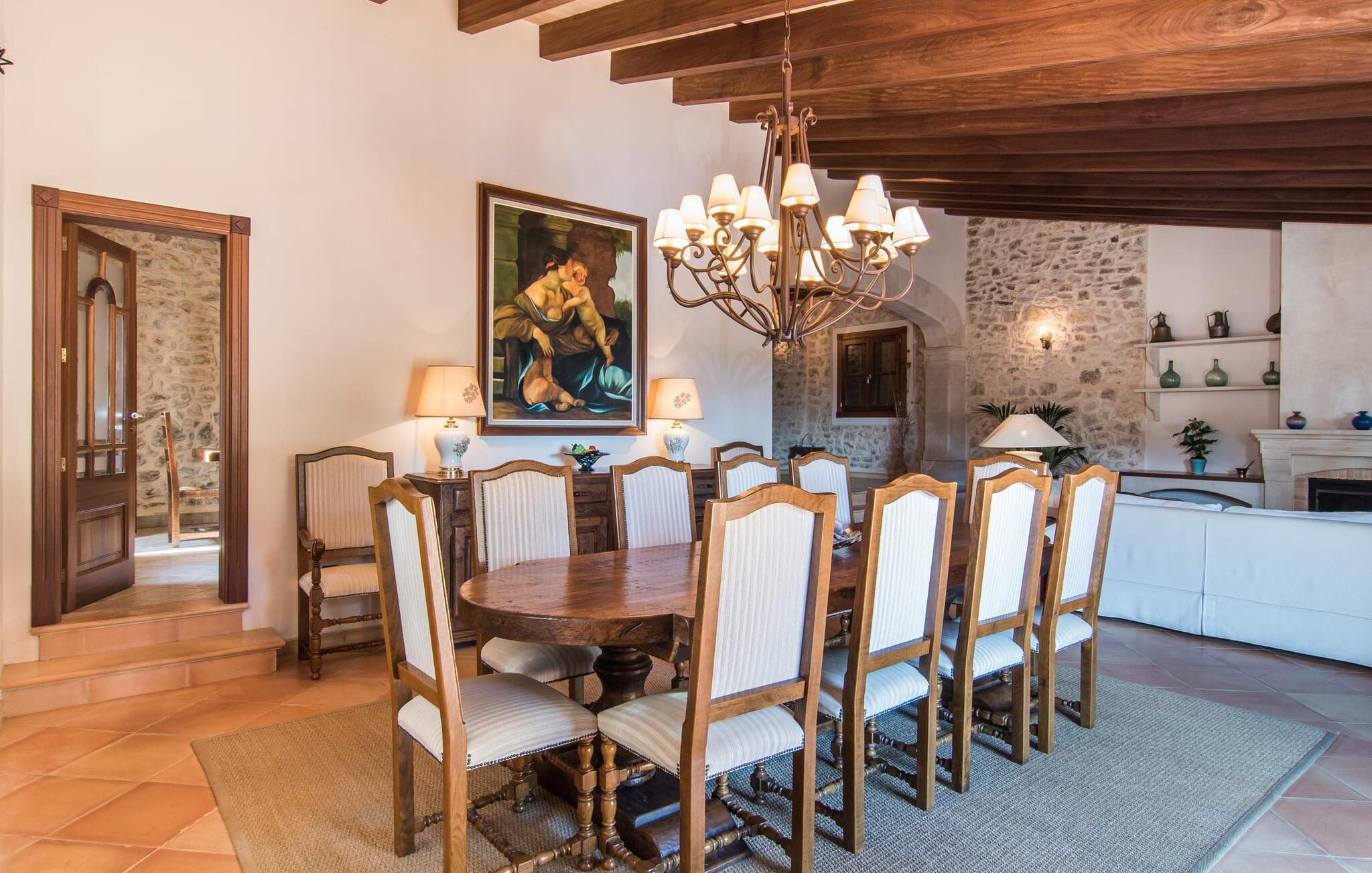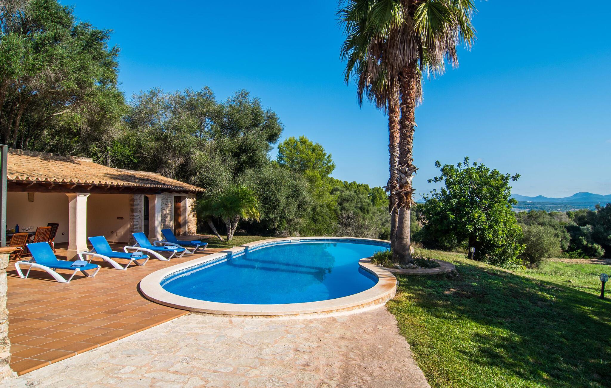 Hvem har ikke drømt om at fordybe sig i vildmarken midt i hverdagens stress og jag? Villa "Isabella" er en charmerende mulighed for at opfylde denne drøm ved at kombinere idyllisk natur og komforten ved god infrastruktur. Hvis I lader blikket vandre fra haven i det fjerne, vil I se villaens uberørte stenmure bag jer. Bagved ligger trætoppene i den tætte skov på en bakke. Poolens damformede, buede omrids er foret med store palmer, der tilføjer et strejf af tropisk flair til denne naturligt maleriske scene. Lige ved siden af poolen finder I komfortable liggestole, hvor I kan genoplade jeres D-vitamintank og nyde den vidunderligt friske, milde ø-brise. Ved det rustikke træbord kan I nyde kulinariske fejringer sammen udendørs, som ikke behøver at ende så hurtigt takket være den afsondrede beliggenhed. I kan også sove næste morgen – eller nyde fyrre blink i det fri. Da det udendørs badeværelse giver varmt vand, kan I få mest muligt ud af haven og bruge meget tid udenfor. Det betyder ikke, at I skal undgå det indre af villaen – tværtimod. Sofaerne, hvorfra I kan nyde lyden af den åbne pejs, er et vidunderligt hyggeligt sted for en snak eller læsning af en god bog i en hjemlig atmosfære. Herfra kan I også følge med i, hvad der sker derhjemme takket være fladskærmen og satellitforbindelsen. Spiseområdet i denne stue er dedikeret til jeres gastronomiske ønsker. Der er plads til ti personer omkring træbordet under lysekronen, hvilket gør villaen ideel til at underholde besøgende. Middagen kan tilberedes på ingen tid i det rummelige køkken med keramisk kogeplade. Hvert værelse fremstår lyst og venligt, og I vil hurtigt føle jer hjemme i soveværelserne: to af dem er i stueetagen, den ene med to enkeltsenge, den anden med eget badeværelse. Yderligere fire gæster kan bo på første sal, som rummer to soveværelser med dobbeltsenge og to badeværelser. Takket være badekarret i to af badeværelserne kan I nemt afslutte dagen romantisk. Villa "Isabella" ligger midt i et naturreservat; En vandrerute fører direkte ind i det vilde, romantiske bjerglandskab. Den lille mallorcanske juvel Petra ligger 4,5 km væk, hvor I kan opleve den stille side af øen helt tæt på på resortets ugentlige marked. Manacor, 13,5 km væk, er ideel til en længere gåtur gennem byen. Den historiske bykerne med sine mange snoede gader venter bare på at blive udforsket. Til dage ved havet anbefaler vi den helt uberørte naturlige strand Son Serra de Marina i nordøst, cirka en halv time væk. I sydøst er der en række smukke bugter at opdage, de såkaldte Calas de Mallorca. Villaen er en fremragende base camp for sporty gæster, der ønsker at udforske øen på cykel eller til fods. Der er også fem varierede golfbaner i området. Villaen "Isabella" med sin eksklusive indretning ligger 4,5 km sydvest for Petra, en malerisk lille by, i charmerende omgivelser. Petra lader intet tilbage at ønske med sin blanding af supermarkeder, barer og udsøgte restauranter. Den naturlige sandstrand i Son Serra de Marina er en halv time væk med jeres lejebil - den smukke østkyst kan nås lige så hurtigt.