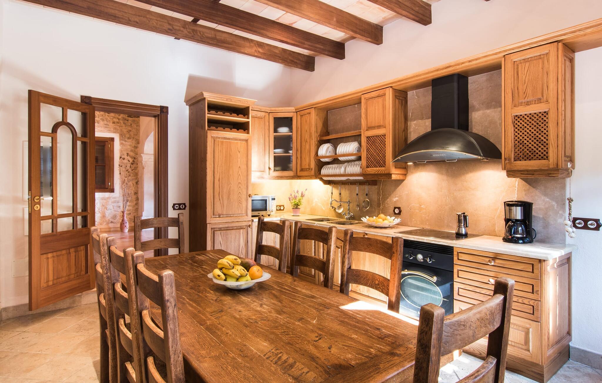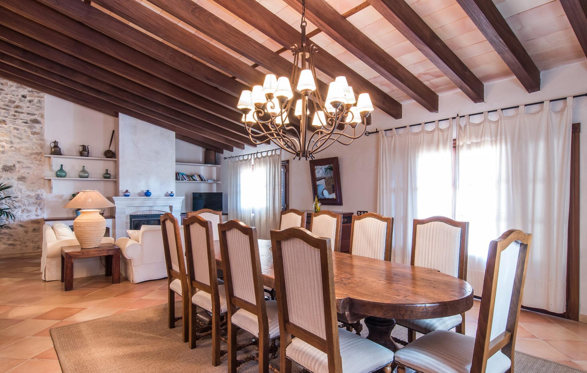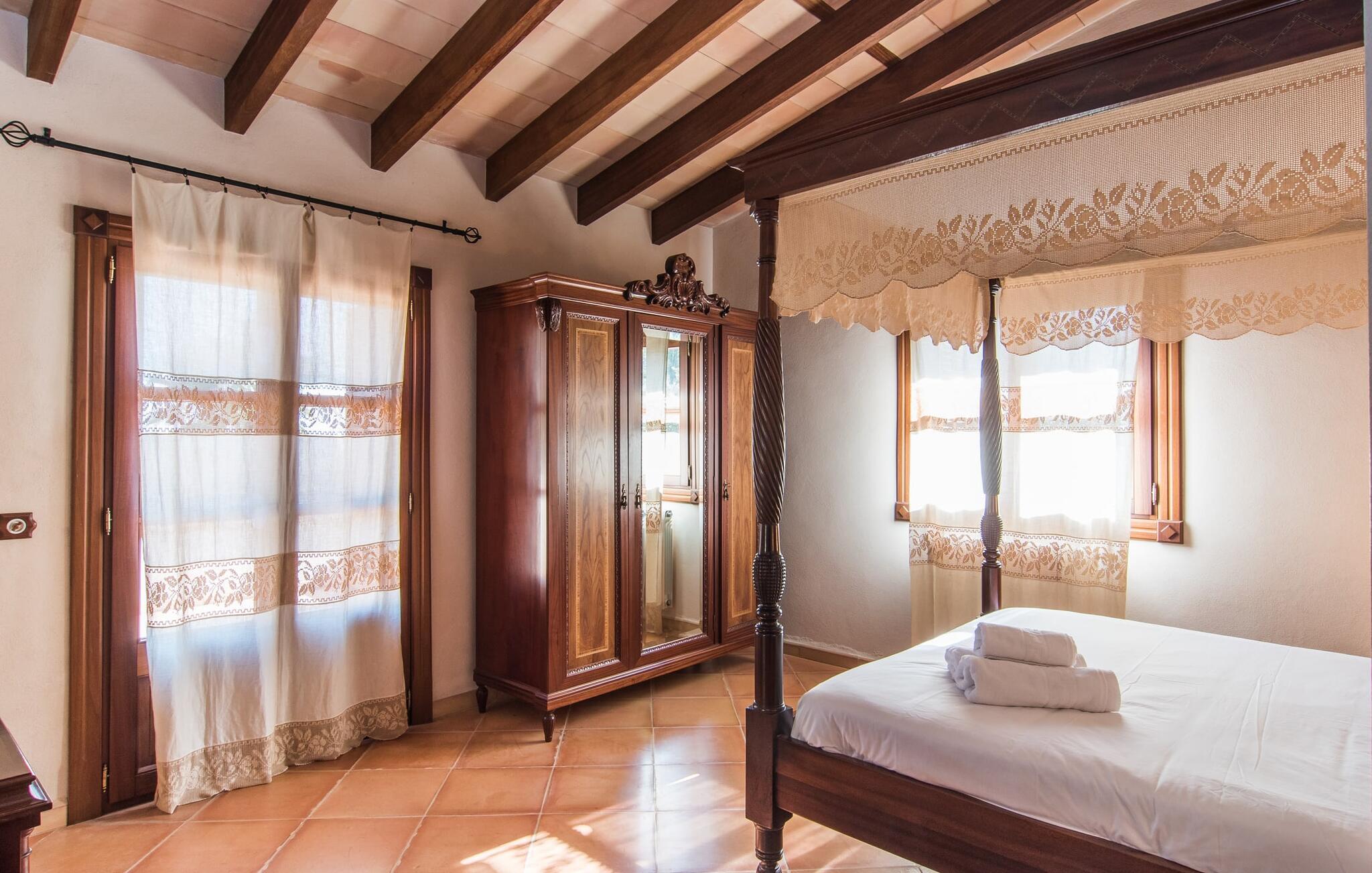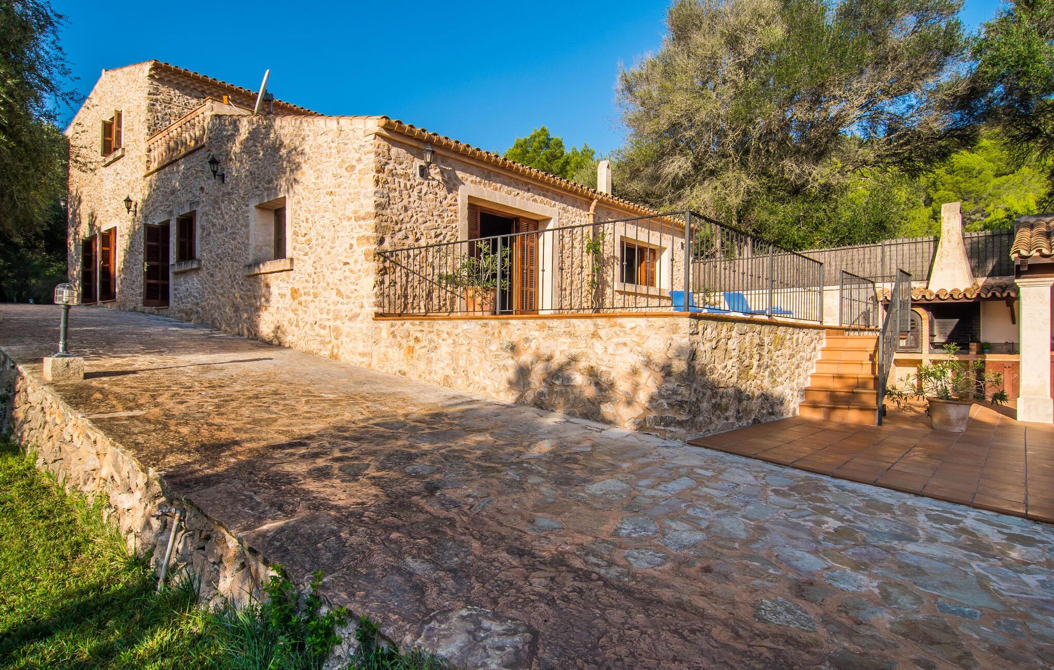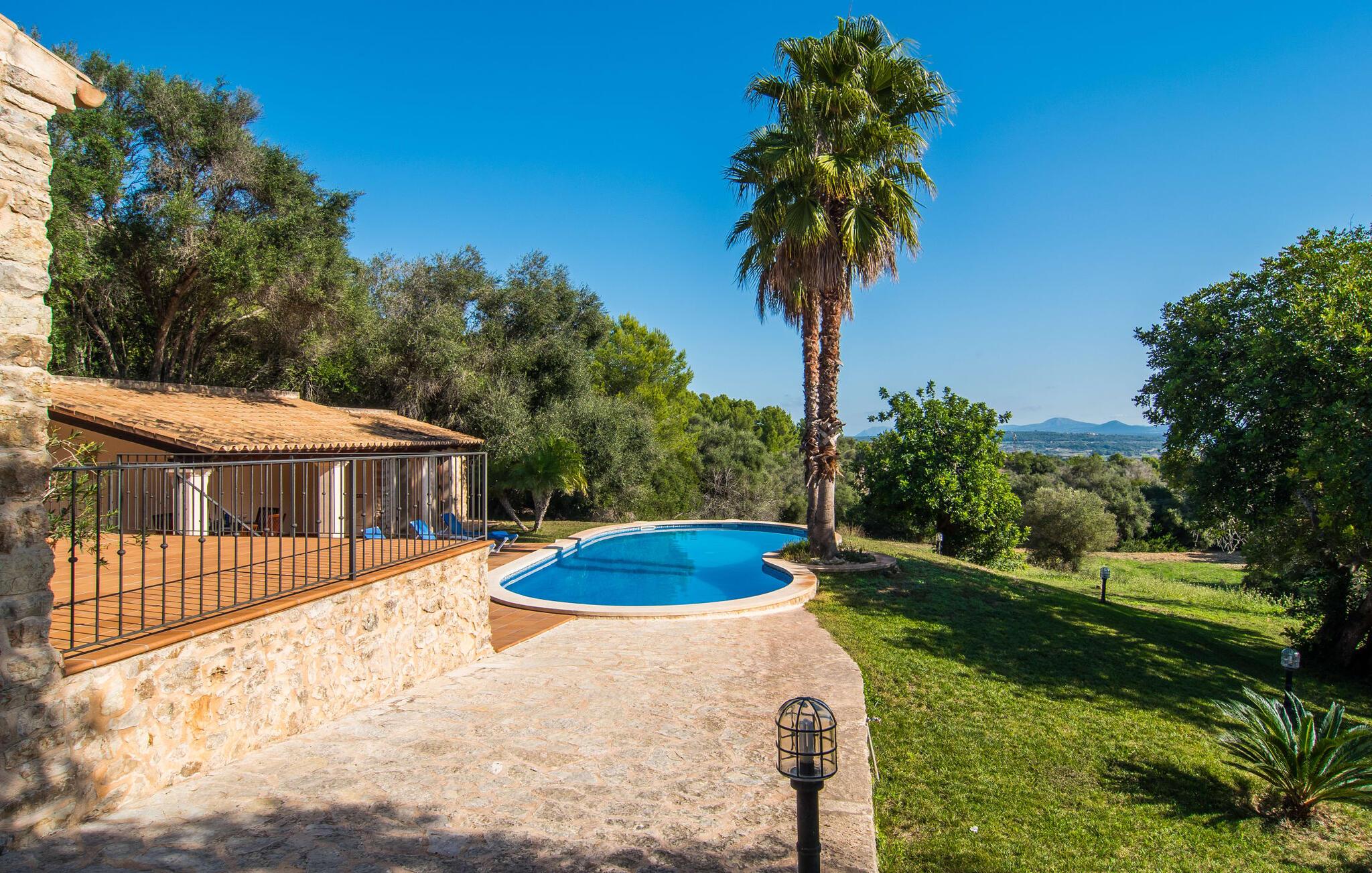 Hvem har ikke drømt om at fordybe sig i vildmarken midt i hverdagens stress og jag? Villa "Isabella" er en charmerende mulighed for at opfylde denne drøm ved at kombinere idyllisk natur og komforten ved god infrastruktur. Hvis I lader blikket vandre fra haven i det fjerne, vil I se villaens uberørte stenmure bag jer. Bagved ligger trætoppene i den tætte skov på en bakke. Poolens damformede, buede omrids er foret med store palmer, der tilføjer et strejf af tropisk flair til denne naturligt maleriske scene. Lige ved siden af poolen finder I komfortable liggestole, hvor I kan genoplade jeres D-vitamintank og nyde den vidunderligt friske, milde ø-brise. Ved det rustikke træbord kan I nyde kulinariske fejringer sammen udendørs, som ikke behøver at ende så hurtigt takket være den afsondrede beliggenhed. I kan også sove næste morgen – eller nyde fyrre blink i det fri. Da det udendørs badeværelse giver varmt vand, kan I få mest muligt ud af haven og bruge meget tid udenfor. Det betyder ikke, at I skal undgå det indre af villaen – tværtimod. Sofaerne, hvorfra I kan nyde lyden af den åbne pejs, er et vidunderligt hyggeligt sted for en snak eller læsning af en god bog i en hjemlig atmosfære. Herfra kan I også følge med i, hvad der sker derhjemme takket være fladskærmen og satellitforbindelsen. Spiseområdet i denne stue er dedikeret til jeres gastronomiske ønsker. Der er plads til ti personer omkring træbordet under lysekronen, hvilket gør villaen ideel til at underholde besøgende. Middagen kan tilberedes på ingen tid i det rummelige køkken med keramisk kogeplade. Hvert værelse fremstår lyst og venligt, og I vil hurtigt føle jer hjemme i soveværelserne: to af dem er i stueetagen, den ene med to enkeltsenge, den anden med eget badeværelse. Yderligere fire gæster kan bo på første sal, som rummer to soveværelser med dobbeltsenge og to badeværelser. Takket være badekarret i to af badeværelserne kan I nemt afslutte dagen romantisk. Villa "Isabella" ligger midt i et naturreservat; En vandrerute fører direkte ind i det vilde, romantiske bjerglandskab. Den lille mallorcanske juvel Petra ligger 4,5 km væk, hvor I kan opleve den stille side af øen helt tæt på på resortets ugentlige marked. Manacor, 13,5 km væk, er ideel til en længere gåtur gennem byen. Den historiske bykerne med sine mange snoede gader venter bare på at blive udforsket. Til dage ved havet anbefaler vi den helt uberørte naturlige strand Son Serra de Marina i nordøst, cirka en halv time væk. I sydøst er der en række smukke bugter at opdage, de såkaldte Calas de Mallorca. Villaen er en fremragende base camp for sporty gæster, der ønsker at udforske øen på cykel eller til fods. Der er også fem varierede golfbaner i området. Villaen "Isabella" med sin eksklusive indretning ligger 4,5 km sydvest for Petra, en malerisk lille by, i charmerende omgivelser. Petra lader intet tilbage at ønske med sin blanding af supermarkeder, barer og udsøgte restauranter. Den naturlige sandstrand i Son Serra de Marina er en halv time væk med jeres lejebil - den smukke østkyst kan nås lige så hurtigt.