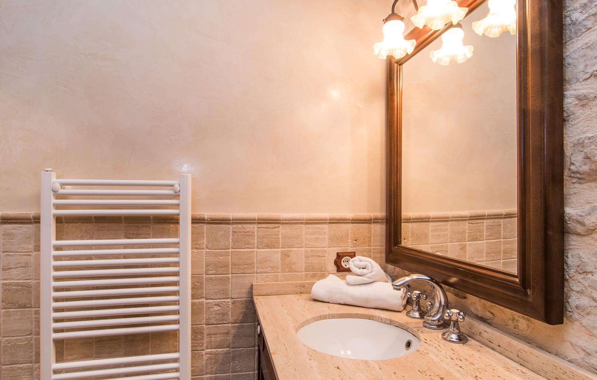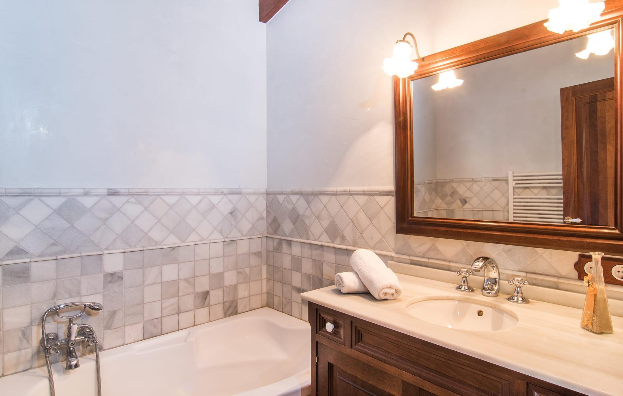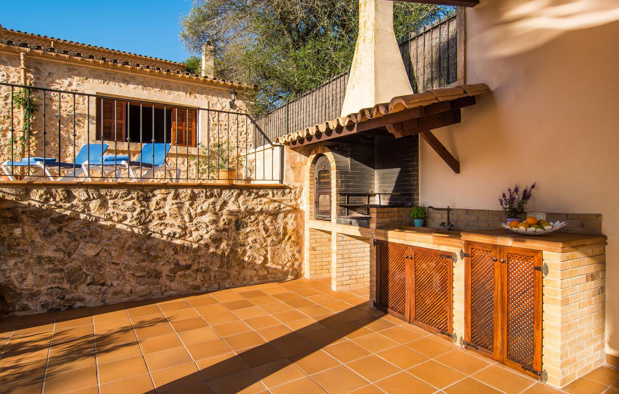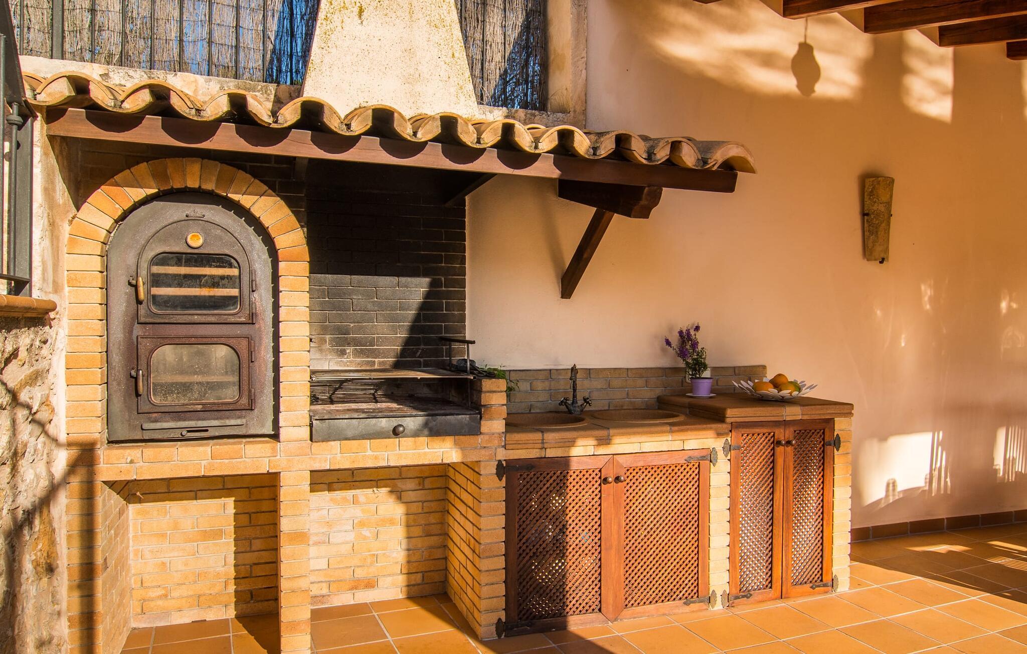 Hvem har ikke drømt om at fordybe sig i vildmarken midt i hverdagens stress og jag? Villa "Isabella" er en charmerende mulighed for at opfylde denne drøm ved at kombinere idyllisk natur og komforten ved god infrastruktur. Hvis I lader blikket vandre fra haven i det fjerne, vil I se villaens uberørte stenmure bag jer. Bagved ligger trætoppene i den tætte skov på en bakke. Poolens damformede, buede omrids er foret med store palmer, der tilføjer et strejf af tropisk flair til denne naturligt maleriske scene. Lige ved siden af poolen finder I komfortable liggestole, hvor I kan genoplade jeres D-vitamintank og nyde den vidunderligt friske, milde ø-brise. Ved det rustikke træbord kan I nyde kulinariske fejringer sammen udendørs, som ikke behøver at ende så hurtigt takket være den afsondrede beliggenhed. I kan også sove næste morgen – eller nyde fyrre blink i det fri. Da det udendørs badeværelse giver varmt vand, kan I få mest muligt ud af haven og bruge meget tid udenfor. Det betyder ikke, at I skal undgå det indre af villaen – tværtimod. Sofaerne, hvorfra I kan nyde lyden af den åbne pejs, er et vidunderligt hyggeligt sted for en snak eller læsning af en god bog i en hjemlig atmosfære. Herfra kan I også følge med i, hvad der sker derhjemme takket være fladskærmen og satellitforbindelsen. Spiseområdet i denne stue er dedikeret til jeres gastronomiske ønsker. Der er plads til ti personer omkring træbordet under lysekronen, hvilket gør villaen ideel til at underholde besøgende. Middagen kan tilberedes på ingen tid i det rummelige køkken med keramisk kogeplade. Hvert værelse fremstår lyst og venligt, og I vil hurtigt føle jer hjemme i soveværelserne: to af dem er i stueetagen, den ene med to enkeltsenge, den anden med eget badeværelse. Yderligere fire gæster kan bo på første sal, som rummer to soveværelser med dobbeltsenge og to badeværelser. Takket være badekarret i to af badeværelserne kan I nemt afslutte dagen romantisk. Villa "Isabella" ligger midt i et naturreservat; En vandrerute fører direkte ind i det vilde, romantiske bjerglandskab. Den lille mallorcanske juvel Petra ligger 4,5 km væk, hvor I kan opleve den stille side af øen helt tæt på på resortets ugentlige marked. Manacor, 13,5 km væk, er ideel til en længere gåtur gennem byen. Den historiske bykerne med sine mange snoede gader venter bare på at blive udforsket. Til dage ved havet anbefaler vi den helt uberørte naturlige strand Son Serra de Marina i nordøst, cirka en halv time væk. I sydøst er der en række smukke bugter at opdage, de såkaldte Calas de Mallorca. Villaen er en fremragende base camp for sporty gæster, der ønsker at udforske øen på cykel eller til fods. Der er også fem varierede golfbaner i området. Villaen "Isabella" med sin eksklusive indretning ligger 4,5 km sydvest for Petra, en malerisk lille by, i charmerende omgivelser. Petra lader intet tilbage at ønske med sin blanding af supermarkeder, barer og udsøgte restauranter. Den naturlige sandstrand i Son Serra de Marina er en halv time væk med jeres lejebil - den smukke østkyst kan nås lige så hurtigt.