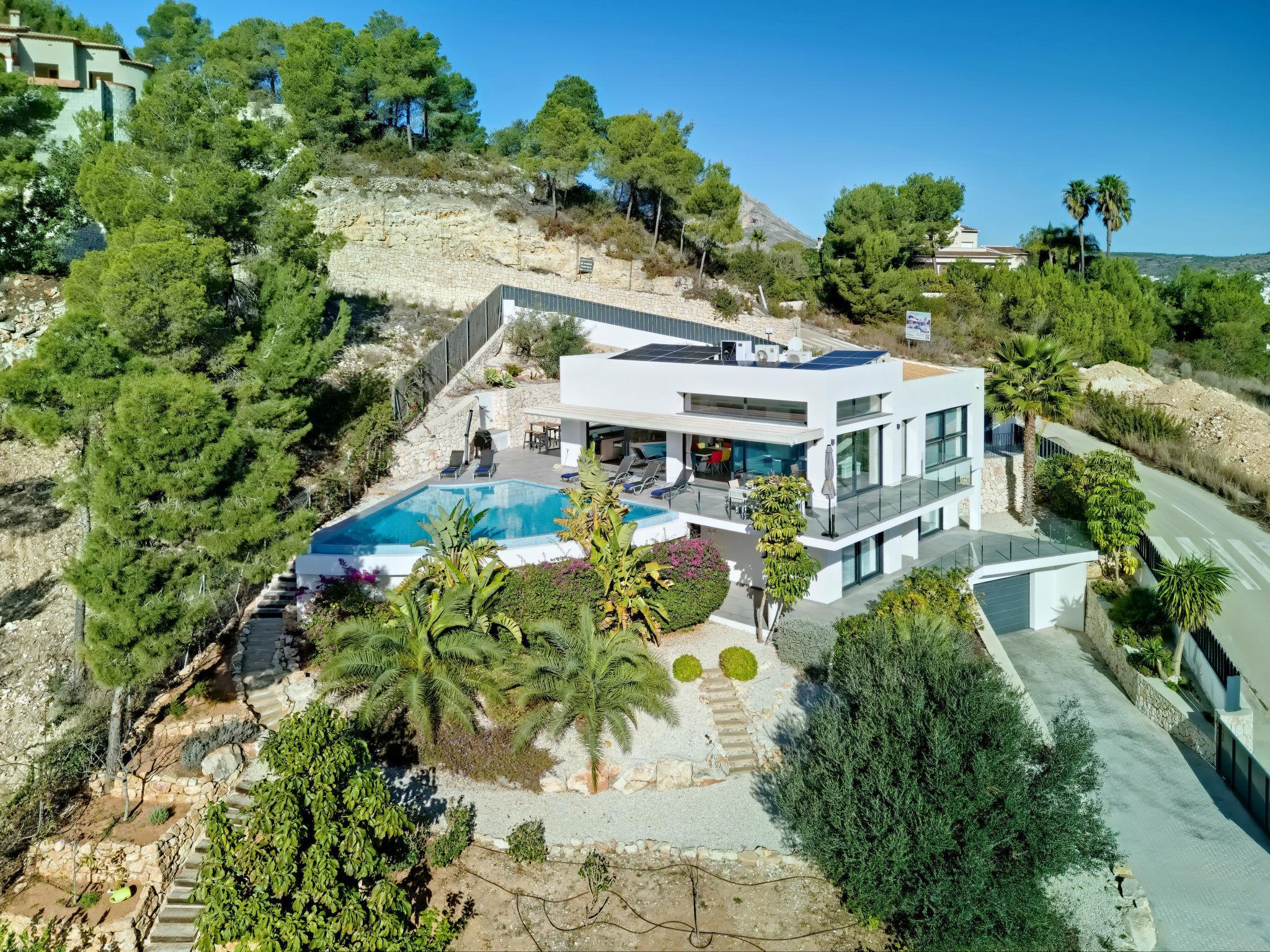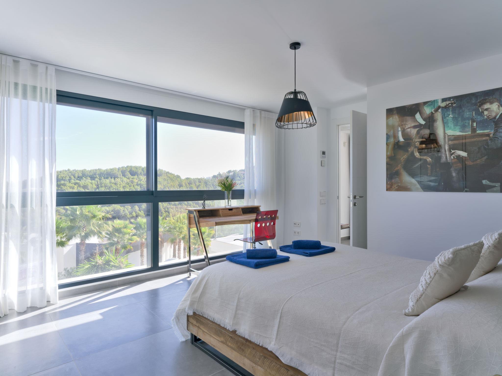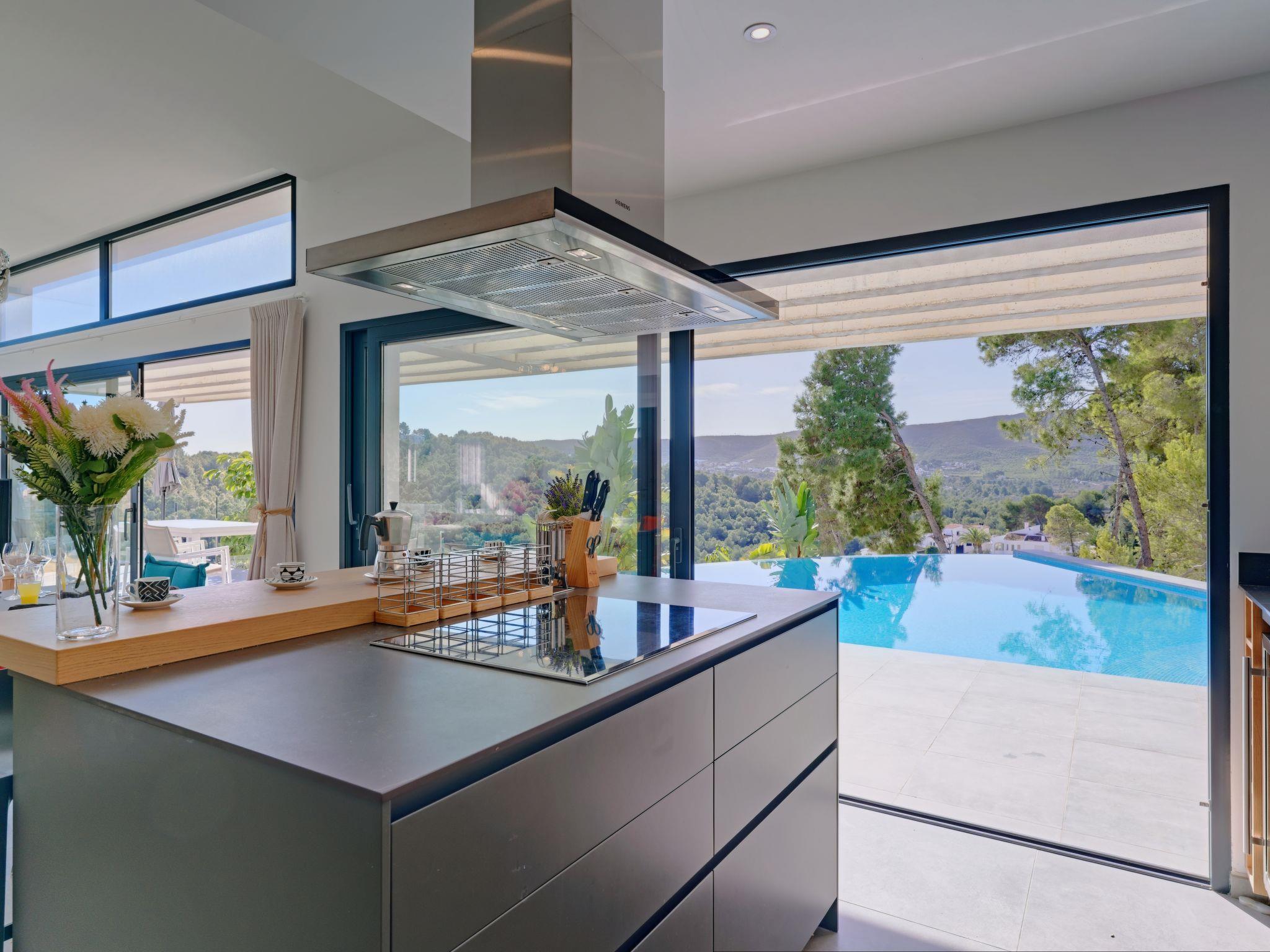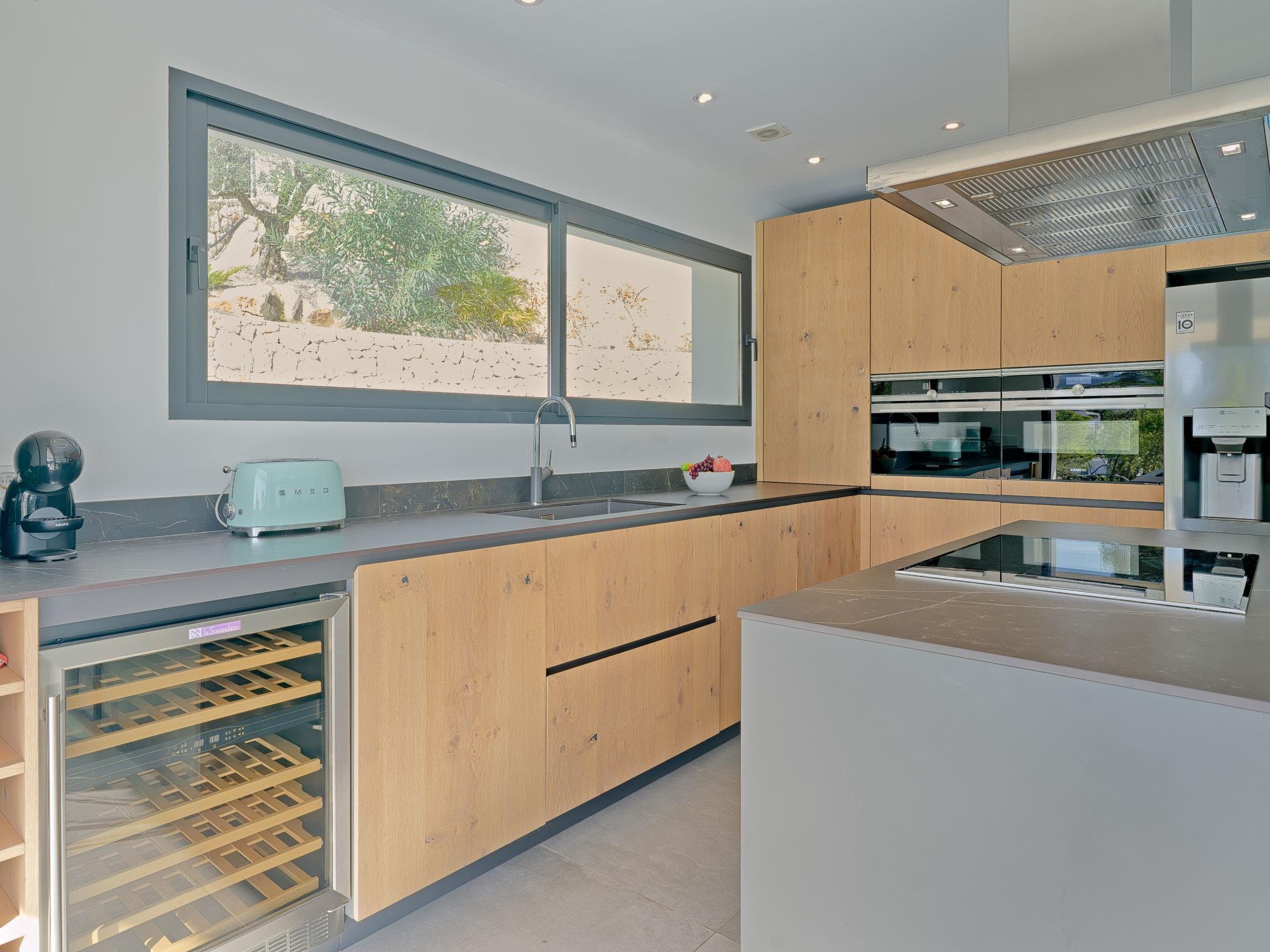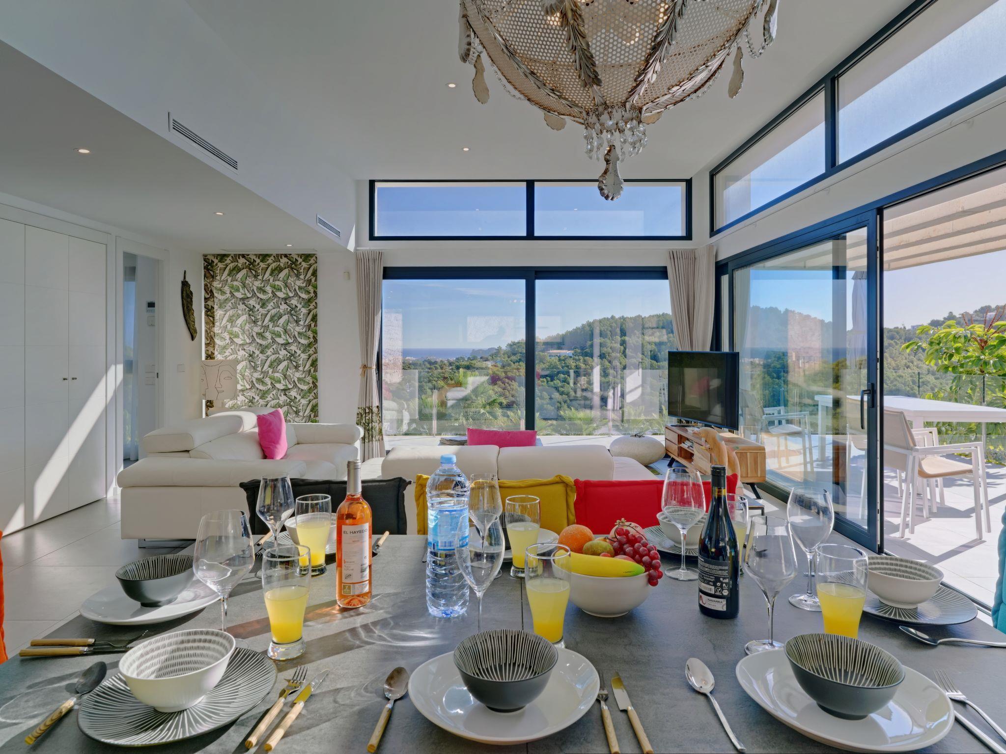 "Villa Juno", 5-room villa 350 m2. Spacious and bright, very beautiful and stylish furnishings: living/dining room with satellite TV, air conditioning and forced-air heating. Exit to the patio, to the swimming pool. 1 room with 1 french bed (160 cm, length 200 cm), shower/bidet/WC, satellite TV, air conditioning and forced-air heating. Open kitchen (oven, dishwasher, 4 induction hot plates, toaster, microwave, freezer, electric coffee machine, cooking island) with air conditioning and forced-air heating. Exit to the terrace, to the swimming pool. Sep. WC. Underfloor heating. On the lower ground floor: 1 room with 1 french bed (160 cm, length 200 cm), shower/WC, air conditioning and forced-air heating. Exit to the terrace. 1 room with 1 french bed (150 cm, length 200 cm), bath/WC, air conditioning and forced-air heating. 1 room with 3 beds (90 cm, length 200 cm), shower/WC, air conditioning and forced-air heating. Underfloor heating. Large terrace. Terrace furniture, barbecue, deck chairs (8), covered balcony, sitting area. Marvellous panoramic view of the sea, the mountains and the valley. Facilities: washing machine, dryer, iron, children's high chair, baby cot, hair dryer. Internet (WiFi, free). Parking. To keep in mind: TV ES Smart TV. VT-496420-A // Reg. Nr.: ESFCTU00000307100057942800000000000000000VT-496420-A8