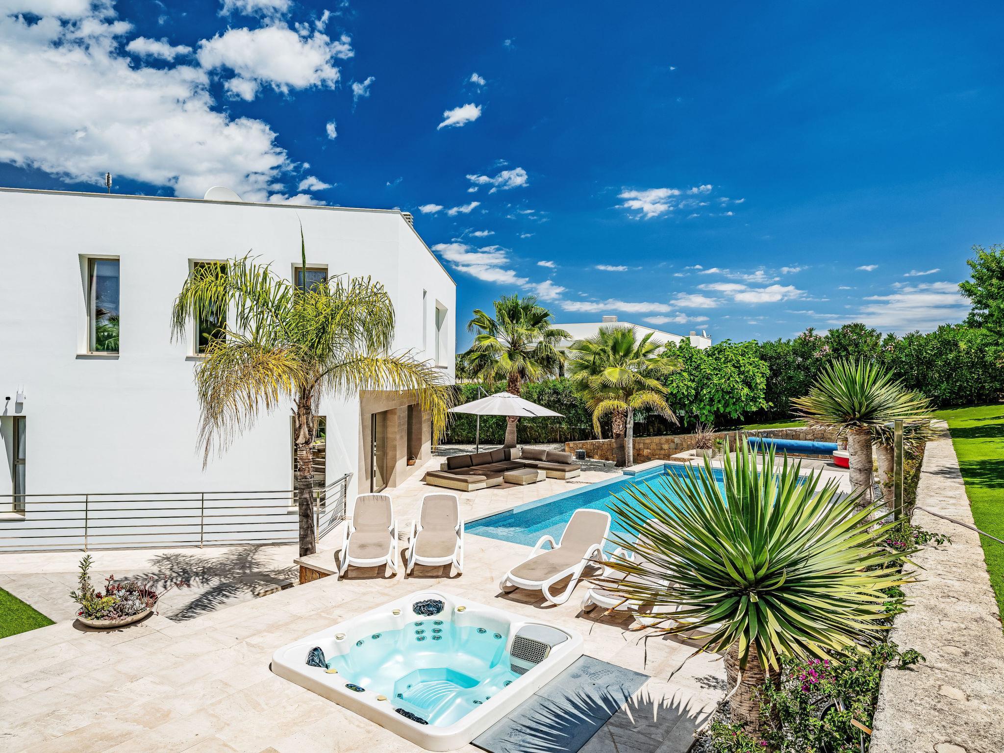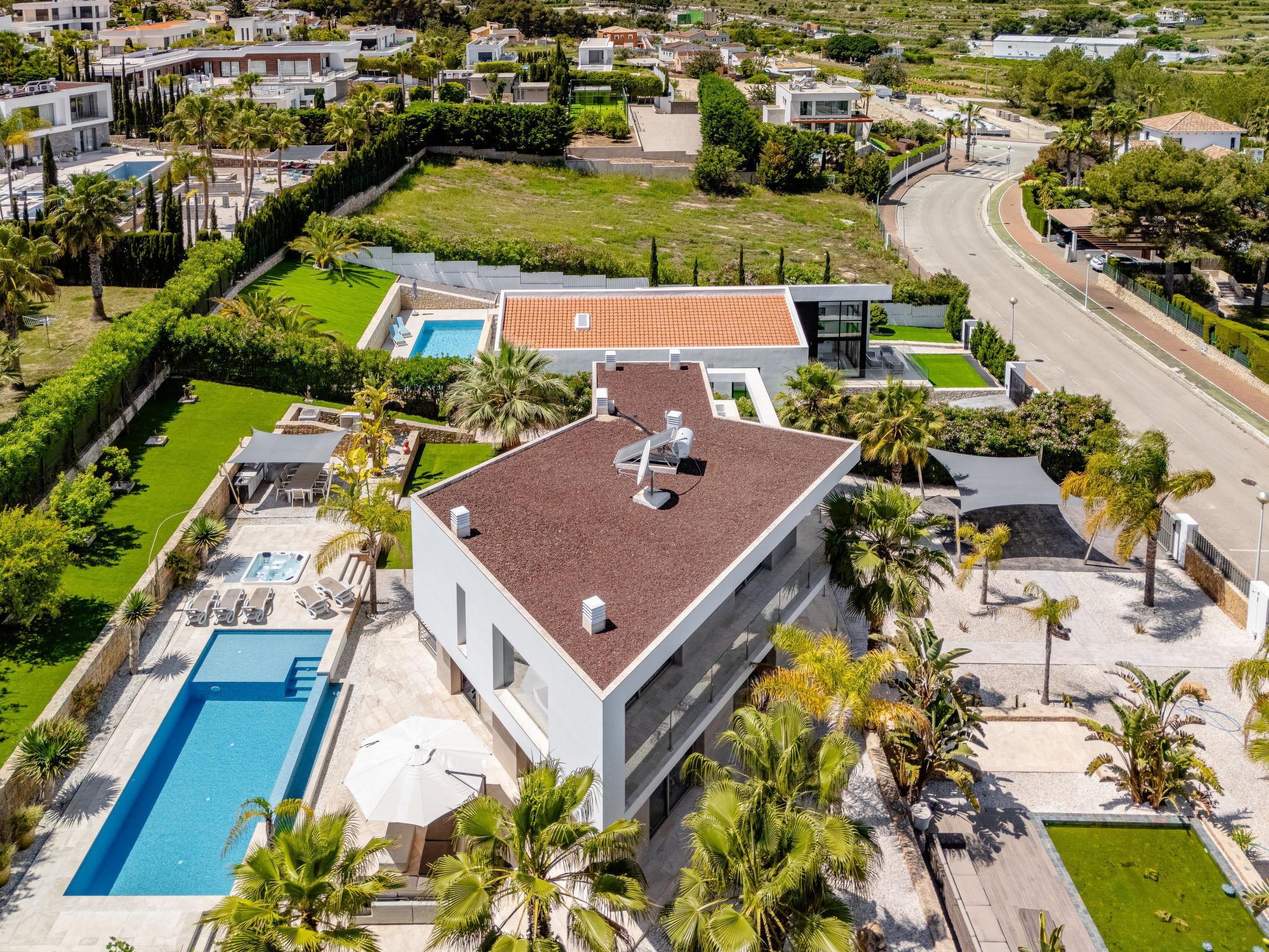 Very large, modern, luxurious villa "Eos", 3 storeys. In the district of Cansalades Park Monte Olimpo 5 km from the centre of Jávea - El Arenal, 8 km from the centre of Moraira, in a quiet, sunny position, 5 km from the sea, 5 km from the beach. Private: large, beautiful, well-kept terraced garden with lawn and wildlife garden, pond, swimming pool angular, with privacy (10 x 4 m, depth 40 - 180 cm, seasonal availability: 01.Jan. - 31.Dec.) with internal staircase. Outdoor shower, hot tub, patio, pergola, garden furniture, barbecue. In the house: central heating system, air conditioning, burglar alarm system. Roofed, parking (for 2 cars) on the premises. Supermarket 2.5 km, restaurant 1 km, bar 2.5 km, bakery 2.5 km, café 2.5 km, bus stop 5 km, sandy beach "El Arenal" 5 km, shingle beach "La Granadella" 10 km. Sports harbour 6 km, marina 6 km, golf course (9 hole) 3 km, surf school 5 km, sailing school 5 km. Please note: car recommended. The owner does not accept any youth groups. The villa has a second indoor heated swimming pool. Measurements 4x2 with exit to terrace.