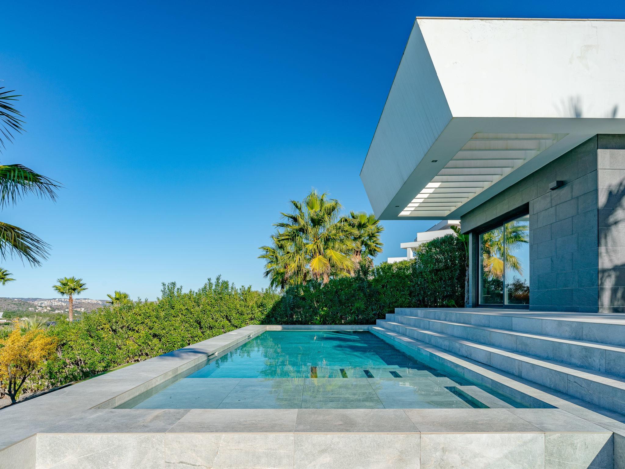 "Villa Leda", 4-room villa 250 m2 on 2 levels. Spacious and bright, very modern and stylish furnishings: living/dining room with satellite TV, air conditioning and forced-air heating. Exit to the terrace, pergola, to the swimming pool. 1 room with 1 double bed (2 x 90 cm, length 200 cm), shower/WC, air conditioning and forced-air heating. Exit to the terrace. Large, open kitchen (oven, dishwasher, 5 induction hot plates, toaster, kettle, microwave, freezer, electric coffee machine, cooking island, combination microwave) with dining table, air conditioning and forced-air heating. Exit to the terrace, to the swimming pool. Sep. WC. Upper floor: 1 room with Dressing room with 1 french bed (180 cm, length 200 cm), bath/shower/WC, double hand-basin, air conditioning and forced-air heating. Exit to the terrace. 1 room with 1 double bed (2 x 90 cm, length 200 cm), shower/WC, air conditioning and forced-air heating. Exit to the terrace. Large terrace 35 m2, large patio 100 m2. Terrace furniture, deck chairs, covered balcony, sitting area. Marvellous view of the sea, the mountains, the valley, the swimming pool and the garden. Facilities: washing machine, dryer, iron, hair dryer. Internet (WiFi, free). Parking (roofed, 2 cars). Please note: not suitable for small children. TV only ES. VT-488665-A // Reg. Nr.: ESFCTU00000307100097680700000000000000000VT-488665-A6