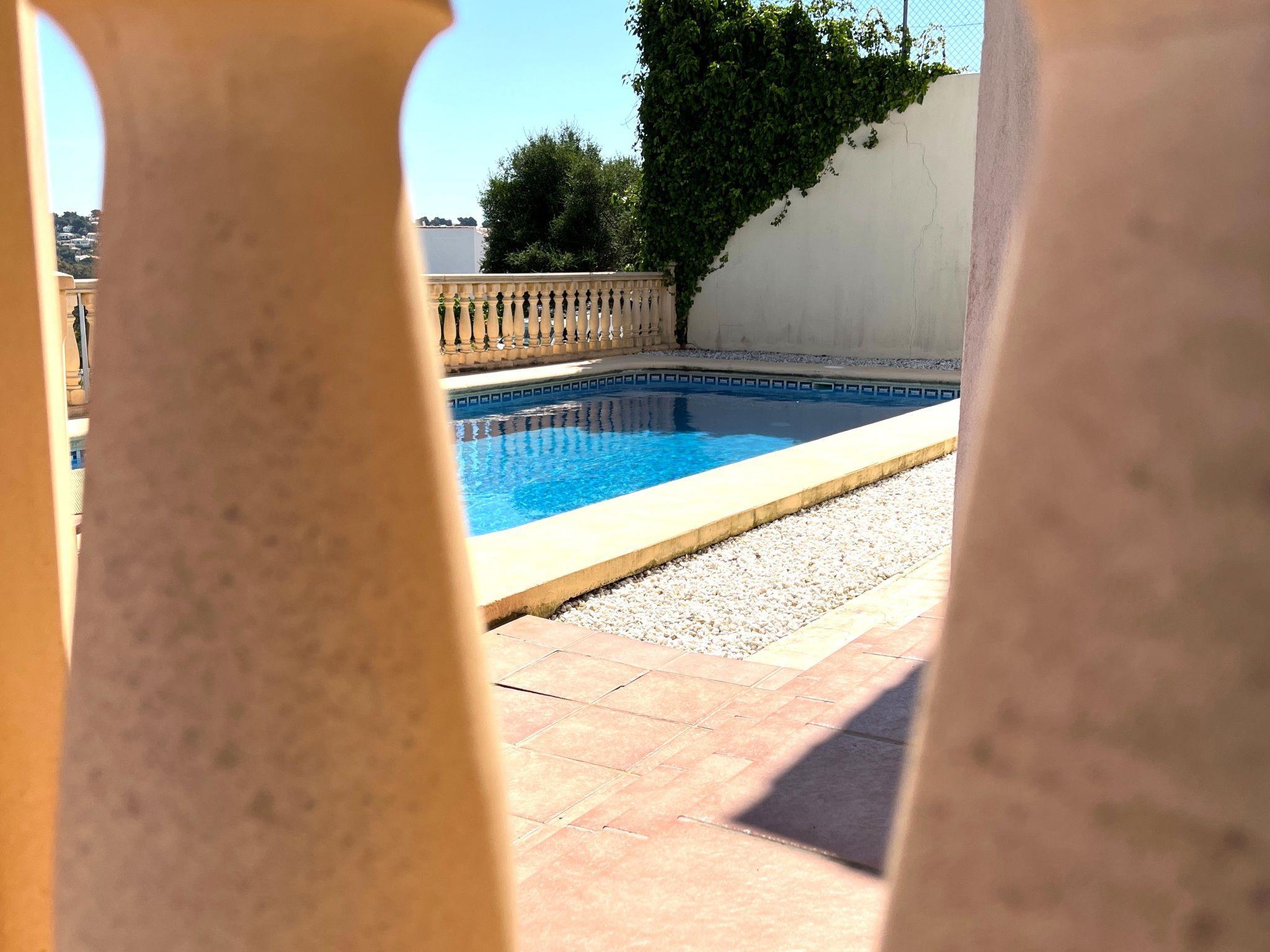 House. 24 houses in the residence. In the district of Monte Javea 5 km from the centre of Jávea-Arenal, on a slope, 3 km from the sea. Private: property (fenced) with wildlife garden and trees, swimming pool (8 x 4 m, depth 120 - 220 cm, seasonal availability: 01.Jan. - 31.Dec.). Public parking on the road. Shop 2.5 km, restaurant 1 km, bus stop "Calablanca" 3.6 km, sandy beach "Arenal" 5 km pebble beach "Granadella" 3 km. Tennis 1 km.