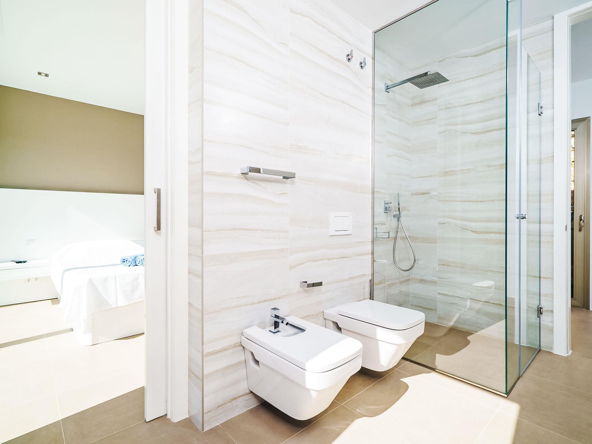 Very modern, beautiful, luxurious villa "Exorbo", 3 storeys, built in 2016. In a quiet, sunny, elevated position on a slope, 3 km from the sea. Private: garden 1'850 m2 (fenced) with wildlife garden, swimming pool heated, with privacy (4 x 10 m, seasonal availability: 01.Jan. - 31.Dec.) with internal staircase and salt-electrolysis pool-cleaning system. Outdoor shower. In the house: lift, air conditioning, burglar alarm system. Supermarket 3 km, restaurant 2 km, bus stop "Estacion de autobuses Javea" 2.4 km, sandy beach "Arenal" 7 km pebble beach "De la Grava" 3 km. Golf course (9 hole) 5 km. Groups of teenagers on request only. Pool heating (extra), on request.