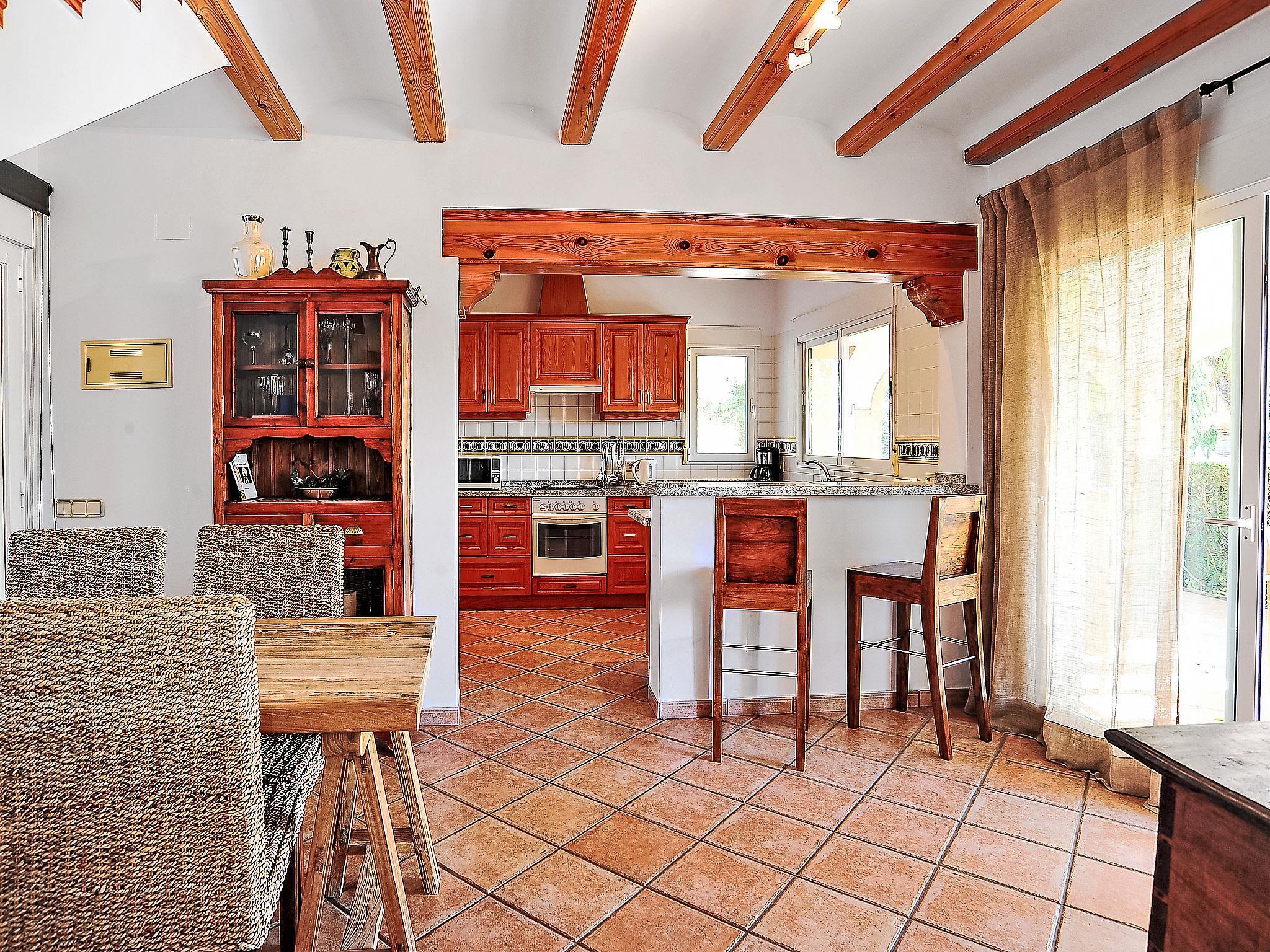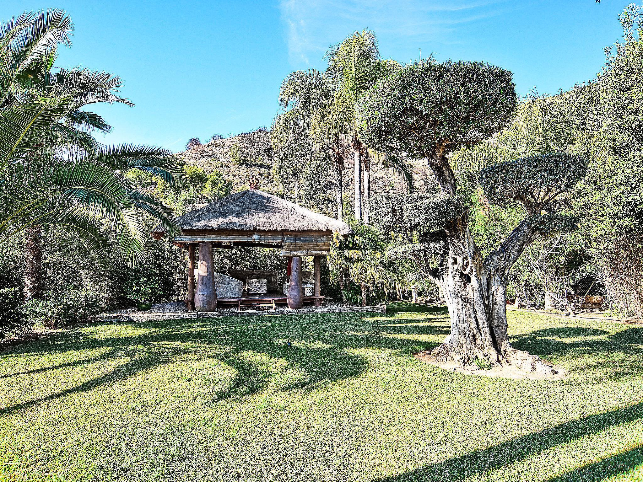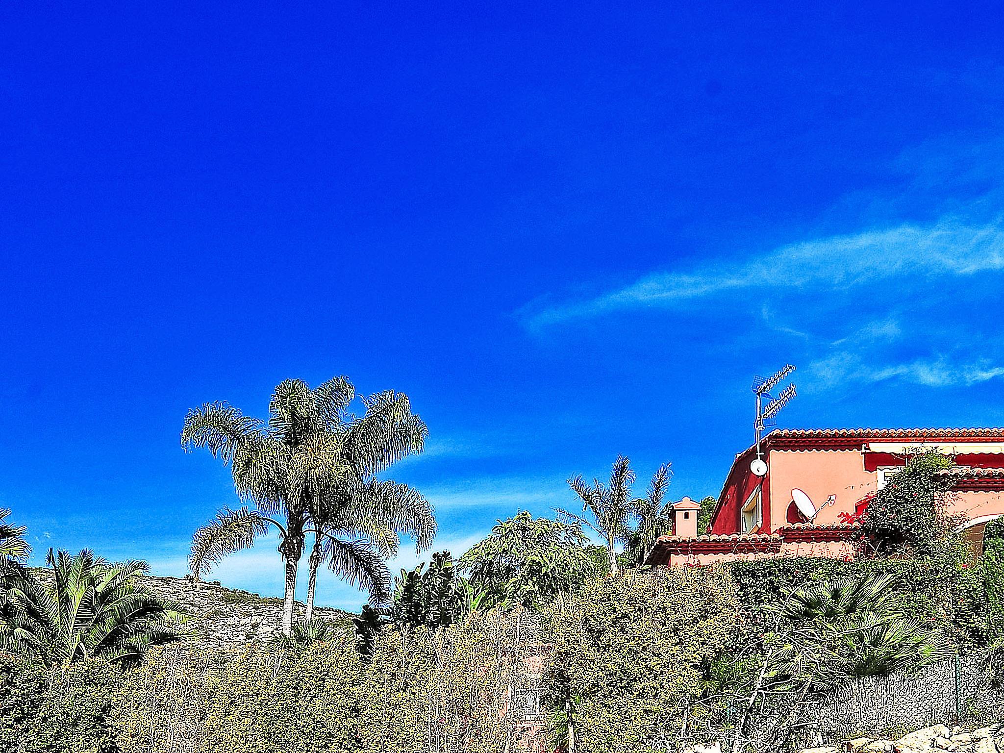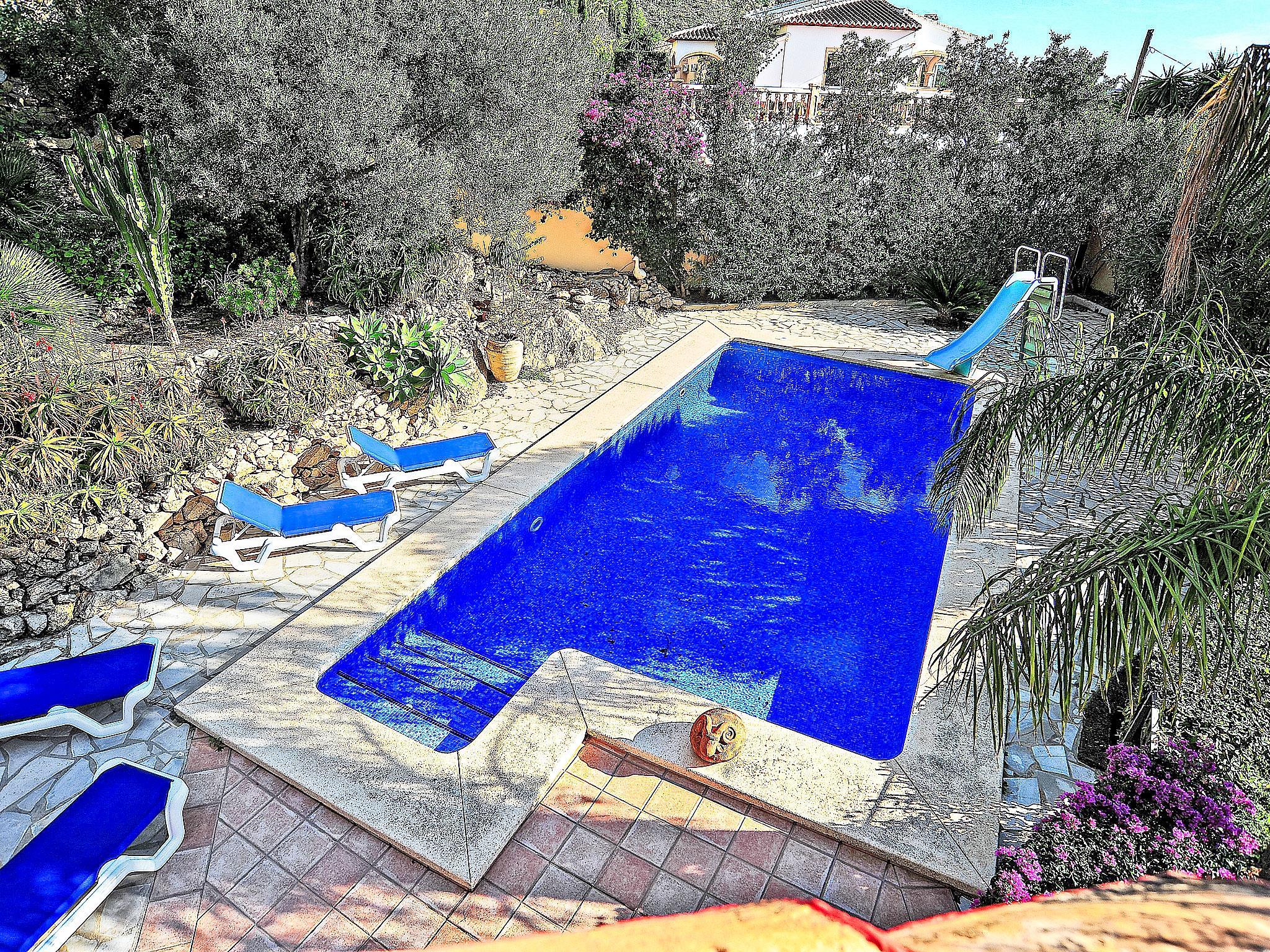 Beautiful villa "Aviles", 2 storeys. In the district of Castellans, in a quiet, sunny position, 9 km from the sea, in a cul-de-sac. Private: beautiful, well-kept garden 1'800 m2 (fenced) with lawn and wildlife garden, swimming pool with privacy, fenced (4 x 9 m, seasonal availability: 01.Jan. - 31.Dec.) with internal staircase. Slide. Stepped path (23 steps) to the house. Supermarket 2 km, restaurant 1 km, bus stop "Estacion de autobuses Javea" 2 km, sandy beach "Arenal" 9 km. Groups of teenagers on request only.
