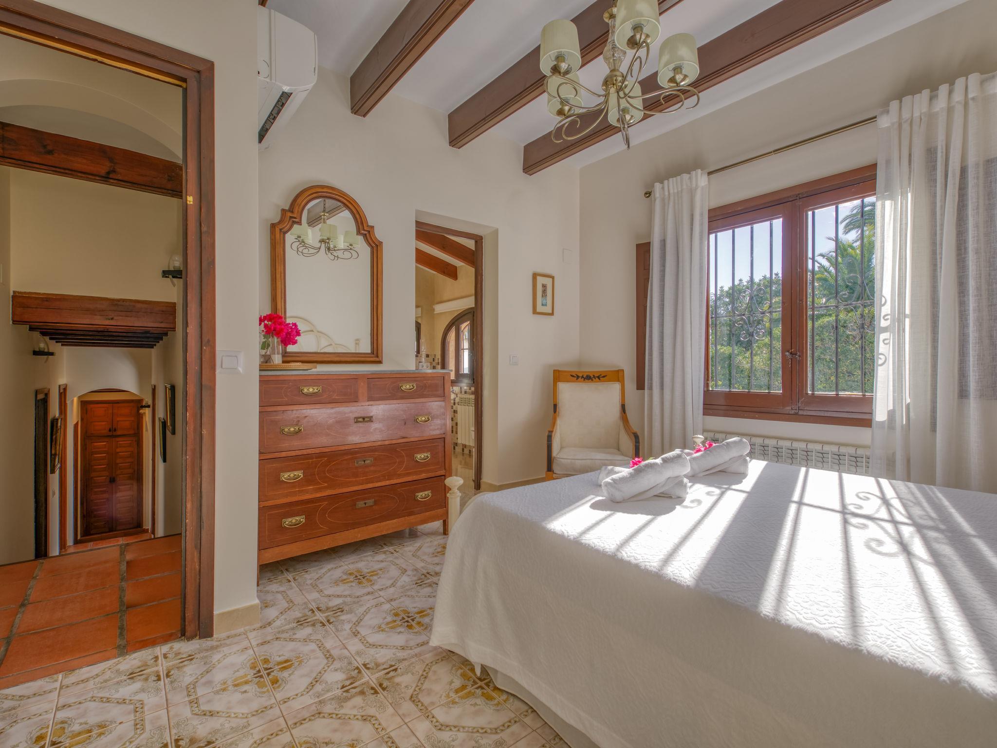 Very beautiful, very comfortable villa "Monte Feliz". In the resort 1 km from the centre of Javea, 3 km from the sea, 3 km from the beach. Private: large terraced garden wildlife garden and trees, orchard, swimming pool (7 x 5 m, depth 110 - 210 cm, seasonal availability: 01.Jan. - 31.Dec.) with internal staircase. Outdoor shower, garden furniture, barbecue, roofed, parking, single garage. Shop 700 m, supermarket 800 m, restaurant 1 km, bar 900 m, bus stop 2 km, sandy beach "El Arenal" 4 km, shingle beach "Playa de la Grava" 3 km. Sports harbour 3 km, surf school 3 km, sailing school 3 km, tennis 3 km. The owner does not accept any youth groups.