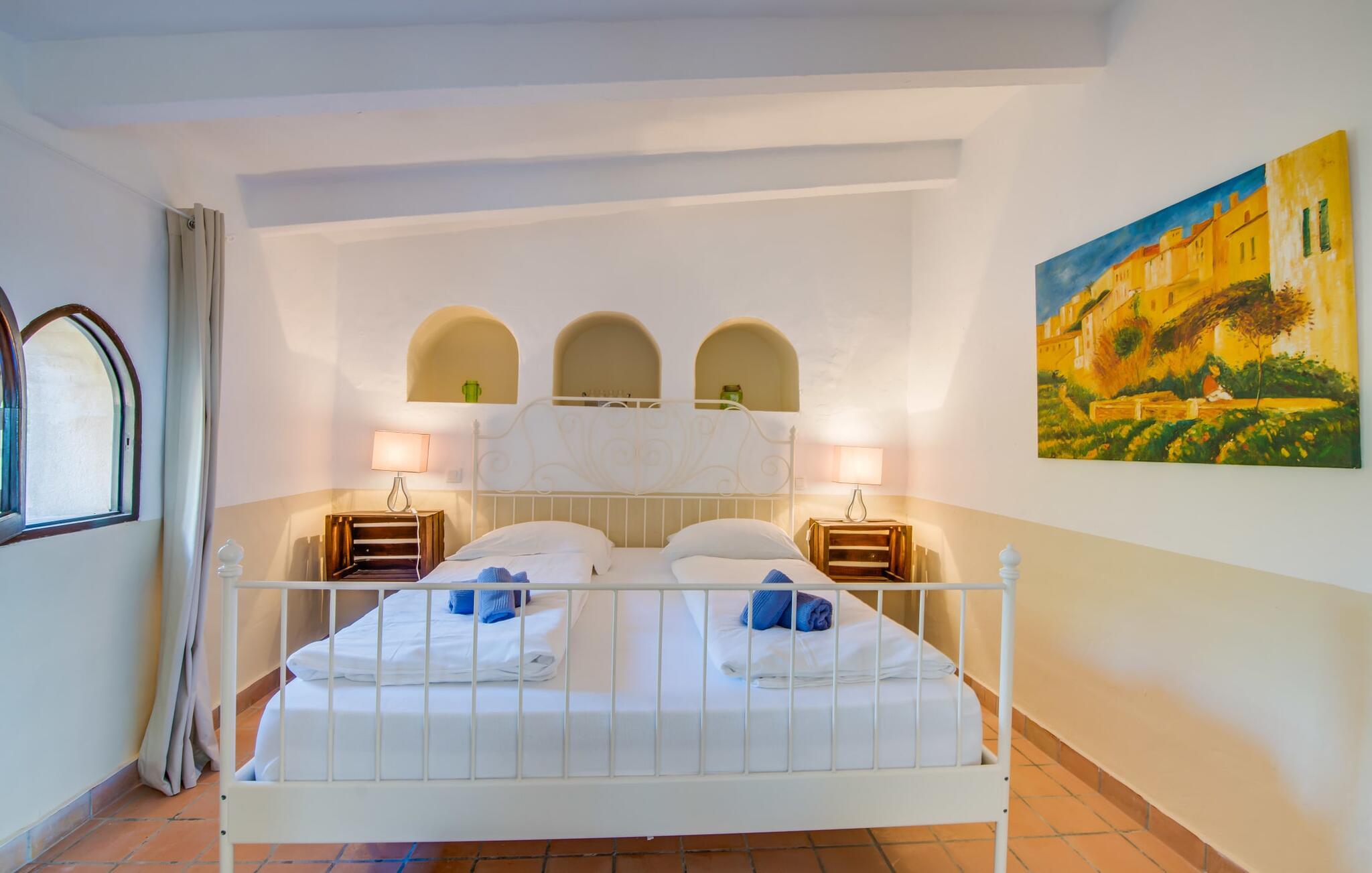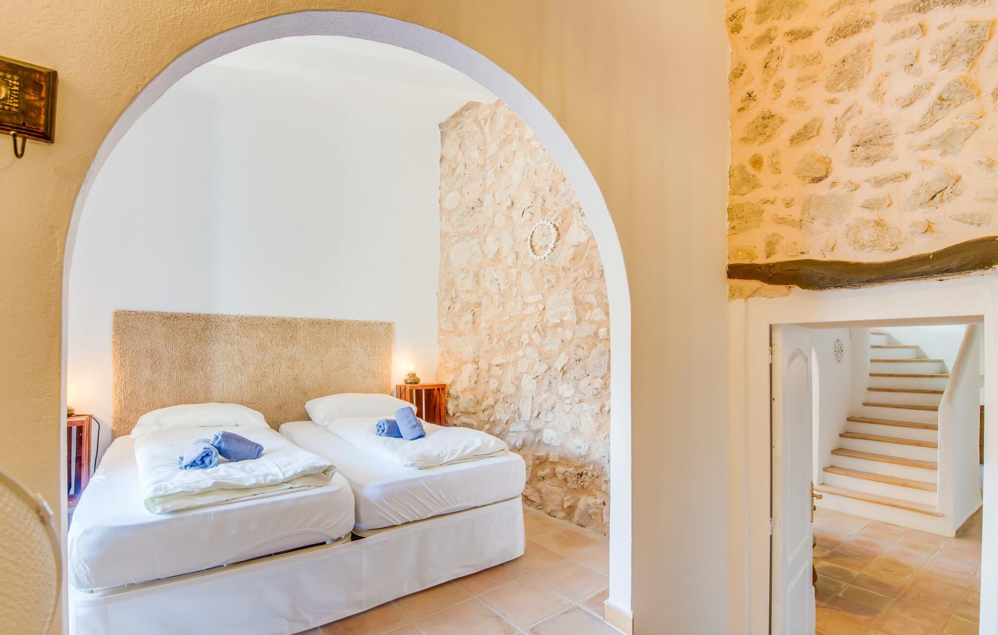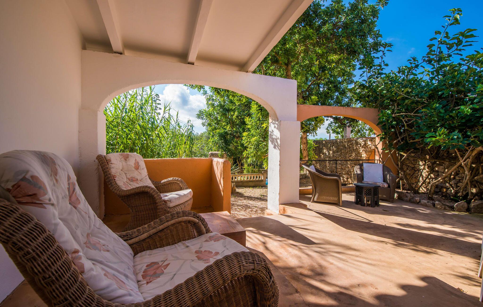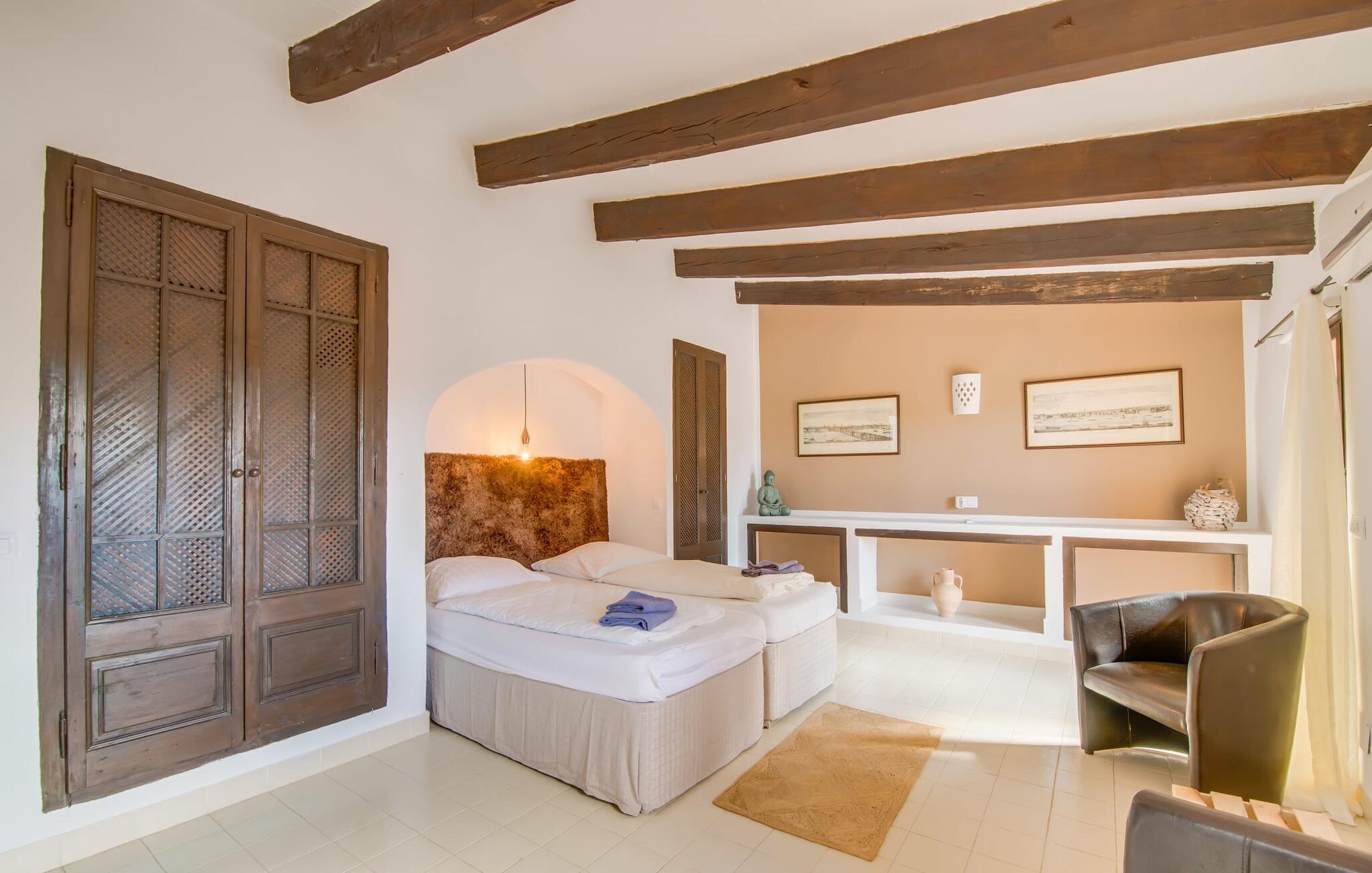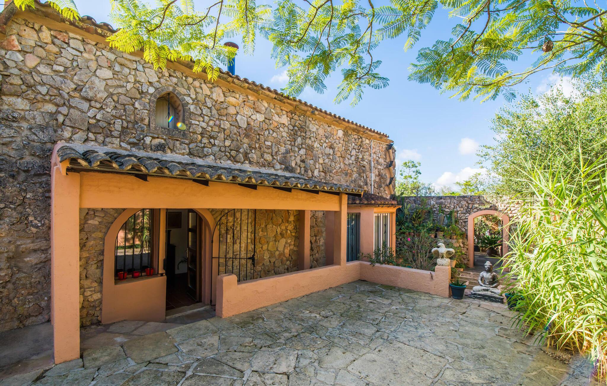 Planlægger I en ferie med en større gruppe? For eksempel flere familier med børn? Og værdsætter I komfort og privatliv? Så er fincaen "Jordi de Cas Concos" på det sydlige Mallorca det perfekte feriehus for jer! Ejendommen er bygget på en kæmpe grund omgivet af smukke middelhavslandskaber. Her har I uendelig plads – og takket være det charmerende design af udearealet er der også rig mulighed for at trække sig tilbage. Haven og de mange forskellige overdækkede og solrige terrassearealer, de smukt anlagte stier og de ugenerte gårdhaver er himmelsk smukke – man ved slet ikke, hvor man skal sætte sig først. Har I lyst til at dyrke motion, svømme i poolen eller spille et spil bordtennis, så mødes måske til en drink i baren eller sæt jer sammen ved langbordet og nyd friskgrillede lækkerier og en salat tilberedt i udekøkkenet. "Jordi d Cas Concos" er ikke en "hyldevare" finca: den er blevet møbleret og designet meget individuelt og originalt med stor sans for detaljer. Lyse farver, nogle gange farvestrålende vægge og billeder i stort format spreder en sommerlig stemning, mens rustikke elementer som træbjælker og groft pudsede lofter understreger den landlige karakter. I stueetagen er der udover indgangspartiet og en stor stue med to sofaer mange andre komfortable siddepladser, herunder forskellige murstensbænke med behagelige hynder. I spisestuen kan I feste sammen ved bordet. I kan tilberede jeres måltider i det smarte, solgule køkken ved siden af. Også her finder I en muret bænk rundt om et smukt glasbord, så I kan spise en skøn morgenmad sammen. I alt tre rummelige dobbeltværelser, hvoraf det ene har en-suite badeværelse, og yderligere to moderne badeværelser fuldender boligkomforten i stueetagen, mens yderligere to soveværelser med en-suite badeværelser venter på jer på øverste etage. I en anden bygning er der bekvemt endnu et dobbeltværelse med eget badeværelse, som er tilgængeligt udefra, så gruppen, der bor her, er helt selvstændig. Til fincaen hører også et gæstehus med to ekstra soveværelser, som kan lejes ud efter anmodning. Landskabet omkring jeres finca er meget grønt, typisk middelhavslandskab og indbyder til lange gåture. For at komme til Cas Concos des Cavaller kører man dog kun 3,9 km i lejebil ad den akustisk mærkbare vej. Her finder I ingen særlige seværdigheder, men den idylliske landsby med sine bakker, der minder om Toscana, er et længselssted for mange tyske Mallorca-elskere, hvoraf nogle har købt eksklusive feriehuse i det behageligt rolige område gennem årene. Det bedste sted at shoppe er i nabobyen Felanitx, som også kun ligger 4,5 km fra jeres hus. Sørg for at prøve de lækre kapers, der dyrkes rundt omkring i byen, og gå ikke glip af de fremragende lokale vine - Felanitx er centrum for øens næststørste vinregion. Til en strandtur er I forkælet med valg mellem de forskellige fortryllende bugter i Cala Gran, Cala d'Or, Cala Sa Nau og Cala Esmeralda, som alle ligger lidt over 11 km væk. Beliggende midt i et smukt landskab, fincaejendommen "Jordi de Cas Concos", som består af flere bygninger, scorer ikke kun med en masse privatliv, men også med en vidunderlig stor grund og en paradisisk have fuld af retreater. . Forskellige overdækkede og solrige terrasseområder inviterer til at blive hængende, poolen byder på velkomstforfriskning og lige ved siden af kan I nyde en kølig drink i baren. Der er godt 11 km i bil til stranden i Cala Gran og kun 4,5 km til byen Felanitx.