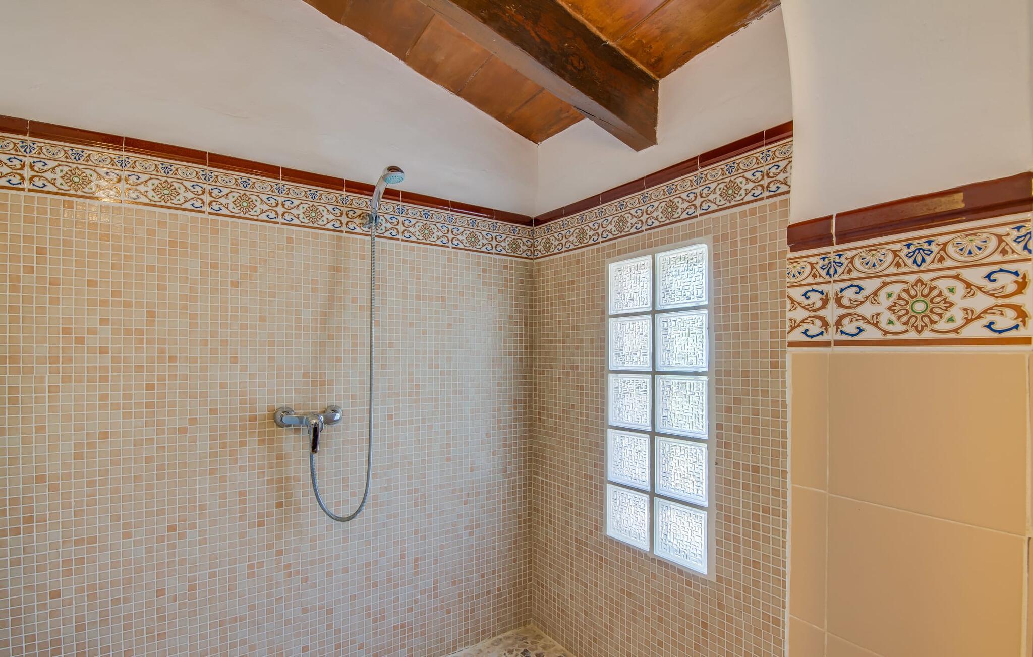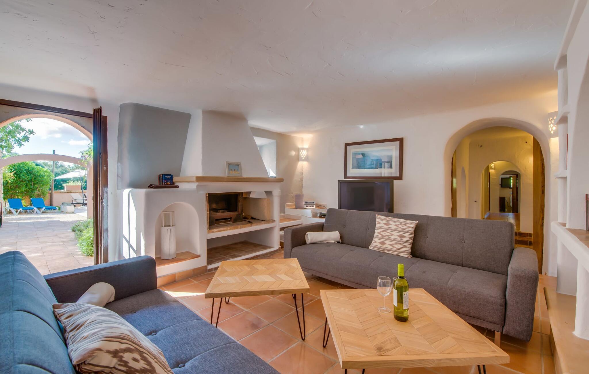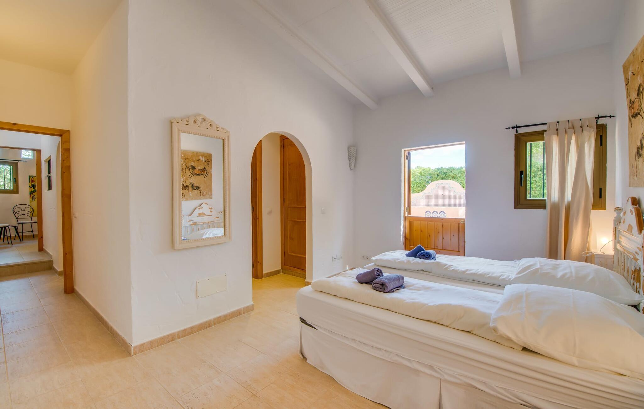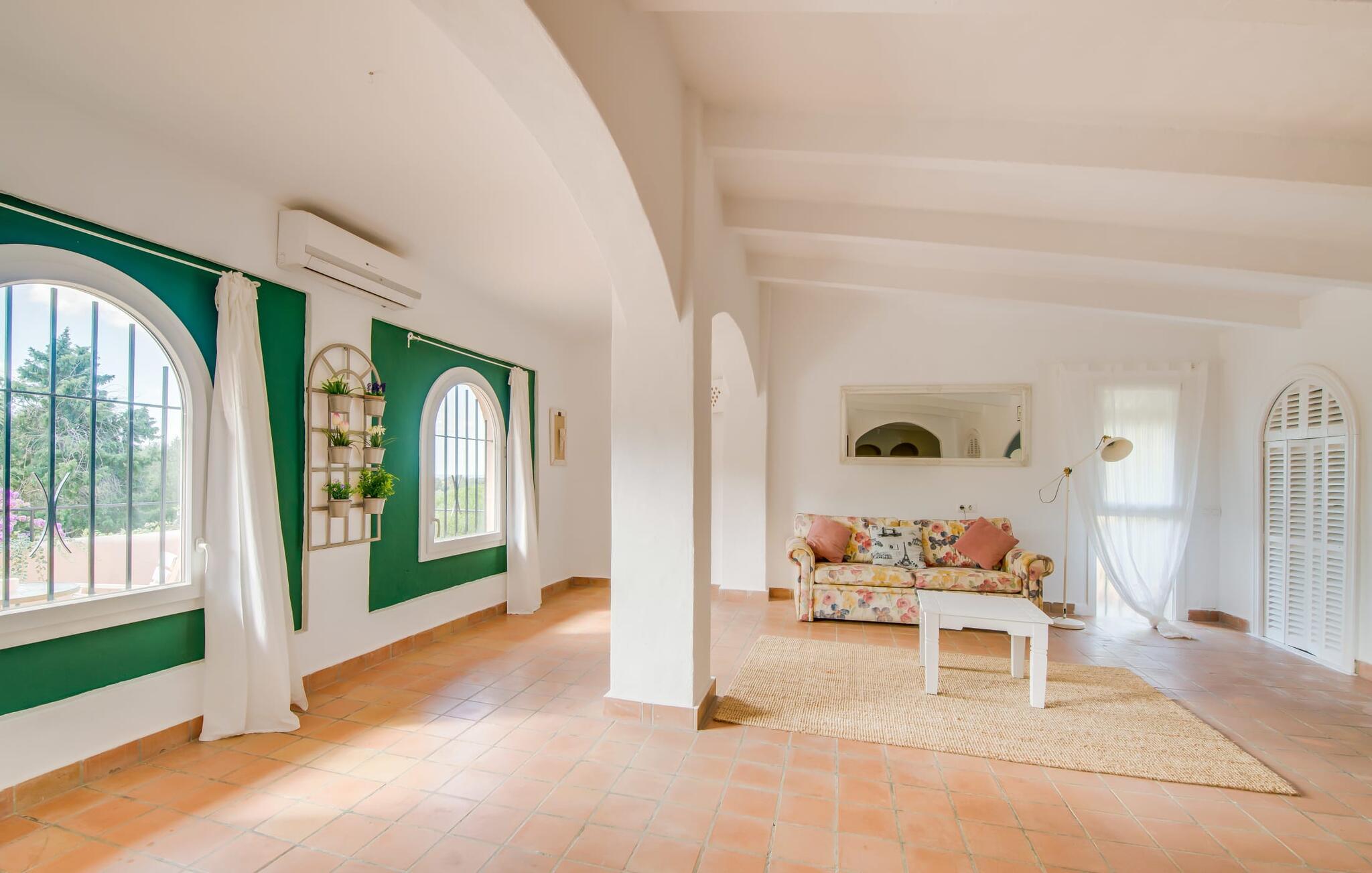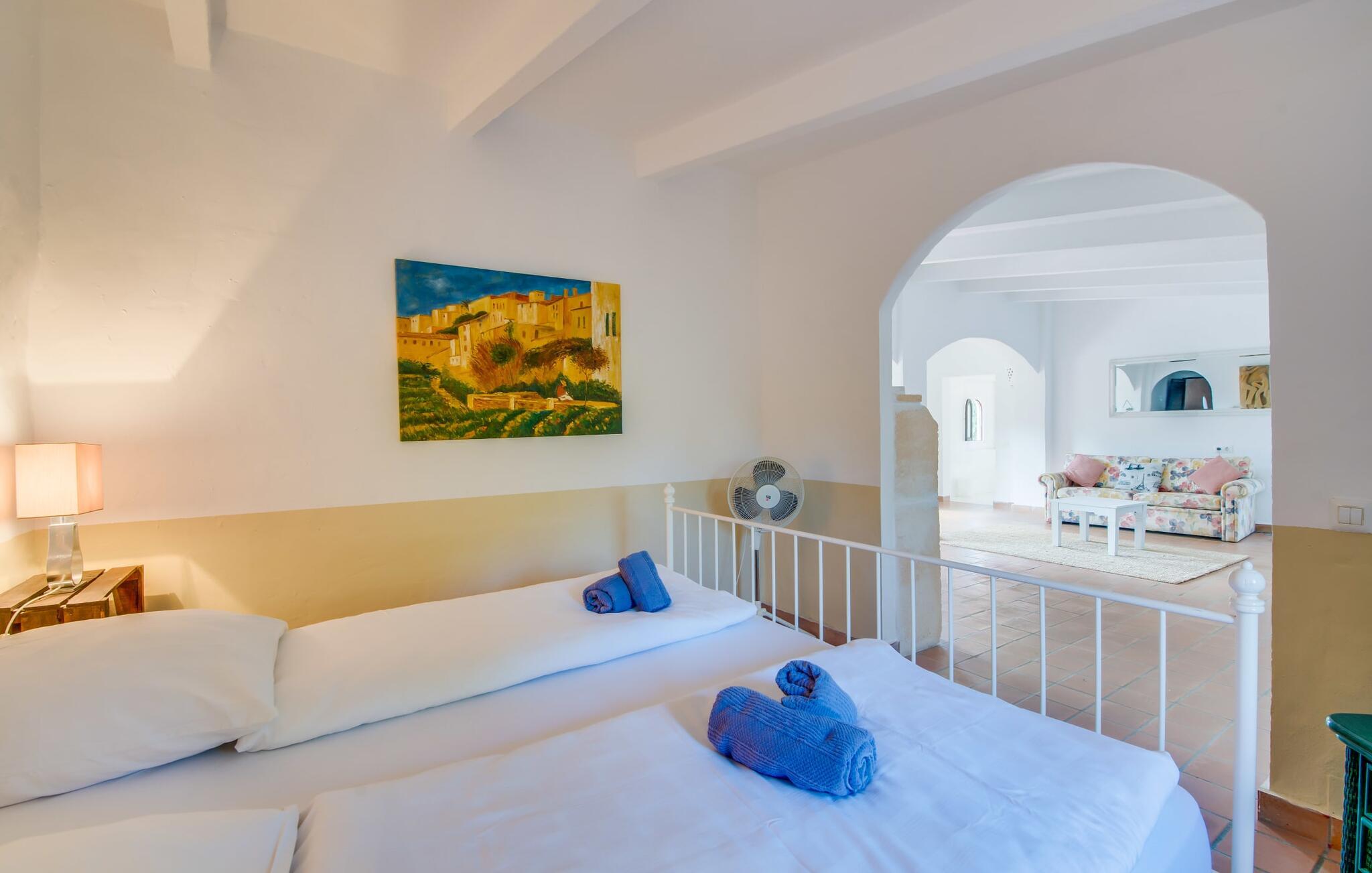 Planlægger I en ferie med en større gruppe? For eksempel flere familier med børn? Og værdsætter I komfort og privatliv? Så er fincaen "Jordi de Cas Concos" på det sydlige Mallorca det perfekte feriehus for jer! Ejendommen er bygget på en kæmpe grund omgivet af smukke middelhavslandskaber. Her har I uendelig plads – og takket være det charmerende design af udearealet er der også rig mulighed for at trække sig tilbage. Haven og de mange forskellige overdækkede og solrige terrassearealer, de smukt anlagte stier og de ugenerte gårdhaver er himmelsk smukke – man ved slet ikke, hvor man skal sætte sig først. Har I lyst til at dyrke motion, svømme i poolen eller spille et spil bordtennis, så mødes måske til en drink i baren eller sæt jer sammen ved langbordet og nyd friskgrillede lækkerier og en salat tilberedt i udekøkkenet. "Jordi d Cas Concos" er ikke en "hyldevare" finca: den er blevet møbleret og designet meget individuelt og originalt med stor sans for detaljer. Lyse farver, nogle gange farvestrålende vægge og billeder i stort format spreder en sommerlig stemning, mens rustikke elementer som træbjælker og groft pudsede lofter understreger den landlige karakter. I stueetagen er der udover indgangspartiet og en stor stue med to sofaer mange andre komfortable siddepladser, herunder forskellige murstensbænke med behagelige hynder. I spisestuen kan I feste sammen ved bordet. I kan tilberede jeres måltider i det smarte, solgule køkken ved siden af. Også her finder I en muret bænk rundt om et smukt glasbord, så I kan spise en skøn morgenmad sammen. I alt tre rummelige dobbeltværelser, hvoraf det ene har en-suite badeværelse, og yderligere to moderne badeværelser fuldender boligkomforten i stueetagen, mens yderligere to soveværelser med en-suite badeværelser venter på jer på øverste etage. I en anden bygning er der bekvemt endnu et dobbeltværelse med eget badeværelse, som er tilgængeligt udefra, så gruppen, der bor her, er helt selvstændig. Til fincaen hører også et gæstehus med to ekstra soveværelser, som kan lejes ud efter anmodning. Landskabet omkring jeres finca er meget grønt, typisk middelhavslandskab og indbyder til lange gåture. For at komme til Cas Concos des Cavaller kører man dog kun 3,9 km i lejebil ad den akustisk mærkbare vej. Her finder I ingen særlige seværdigheder, men den idylliske landsby med sine bakker, der minder om Toscana, er et længselssted for mange tyske Mallorca-elskere, hvoraf nogle har købt eksklusive feriehuse i det behageligt rolige område gennem årene. Det bedste sted at shoppe er i nabobyen Felanitx, som også kun ligger 4,5 km fra jeres hus. Sørg for at prøve de lækre kapers, der dyrkes rundt omkring i byen, og gå ikke glip af de fremragende lokale vine - Felanitx er centrum for øens næststørste vinregion. Til en strandtur er I forkælet med valg mellem de forskellige fortryllende bugter i Cala Gran, Cala d'Or, Cala Sa Nau og Cala Esmeralda, som alle ligger lidt over 11 km væk. Beliggende midt i et smukt landskab, fincaejendommen "Jordi de Cas Concos", som består af flere bygninger, scorer ikke kun med en masse privatliv, men også med en vidunderlig stor grund og en paradisisk have fuld af retreater. . Forskellige overdækkede og solrige terrasseområder inviterer til at blive hængende, poolen byder på velkomstforfriskning og lige ved siden af kan I nyde en kølig drink i baren. Der er godt 11 km i bil til stranden i Cala Gran og kun 4,5 km til byen Felanitx.