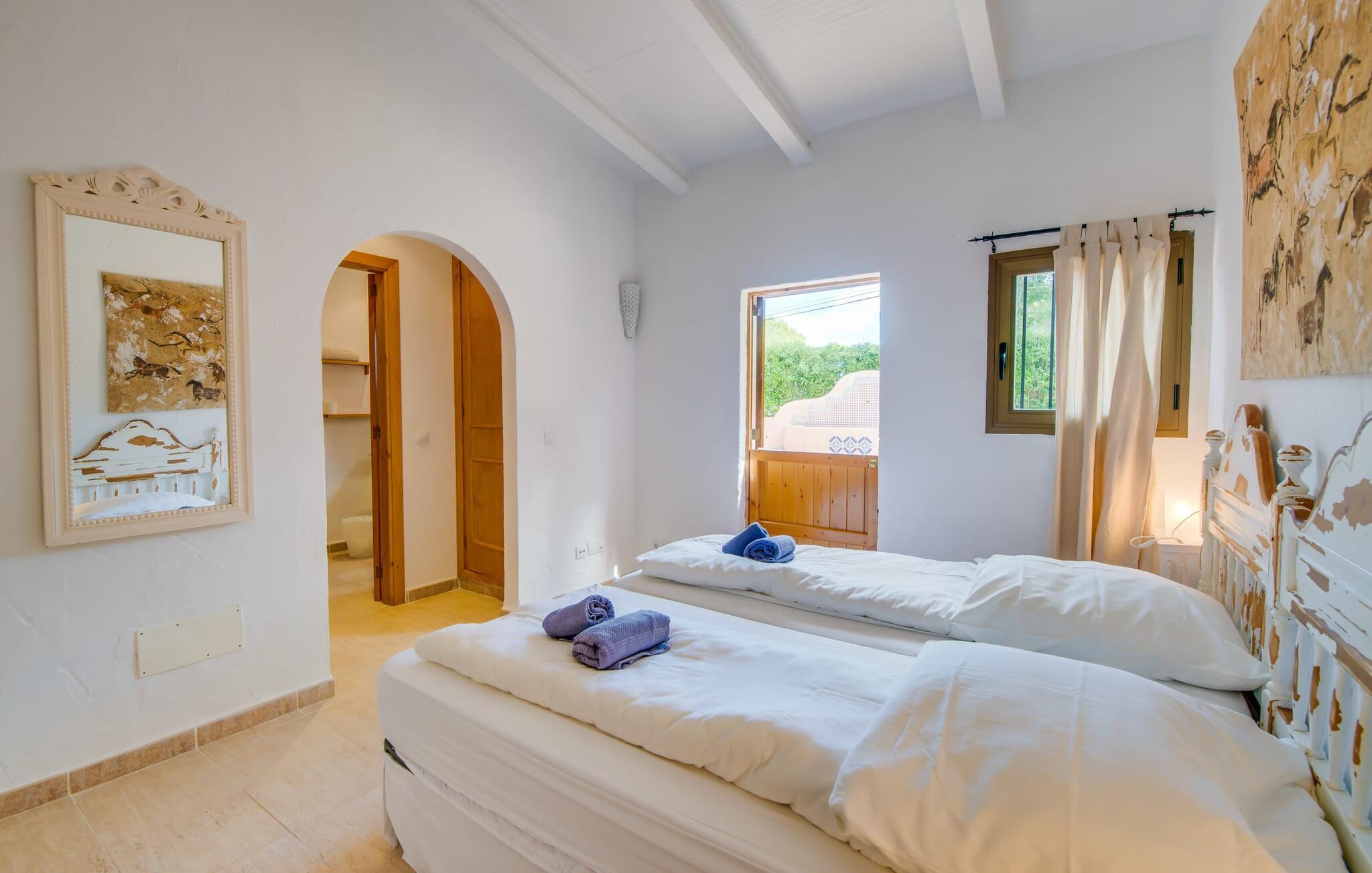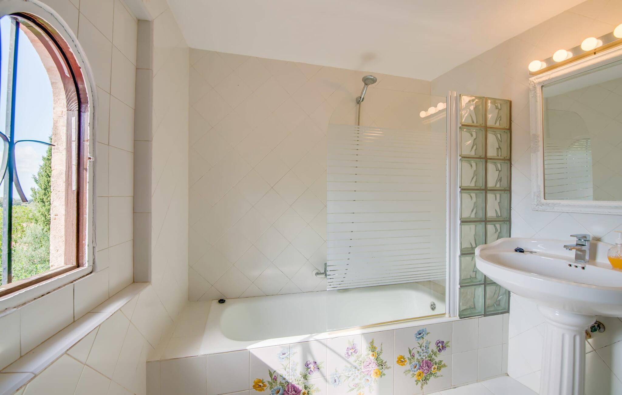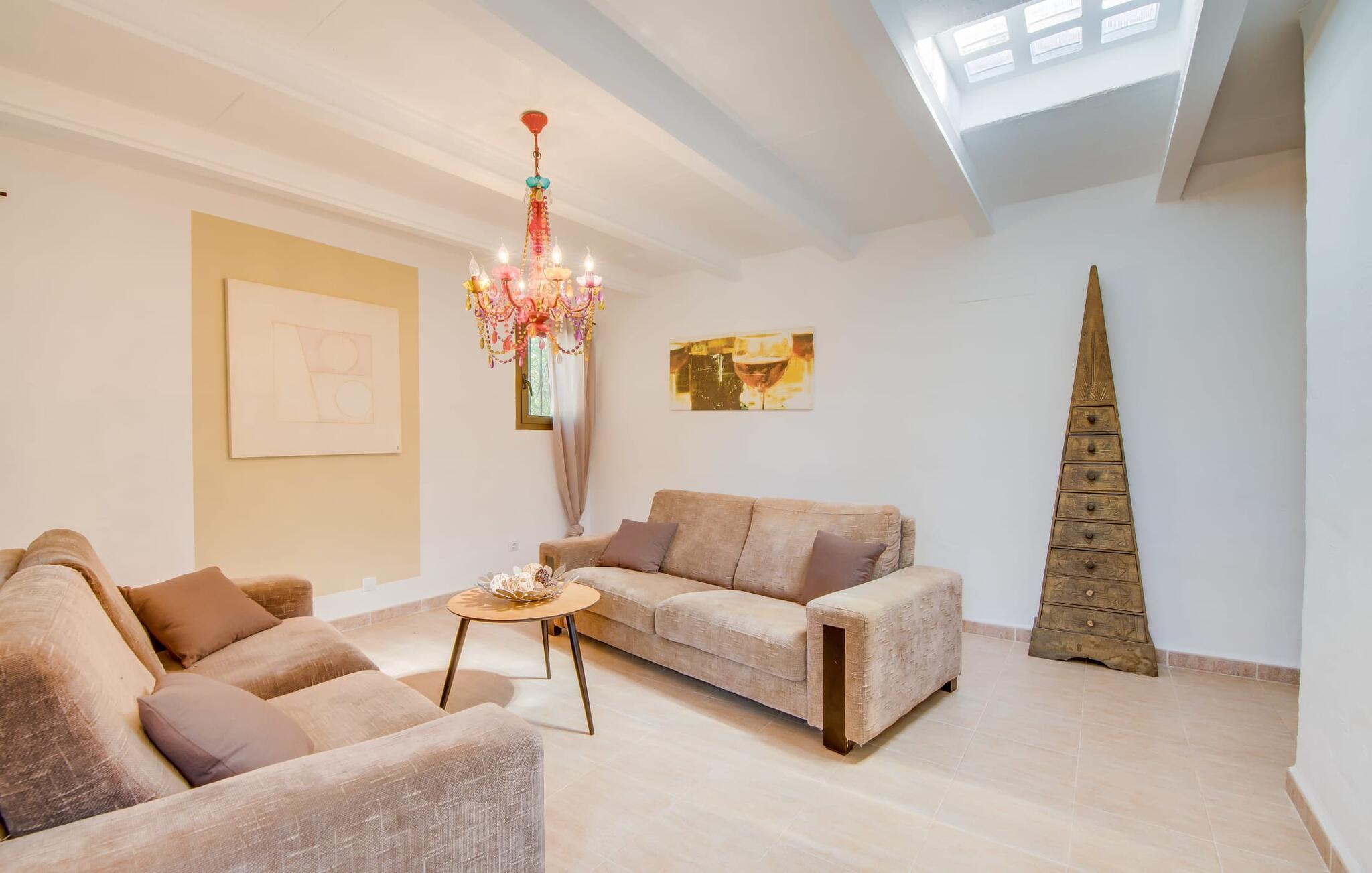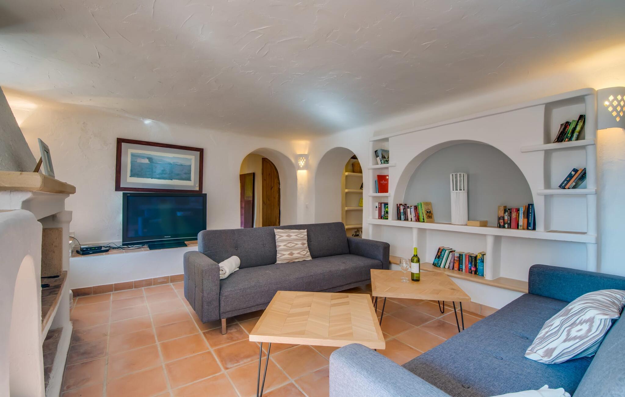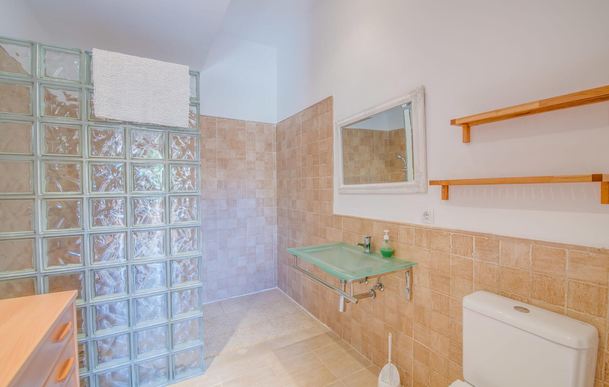 Planlægger I en ferie med en større gruppe? For eksempel flere familier med børn? Og værdsætter I komfort og privatliv? Så er fincaen "Jordi de Cas Concos" på det sydlige Mallorca det perfekte feriehus for jer! Ejendommen er bygget på en kæmpe grund omgivet af smukke middelhavslandskaber. Her har I uendelig plads – og takket være det charmerende design af udearealet er der også rig mulighed for at trække sig tilbage. Haven og de mange forskellige overdækkede og solrige terrassearealer, de smukt anlagte stier og de ugenerte gårdhaver er himmelsk smukke – man ved slet ikke, hvor man skal sætte sig først. Har I lyst til at dyrke motion, svømme i poolen eller spille et spil bordtennis, så mødes måske til en drink i baren eller sæt jer sammen ved langbordet og nyd friskgrillede lækkerier og en salat tilberedt i udekøkkenet. "Jordi d Cas Concos" er ikke en "hyldevare" finca: den er blevet møbleret og designet meget individuelt og originalt med stor sans for detaljer. Lyse farver, nogle gange farvestrålende vægge og billeder i stort format spreder en sommerlig stemning, mens rustikke elementer som træbjælker og groft pudsede lofter understreger den landlige karakter. I stueetagen er der udover indgangspartiet og en stor stue med to sofaer mange andre komfortable siddepladser, herunder forskellige murstensbænke med behagelige hynder. I spisestuen kan I feste sammen ved bordet. I kan tilberede jeres måltider i det smarte, solgule køkken ved siden af. Også her finder I en muret bænk rundt om et smukt glasbord, så I kan spise en skøn morgenmad sammen. I alt tre rummelige dobbeltværelser, hvoraf det ene har en-suite badeværelse, og yderligere to moderne badeværelser fuldender boligkomforten i stueetagen, mens yderligere to soveværelser med en-suite badeværelser venter på jer på øverste etage. I en anden bygning er der bekvemt endnu et dobbeltværelse med eget badeværelse, som er tilgængeligt udefra, så gruppen, der bor her, er helt selvstændig. Til fincaen hører også et gæstehus med to ekstra soveværelser, som kan lejes ud efter anmodning. Landskabet omkring jeres finca er meget grønt, typisk middelhavslandskab og indbyder til lange gåture. For at komme til Cas Concos des Cavaller kører man dog kun 3,9 km i lejebil ad den akustisk mærkbare vej. Her finder I ingen særlige seværdigheder, men den idylliske landsby med sine bakker, der minder om Toscana, er et længselssted for mange tyske Mallorca-elskere, hvoraf nogle har købt eksklusive feriehuse i det behageligt rolige område gennem årene. Det bedste sted at shoppe er i nabobyen Felanitx, som også kun ligger 4,5 km fra jeres hus. Sørg for at prøve de lækre kapers, der dyrkes rundt omkring i byen, og gå ikke glip af de fremragende lokale vine - Felanitx er centrum for øens næststørste vinregion. Til en strandtur er I forkælet med valg mellem de forskellige fortryllende bugter i Cala Gran, Cala d'Or, Cala Sa Nau og Cala Esmeralda, som alle ligger lidt over 11 km væk. Beliggende midt i et smukt landskab, fincaejendommen "Jordi de Cas Concos", som består af flere bygninger, scorer ikke kun med en masse privatliv, men også med en vidunderlig stor grund og en paradisisk have fuld af retreater. . Forskellige overdækkede og solrige terrasseområder inviterer til at blive hængende, poolen byder på velkomstforfriskning og lige ved siden af kan I nyde en kølig drink i baren. Der er godt 11 km i bil til stranden i Cala Gran og kun 4,5 km til byen Felanitx.