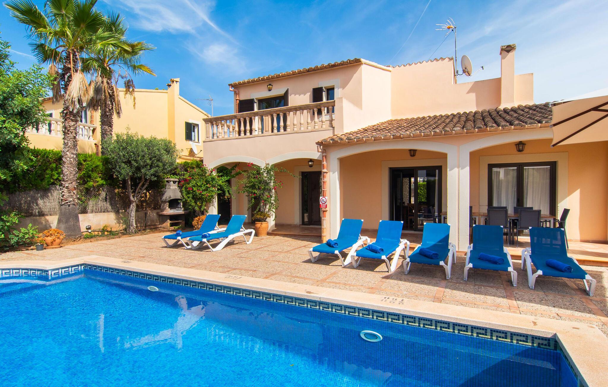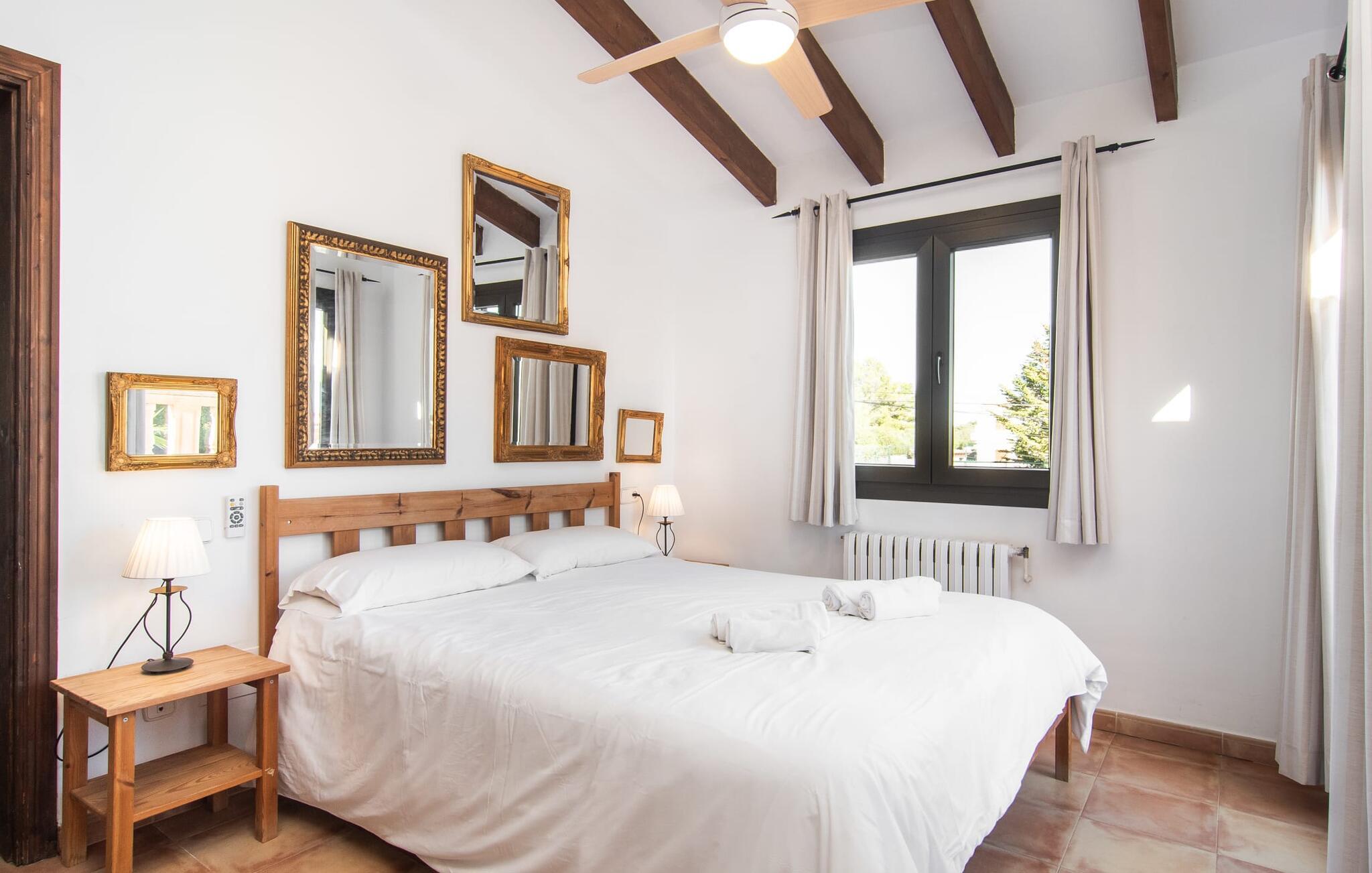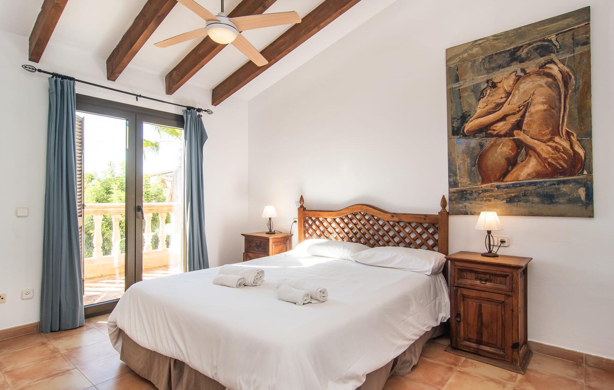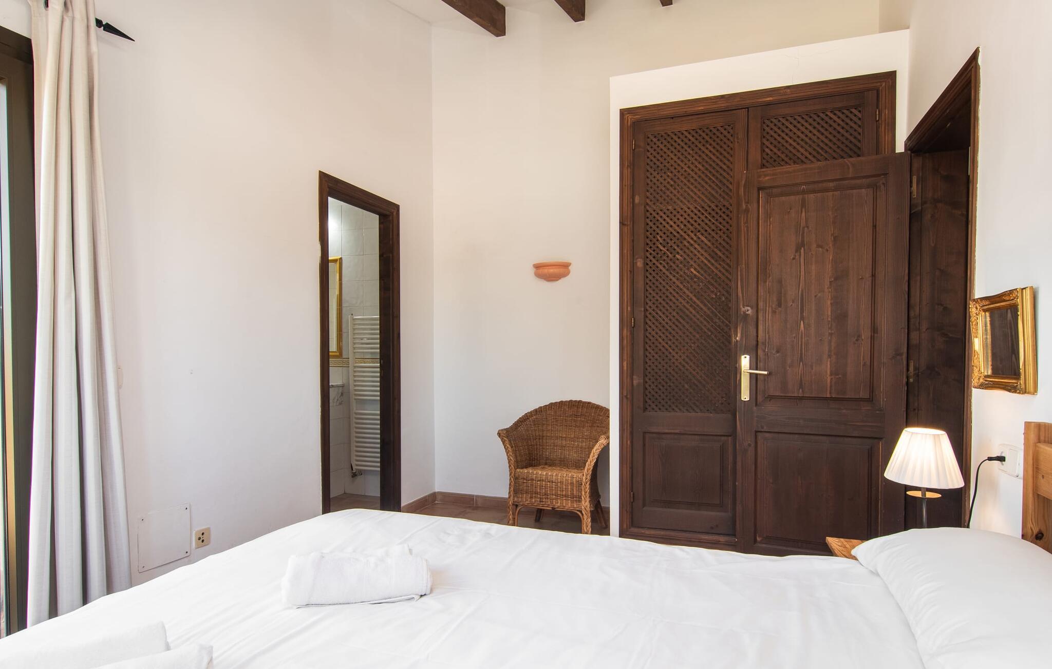 Den velholdte villa “Karen” på det sydlige Mallorca er tilgået via en lille port og omgivet af hække og terrasser. Den smukke, lange naturlige strand Sa Rápita kan nemt nås på cykel. Udenfor er der en dejlig pool med bænk og god plads til liggestole. Nyd hyggelige grillaftener i den store spisestue på den overdækkede terrasse ved huset, som er let tilgængelig fra køkken og stue. Den øverste etage har en balkonterrasse med udsigt over poolen og en østvendt terrasse til smukke solopgange og havudsigt i det fjerne. Er I en større gruppe og har brug for flere soveværelser? Bare spørg os – vi har andre smukke villaer i umiddelbar nærhed! De hyggelige og komfortabelt indrettede værelser er fordelt på to etager. Den lyse stue og spisestue er åben til det moderne og fuldt udstyrede køkken. Fra både stue og køkken er der direkte udgang til terrassen gennem glasdøre. Villaen har i alt fire dobbeltværelser. To af dem har eget badeværelse. De andre soveværelser deler endnu et badeværelse. Selv i de køligere måneder byder villaen på et behageligt indeklima takket være radiatorer. I øvrigt: I kan nemt leje cykler til ture til stranden på stedet under jeres ferie. Villaen ligger i den velholdte kystby Sa Rápita på det sydlige Mallorca. Den lange sandstrand Sa Rápita kan nås på 6 minutter i bil eller 8 minutter på cykel, og Es Trenc ligger 10 km derfra. Kystlandsbyen har små supermarkeder og restauranter. Der er yderligere indkøbsmuligheder i Campos, 13 km væk.