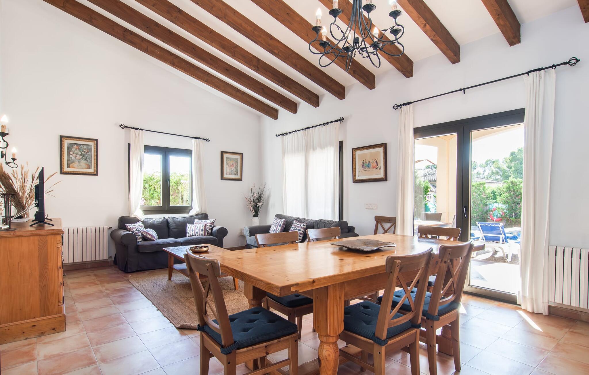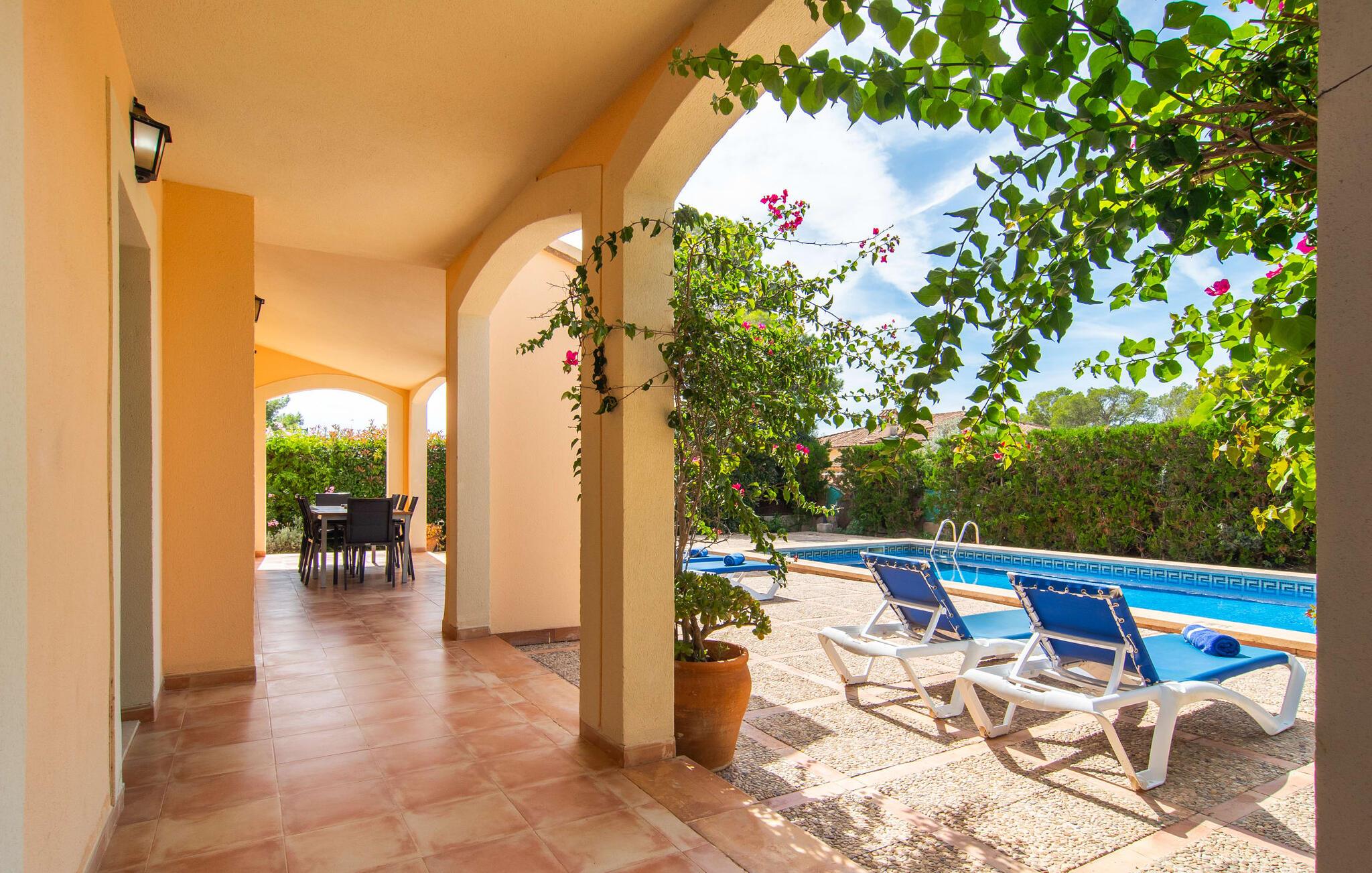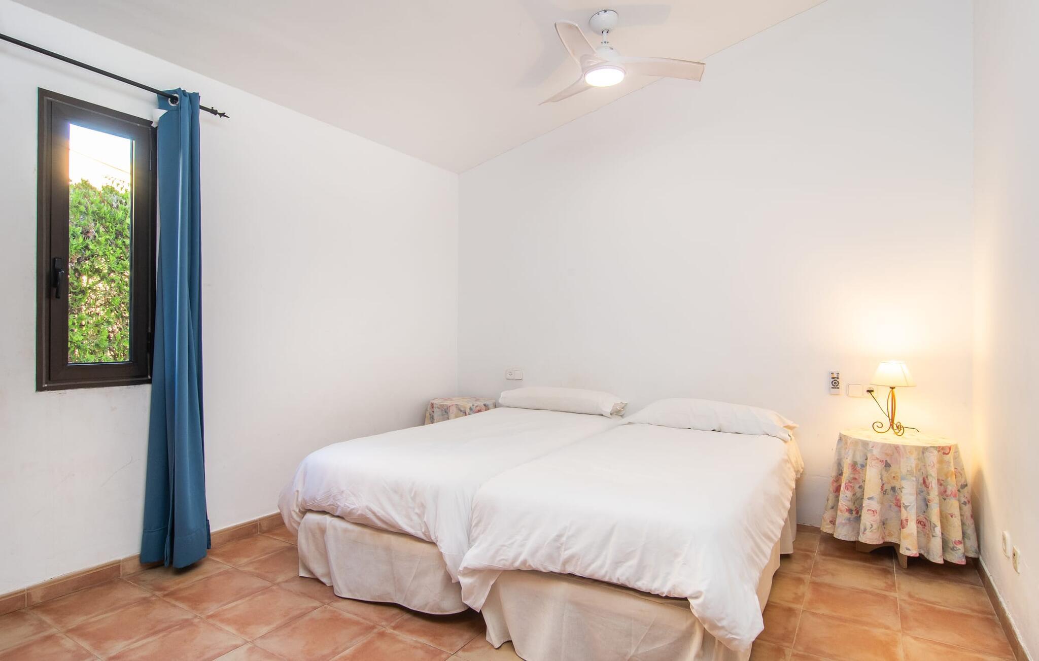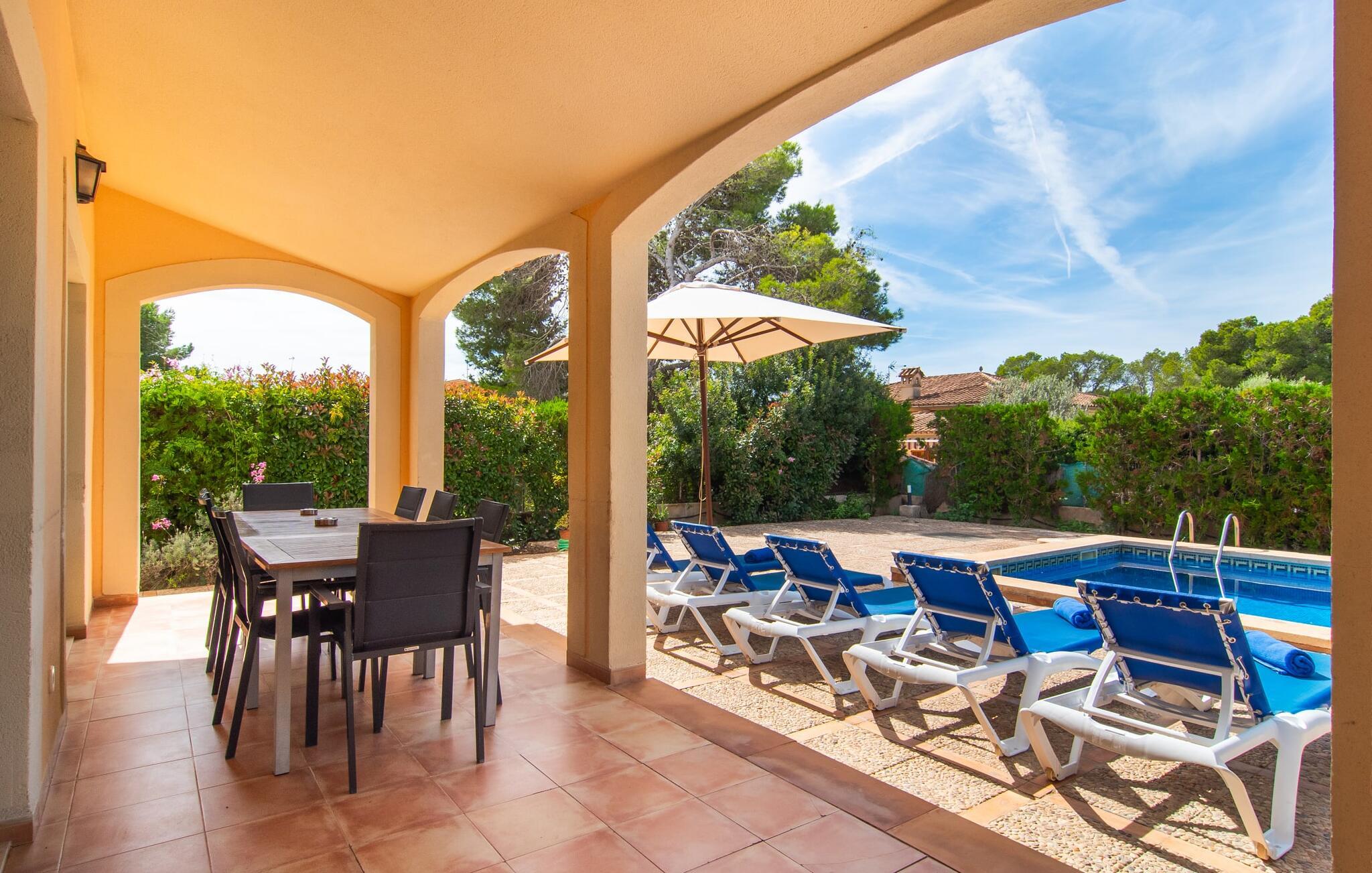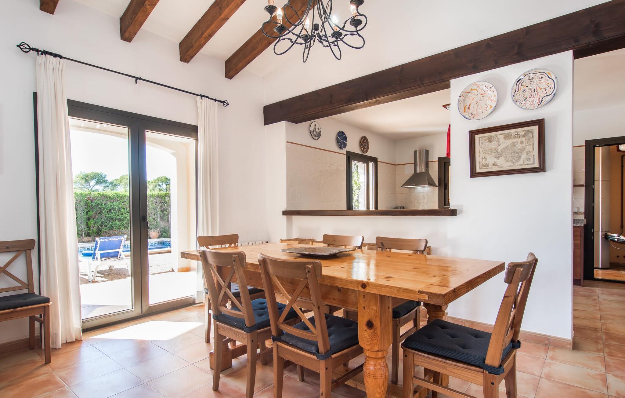 Den velholdte villa “Karen” på det sydlige Mallorca er tilgået via en lille port og omgivet af hække og terrasser. Den smukke, lange naturlige strand Sa Rápita kan nemt nås på cykel. Udenfor er der en dejlig pool med bænk og god plads til liggestole. Nyd hyggelige grillaftener i den store spisestue på den overdækkede terrasse ved huset, som er let tilgængelig fra køkken og stue. Den øverste etage har en balkonterrasse med udsigt over poolen og en østvendt terrasse til smukke solopgange og havudsigt i det fjerne. Er I en større gruppe og har brug for flere soveværelser? Bare spørg os – vi har andre smukke villaer i umiddelbar nærhed! De hyggelige og komfortabelt indrettede værelser er fordelt på to etager. Den lyse stue og spisestue er åben til det moderne og fuldt udstyrede køkken. Fra både stue og køkken er der direkte udgang til terrassen gennem glasdøre. Villaen har i alt fire dobbeltværelser. To af dem har eget badeværelse. De andre soveværelser deler endnu et badeværelse. Selv i de køligere måneder byder villaen på et behageligt indeklima takket være radiatorer. I øvrigt: I kan nemt leje cykler til ture til stranden på stedet under jeres ferie. Villaen ligger i den velholdte kystby Sa Rápita på det sydlige Mallorca. Den lange sandstrand Sa Rápita kan nås på 6 minutter i bil eller 8 minutter på cykel, og Es Trenc ligger 10 km derfra. Kystlandsbyen har små supermarkeder og restauranter. Der er yderligere indkøbsmuligheder i Campos, 13 km væk.