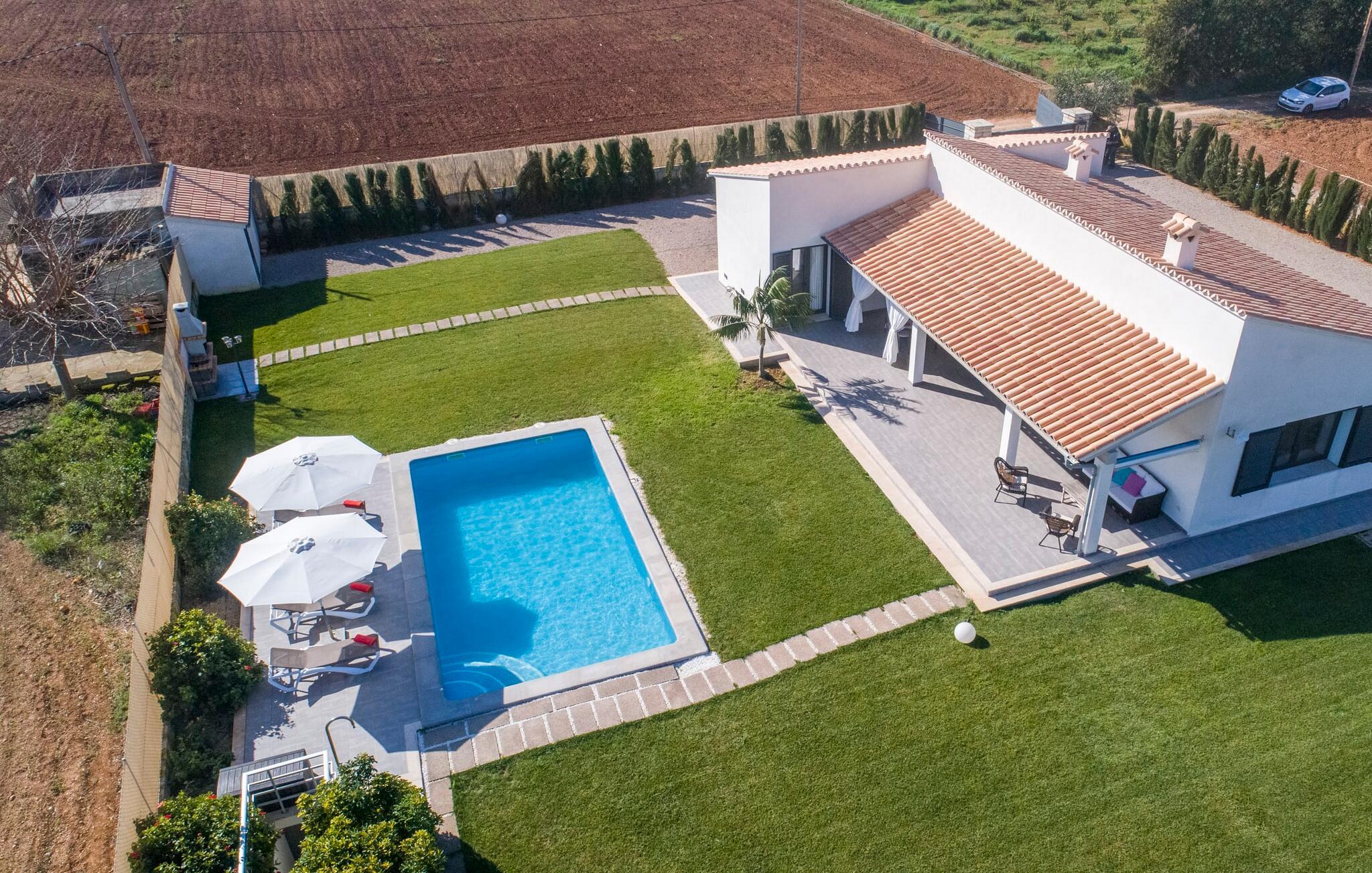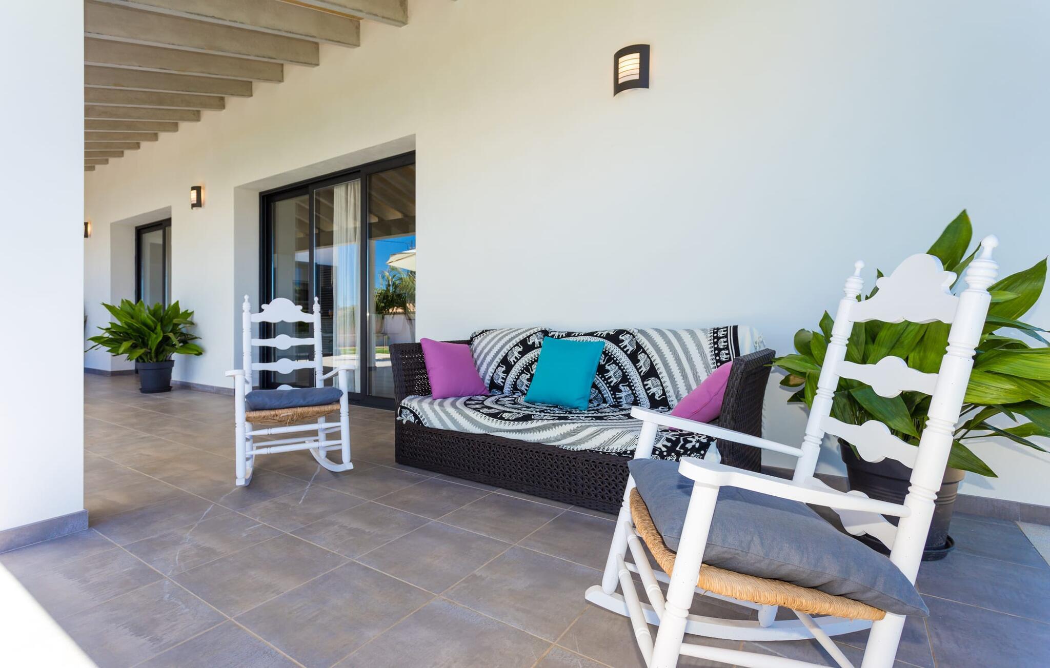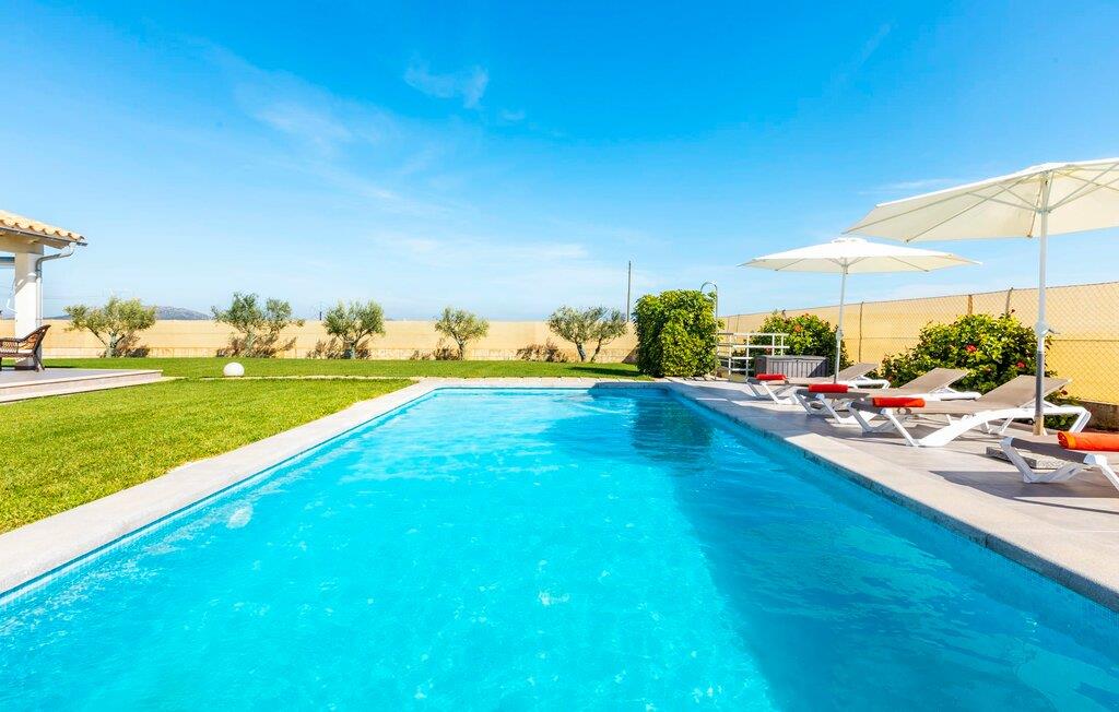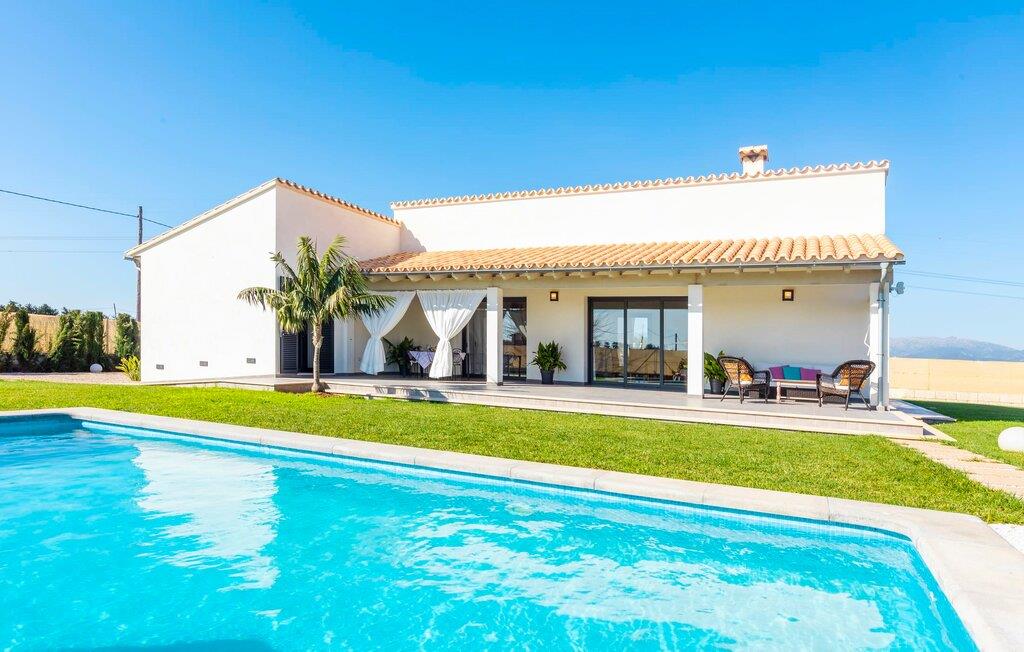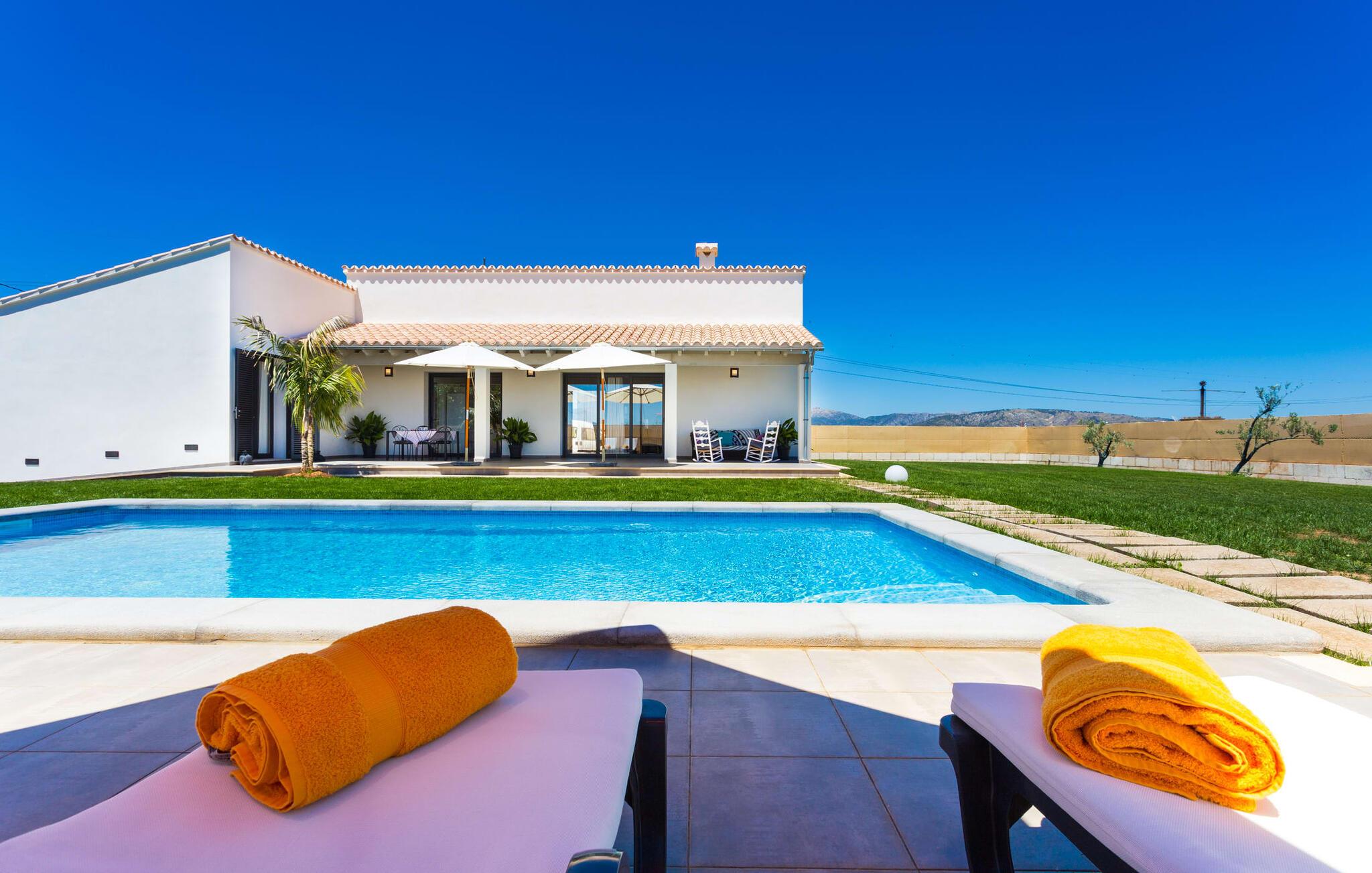 Villaen er det rigtige valg for gæster, der søger et moderne og velholdt miljø. Villaen er nybygget i 2016 og byder på masser af plads på en 1.500 m² stor grund, hvilket gør det muligt at opleve en dejlig afslappet tid sammen. Dette feriehus er tilgængeligt via godt sikrede veje. Udlejningsbiler kan parkeres sikkert på den skyggefulde parkeringsplads på det helt indhegnede udendørsareal. Området omkring poolen er dækket af smukke græsplæner og terrasseområder, der er perfekte til afslapning. I kan forfriske jer selv i den elegante pool med nemme adgangstrin og glemme hverdagens stress, mens I svømmer på de 9 m lange baner. Vandet skinner smukt blåt og skaber et strålende glimt lige så klart som den mallorcanske himmel. Efter svømning er det meget fristende at slappe af på en af de komfortable liggestole og lade middelhavssolen forkæle jer. For at fordybe jer i en god feriebog, kan I gøre jer godt tilpas under en parasol eller finde et tilflugtssted i den behagelige skygge på den halvåbne terrasse. En af gyngestolene er til rådighed, så I kan fordybe jer i en bog, og I kan endda bruge en afslappende sofa til en lille siesta. En smuk spiseplads på den store terrasse inviterer jer til at nyde omfattende grillaftener. Middelhavsdelikatesser kan frisklaves på murstensgrillen, som grillmestrene helt sikkert vil have det rigtig sjovt med. I kan også nyde et godt glas vin til langt ud på aftenen og sidde sammen i en festlig atmosfære med behagelig belysning og hygge. Interiøret i den smukke, hvidpudsede villa er vidunderligt lyst, da der strømmer masser af lys ind i stueetagens rum gennem de overdimensionerede glasskydedøre på terrassen. Der er en elegant, rummelig opholdsstue, som også byder på en smuk indendørs spiseplads til at nyde måltiderne sammen samt et integreret, meget moderne køkken. Hele indretningen er fuldstændig moderne og emmer samtidig af hygge, så I kan slappe af og slappe af i den stilfulde stemning i denne villa. I det åbne køkken af høj kvalitet finder I alt, hvad I behøver for et vellykket selvforplejningsophold. Dens gode layout inviterer alle til at lave noget sammen. Den udvidede arbejdsflade, som også kan bruges som morgenmadsbar, er meget praktisk til at vågne op med jeres første morgenkaffe på en af de komfortable barstole og prøve lidt fra bageren. Hvis I leder efter noget underholdning, så gør jer godt tilpas i den hyggelige sofa i opholdsstuen og se jeres foretrukne britiske tv-program eller en spændende dvd på det store fladskærms-tv. På de 125 m² af villaen "Kortons d'Spiga" vil I helt sikkert opleve afslapning på højt niveau. De romantiske soveværelser scorer også point med deres helt nye, harmonisk indrettede møbler. Lyse farver og diskret dekoration skaber en atmosfære af orden her. Villaen byder desuden på to æstetiske badeværelser med rummeligt brusekabine og separat gæstetoilet. På de nærliggende strande kan I fejre dejlige dage med svømning, mens I nyder solen og havet. Den livlige bystrand Can Picafort ligger for eksempel kun 8 minutter væk i bil. I den tidligere fiskerby er den smukke promenade også ideel til at slentre eller besøge restauranter eller barer. Villaen ligger tæt på den tydeligt hørbare landevej, der forbinder byen Muro med kysten, så I kan opdage de smukke strande i nord på kort tid. Den stille, rolige by Sa Pobla er særlig livlig søndag morgen, når det ugentlige marked finder sted. Her kan I købe masser af friske lokale produkter og opleve den typiske mallorcanske atmosfære. Sa Pobla er også kendt som "Mallorcas grøntsagskurv", fordi dens frugtbare jord producerer så mange landbrugsprodukter. Den moderne, venlige nye bygning er beliggende i landlige omgivelser på privat ejendom og kun få minutters kørsel fra den store bugt Alcúdia med dens mange smukke sandstrande. Muro og den nærliggende landsby Sa Pobla ligger kun 4 km væk. Her kan I shoppe eller besøge en restaurant. Derudover er beliggenheden ideel til at udforske den nordlige kystdel af øen og finde jeres yndlingsstrand.