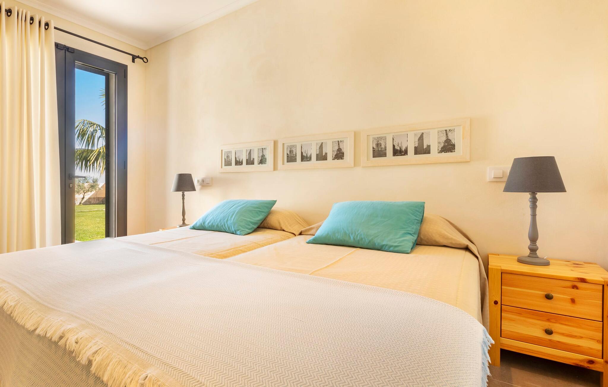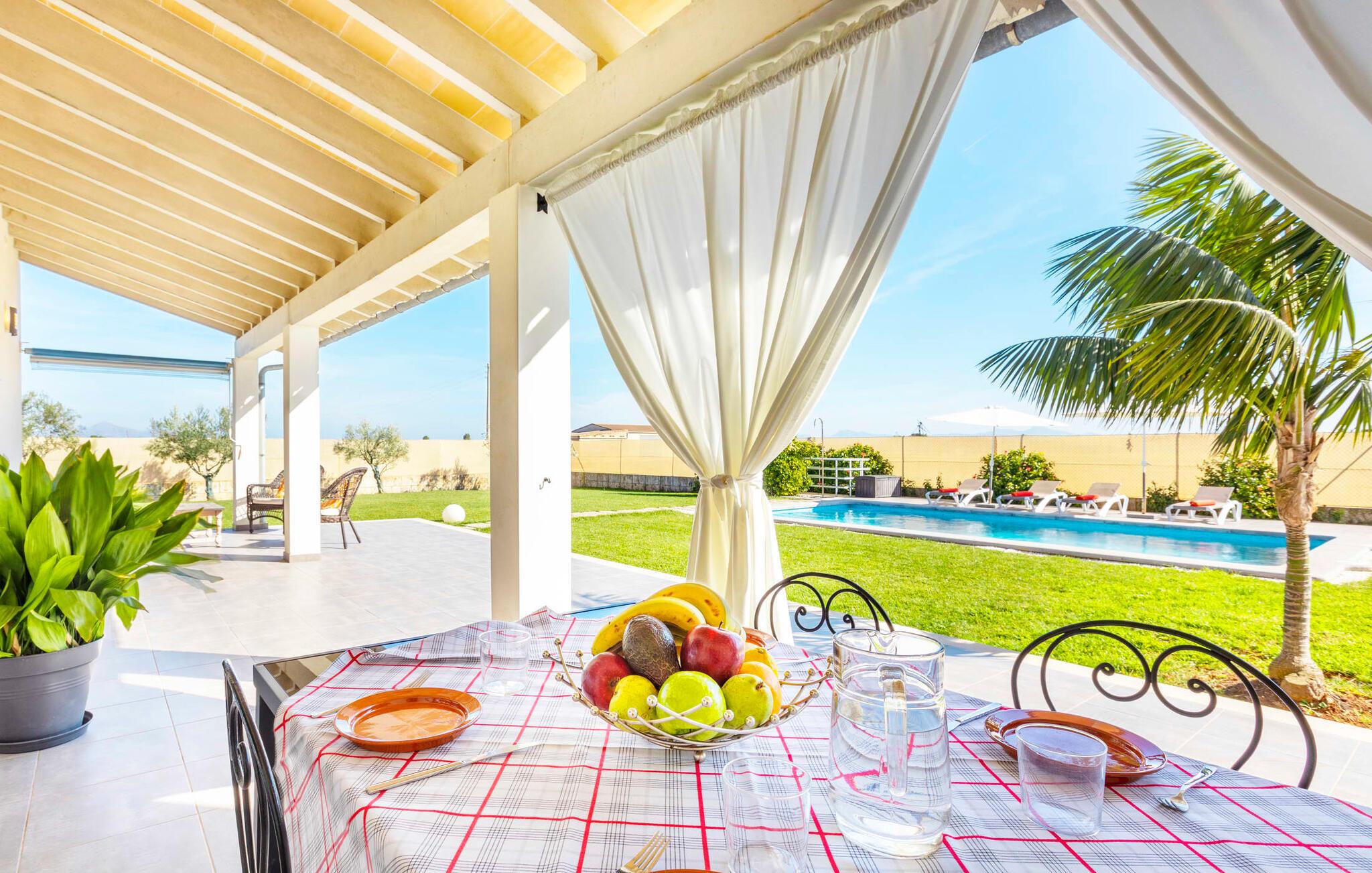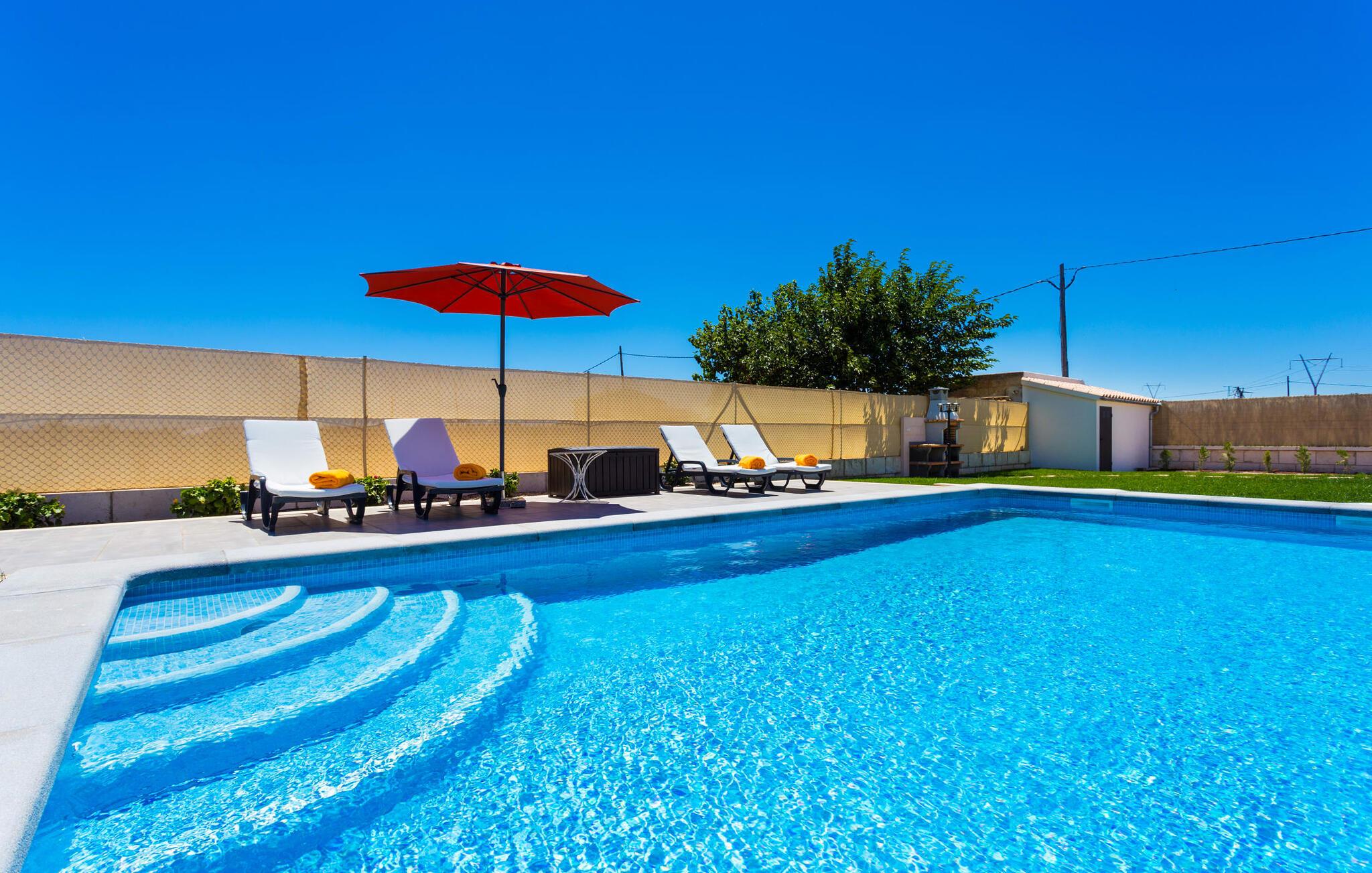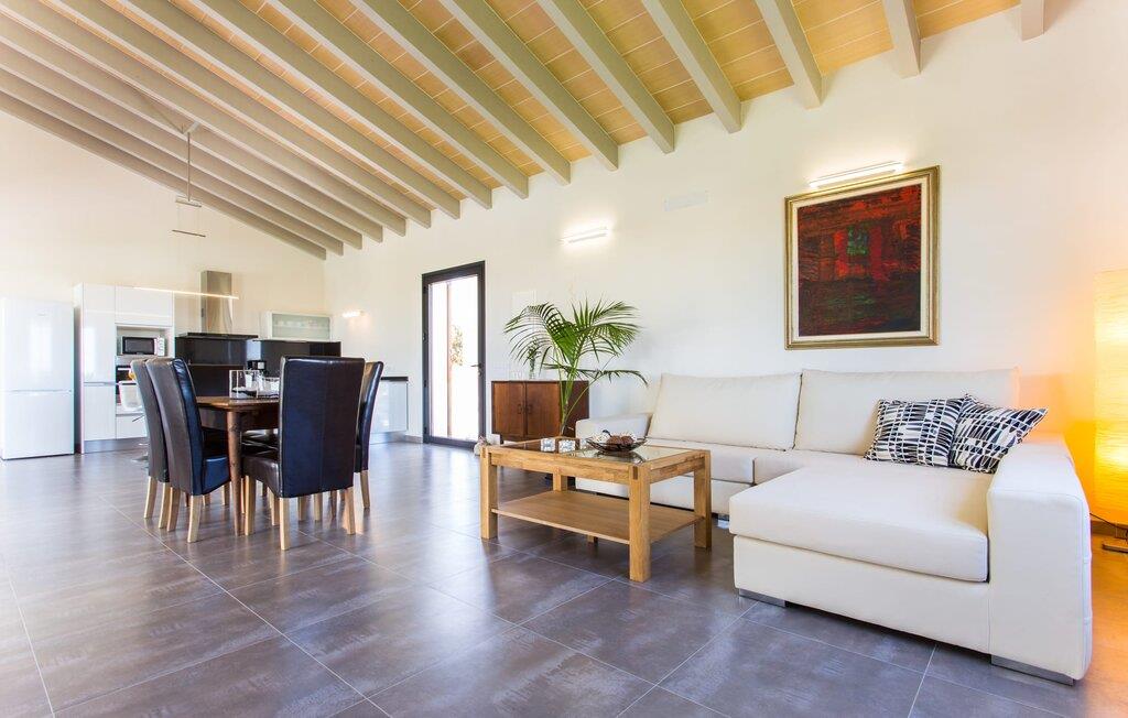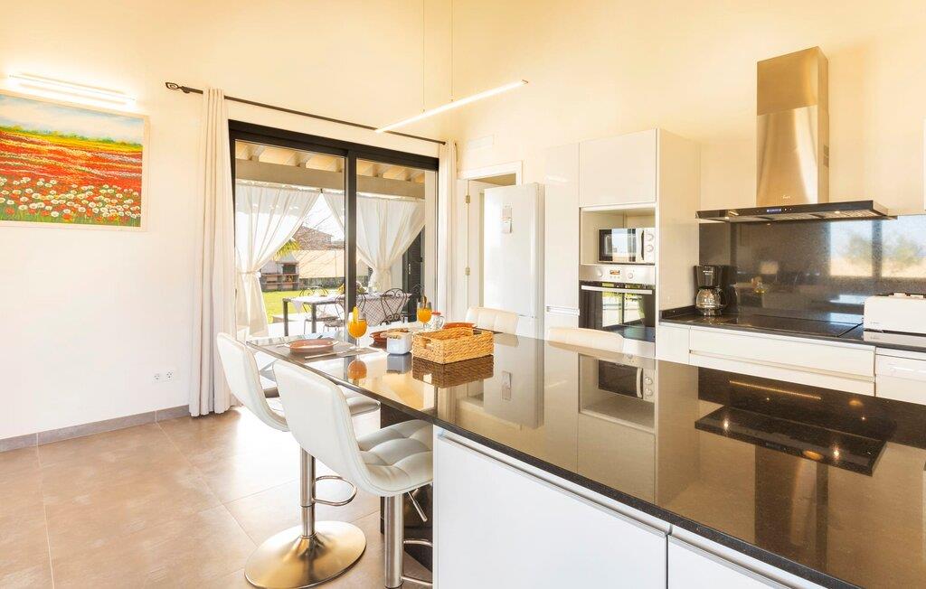 Villaen er det rigtige valg for gæster, der søger et moderne og velholdt miljø. Villaen er nybygget i 2016 og byder på masser af plads på en 1.500 m² stor grund, hvilket gør det muligt at opleve en dejlig afslappet tid sammen. Dette feriehus er tilgængeligt via godt sikrede veje. Udlejningsbiler kan parkeres sikkert på den skyggefulde parkeringsplads på det helt indhegnede udendørsareal. Området omkring poolen er dækket af smukke græsplæner og terrasseområder, der er perfekte til afslapning. I kan forfriske jer selv i den elegante pool med nemme adgangstrin og glemme hverdagens stress, mens I svømmer på de 9 m lange baner. Vandet skinner smukt blåt og skaber et strålende glimt lige så klart som den mallorcanske himmel. Efter svømning er det meget fristende at slappe af på en af de komfortable liggestole og lade middelhavssolen forkæle jer. For at fordybe jer i en god feriebog, kan I gøre jer godt tilpas under en parasol eller finde et tilflugtssted i den behagelige skygge på den halvåbne terrasse. En af gyngestolene er til rådighed, så I kan fordybe jer i en bog, og I kan endda bruge en afslappende sofa til en lille siesta. En smuk spiseplads på den store terrasse inviterer jer til at nyde omfattende grillaftener. Middelhavsdelikatesser kan frisklaves på murstensgrillen, som grillmestrene helt sikkert vil have det rigtig sjovt med. I kan også nyde et godt glas vin til langt ud på aftenen og sidde sammen i en festlig atmosfære med behagelig belysning og hygge. Interiøret i den smukke, hvidpudsede villa er vidunderligt lyst, da der strømmer masser af lys ind i stueetagens rum gennem de overdimensionerede glasskydedøre på terrassen. Der er en elegant, rummelig opholdsstue, som også byder på en smuk indendørs spiseplads til at nyde måltiderne sammen samt et integreret, meget moderne køkken. Hele indretningen er fuldstændig moderne og emmer samtidig af hygge, så I kan slappe af og slappe af i den stilfulde stemning i denne villa. I det åbne køkken af høj kvalitet finder I alt, hvad I behøver for et vellykket selvforplejningsophold. Dens gode layout inviterer alle til at lave noget sammen. Den udvidede arbejdsflade, som også kan bruges som morgenmadsbar, er meget praktisk til at vågne op med jeres første morgenkaffe på en af de komfortable barstole og prøve lidt fra bageren. Hvis I leder efter noget underholdning, så gør jer godt tilpas i den hyggelige sofa i opholdsstuen og se jeres foretrukne britiske tv-program eller en spændende dvd på det store fladskærms-tv. På de 125 m² af villaen "Kortons d'Spiga" vil I helt sikkert opleve afslapning på højt niveau. De romantiske soveværelser scorer også point med deres helt nye, harmonisk indrettede møbler. Lyse farver og diskret dekoration skaber en atmosfære af orden her. Villaen byder desuden på to æstetiske badeværelser med rummeligt brusekabine og separat gæstetoilet. På de nærliggende strande kan I fejre dejlige dage med svømning, mens I nyder solen og havet. Den livlige bystrand Can Picafort ligger for eksempel kun 8 minutter væk i bil. I den tidligere fiskerby er den smukke promenade også ideel til at slentre eller besøge restauranter eller barer. Villaen ligger tæt på den tydeligt hørbare landevej, der forbinder byen Muro med kysten, så I kan opdage de smukke strande i nord på kort tid. Den stille, rolige by Sa Pobla er særlig livlig søndag morgen, når det ugentlige marked finder sted. Her kan I købe masser af friske lokale produkter og opleve den typiske mallorcanske atmosfære. Sa Pobla er også kendt som "Mallorcas grøntsagskurv", fordi dens frugtbare jord producerer så mange landbrugsprodukter. Den moderne, venlige nye bygning er beliggende i landlige omgivelser på privat ejendom og kun få minutters kørsel fra den store bugt Alcúdia med dens mange smukke sandstrande. Muro og den nærliggende landsby Sa Pobla ligger kun 4 km væk. Her kan I shoppe eller besøge en restaurant. Derudover er beliggenheden ideel til at udforske den nordlige kystdel af øen og finde jeres yndlingsstrand.