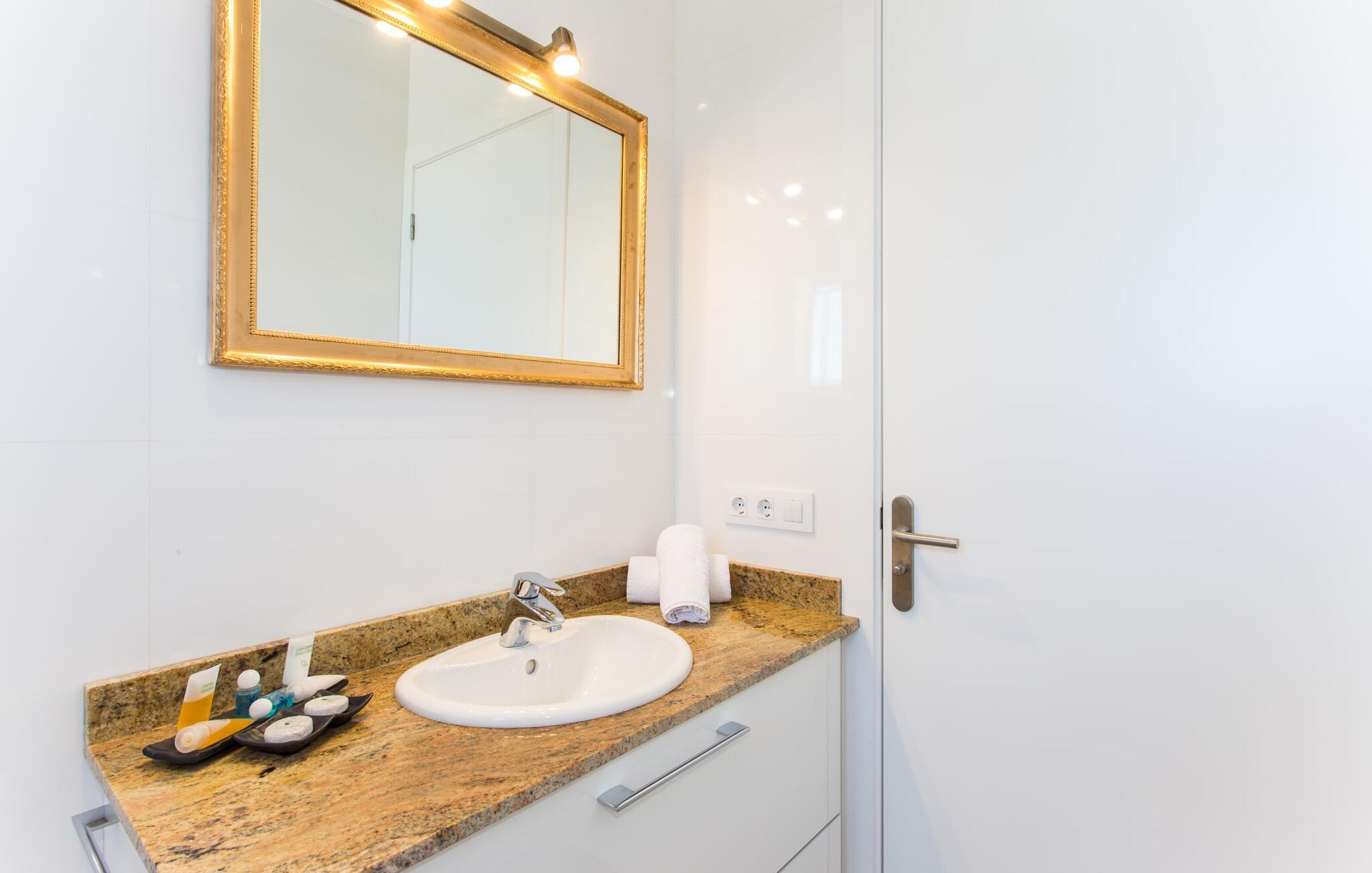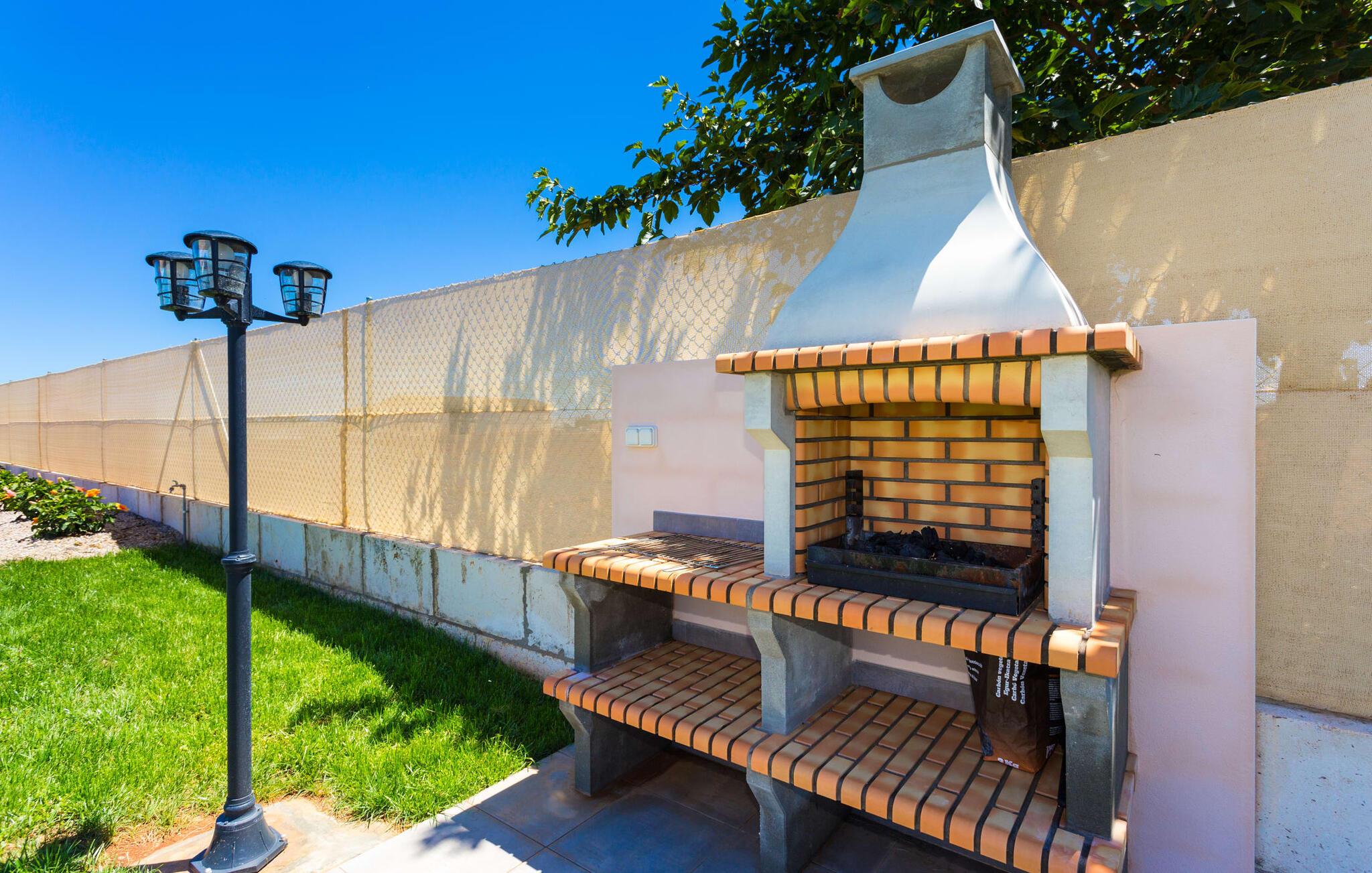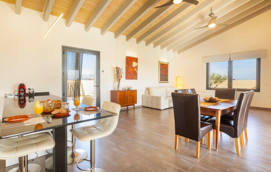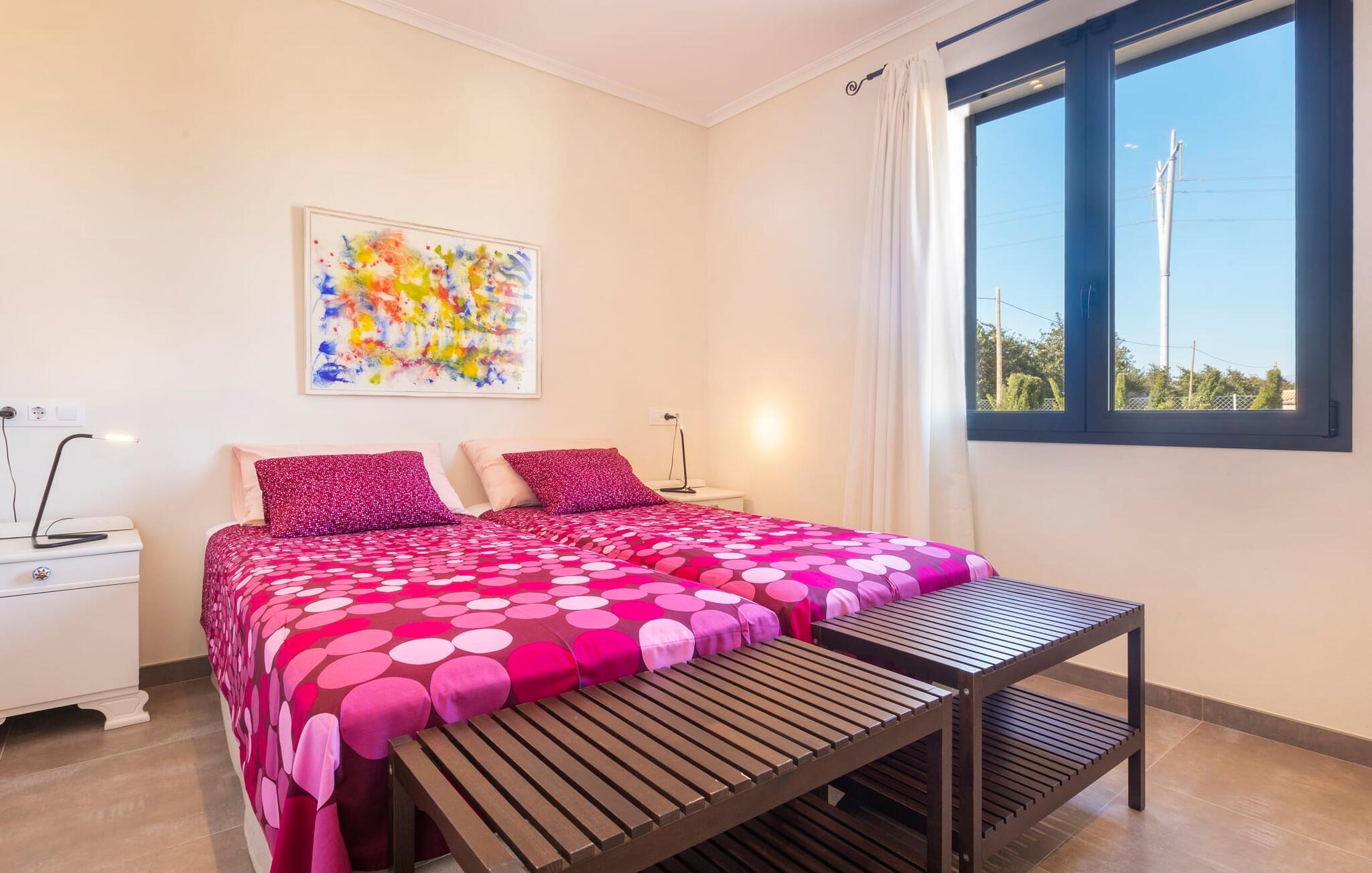 Villaen er det rigtige valg for gæster, der søger et moderne og velholdt miljø. Villaen er nybygget i 2016 og byder på masser af plads på en 1.500 m² stor grund, hvilket gør det muligt at opleve en dejlig afslappet tid sammen. Dette feriehus er tilgængeligt via godt sikrede veje. Udlejningsbiler kan parkeres sikkert på den skyggefulde parkeringsplads på det helt indhegnede udendørsareal. Området omkring poolen er dækket af smukke græsplæner og terrasseområder, der er perfekte til afslapning. I kan forfriske jer selv i den elegante pool med nemme adgangstrin og glemme hverdagens stress, mens I svømmer på de 9 m lange baner. Vandet skinner smukt blåt og skaber et strålende glimt lige så klart som den mallorcanske himmel. Efter svømning er det meget fristende at slappe af på en af de komfortable liggestole og lade middelhavssolen forkæle jer. For at fordybe jer i en god feriebog, kan I gøre jer godt tilpas under en parasol eller finde et tilflugtssted i den behagelige skygge på den halvåbne terrasse. En af gyngestolene er til rådighed, så I kan fordybe jer i en bog, og I kan endda bruge en afslappende sofa til en lille siesta. En smuk spiseplads på den store terrasse inviterer jer til at nyde omfattende grillaftener. Middelhavsdelikatesser kan frisklaves på murstensgrillen, som grillmestrene helt sikkert vil have det rigtig sjovt med. I kan også nyde et godt glas vin til langt ud på aftenen og sidde sammen i en festlig atmosfære med behagelig belysning og hygge. Interiøret i den smukke, hvidpudsede villa er vidunderligt lyst, da der strømmer masser af lys ind i stueetagens rum gennem de overdimensionerede glasskydedøre på terrassen. Der er en elegant, rummelig opholdsstue, som også byder på en smuk indendørs spiseplads til at nyde måltiderne sammen samt et integreret, meget moderne køkken. Hele indretningen er fuldstændig moderne og emmer samtidig af hygge, så I kan slappe af og slappe af i den stilfulde stemning i denne villa. I det åbne køkken af høj kvalitet finder I alt, hvad I behøver for et vellykket selvforplejningsophold. Dens gode layout inviterer alle til at lave noget sammen. Den udvidede arbejdsflade, som også kan bruges som morgenmadsbar, er meget praktisk til at vågne op med jeres første morgenkaffe på en af de komfortable barstole og prøve lidt fra bageren. Hvis I leder efter noget underholdning, så gør jer godt tilpas i den hyggelige sofa i opholdsstuen og se jeres foretrukne britiske tv-program eller en spændende dvd på det store fladskærms-tv. På de 125 m² af villaen "Kortons d'Spiga" vil I helt sikkert opleve afslapning på højt niveau. De romantiske soveværelser scorer også point med deres helt nye, harmonisk indrettede møbler. Lyse farver og diskret dekoration skaber en atmosfære af orden her. Villaen byder desuden på to æstetiske badeværelser med rummeligt brusekabine og separat gæstetoilet. På de nærliggende strande kan I fejre dejlige dage med svømning, mens I nyder solen og havet. Den livlige bystrand Can Picafort ligger for eksempel kun 8 minutter væk i bil. I den tidligere fiskerby er den smukke promenade også ideel til at slentre eller besøge restauranter eller barer. Villaen ligger tæt på den tydeligt hørbare landevej, der forbinder byen Muro med kysten, så I kan opdage de smukke strande i nord på kort tid. Den stille, rolige by Sa Pobla er særlig livlig søndag morgen, når det ugentlige marked finder sted. Her kan I købe masser af friske lokale produkter og opleve den typiske mallorcanske atmosfære. Sa Pobla er også kendt som "Mallorcas grøntsagskurv", fordi dens frugtbare jord producerer så mange landbrugsprodukter. Den moderne, venlige nye bygning er beliggende i landlige omgivelser på privat ejendom og kun få minutters kørsel fra den store bugt Alcúdia med dens mange smukke sandstrande. Muro og den nærliggende landsby Sa Pobla ligger kun 4 km væk. Her kan I shoppe eller besøge en restaurant. Derudover er beliggenheden ideel til at udforske den nordlige kystdel af øen og finde jeres yndlingsstrand.