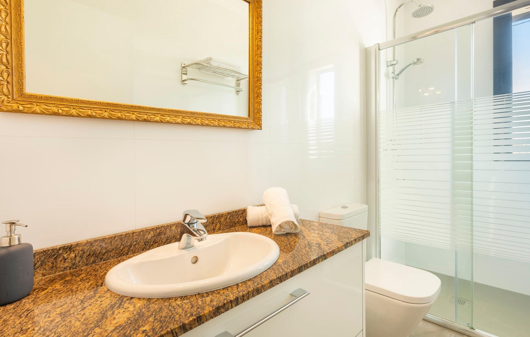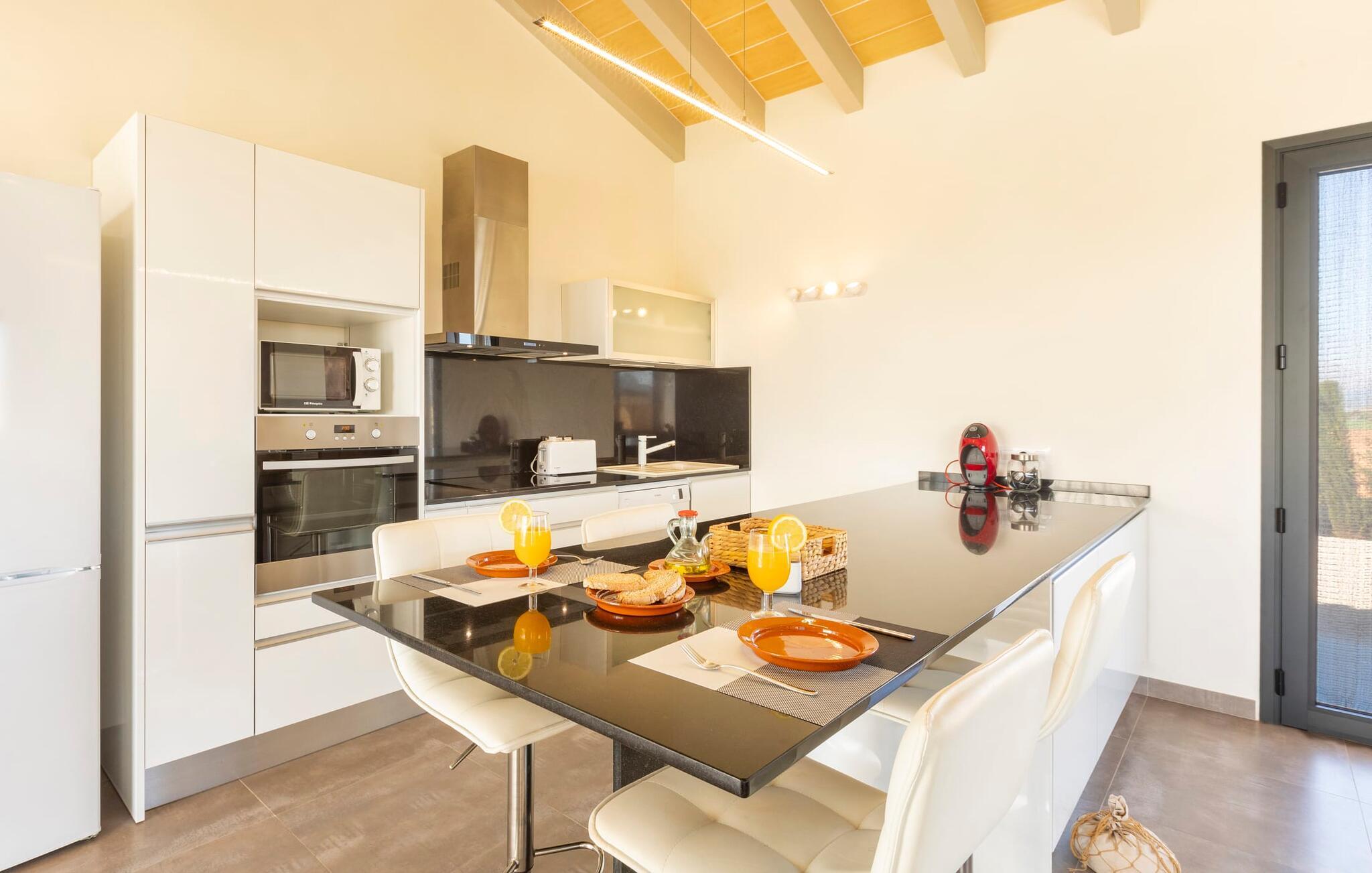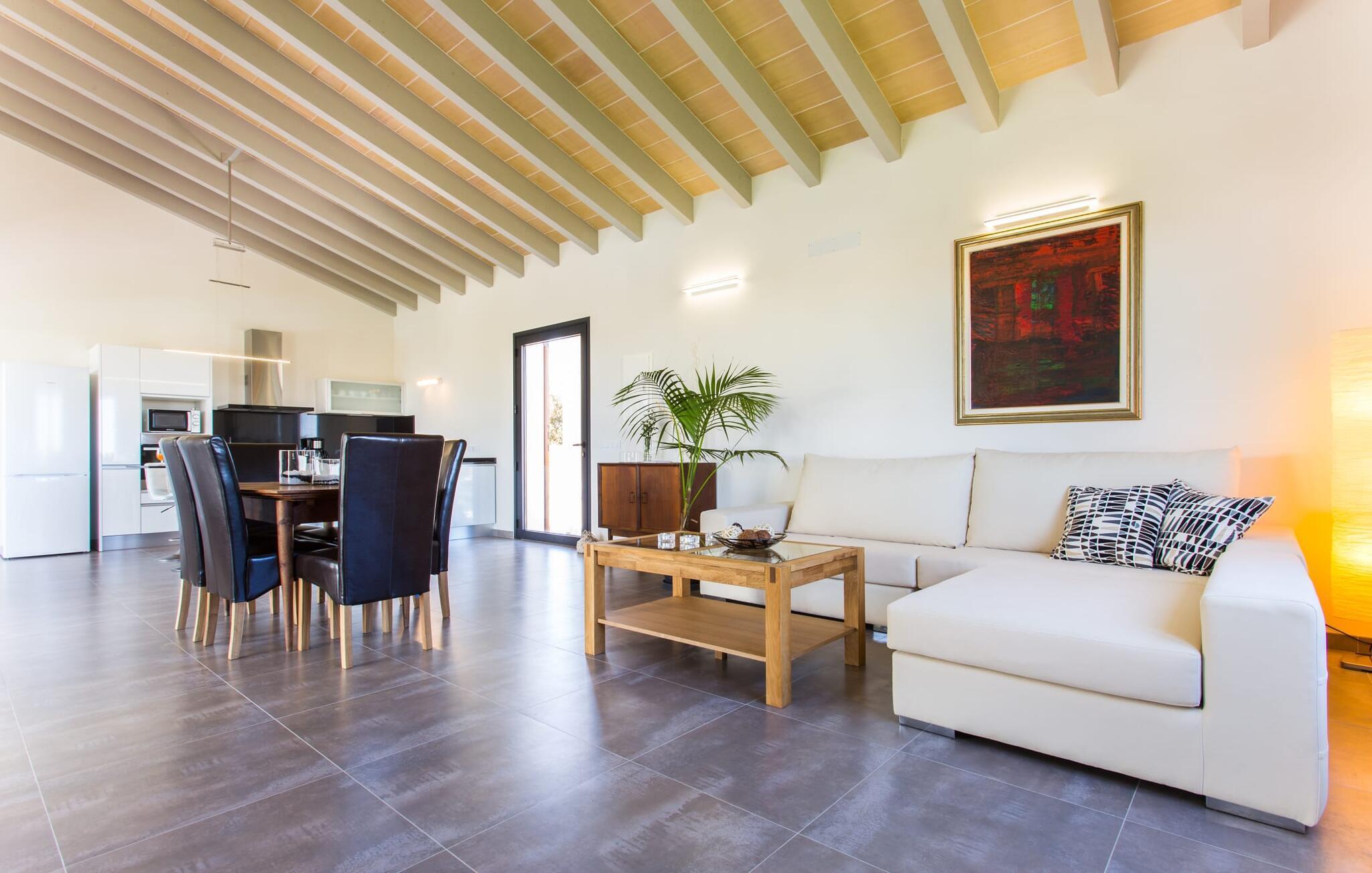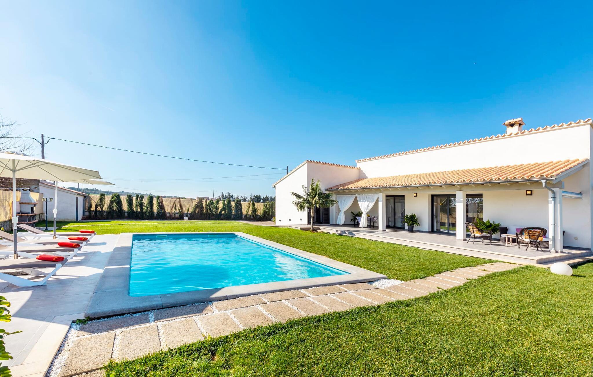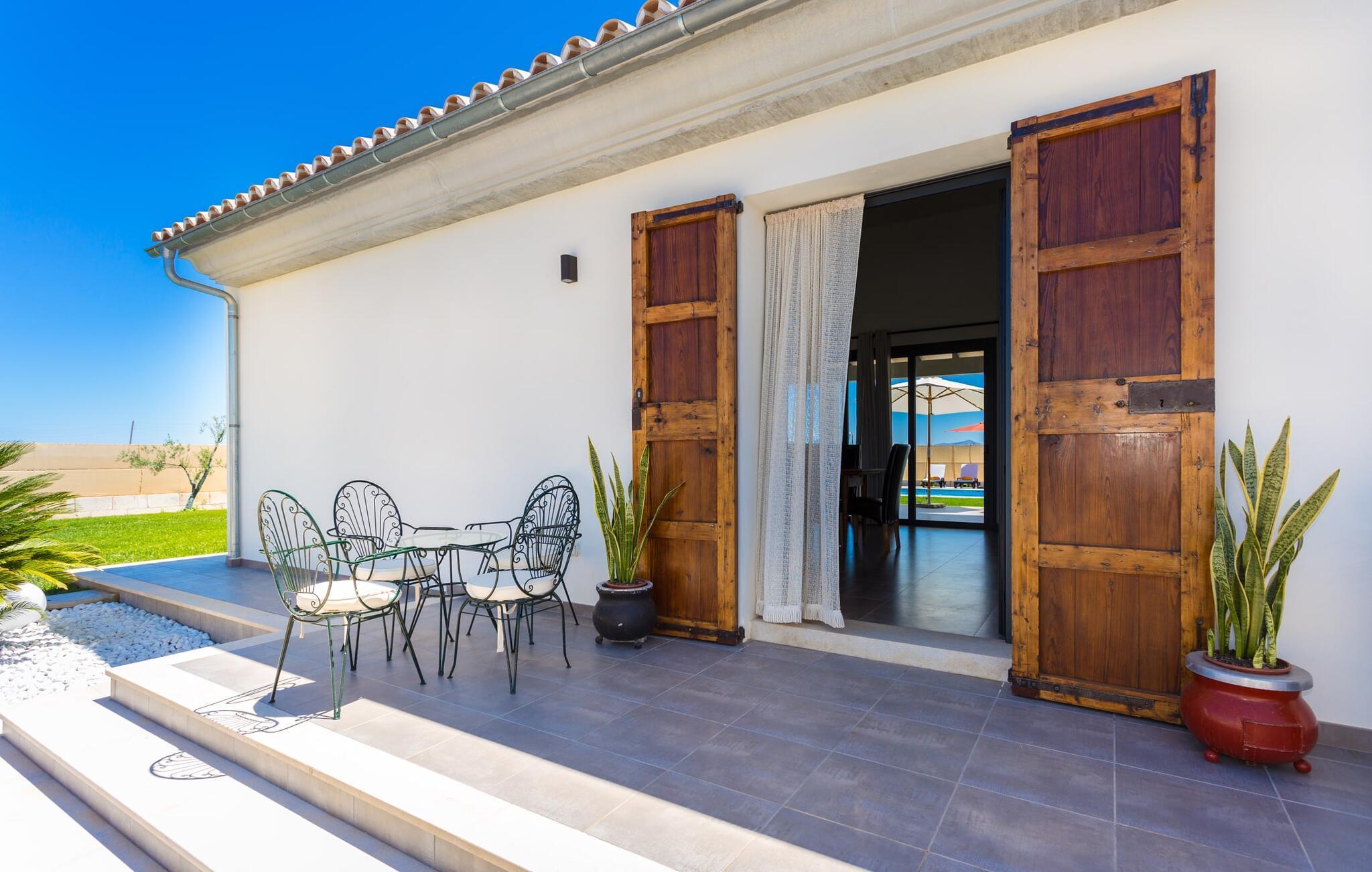 Villaen er det rigtige valg for gæster, der søger et moderne og velholdt miljø. Villaen er nybygget i 2016 og byder på masser af plads på en 1.500 m² stor grund, hvilket gør det muligt at opleve en dejlig afslappet tid sammen. Dette feriehus er tilgængeligt via godt sikrede veje. Udlejningsbiler kan parkeres sikkert på den skyggefulde parkeringsplads på det helt indhegnede udendørsareal. Området omkring poolen er dækket af smukke græsplæner og terrasseområder, der er perfekte til afslapning. Du kan forfriske dig selv i den elegante pool med nemme adgangstrin og glemme hverdagens stress, mens du svømmer på de 9 m lange baner. Vandet skinner smukt blåt og skaber et strålende glimt lige så klart som den mallorcanske himmel. Efter svømning er det meget fristende at slappe af på en af de komfortable liggestole og lade middelhavssolen forkæle dig. For at fordybe dig i en god feriebog, kan du gøre dig godt tilpas under en parasol eller finde et tilflugtssted i den behagelige skygge på den halvåbne terrasse. En af gyngestolene er til rådighed, så du kan fordybe dig i en bog, og du kan endda bruge en afslappende sofa til en lille siesta. En smuk spiseplads på den store terrasse inviterer dig til at nyde omfattende grillaftener. Middelhavsdelikatesser kan frisklaves på murstensgrillen, som grillmestrene helt sikkert vil have det rigtig sjovt med. I kan også nyde et godt glas vin til langt ud på aftenen og sidde sammen i en festlig atmosfære med behagelig belysning og hygge. Interiøret i den smukke, hvidpudsede villa er vidunderligt lyst, da der strømmer masser af lys ind i stueetagens rum gennem de overdimensionerede glasskydedøre på terrassen. Der er en elegant, rummelig opholdsstue, som også byder på en smuk indendørs spiseplads til at nyde måltiderne sammen samt et integreret, meget moderne køkken. Hele indretningen er fuldstændig moderne og emmer samtidig af hygge, så du kan slappe af og slappe af i den stilfulde stemning i denne villa. I det åbne køkken af høj kvalitet finder du alt, hvad du behøver for et vellykket selvforplejningsophold. Dens gode layout inviterer alle til at lave noget sammen. Den udvidede arbejdsflade, som også kan bruges som morgenmadsbar, er meget praktisk til at vågne op med din første morgenkaffe på en af de komfortable barstole og prøve lidt fra bageren. Hvis du leder efter noget underholdning, så gør dig godt tilpas i den hyggelige sofa i opholdsstuen og se dit foretrukne britiske tv-program eller en spændende dvd på det store fladskærms-tv. På de 125 m² af villaen "Kortons d'Spiga" vil du helt sikkert opleve afslapning på højt niveau. De romantiske soveværelser scorer også point med deres helt nye, harmonisk indrettede møbler. Lyse farver og diskret dekoration skaber en atmosfære af orden her. Villaen byder desuden på to æstetiske badeværelser med rummeligt brusekabine og separat gæstetoilet. På de nærliggende strande kan du fejre dejlige dage med svømning, mens du nyder solen og havet. Den livlige bystrand Can Picafort ligger for eksempel kun 8 minutter væk i bil. I den tidligere fiskerby er den smukke promenade også ideel til at slentre eller besøge restauranter eller barer. Villaen ligger tæt på den tydeligt hørbare landevej, der forbinder byen Muro med kysten, så du kan opdage de smukke strande i nord på kort tid. Den stille, rolige by Sa Pobla er særlig livlig søndag morgen, når det ugentlige marked finder sted. Her kan du købe masser af friske lokale produkter og opleve den typiske mallorcanske atmosfære. Sa Pobla er også kendt som "Mallorcas grøntsagskurv", fordi dens frugtbare jord producerer så mange landbrugsprodukter. Den moderne, venlige nye bygning er beliggende i landlige omgivelser på privat ejendom og kun få minutters kørsel fra den store bugt Alcúdia med dens mange smukke sandstrande. Muro og den nærliggende landsby Sa Pobla ligger kun 4 km væk. Her kan du shoppe eller besøge en restaurant. Derudover er beliggenheden ideel til at udforske den nordlige kystdel af øen og finde din yndlingsstrand. Dette er et Fincallorca feriehus.