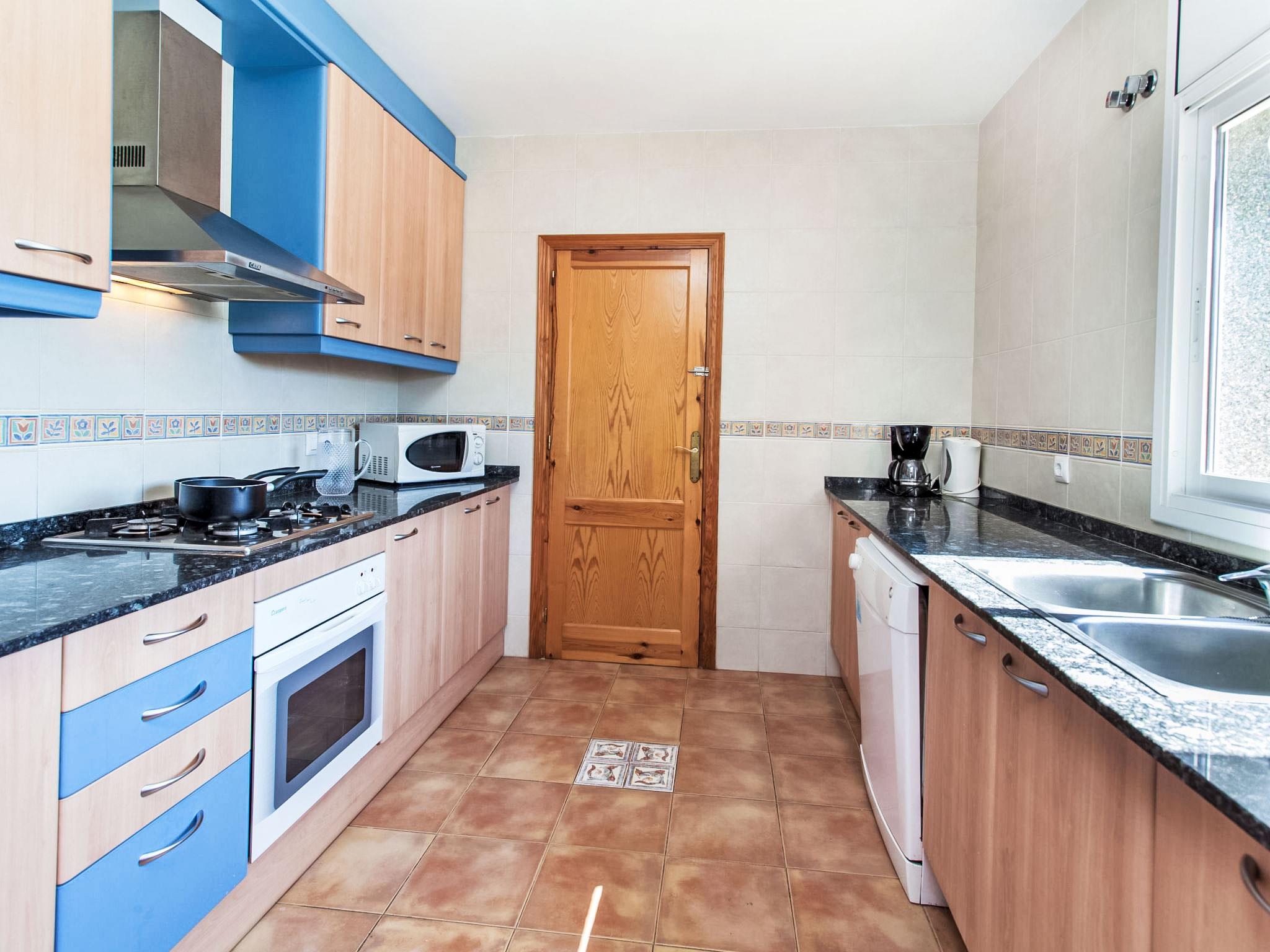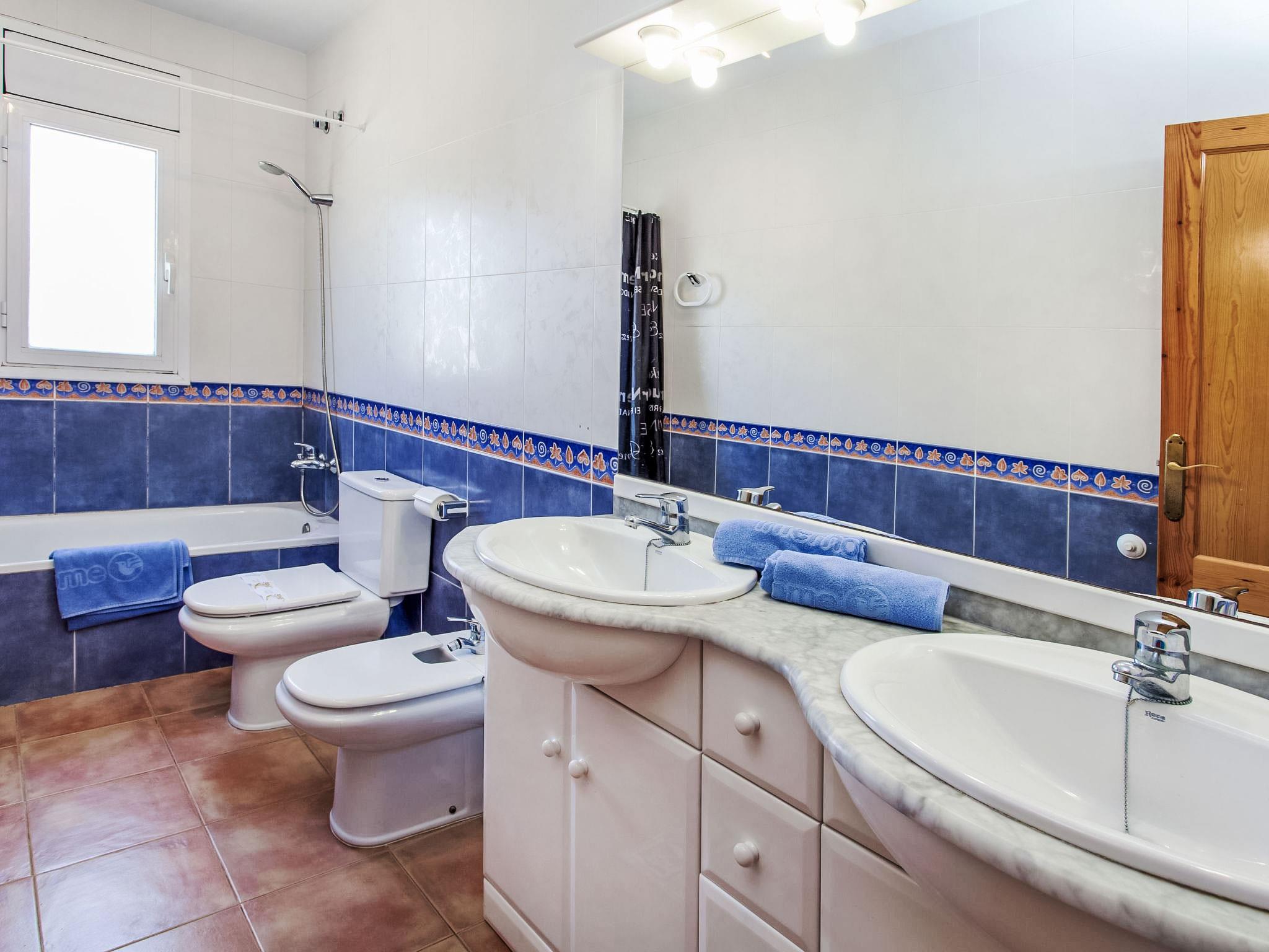"Villa Cala Vidre A", 5-room villa 170 m2. Comfortable and cosy furnishings: living/dining room with dining table, satellite TV and digital TV. Exit to the terrace. 2 rooms, each room with 2 beds (90 cm). 1 large room with 1 french bed (150 cm), fan. 1 room with 1 bed (90 cm), 2 x 1 bunk beds (90 cm). Kitchen (4 hot plates, oven, dishwasher, toaster, kettle, microwave, electric coffee machine). Bath/bidet/WC, shower/WC, double hand-basin. No heating option. Terrace. Terrace furniture, barbecue. Facilities: washing machine, iron, children's high chair, baby cot, hair dryer. Internet (WiFi, free). Parking at the house. Suitable for families. Maximum 1 pet/ dog allowed. HUTTE001018