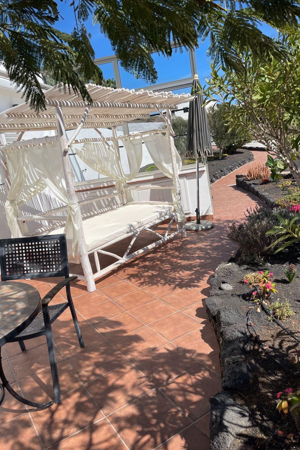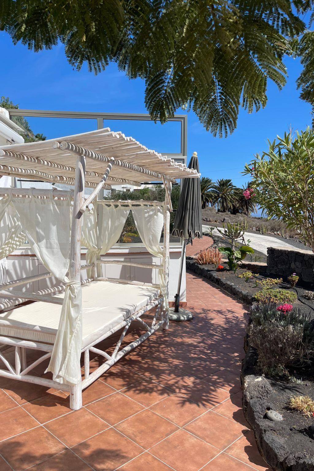 The exterior presents a landscape of pure relaxation and scenic beauty. A garden and terrace lead to a solar-heated swimming pool, ideal for basking under the sun. Four garden chairs and two loungers enable enjoyment of the breathtaking views towards Fuerteventura and Lobos islands. For leisure, two terraces and a pergola with a grill area are at your disposal, along with the option for bicycle hire, crafting an exclusive paradise of leisure activities.