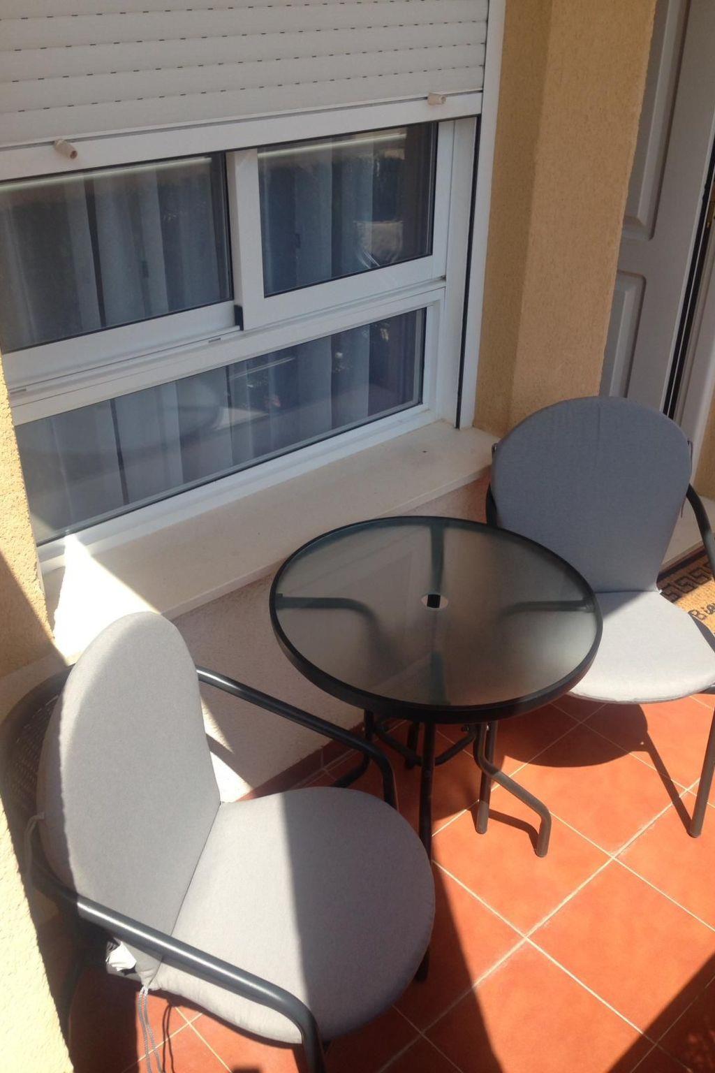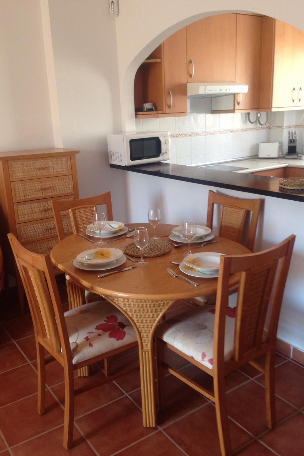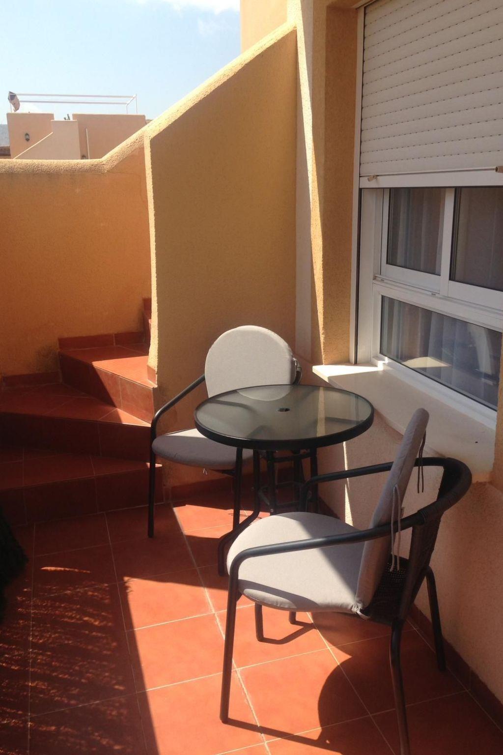 The accommodation has some stairs to the front door and stairs to the roof terrace and comprises: living room with sofa and two separate chairs, dining table with 4 chairs, DVD player, Spanish TV and WiFi available in the property. A balcony off the lounge offers you some views of the beautiful sea and mountains, with a set of table and chairs for relaxing. The kitchen has a large fridge, microwave, kettle, oven, hob, toaster and washing machine.