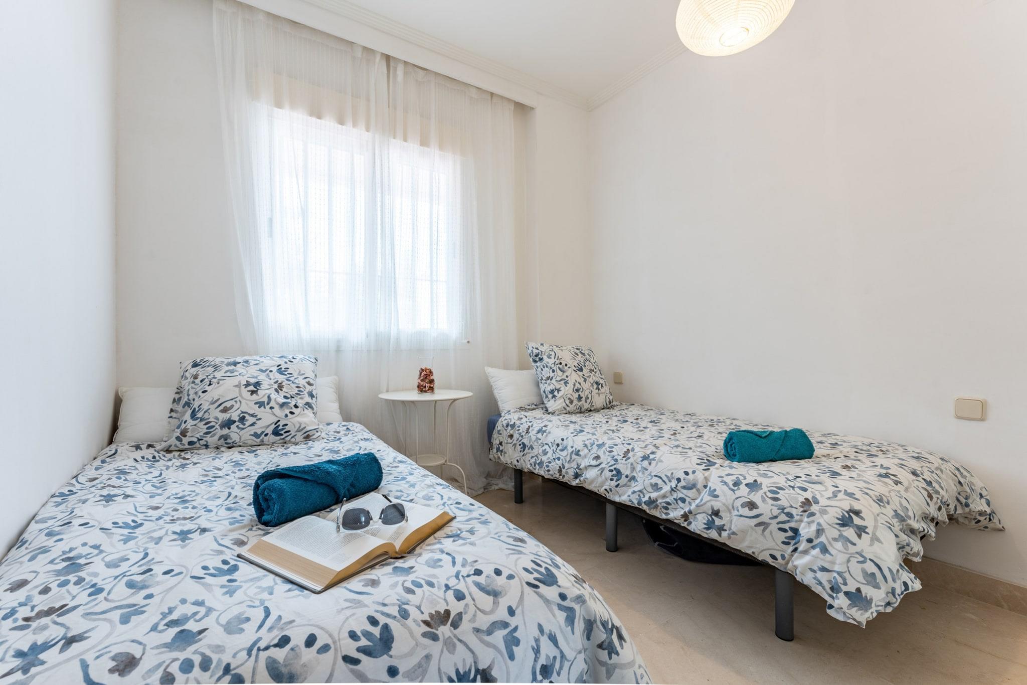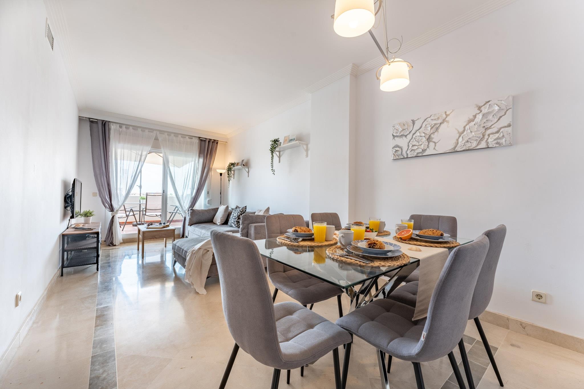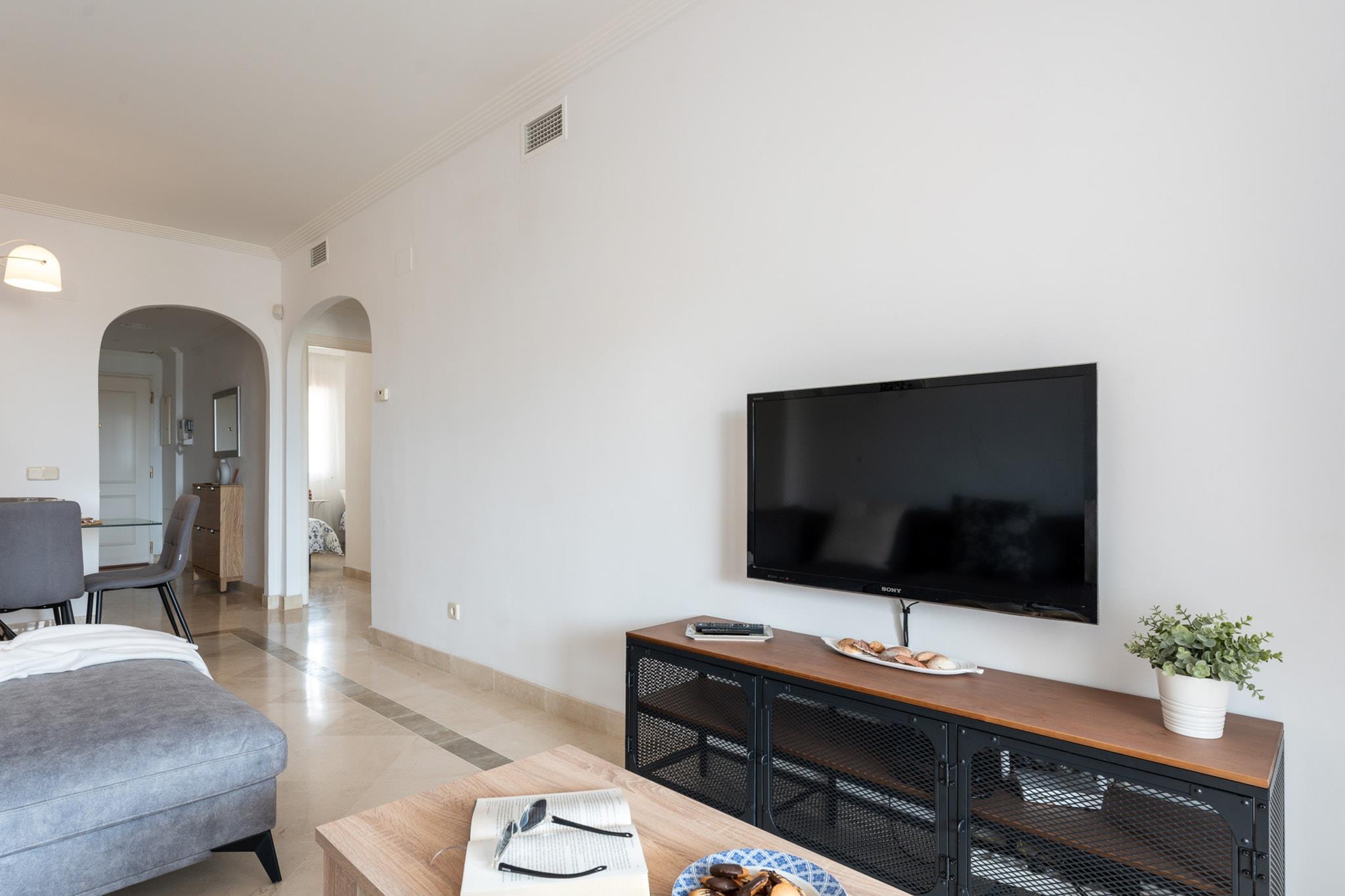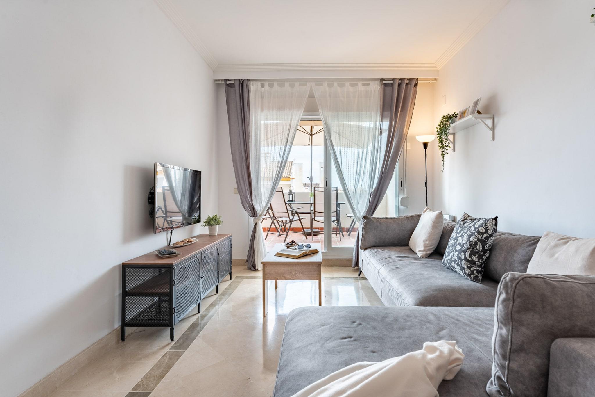 Fordyb dig i den fredfyldte luksus i denne udsøgte lejlighed, perfekt placeret på den allerførste linje af den berømte "Calanova Golf"-bane. Her møder en betagende udsigt over de frodige, grønne fairways det glitrende Middelhav og skaber en idyllisk kulisse for din ferie på Costa del Sol. Dette er mere end bare et ophold; det er en invitation til at slappe af i prestigefyldte omgivelser. Denne indbydende lejlighed har to komfortable soveværelser og to veludstyrede badeværelser, der tilbyder rigelig plads til afslapning. Den store stue er et centrum for underholdning, udstyret med alle mulige udenlandske tv-kanaler, mens det fuldt udstyrede køkken tilbyder alt, hvad du behøver til dejlige kulinariske kreationer. Gå ud på den dejlige terrasse, dit private udendørsparadis, hvor du kan nyde morgenkaffe eller aftendrinks med virkelig spektakulær golf- og havudsigt. Beliggende i en privat urbanisering med dedikeret sikkerhed, er din ro i sindet sikret. Du er kun en bekvem 10 minutters kørsel fra både Marbellas glamour og Fuengirolas pulserende charme, hvilket placerer det bedste af Costa del Sol inden for rækkevidde. Malaga Internationale Lufthavn ligger også kun 25 minutter væk. Calanova GRAND Golf ligger i Mijas Costa og har en unik og privilegeret beliggenhed omgivet af rekreative faciliteter, herunder marinaen, Club del Sol Tennis School og den symbolske Cala de Mijas. Komplekset i sig selv løfter din oplevelse med to forfriskende swimmingpools, paddletennisbaner, en sommerbar-restaurant, concierge-service og store haver fyldt med subtropisk vegetation.