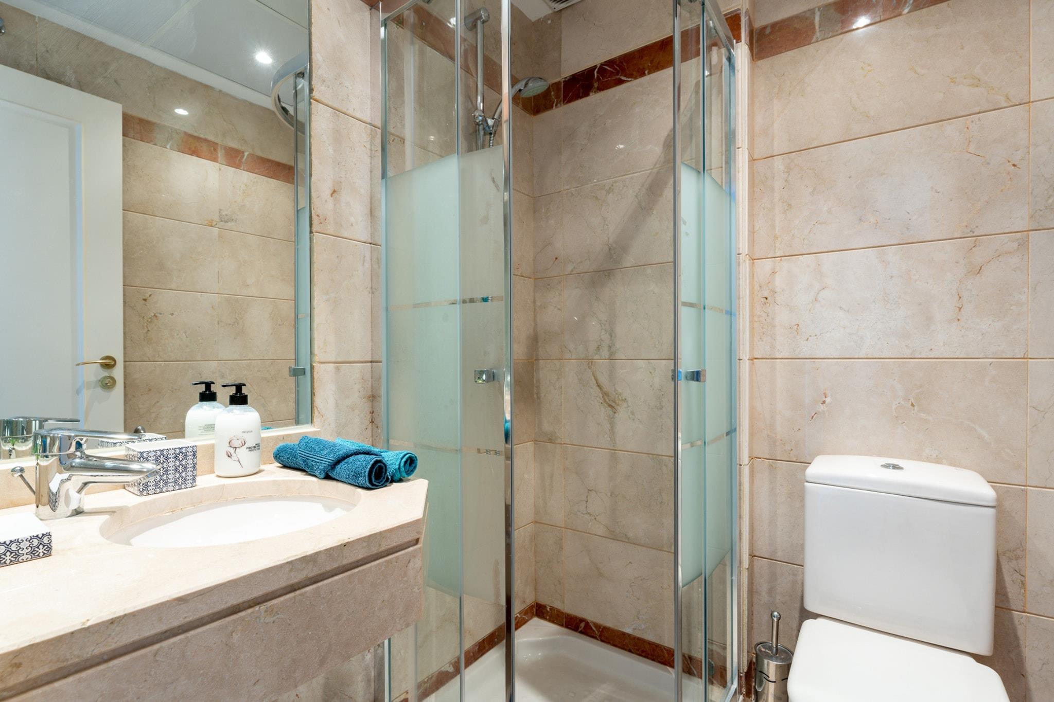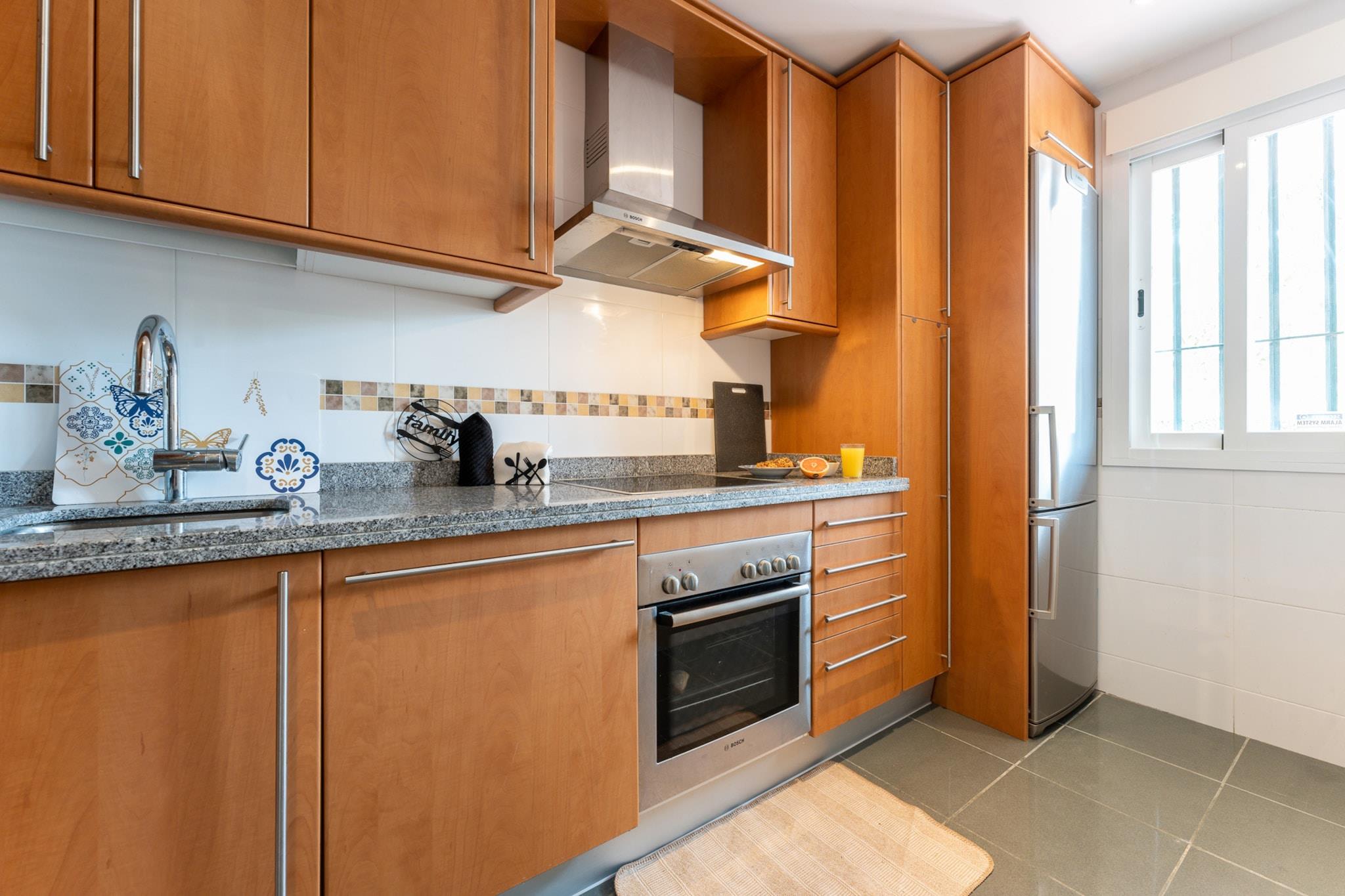 Stue(Fjernsyn, spisebord, sofahjørne, klimaanlæg), Køkken(kakkelovn, elkedel, brødrister, kaffemaskine, ovn, mikrobølgeovn, opvaskemaskine , køle-fryseskab, tørretumbler, vaskemaskine), soveværelse(dobbeltseng, klimaanlæg), soveværelse(enkeltseng, enkeltseng, klimaanlæg), badeværelse(bruser, toilet), badeværelse(badekar med bruser, toilet), garage, garage, balkon, Håndklæder/sengelinned (inkl.)