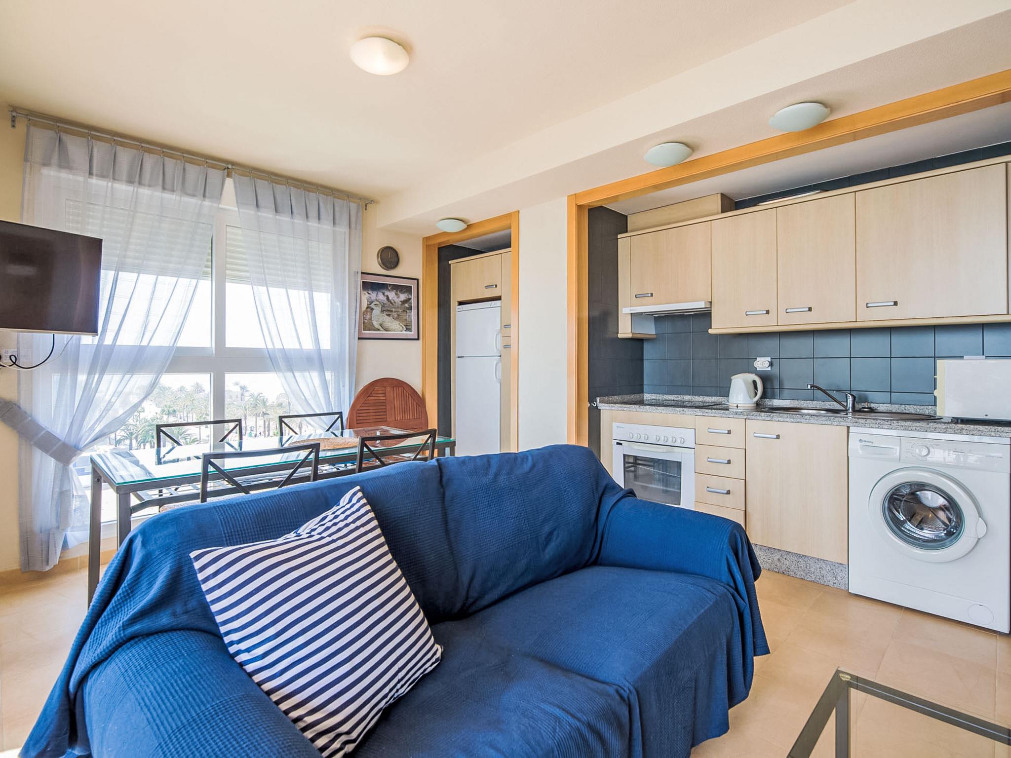 3-room apartment 63 m2 on 6th floor. Comfortable and modern furnishings: living/dining room with 1 sofabed and cable TV. Exit to the terrace. 1 room 12 m2 with 1 french bed. 1 room with 1 bed. Kitchen (oven, 4 ceramic glass hob hotplates, microwave, freezer, electric coffee machine) with dining table. Shower/bidet/WC. Air-conditioning, forced-air heating. Terrace 8 m2. Terrace furniture. View of the sea. Facilities: washing machine, iron. VV.MU.222 // Reg. Nr.: ESFCTU0000300320007227060000000000000000000VV/MU/2226