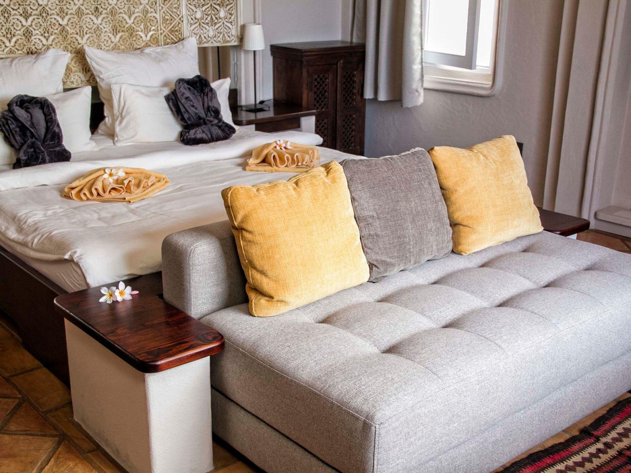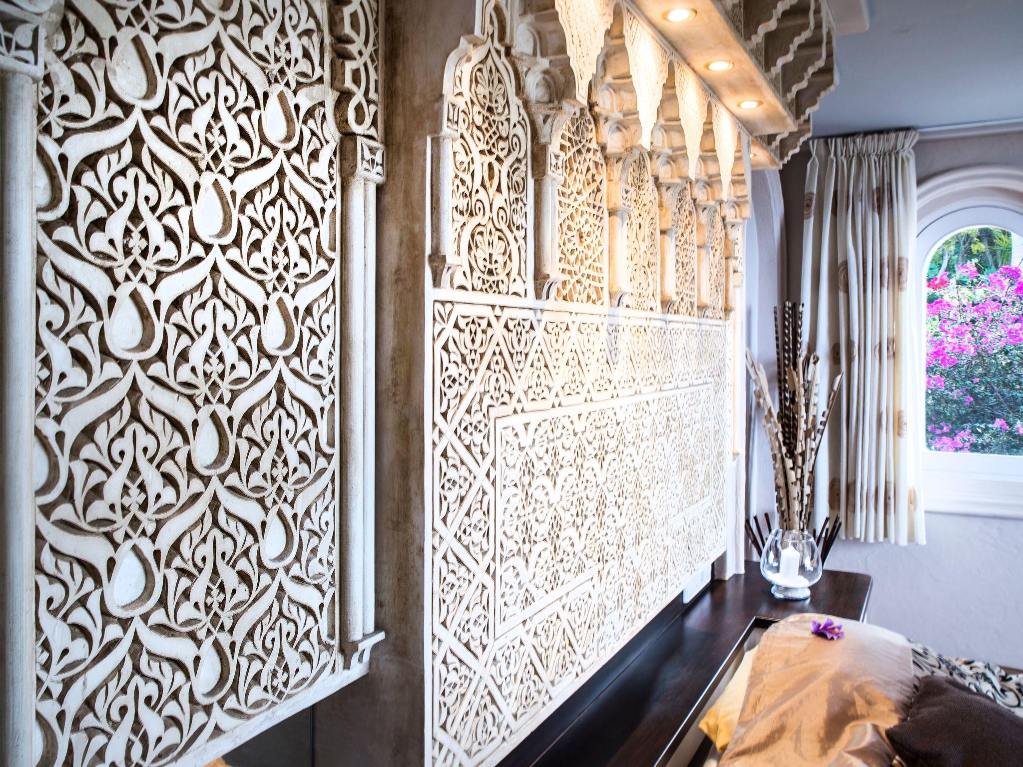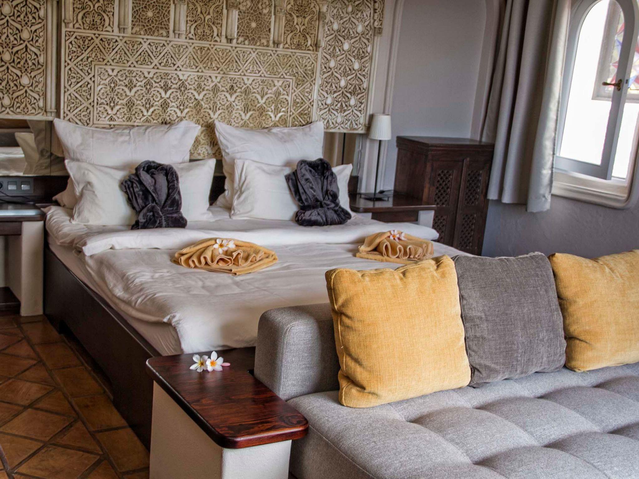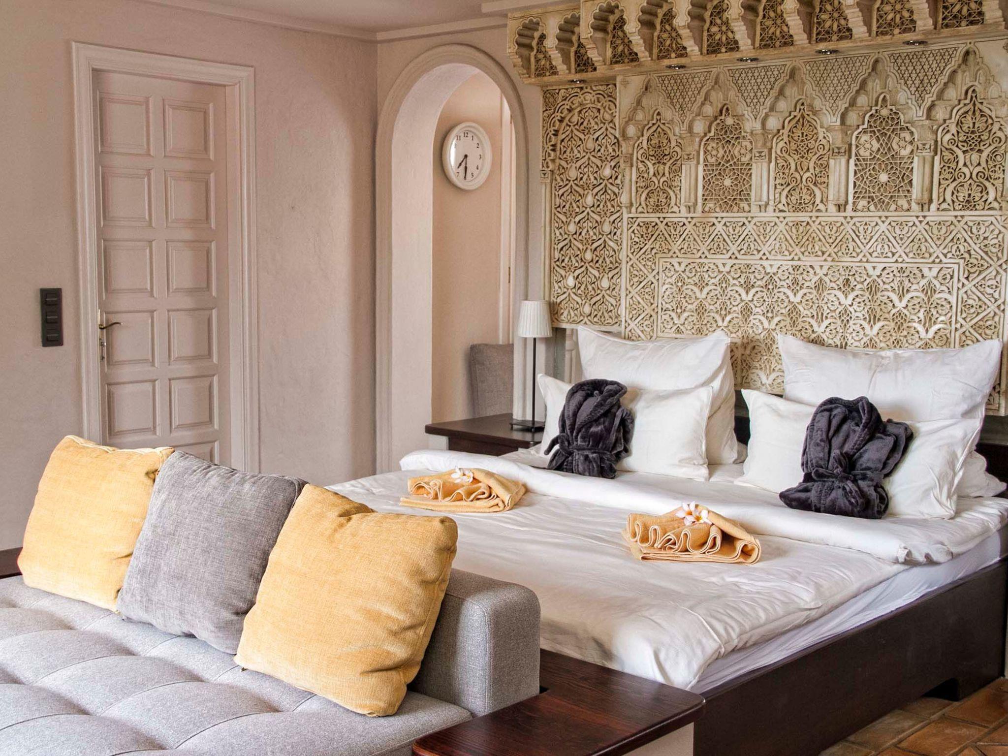 This beautiful luxury flat is the highlight of the property. It has a very spacious bedroom with a double bed (200 x 180 cm) including a Swiss-Flex health sleeping system. Moroccan carvings above the bed round off the upscale ambience in the bedroom. Enjoy the picturesque view from the luxury bathroom with free-standing bath and shower. SAT-TV and WLAN are also available. The modern kitchen, newly installed in 2016, has a dishwasher, fridge, Nespresso coffee machine, toaster, ceramic hob with 4 hotplates and is fully equipped with all the utensils you need on holiday. Bathrobes, shower and bath towels and a hairdryer are also provided.