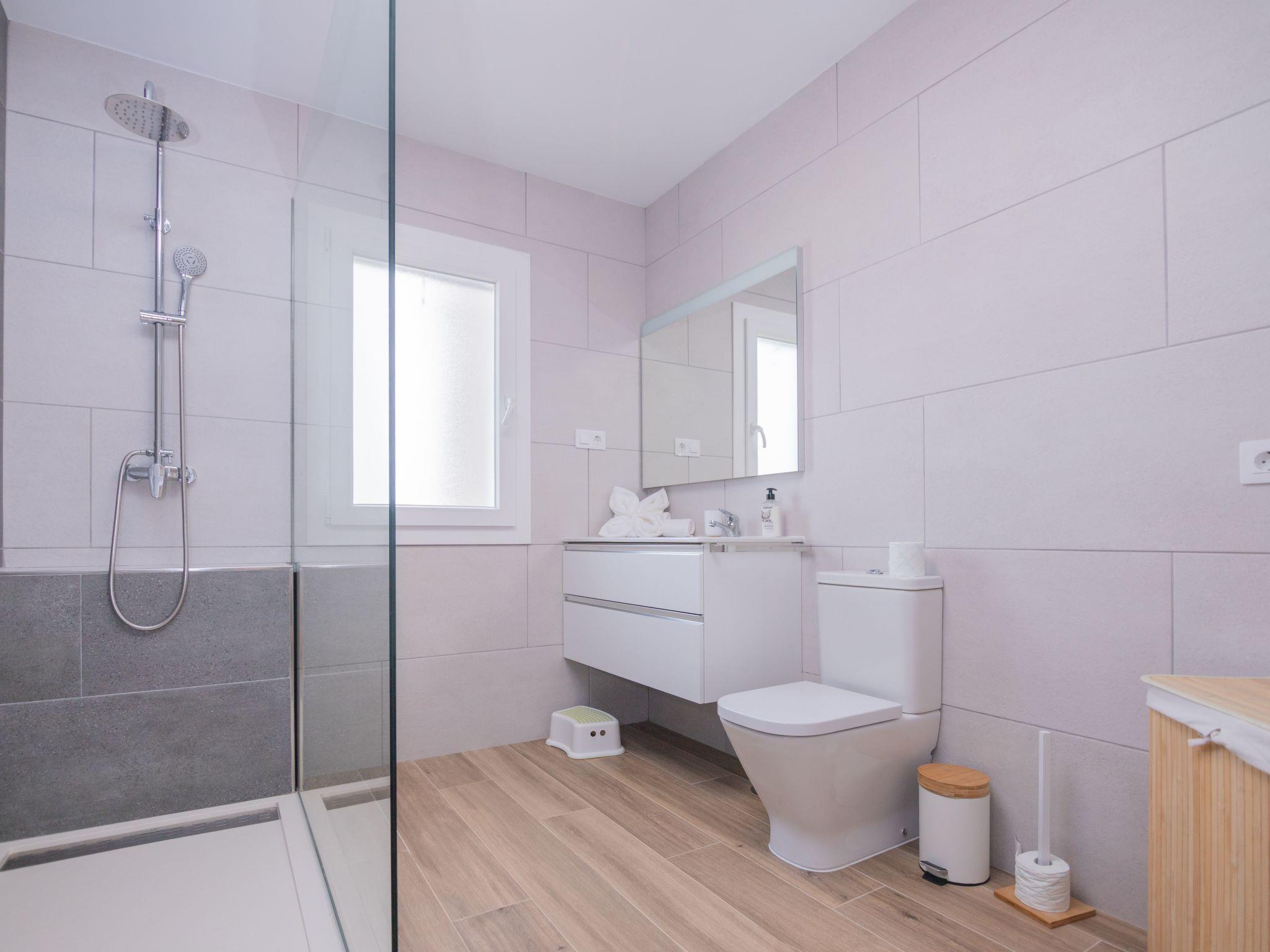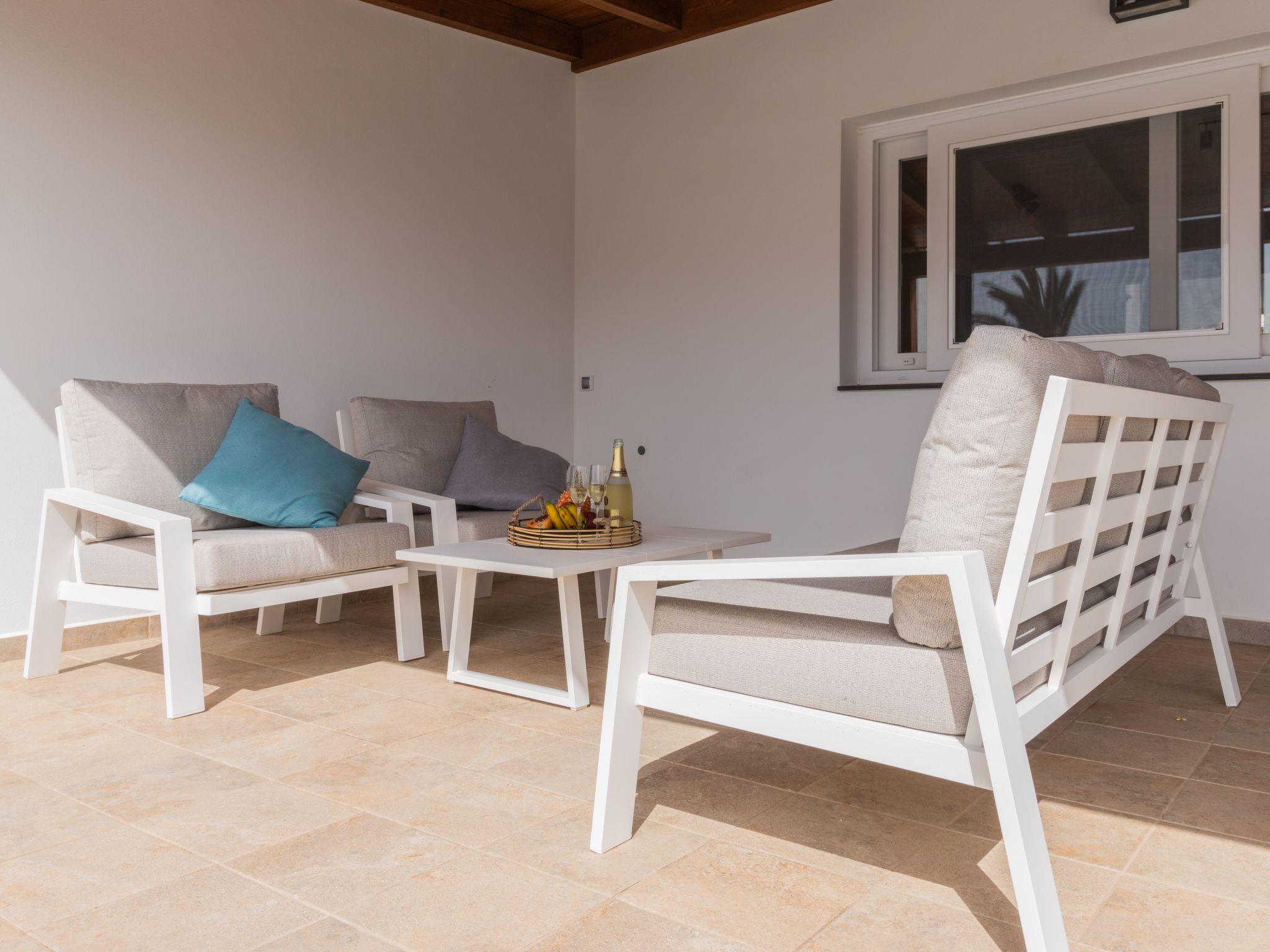 The living room grants access to the covered, large patio, which offers stunning ocean views. It is furnished with sun loungers and sitting accommodation. A staircase leads to the lower patio and the garden. Here you will find a few more sun loungers, a sun shade, a dining table with chairs, a barbecue and the beach access.